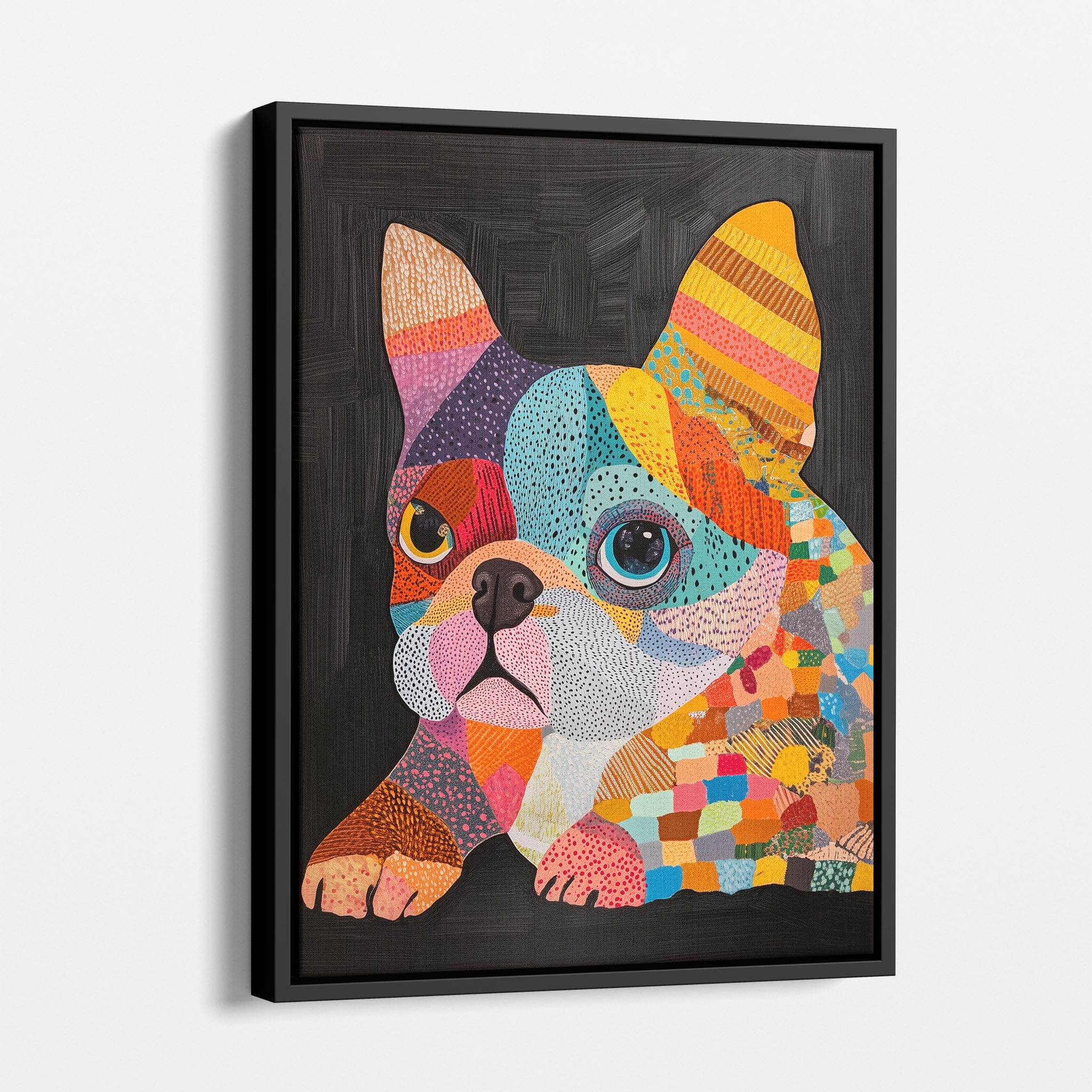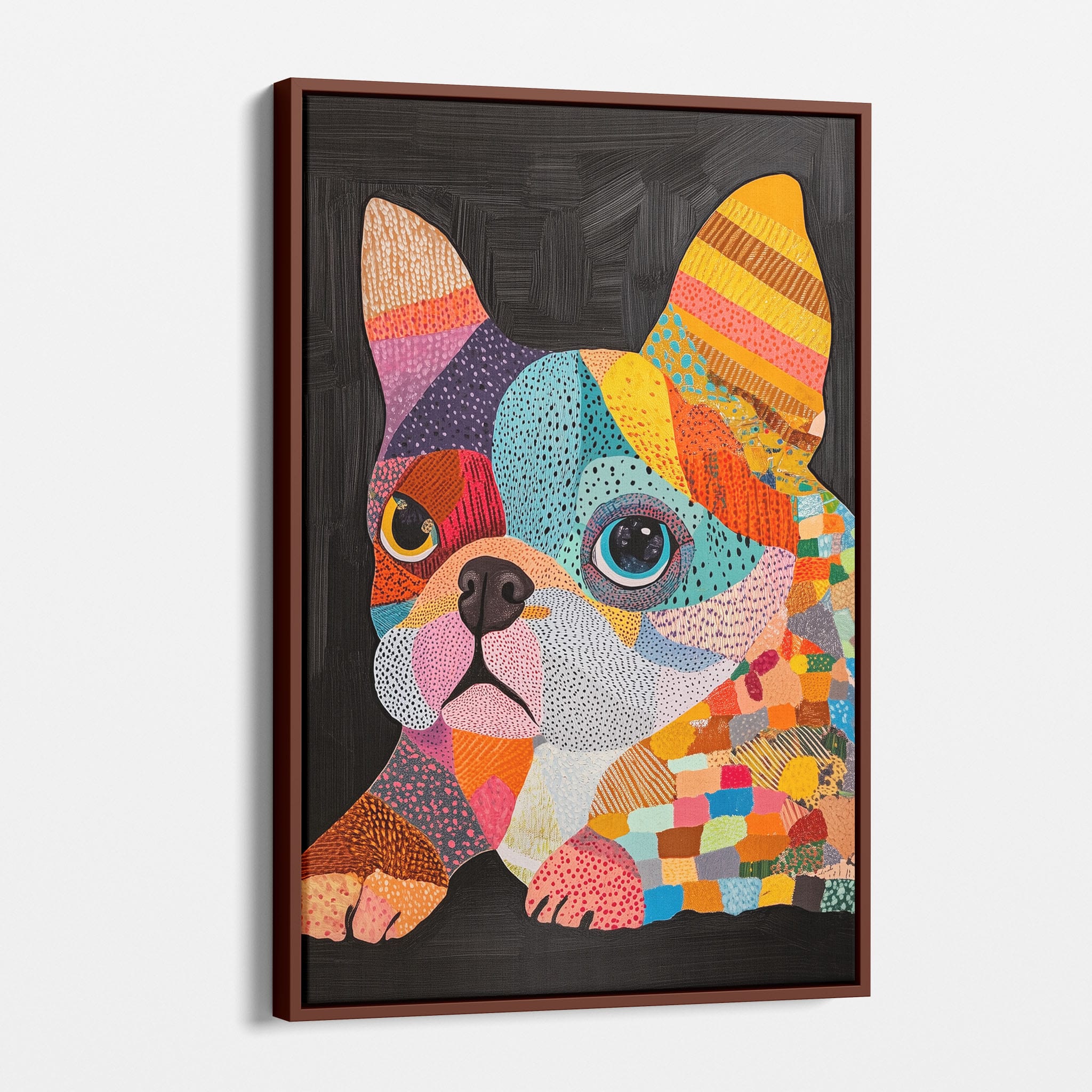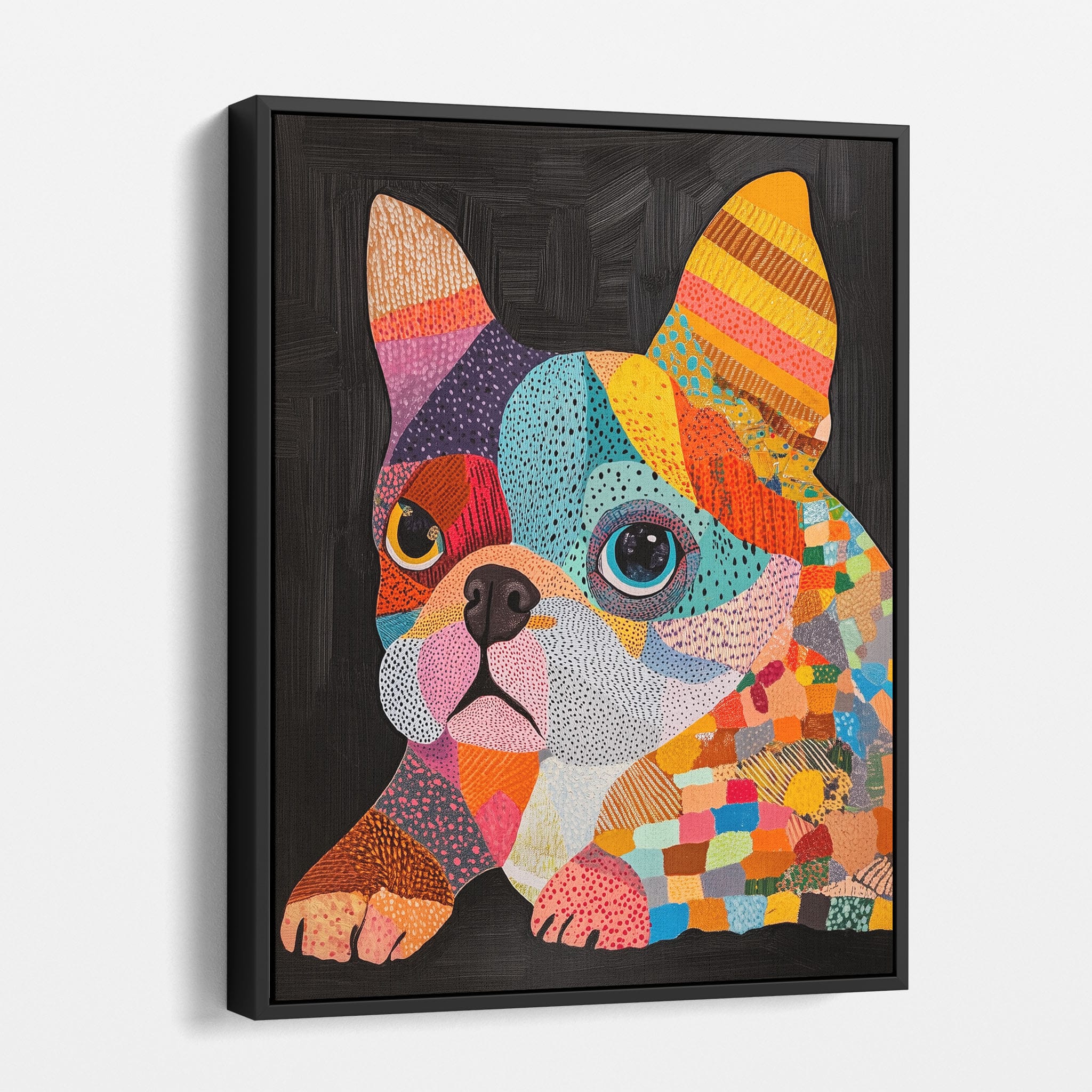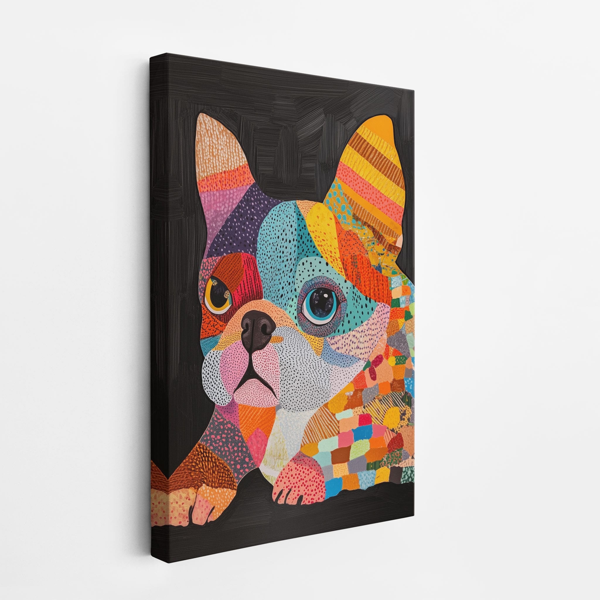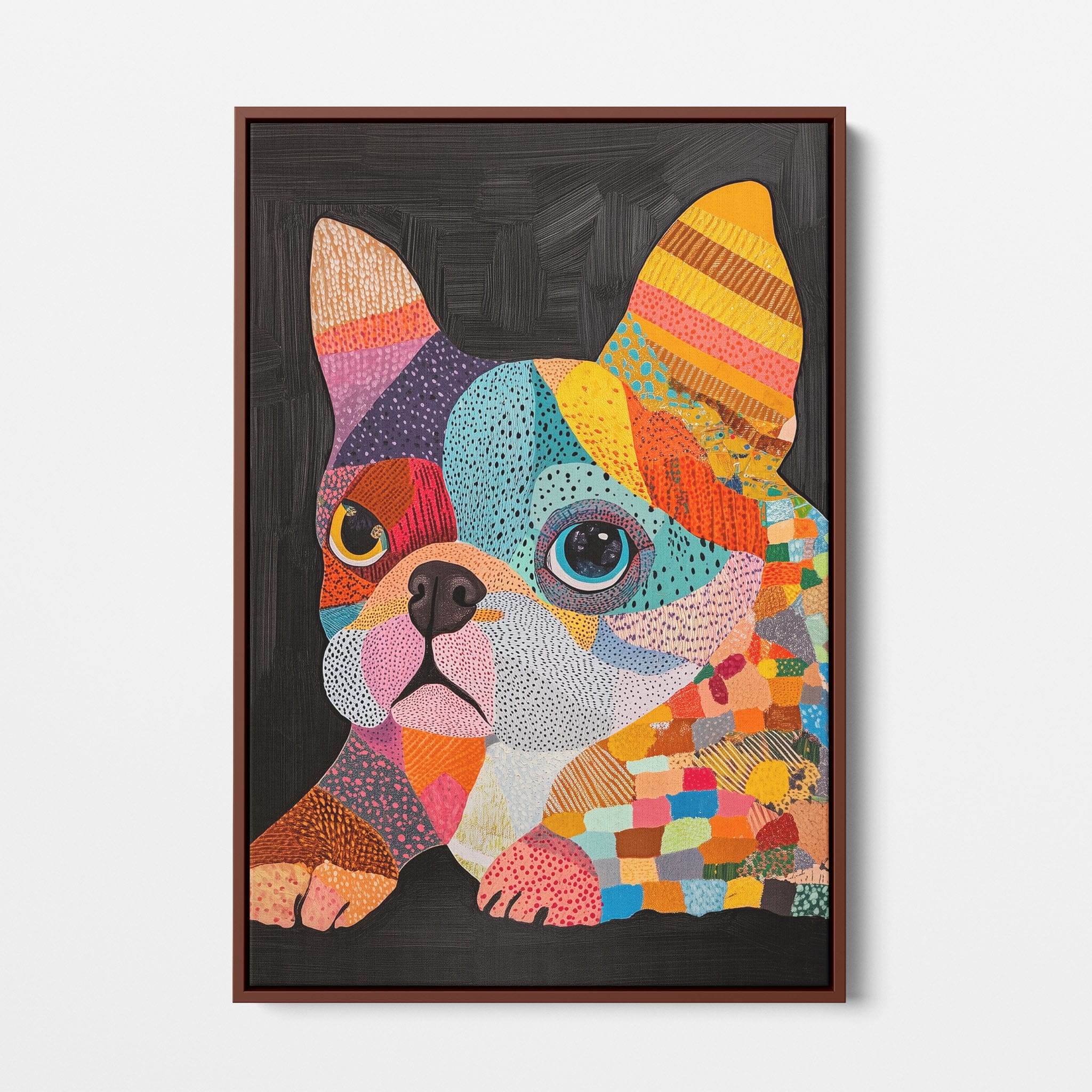 This vibrant painting presents a delightful figurative portrayal of a French Bulldog adorned in a spectrum of lively colors and textured patterns. With a modern and whimsical style, each brushstroke and color choice energizes the piece, creating a playful yet profound expression of canine charm. The meticulous attention to detail and the vivid color palette make it an eye-catching addition to any room. Its joyous and expressive nature makes it a perfect choice for pet lovers and art enthusiasts looking for a piece that captures both the essence and joy of animal companionship.