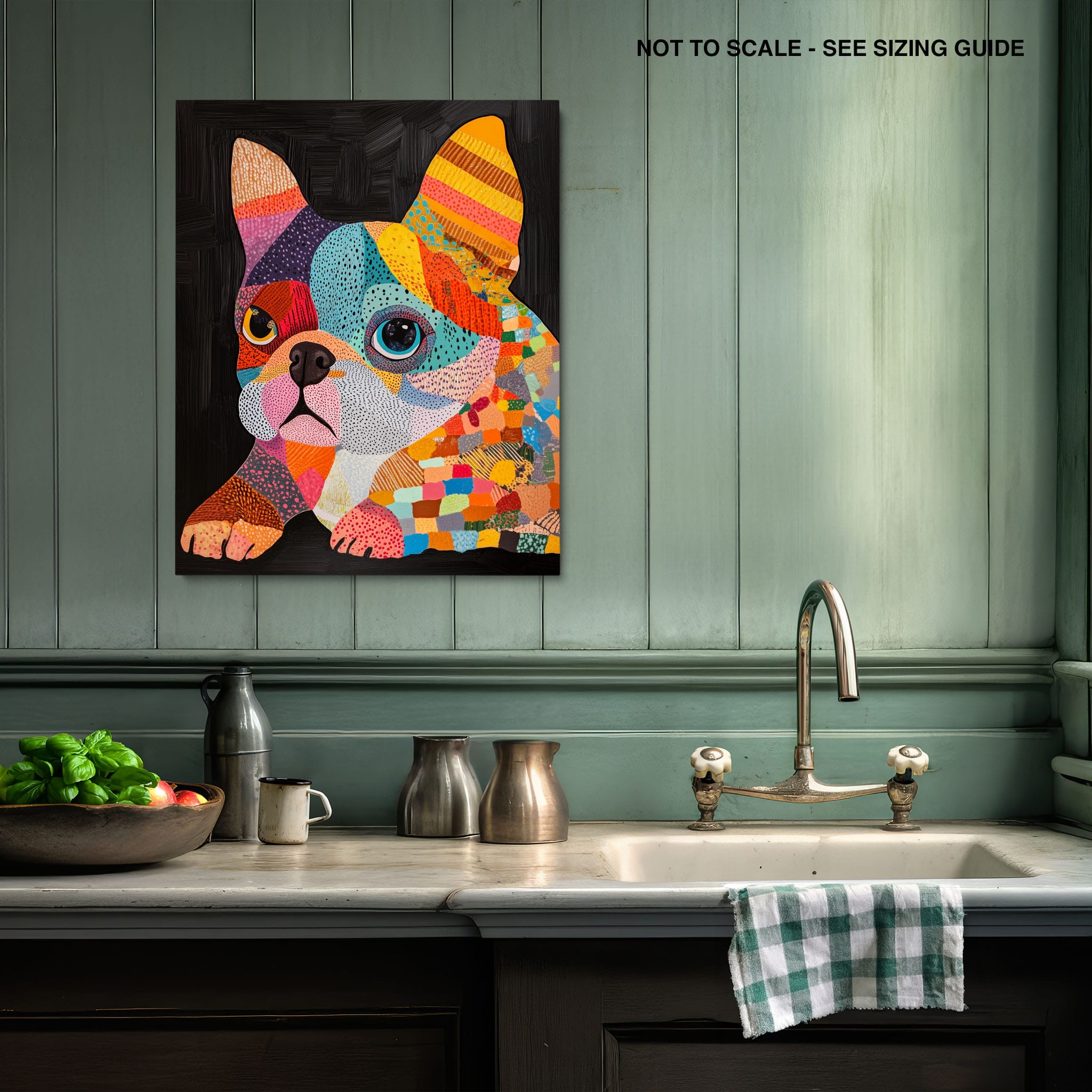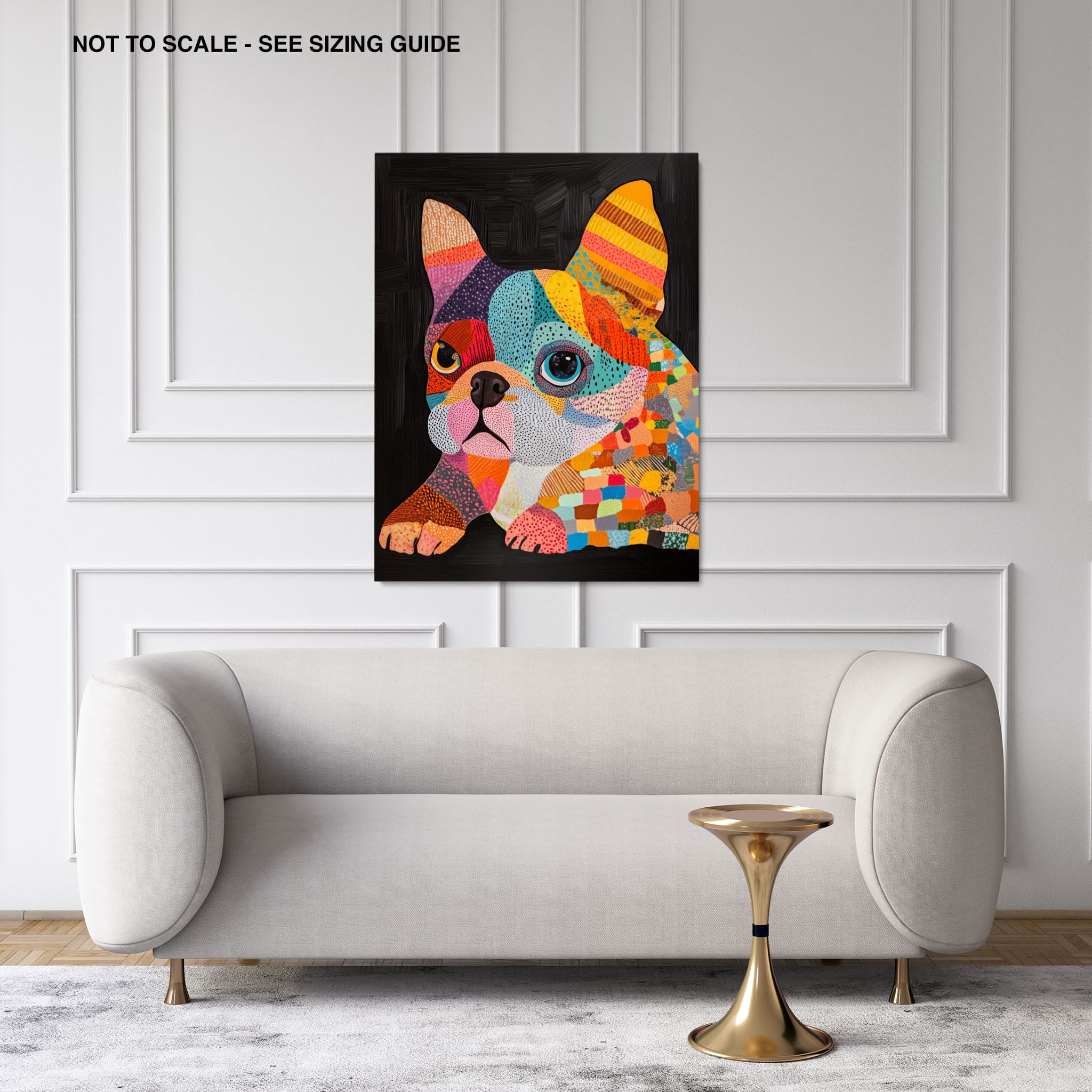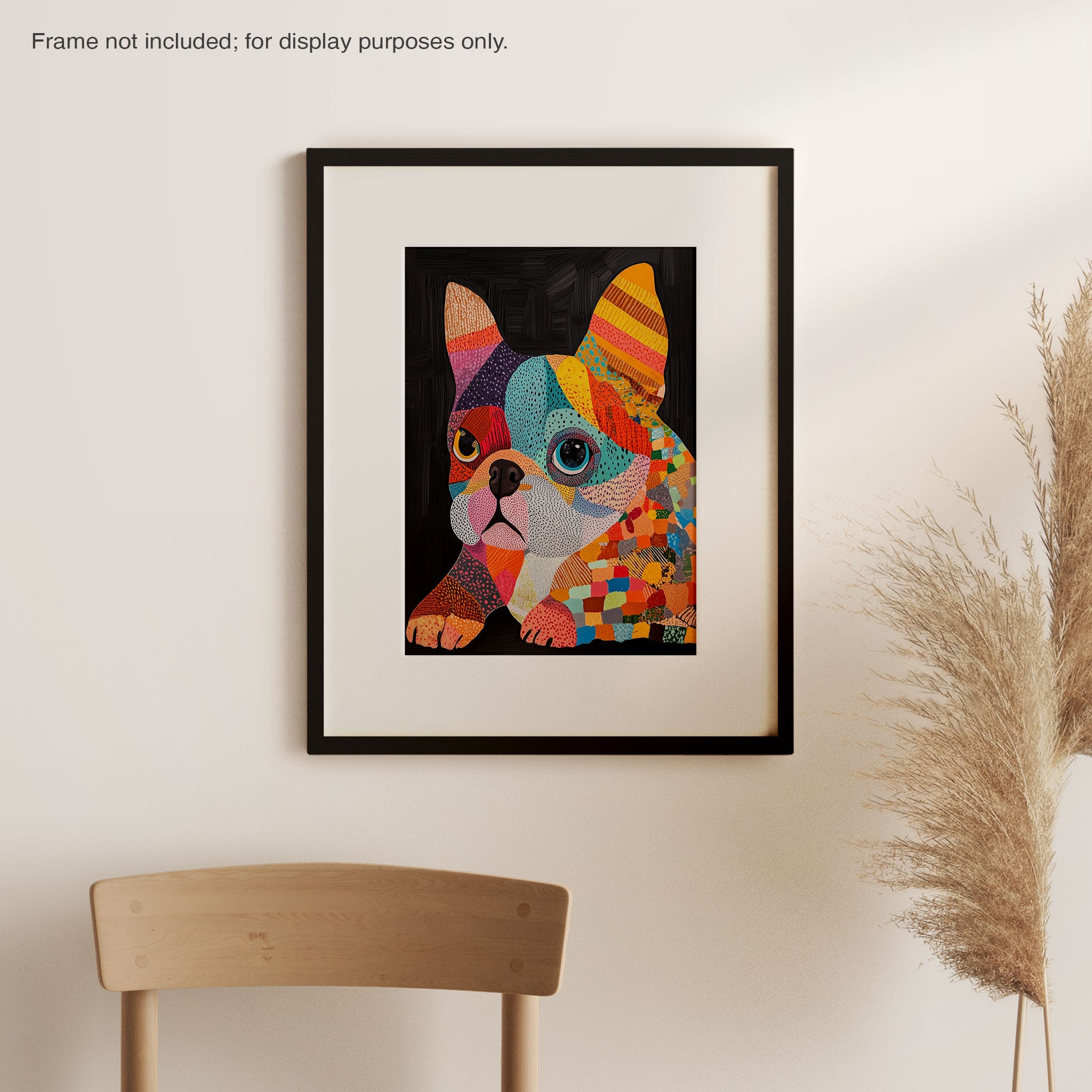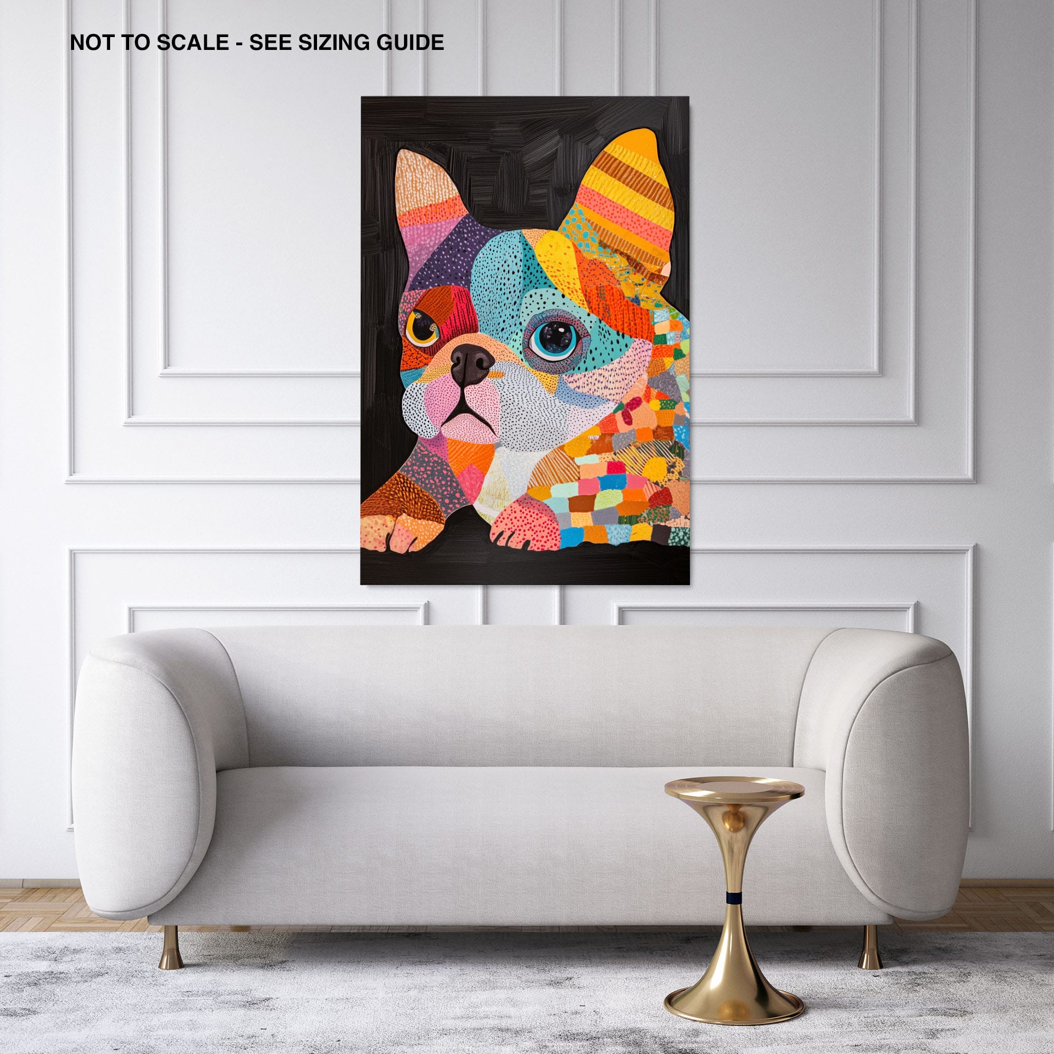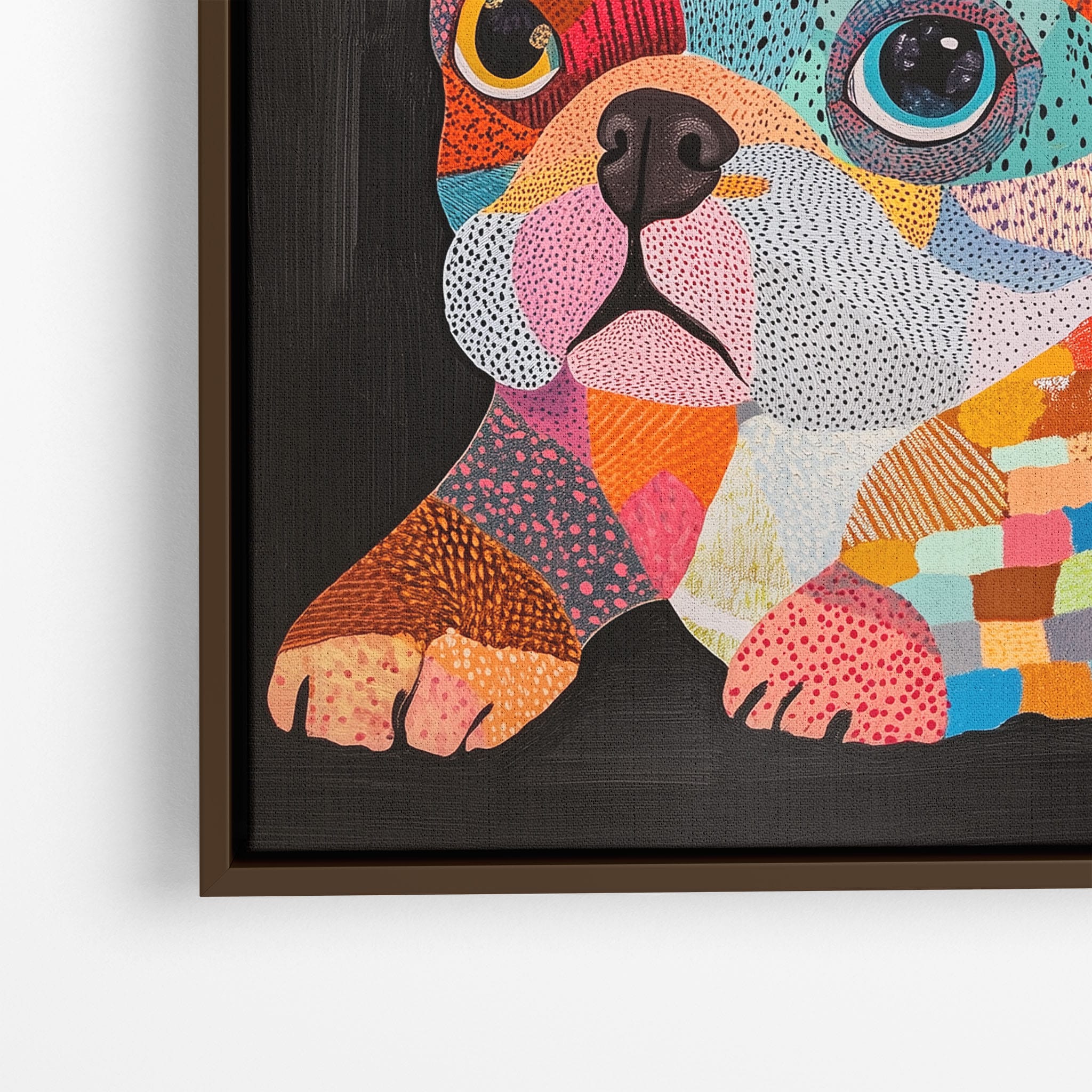 This vibrant painting presents a delightful figurative portrayal of a French Bulldog adorned in a spectrum of lively colors and textured patterns. With a modern and whimsical style, each brushstroke and color choice energizes the piece, creating a playful yet profound expression of canine charm. The meticulous attention to detail and the vivid color palette make it an eye-catching addition to any room. Its joyous and expressive nature makes it a perfect choice for pet lovers and art enthusiasts looking for a piece that captures both the essence and joy of animal companionship.