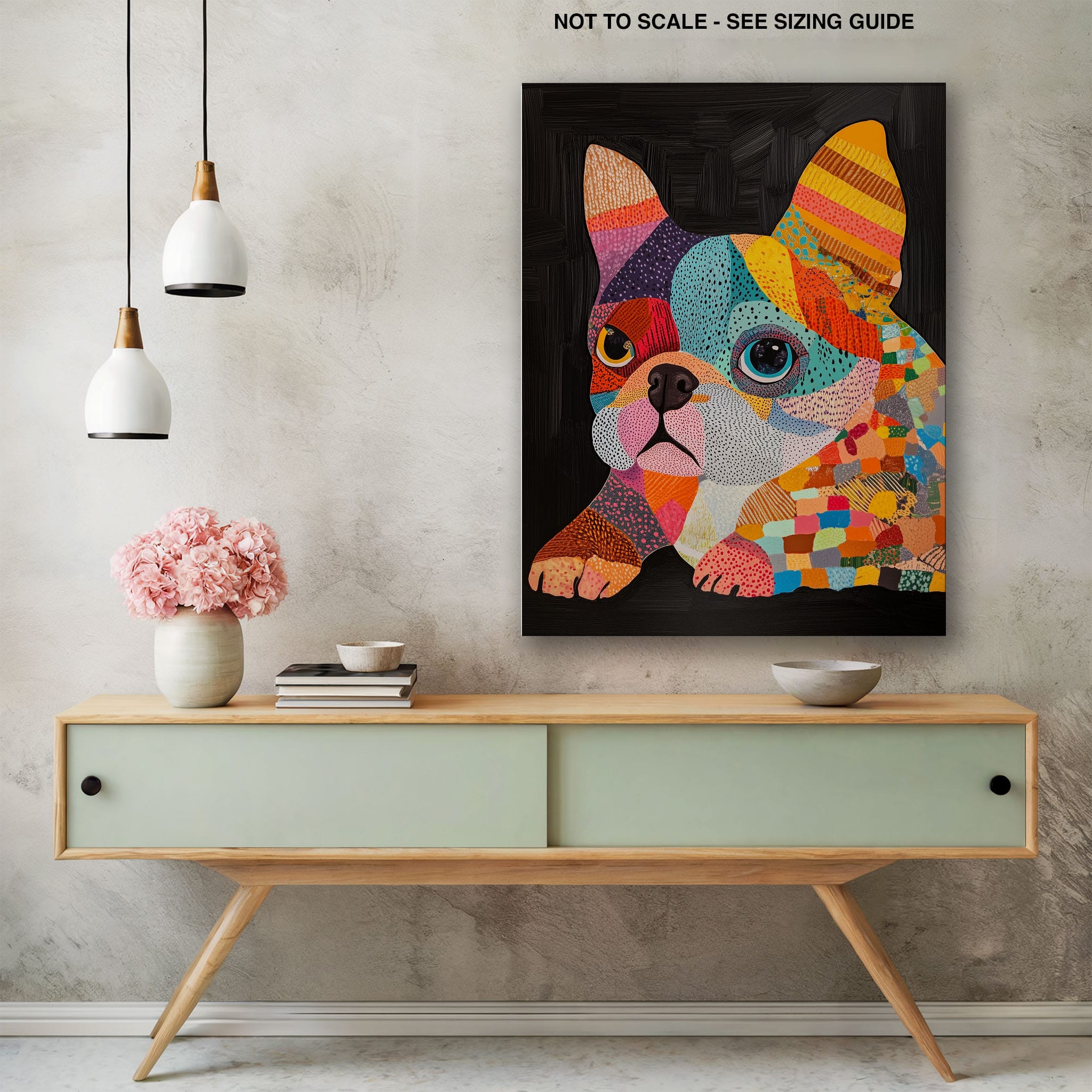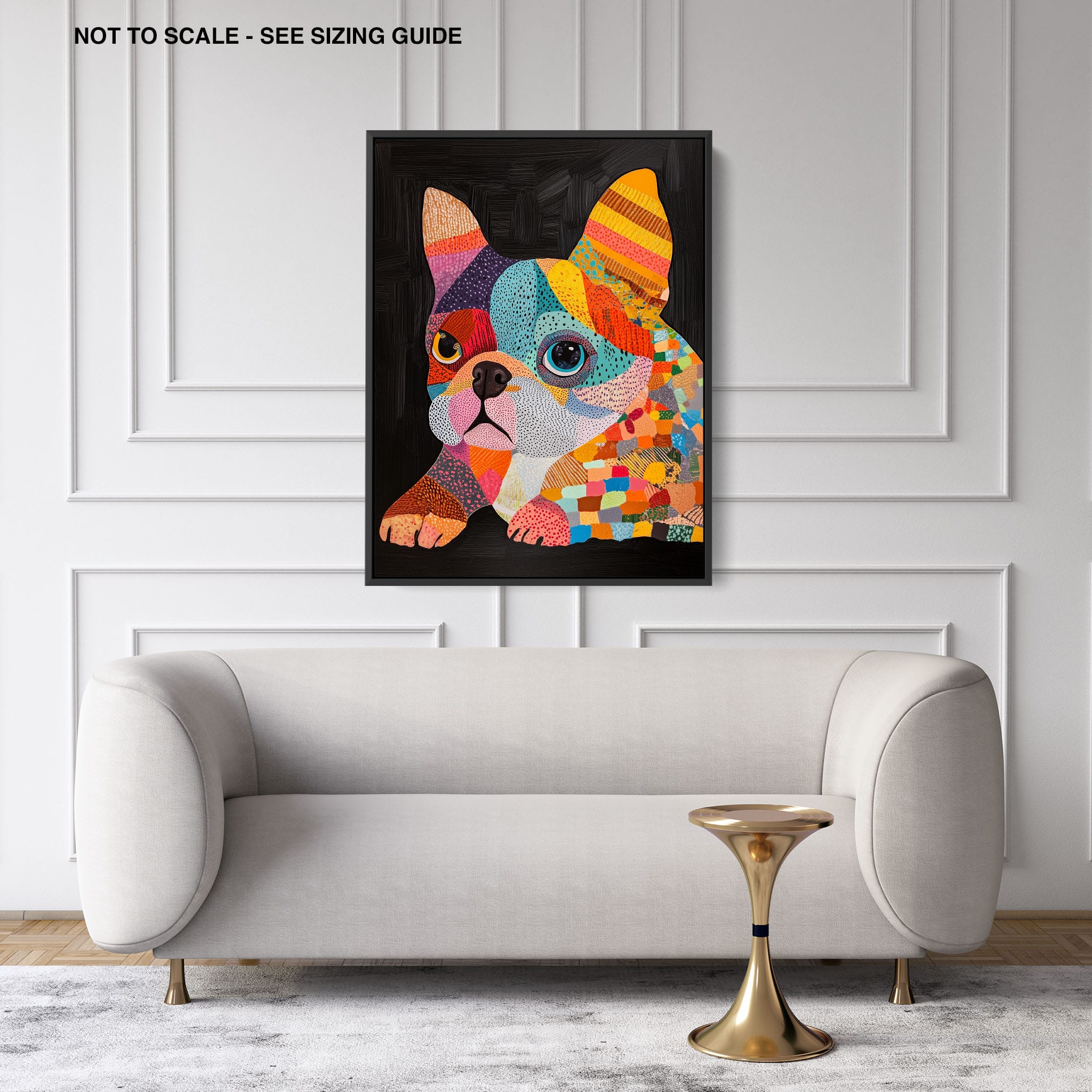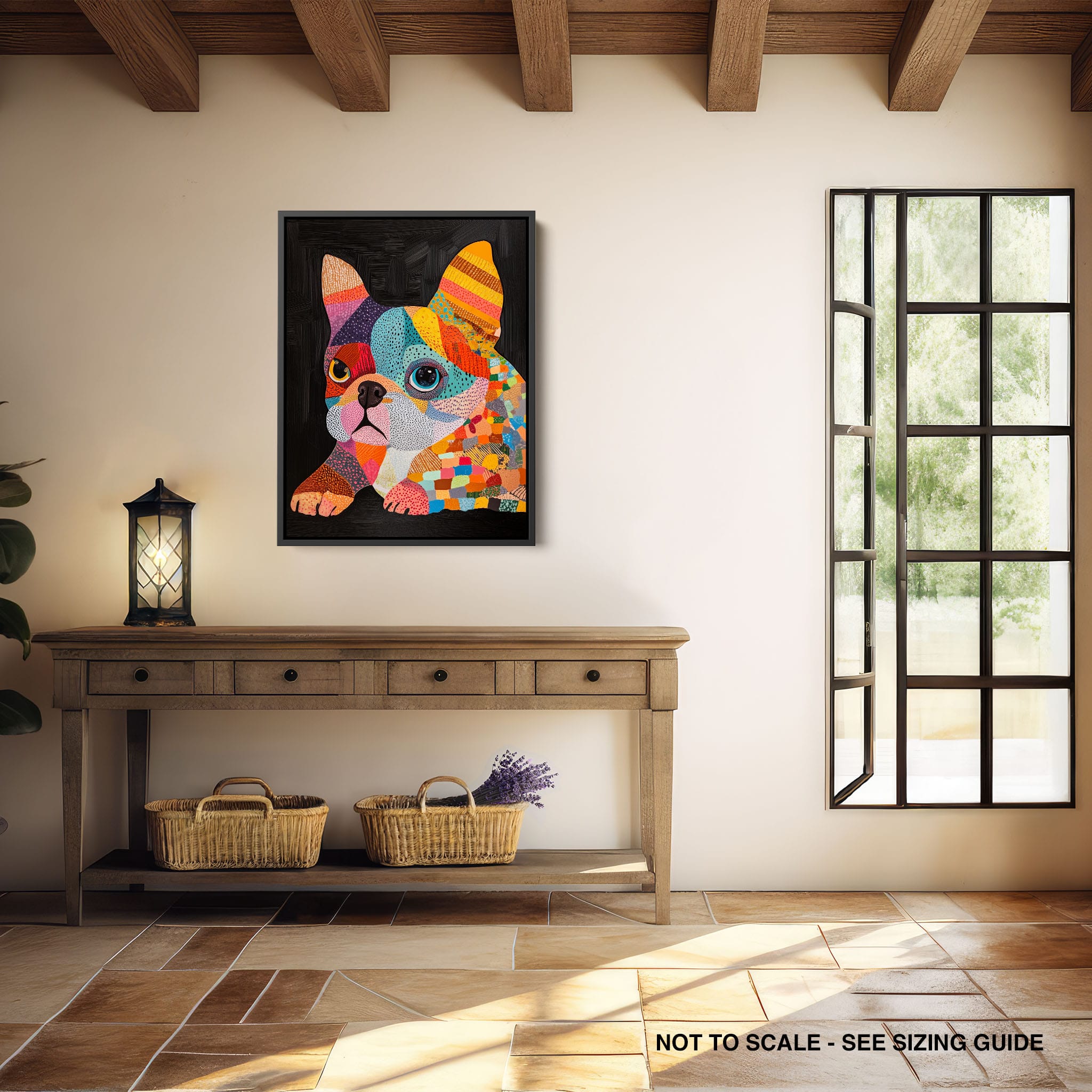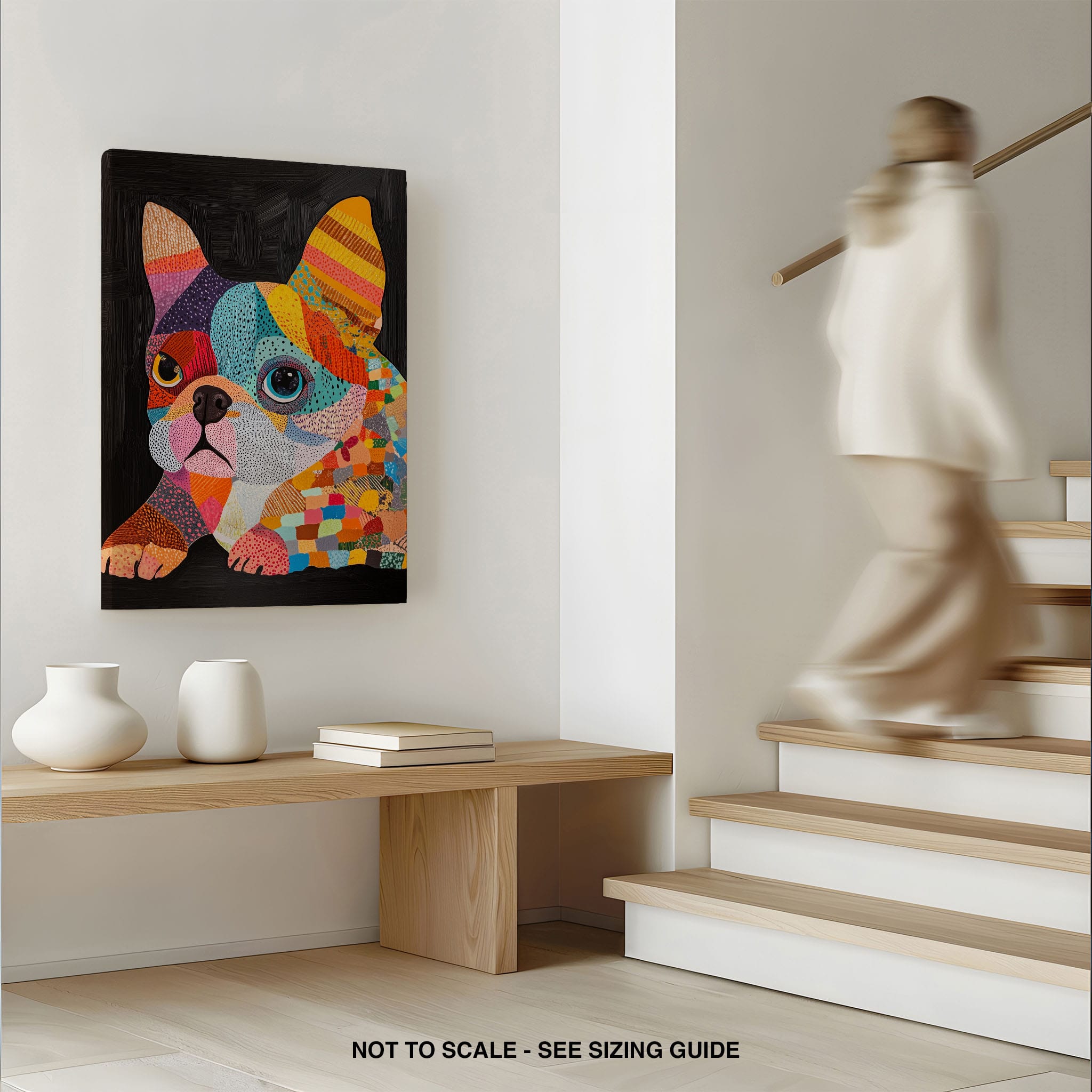 This vibrant painting presents a delightful figurative portrayal of a French Bulldog adorned in a spectrum of lively colors and textured patterns. With a modern and whimsical style, each brushstroke and color choice energizes the piece, creating a playful yet profound expression of canine charm. The meticulous attention to detail and the vivid color palette make it an eye-catching addition to any room. Its joyous and expressive nature makes it a perfect choice for pet lovers and art enthusiasts looking for a piece that captures both the essence and joy of animal companionship.