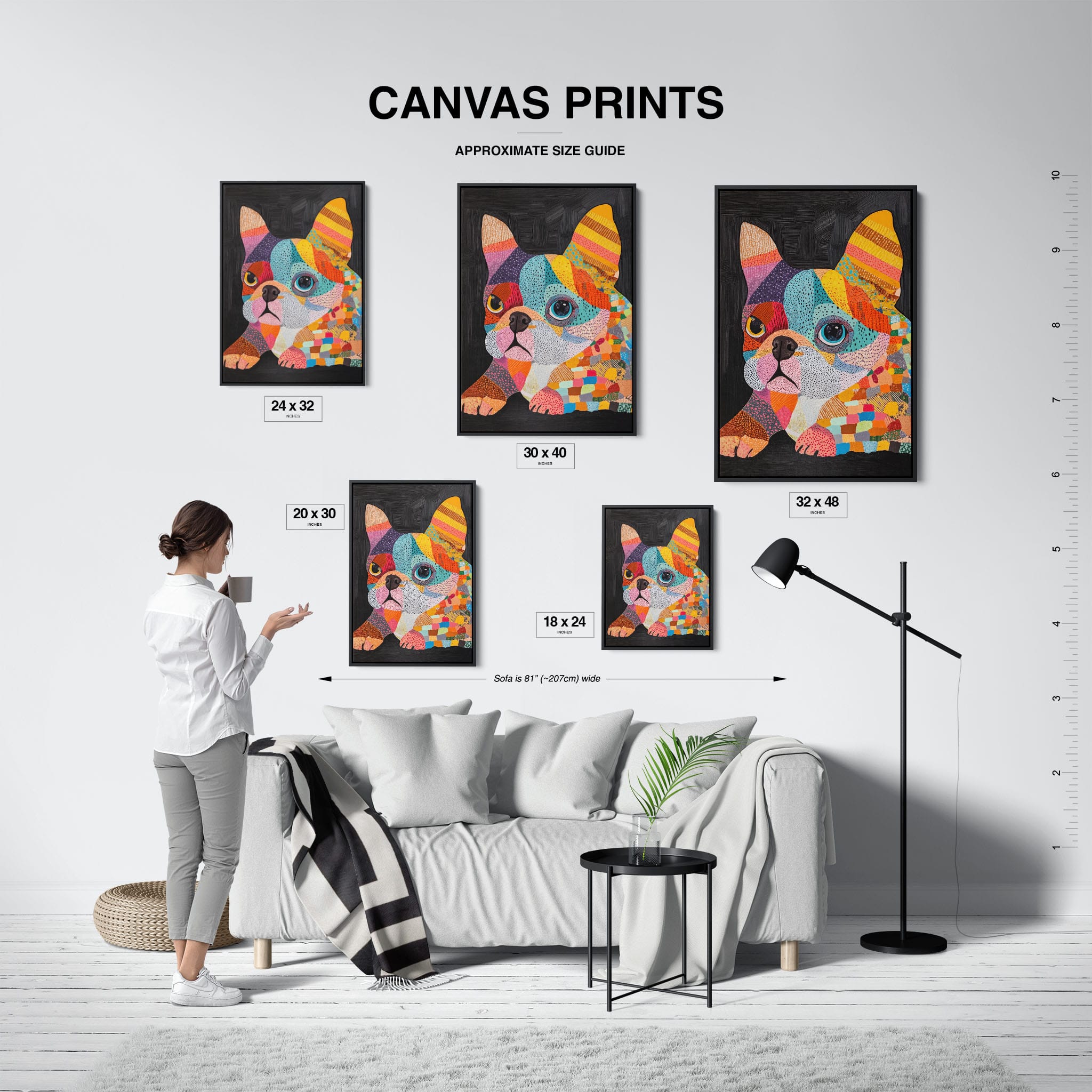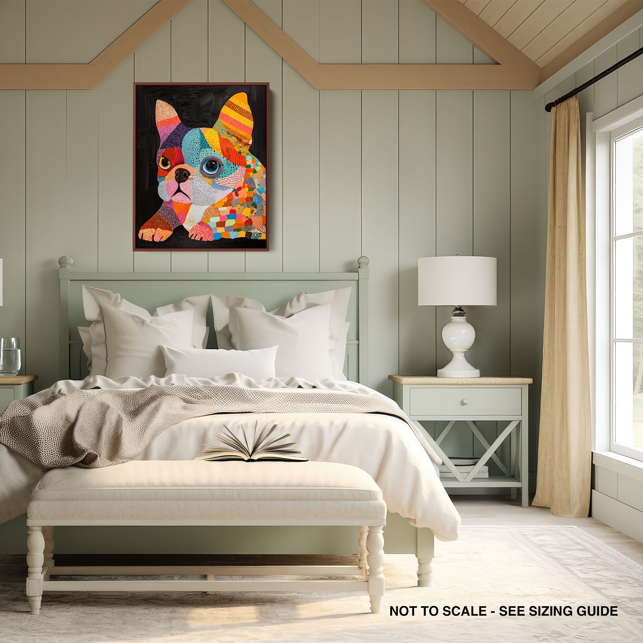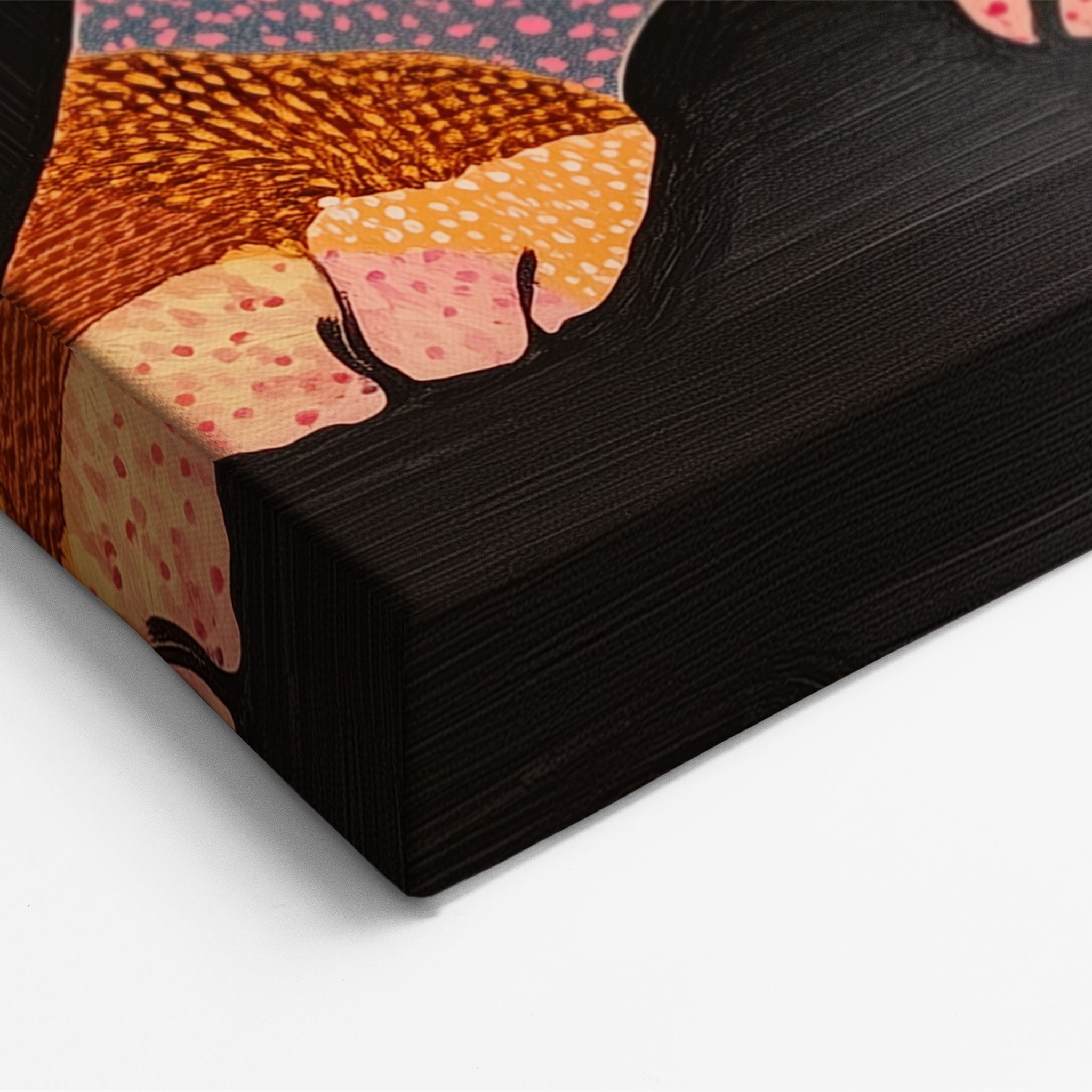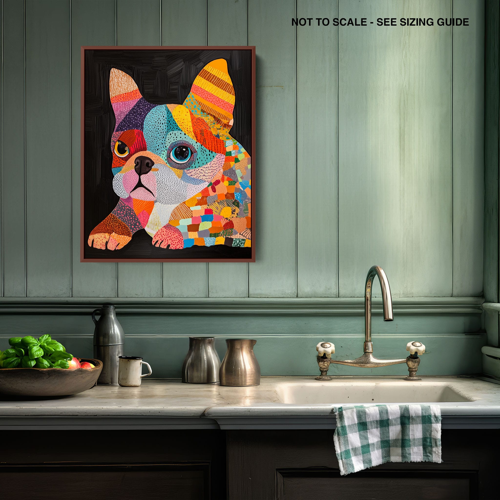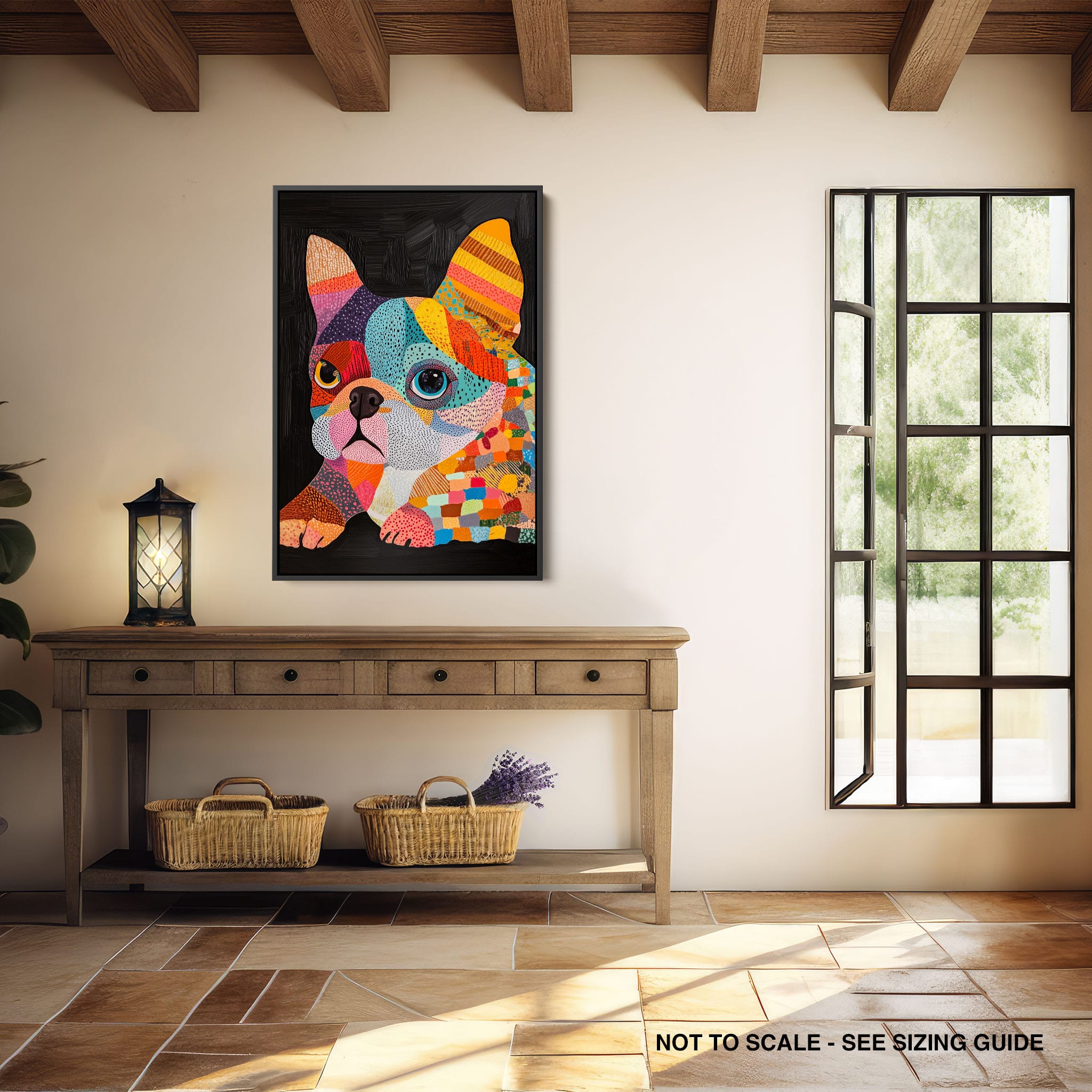 This vibrant painting presents a delightful figurative portrayal of a French Bulldog adorned in a spectrum of lively colors and textured patterns. With a modern and whimsical style, each brushstroke and color choice energizes the piece, creating a playful yet profound expression of canine charm. The meticulous attention to detail and the vivid color palette make it an eye-catching addition to any room. Its joyous and expressive nature makes it a perfect choice for pet lovers and art enthusiasts looking for a piece that captures both the essence and joy of animal companionship.