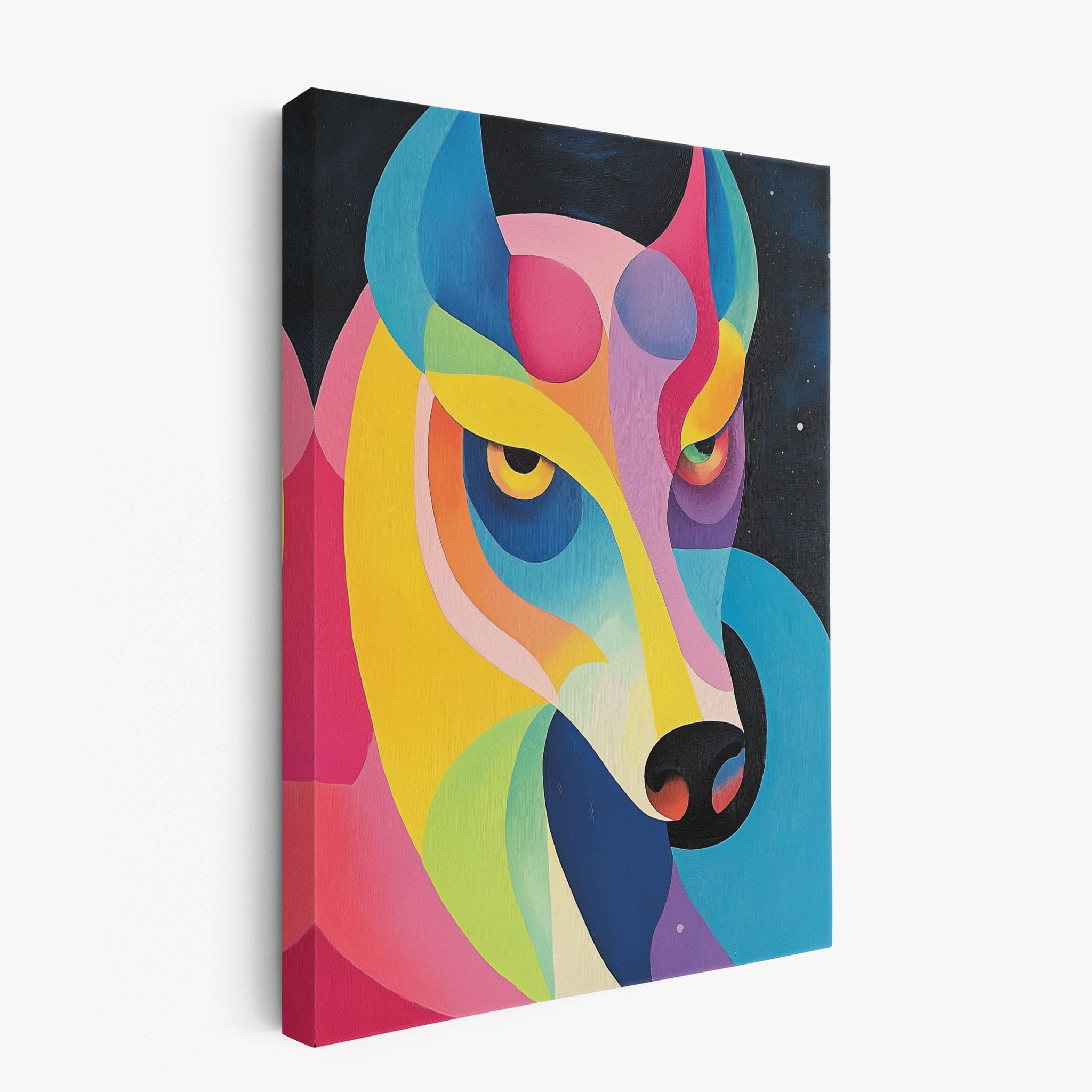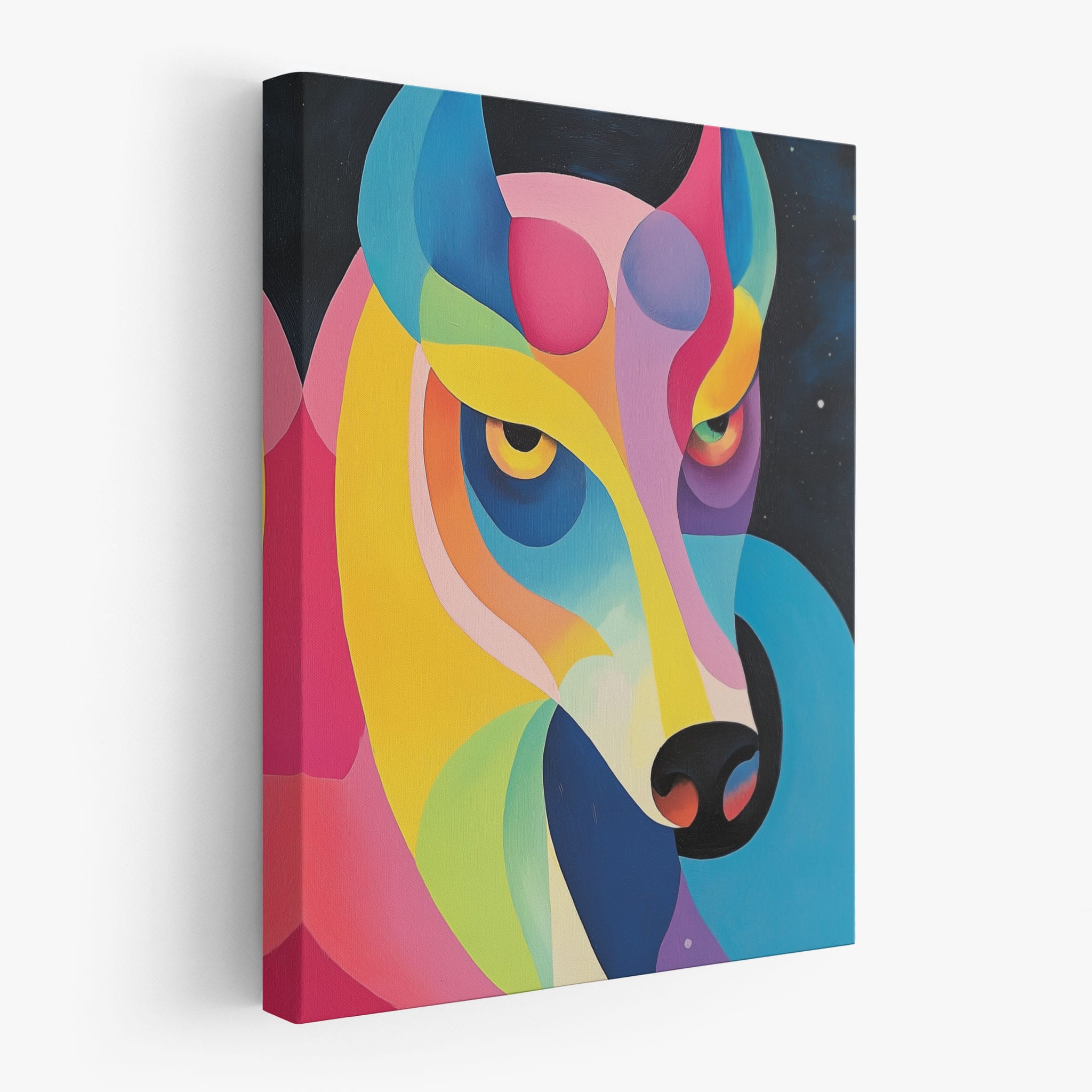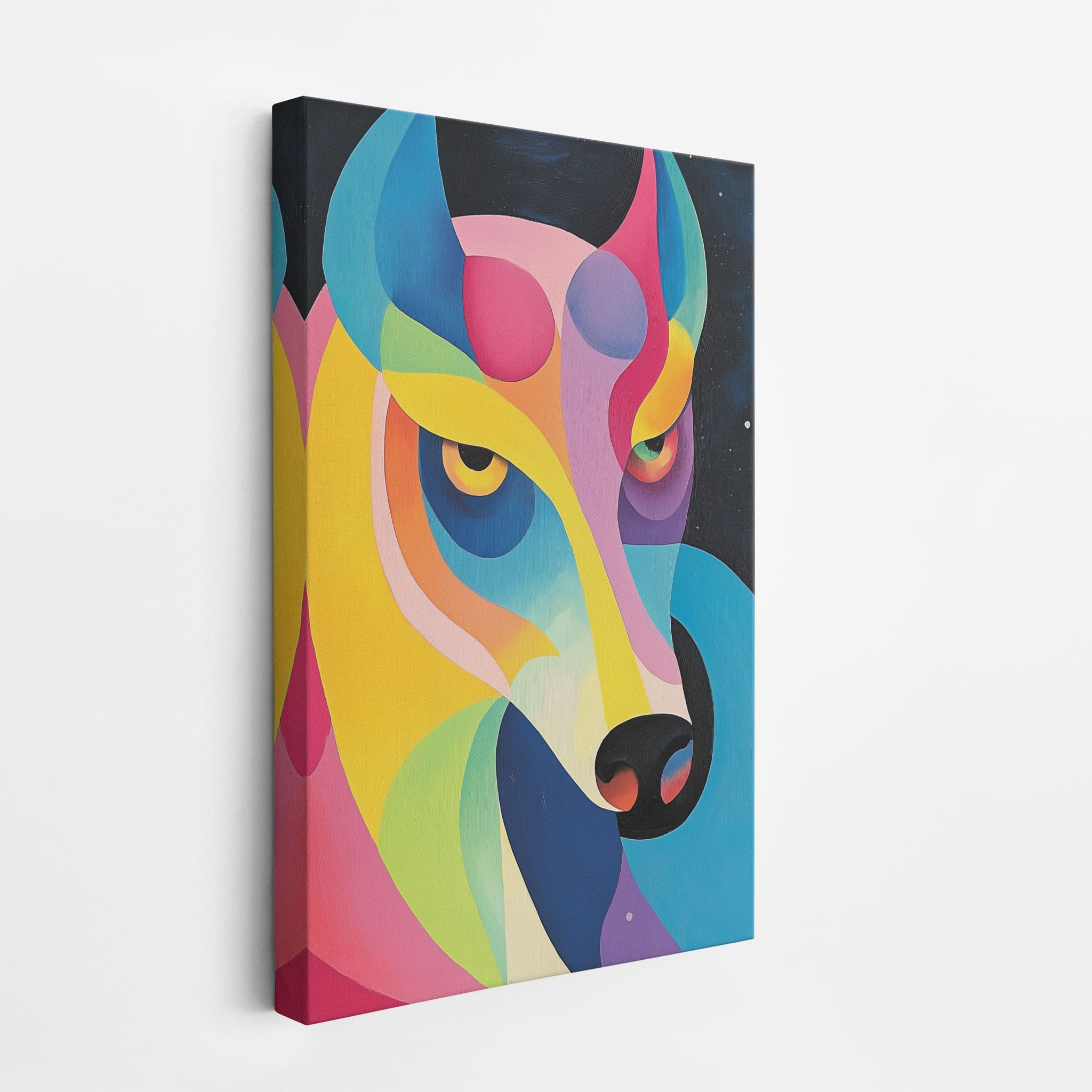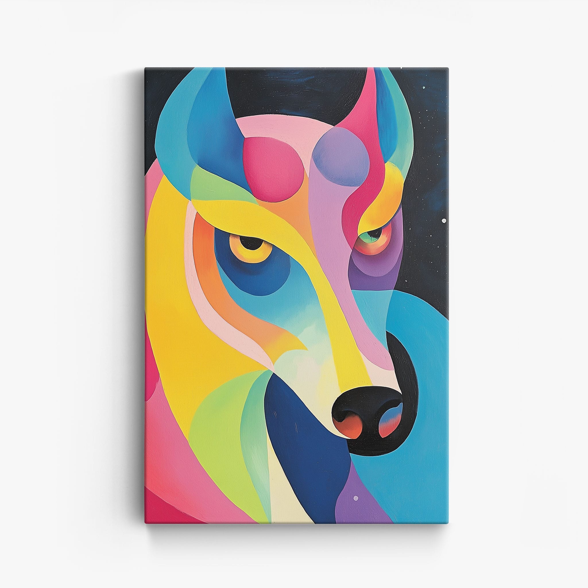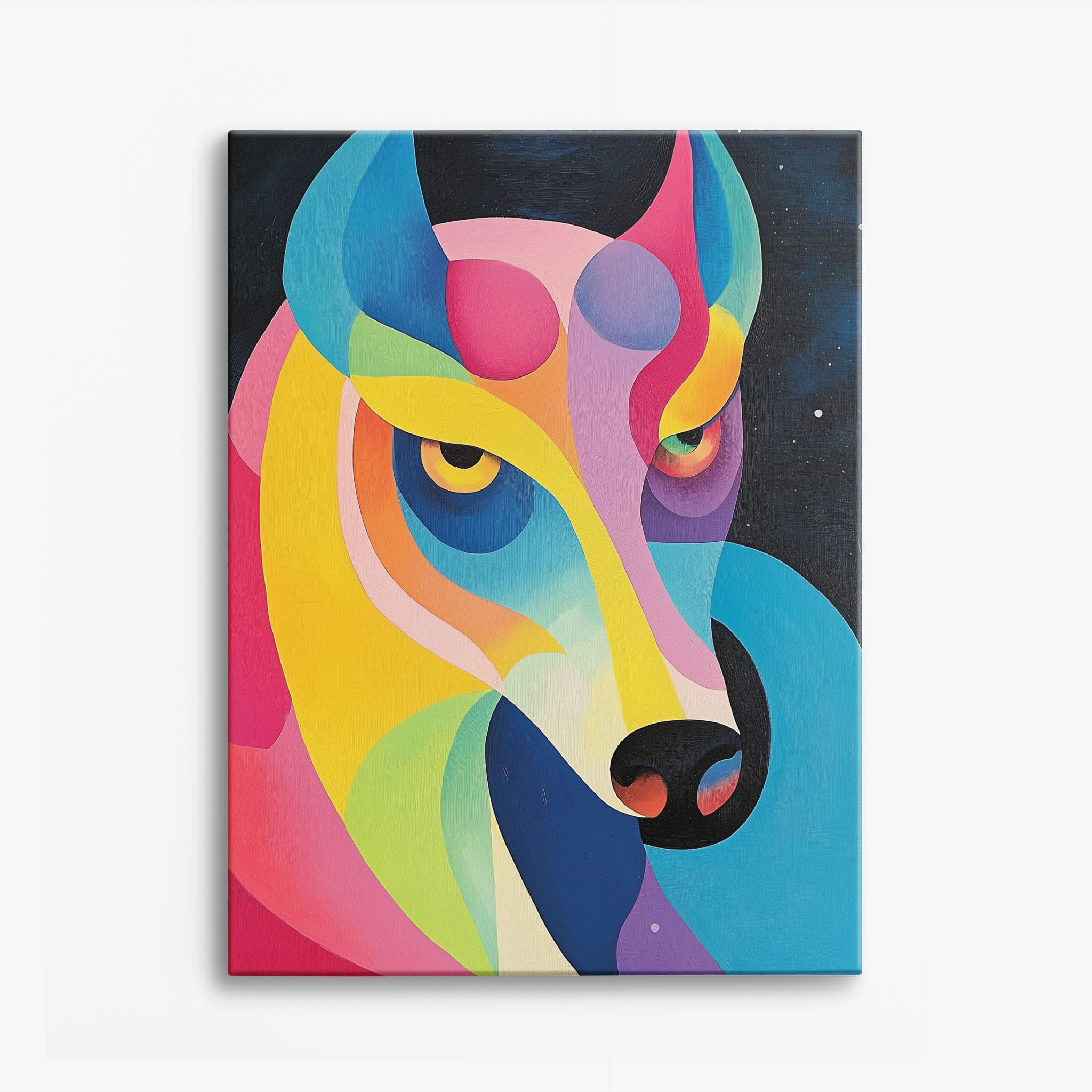 This painting features a vibrant, multi-colored depiction of a canine, rendered in a surreal and figurative style that draws the eye into a world of fantasy and emotion. The bold contrasts and flowing shapes create a modern touch, making it a striking piece for any contemporary art lover. The rich palette ranging from deep blues to bright yellows evokes a sense of mystery and whimsy. Perfect for those looking to add a splash of color and a unique narrative to their living spaces, this artwork is a must-have for enthusiasts of bold, modern designs with a fantastical twist.