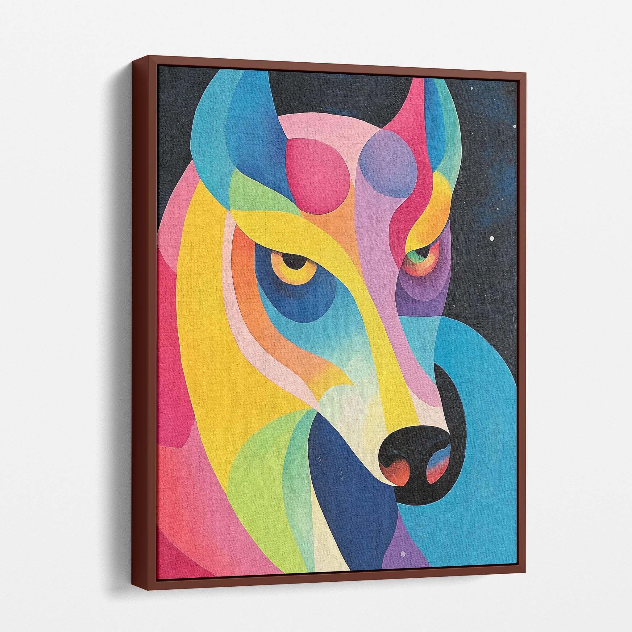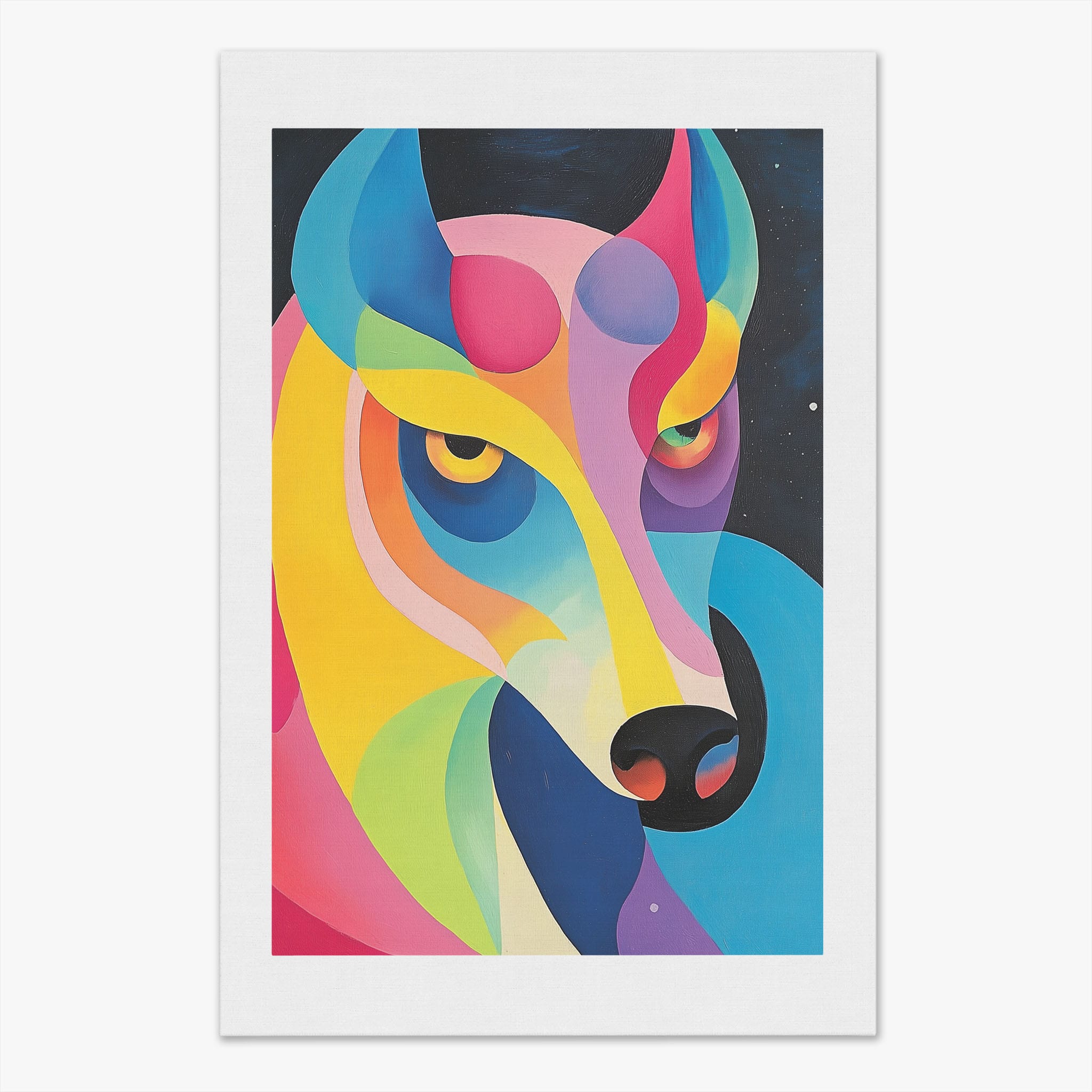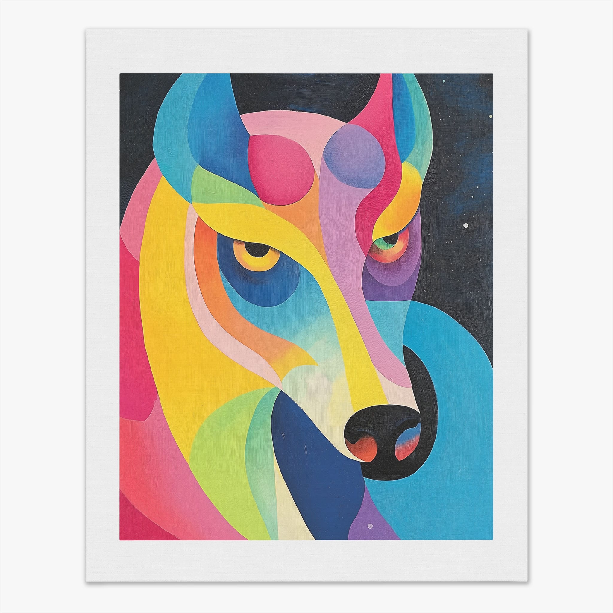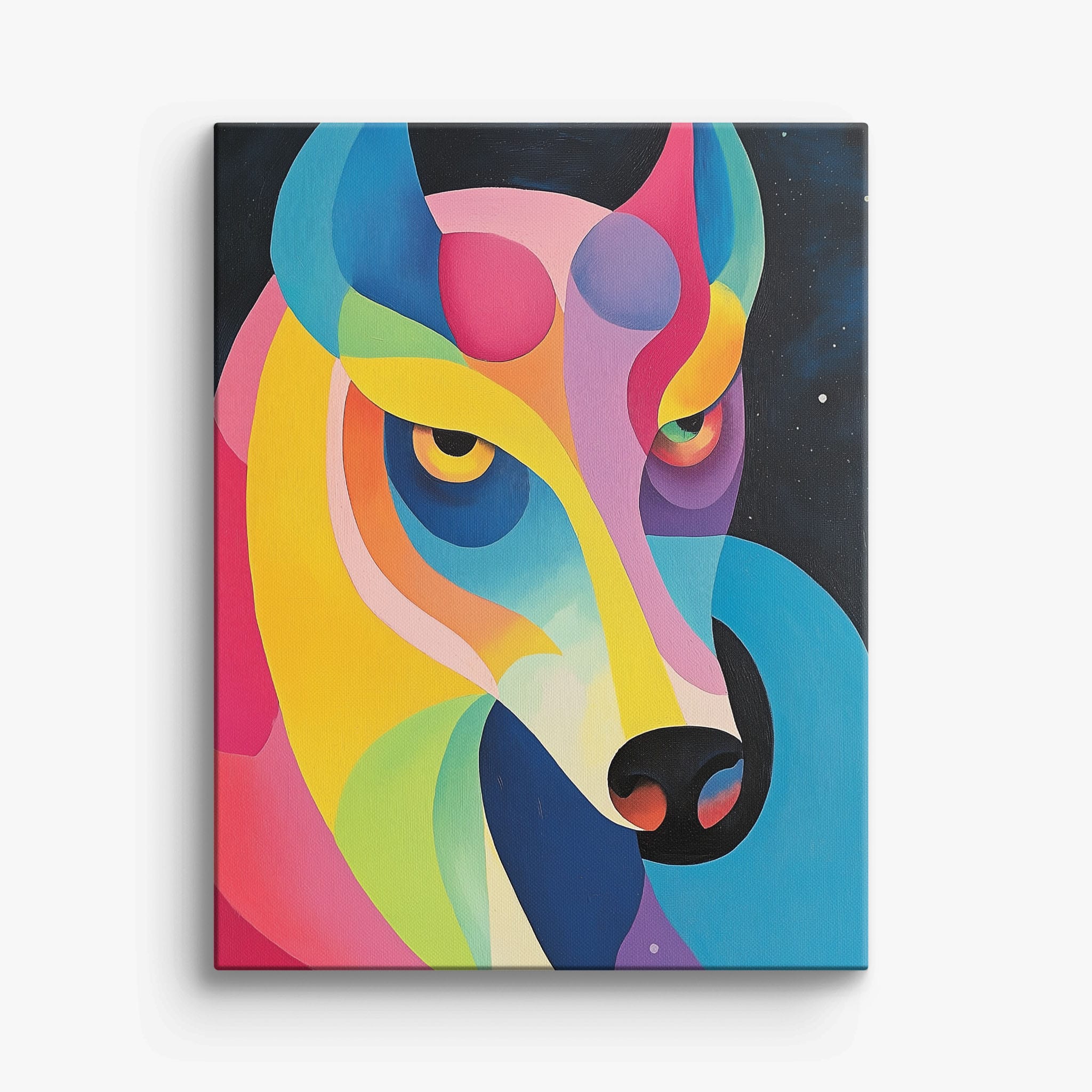 This painting features a vibrant, multi-colored depiction of a canine, rendered in a surreal and figurative style that draws the eye into a world of fantasy and emotion. The bold contrasts and flowing shapes create a modern touch, making it a striking piece for any contemporary art lover. The rich palette ranging from deep blues to bright yellows evokes a sense of mystery and whimsy. Perfect for those looking to add a splash of color and a unique narrative to their living spaces, this artwork is a must-have for enthusiasts of bold, modern designs with a fantastical twist.