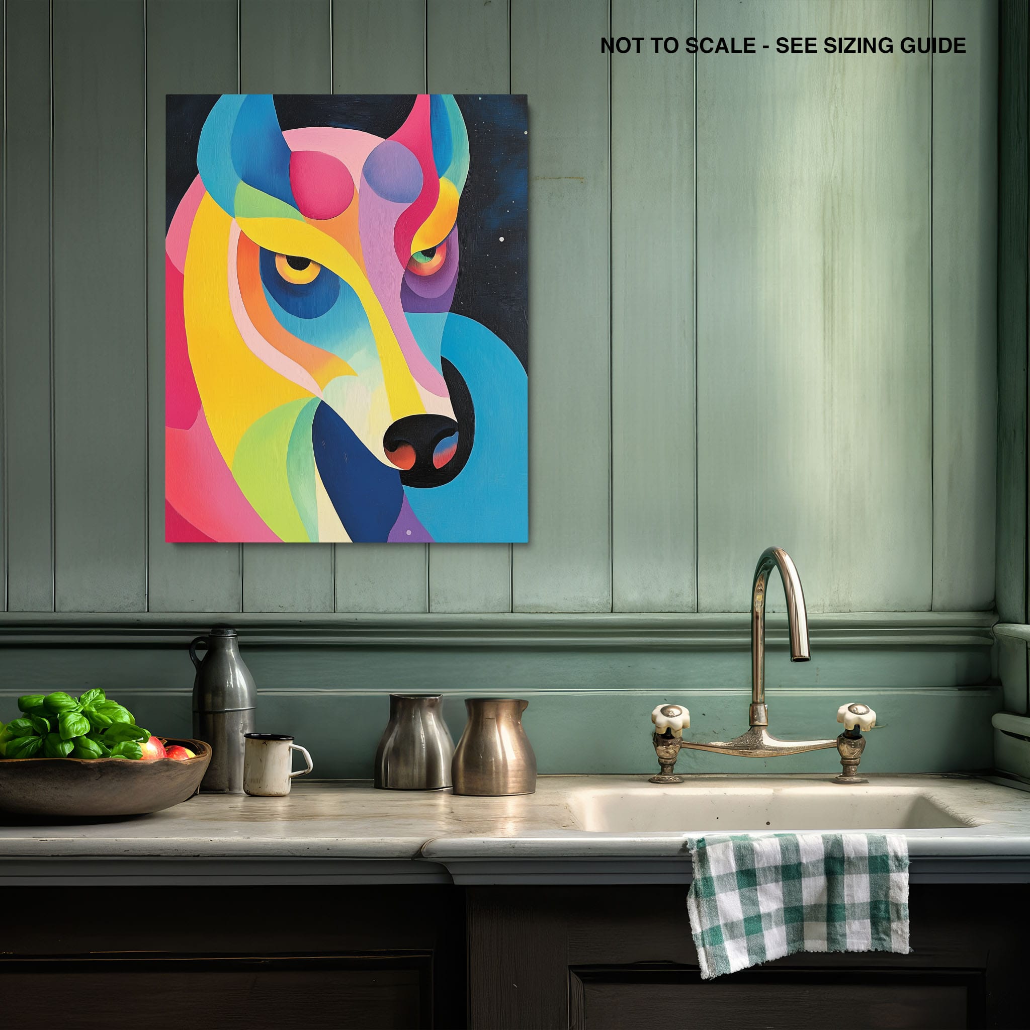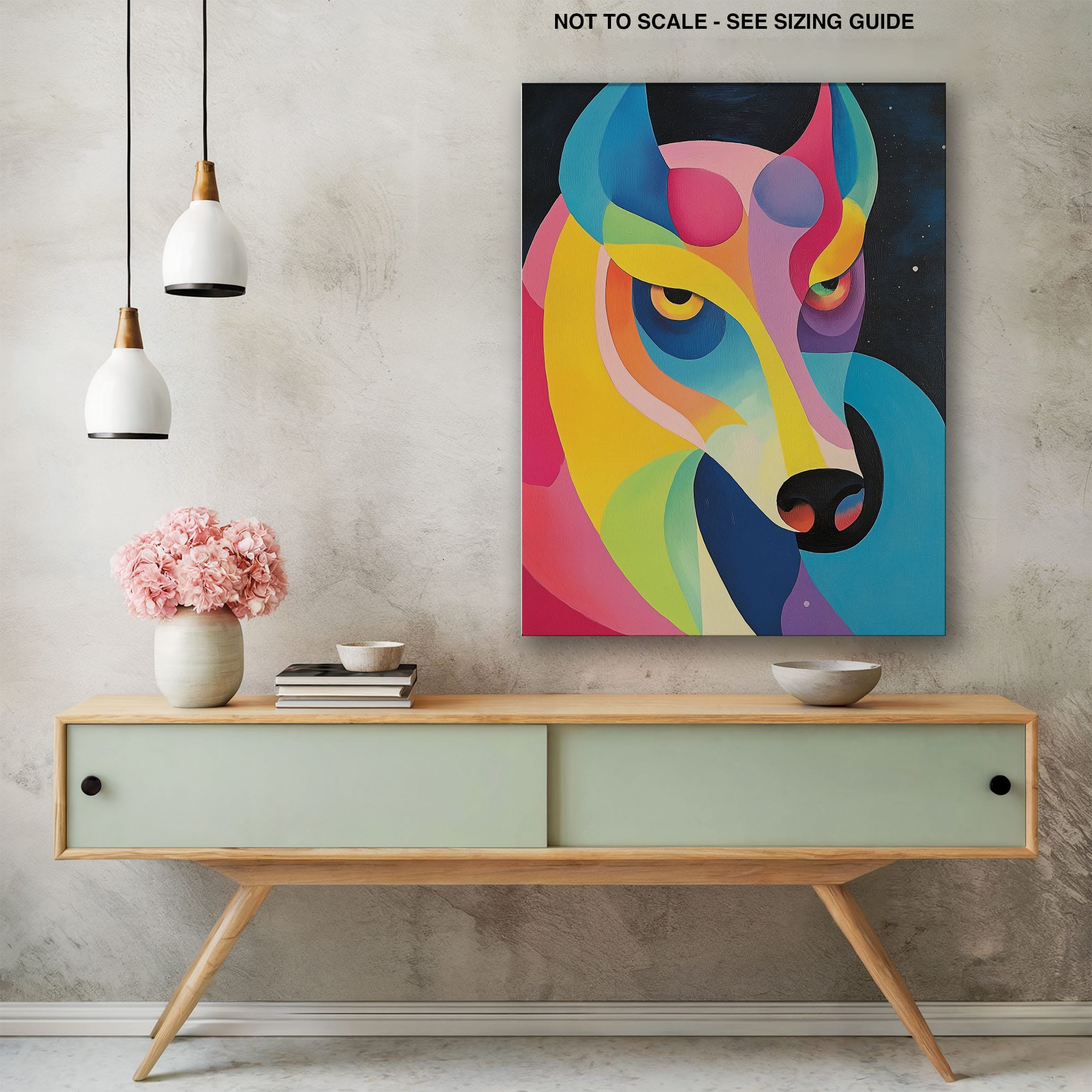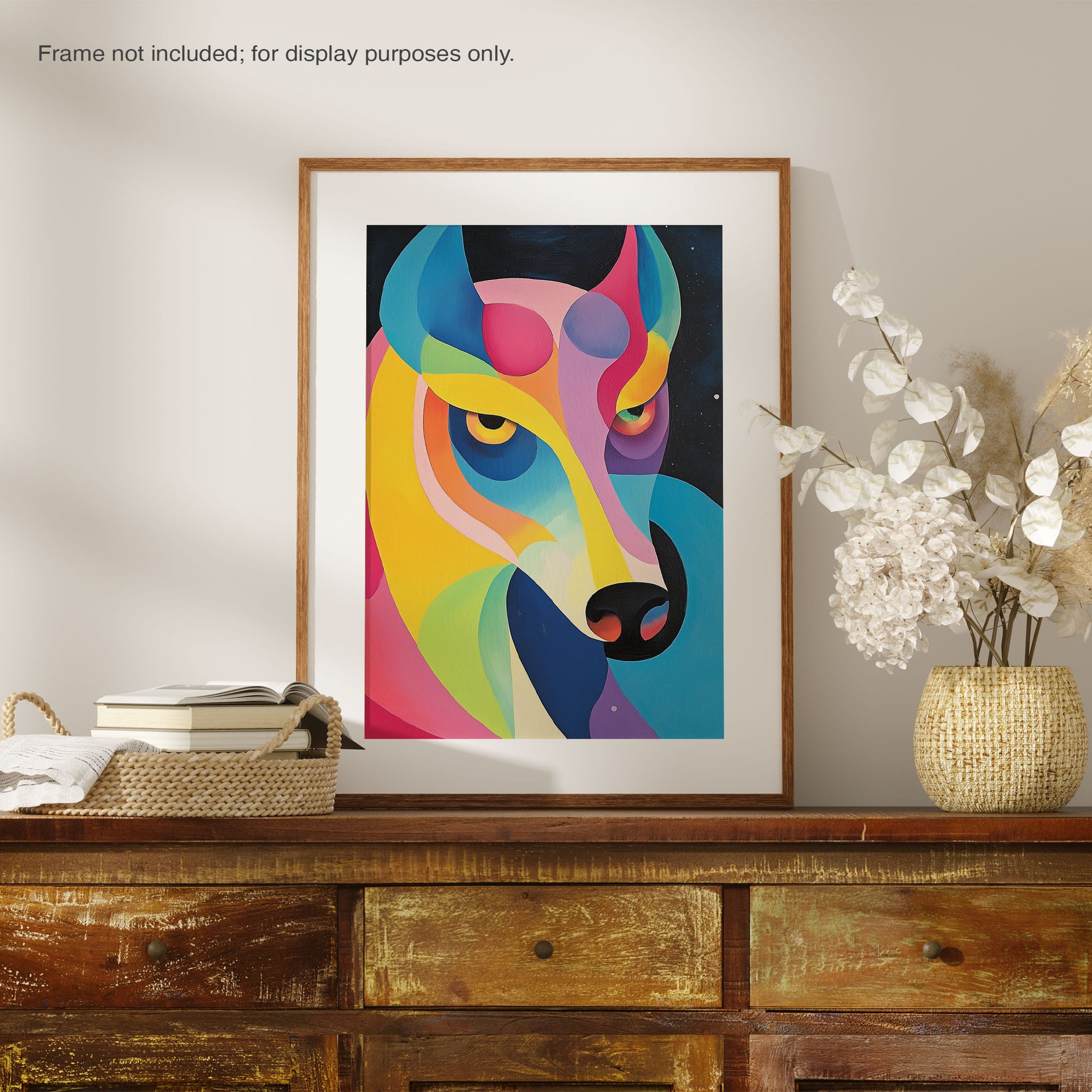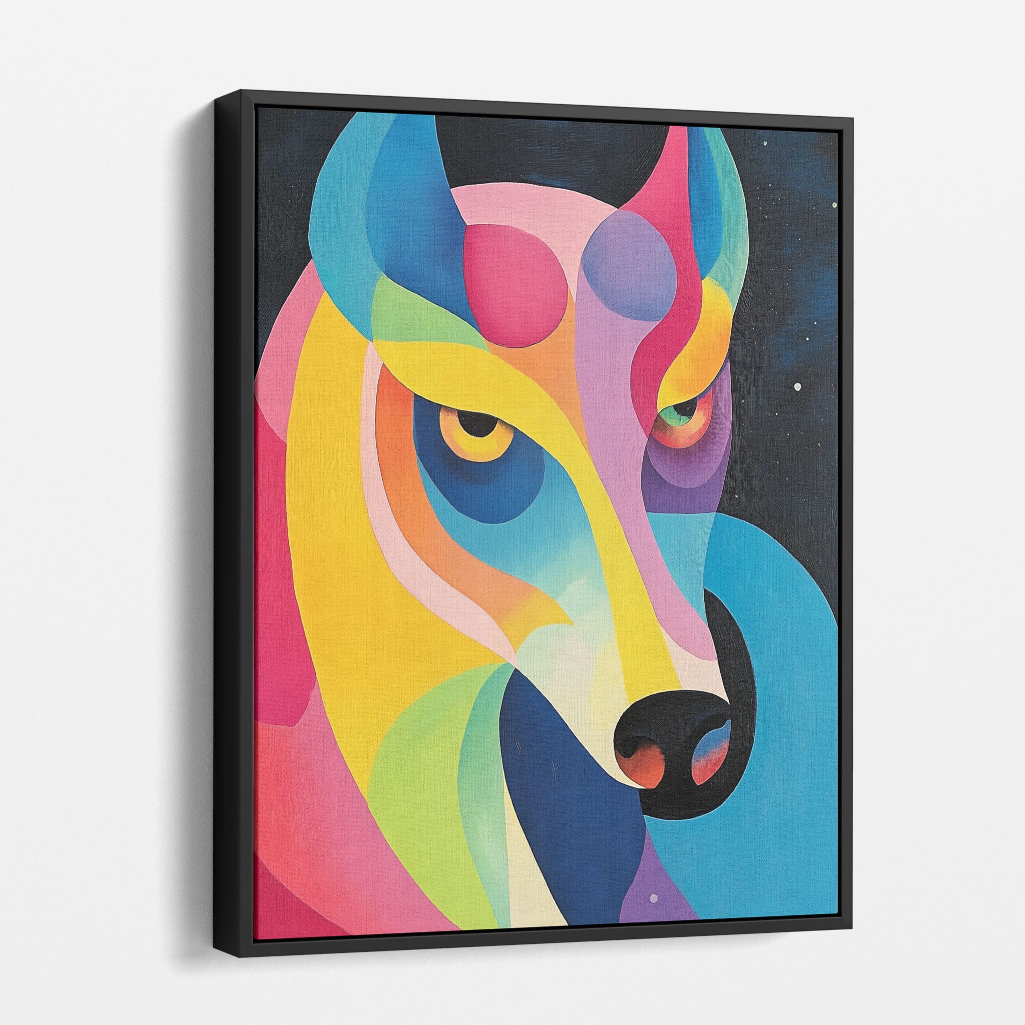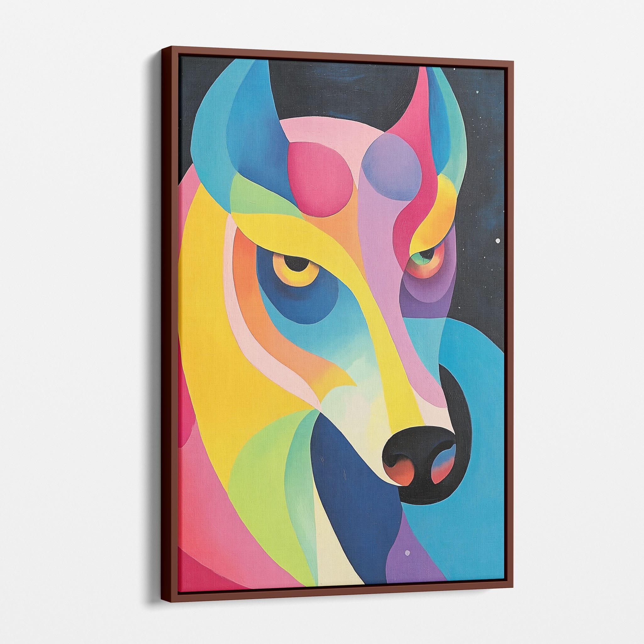 This painting features a vibrant, multi-colored depiction of a canine, rendered in a surreal and figurative style that draws the eye into a world of fantasy and emotion. The bold contrasts and flowing shapes create a modern touch, making it a striking piece for any contemporary art lover. The rich palette ranging from deep blues to bright yellows evokes a sense of mystery and whimsy. Perfect for those looking to add a splash of color and a unique narrative to their living spaces, this artwork is a must-have for enthusiasts of bold, modern designs with a fantastical twist.