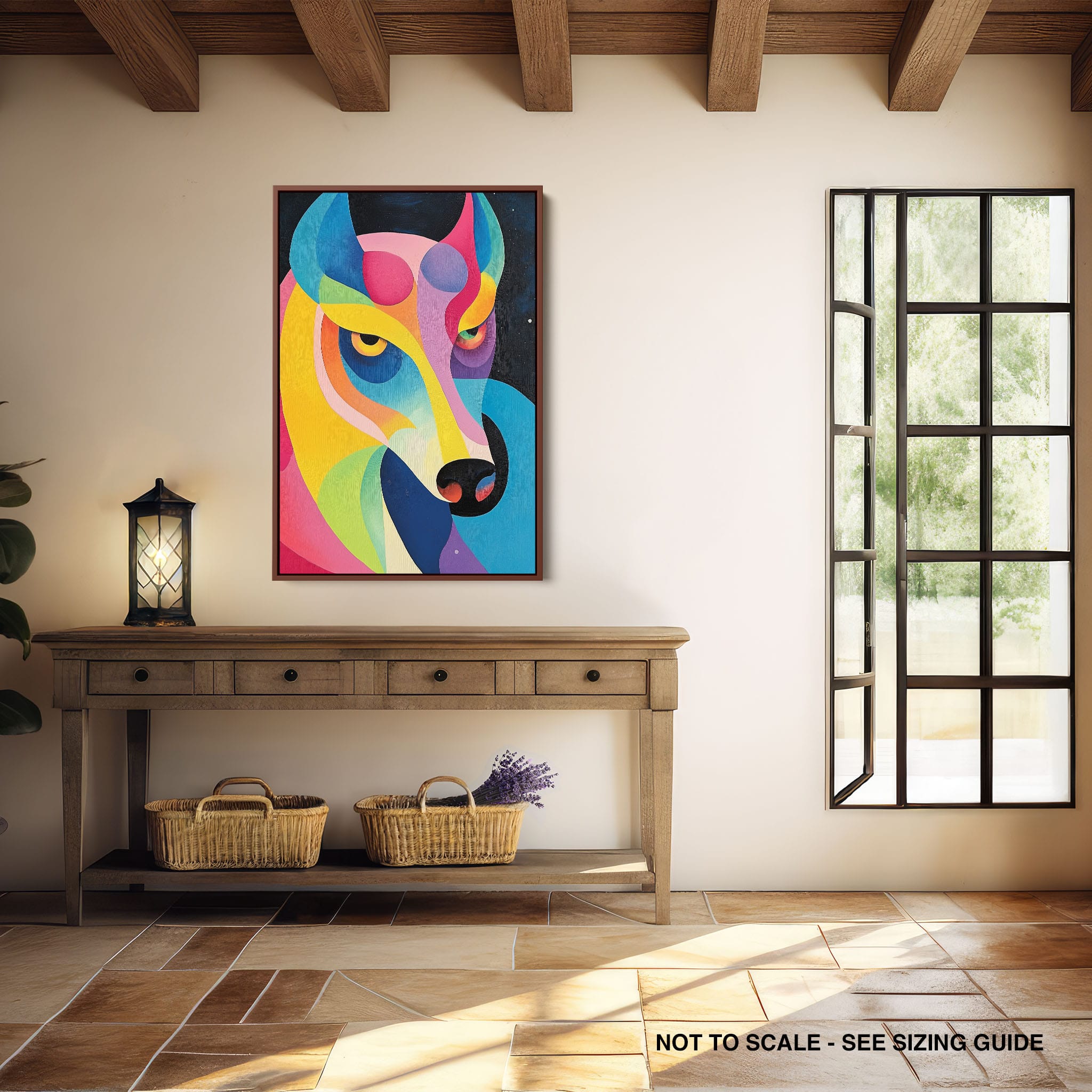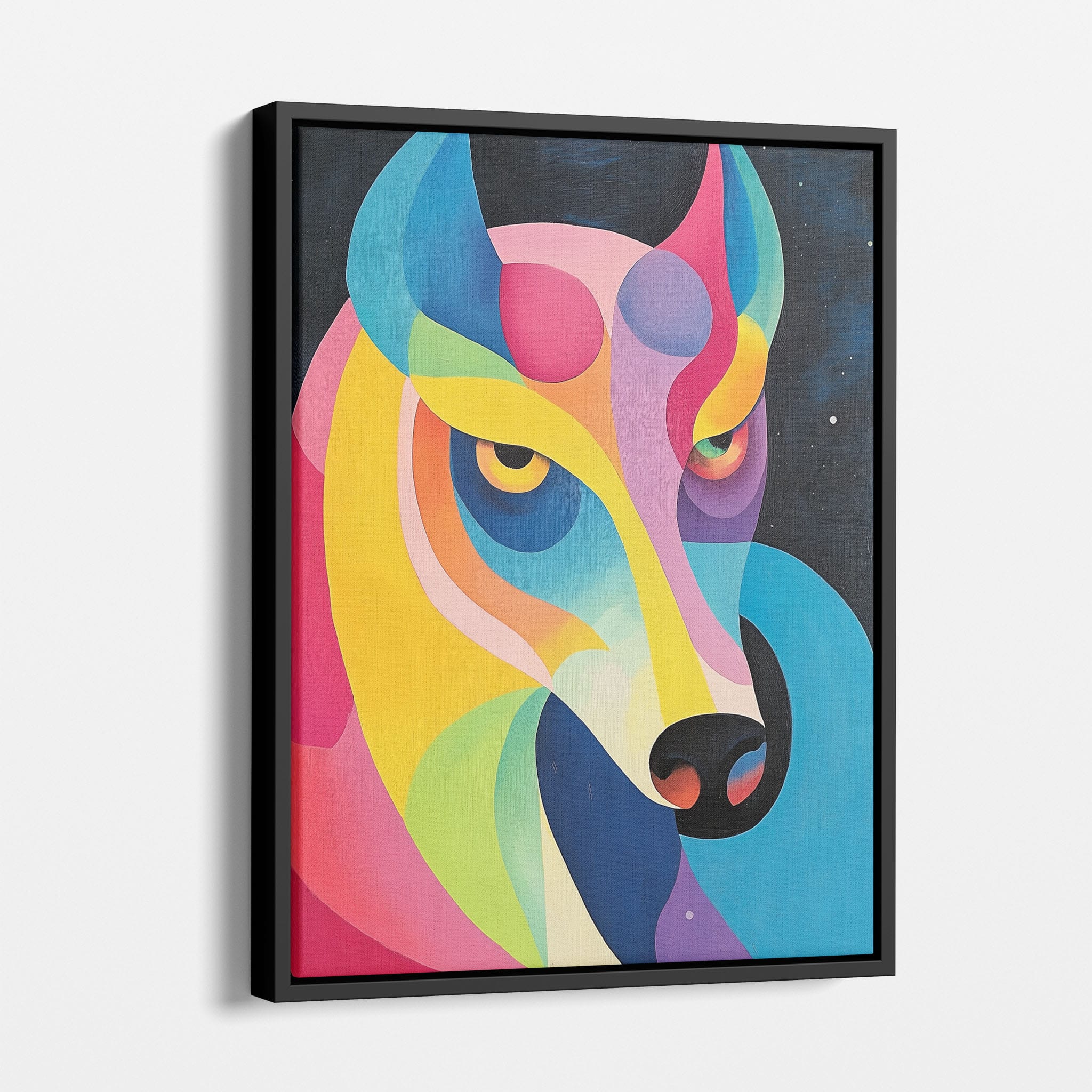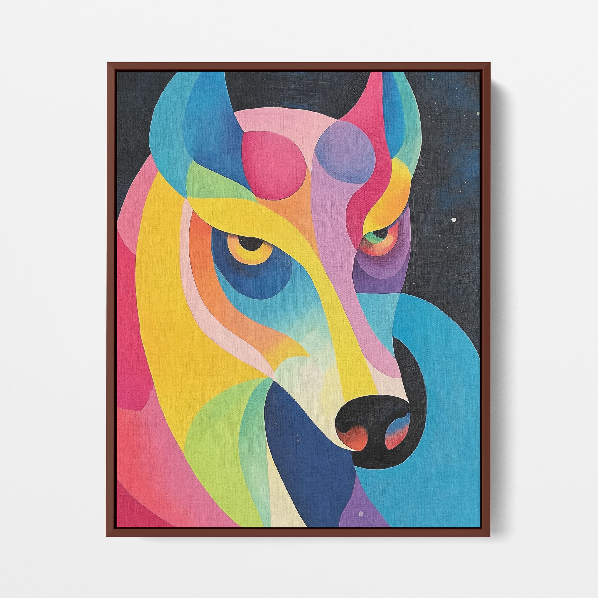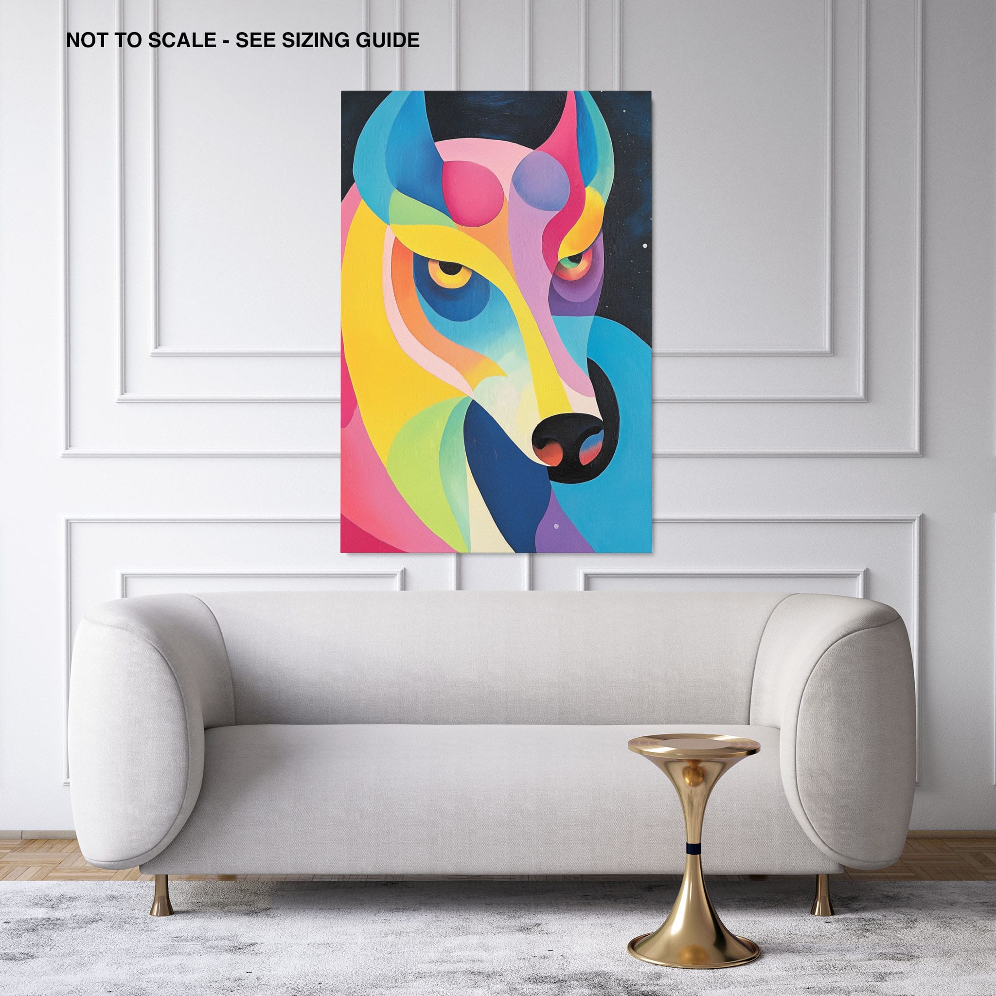 This painting features a vibrant, multi-colored depiction of a canine, rendered in a surreal and figurative style that draws the eye into a world of fantasy and emotion. The bold contrasts and flowing shapes create a modern touch, making it a striking piece for any contemporary art lover. The rich palette ranging from deep blues to bright yellows evokes a sense of mystery and whimsy. Perfect for those looking to add a splash of color and a unique narrative to their living spaces, this artwork is a must-have for enthusiasts of bold, modern designs with a fantastical twist.