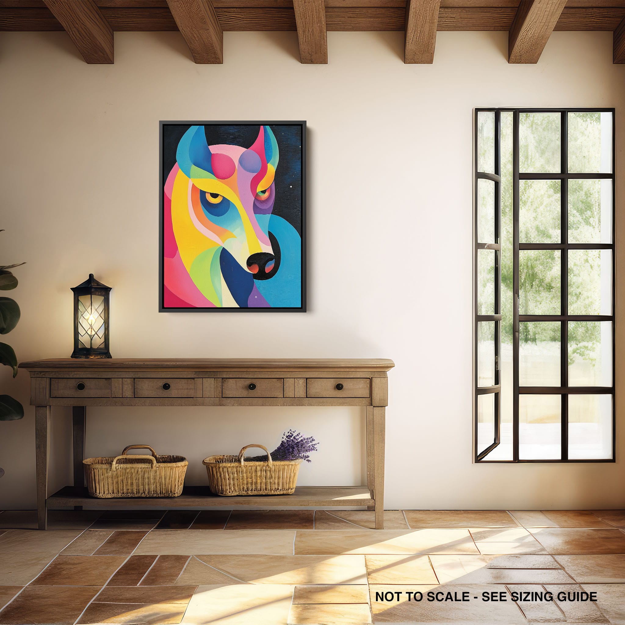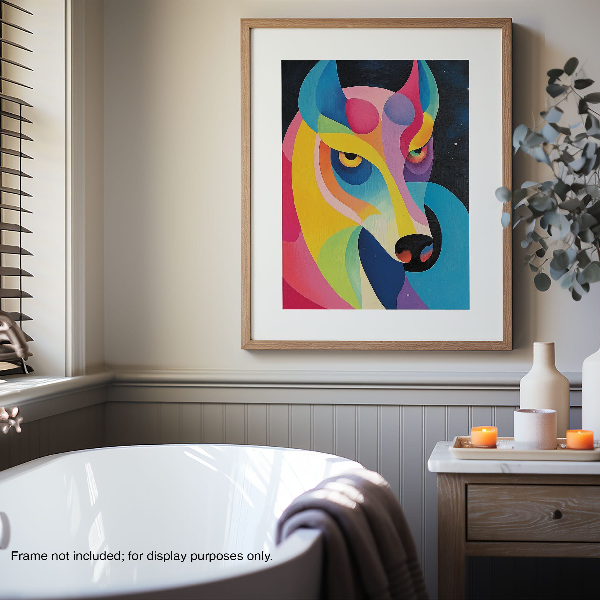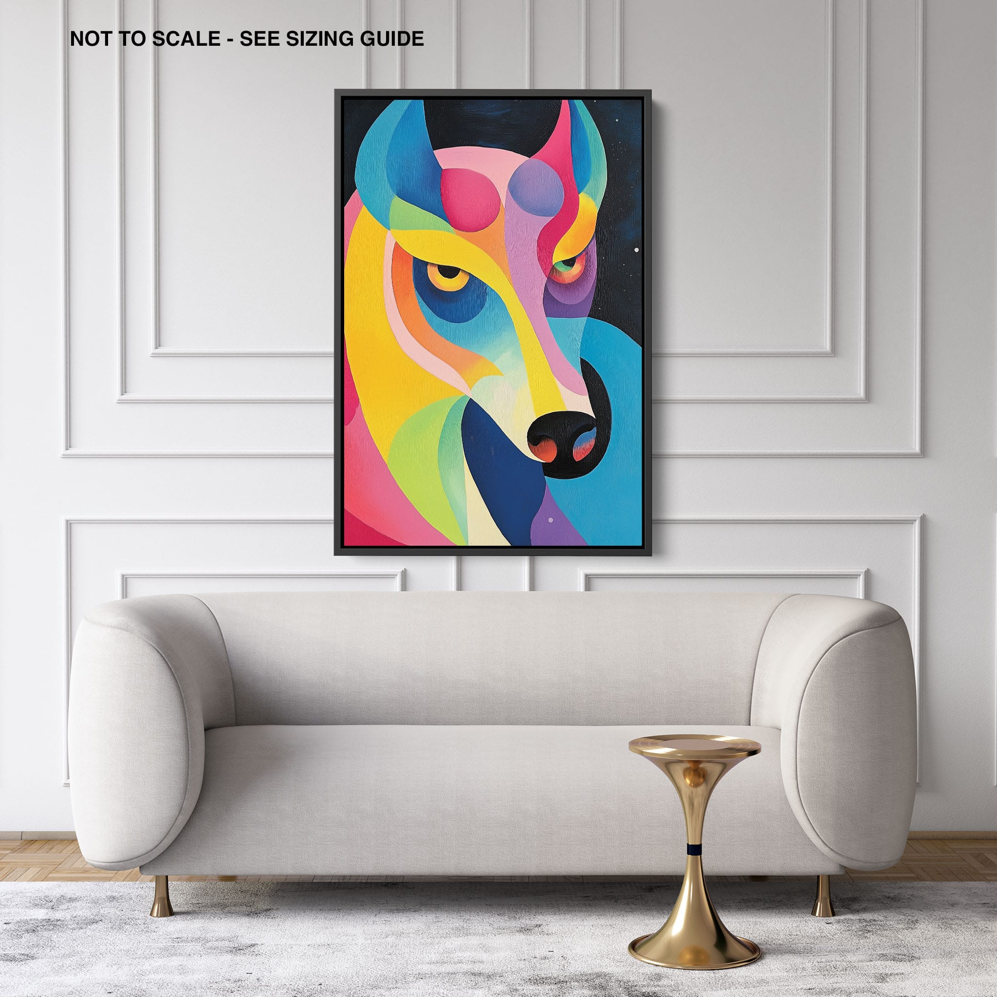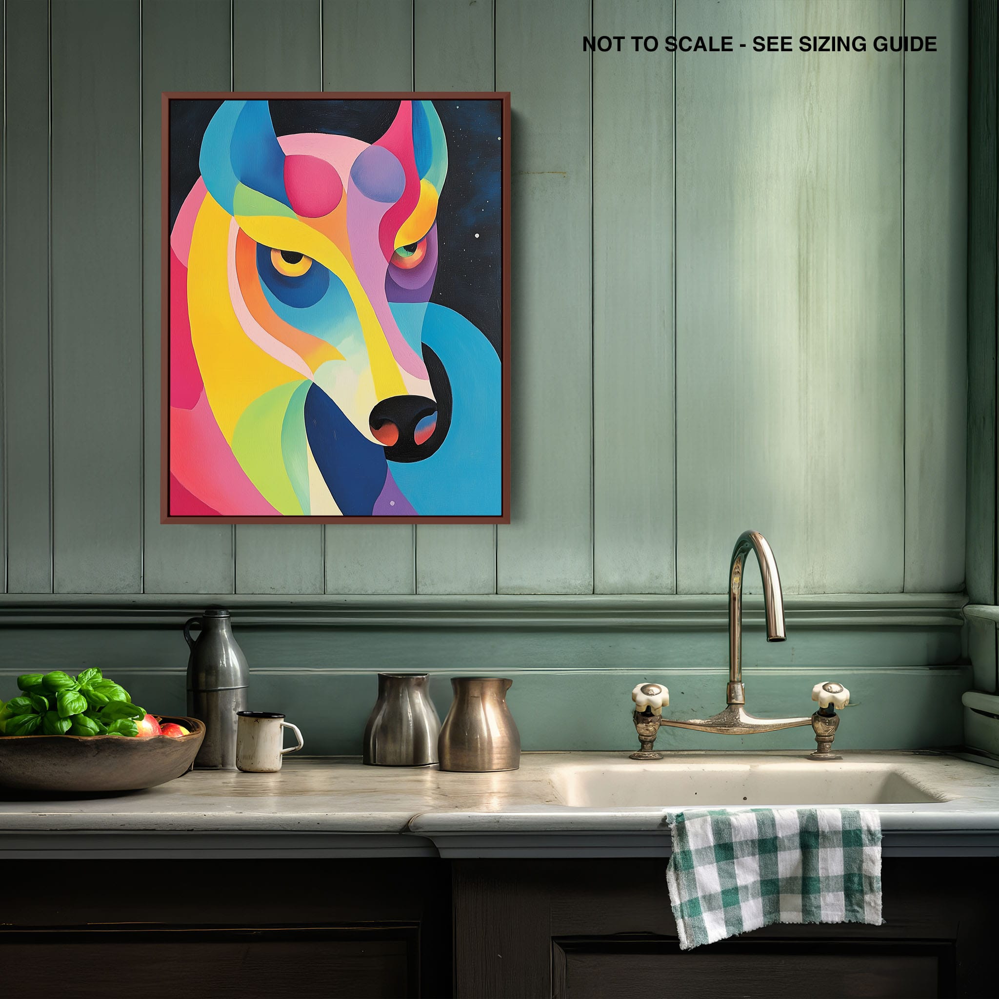 This painting features a vibrant, multi-colored depiction of a canine, rendered in a surreal and figurative style that draws the eye into a world of fantasy and emotion. The bold contrasts and flowing shapes create a modern touch, making it a striking piece for any contemporary art lover. The rich palette ranging from deep blues to bright yellows evokes a sense of mystery and whimsy. Perfect for those looking to add a splash of color and a unique narrative to their living spaces, this artwork is a must-have for enthusiasts of bold, modern designs with a fantastical twist.