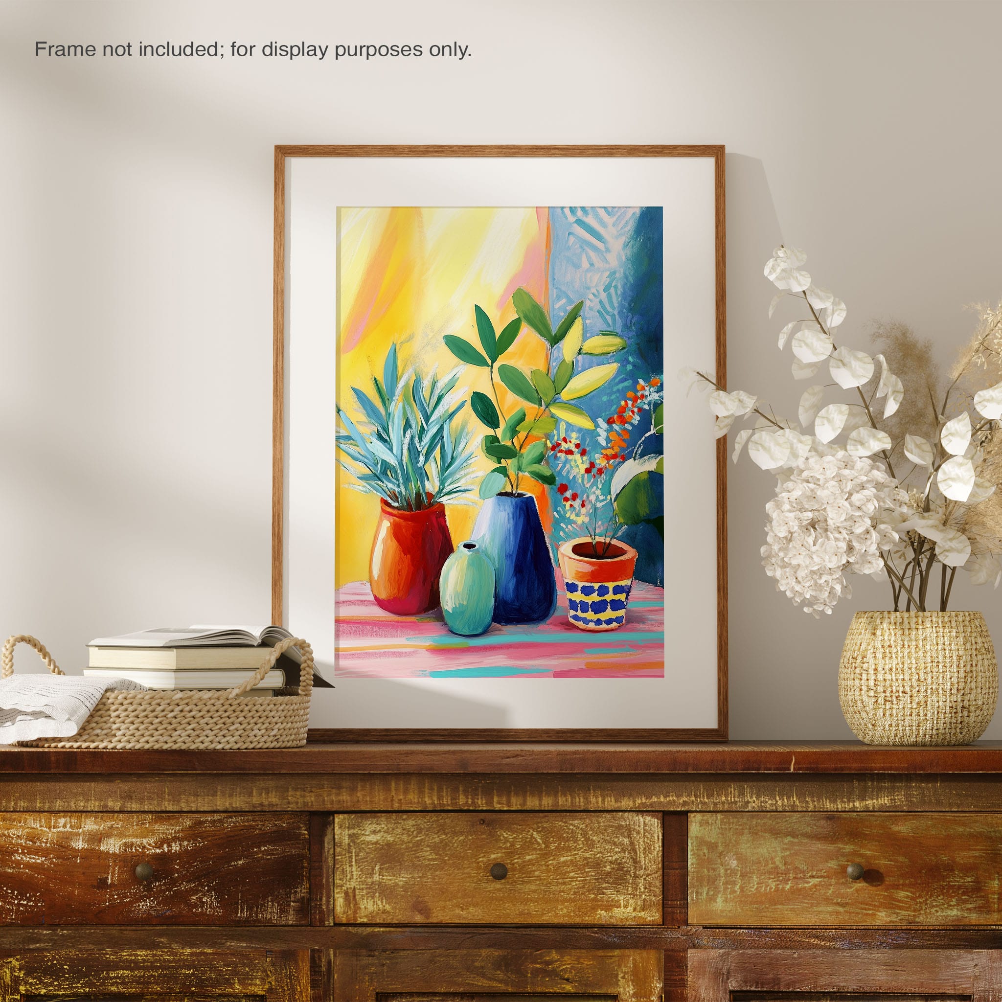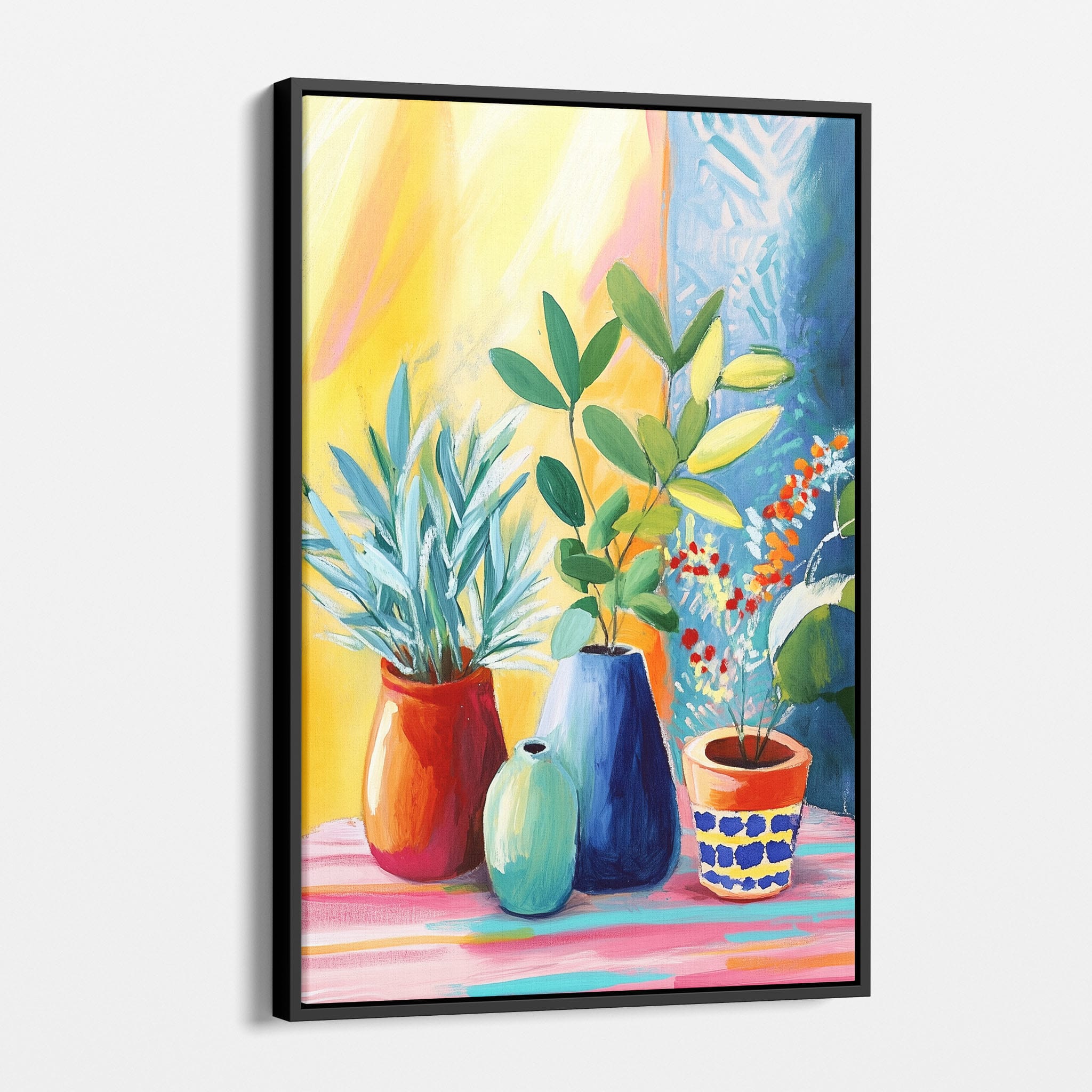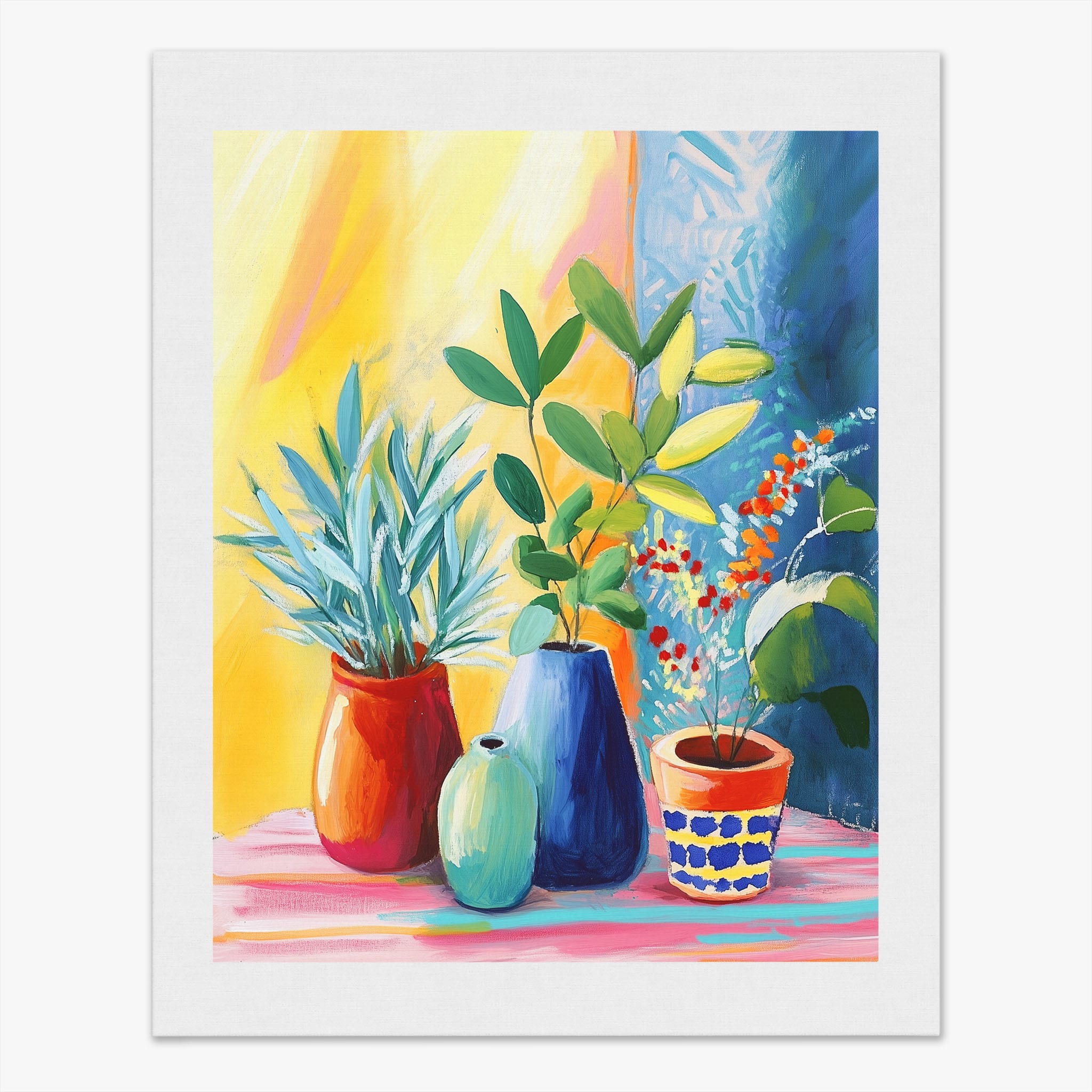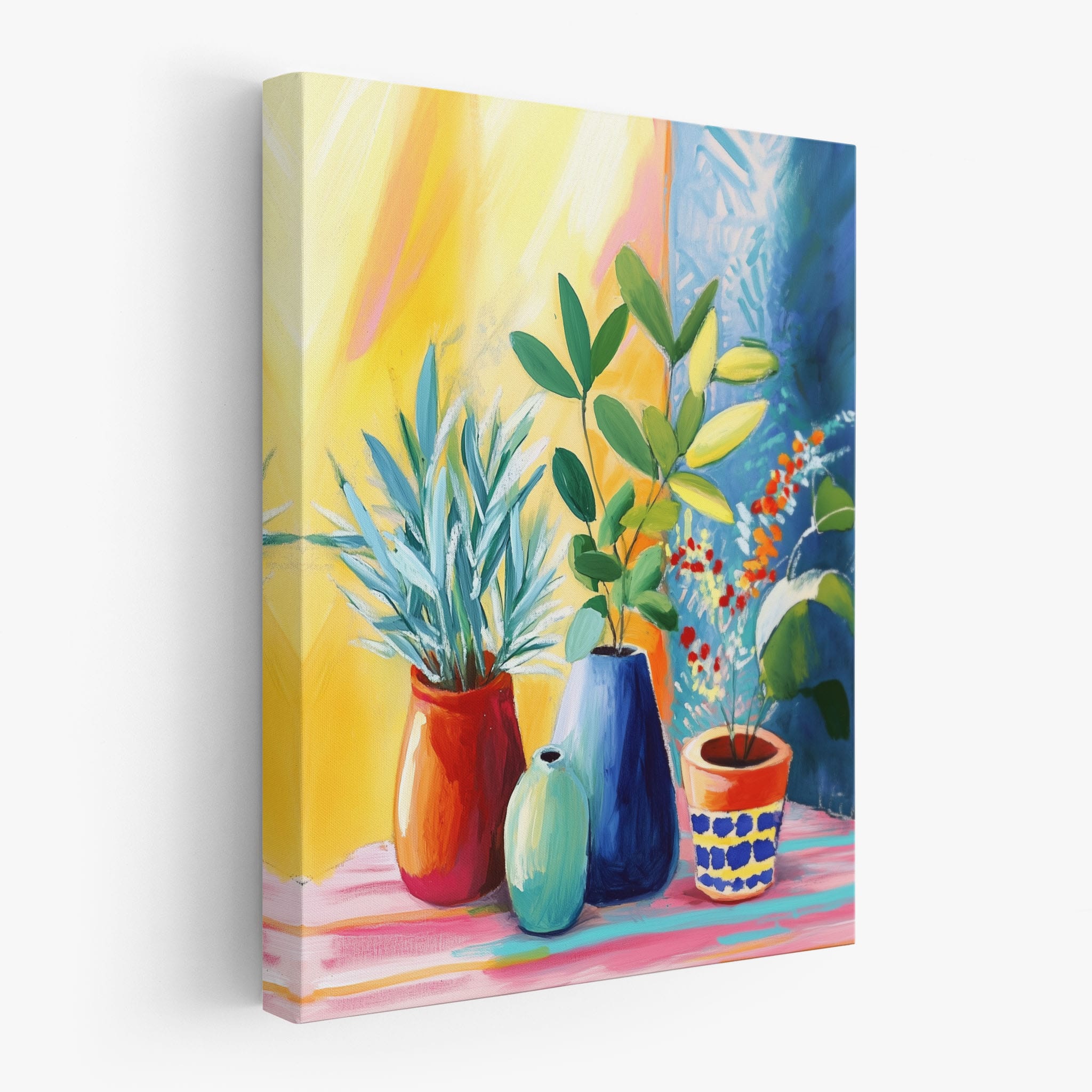 Vivid strokes and bright colors define this painting, presenting a charming collection of flora in vibrant vases. The artwork beautifully captures the essence of a whimsical still life with an impressionistic touch, making it an appealing piece for any room. The energetic backdrop vividly contrasts with the serene subject, drawing the viewer's eye across its playful composition. Ideal for a modern space or as a lively addition to an eclectic art collection, this painting offers a refreshing splash of color and simplicity. Bring this visual joy into your home and brighten your everyday surroundings.