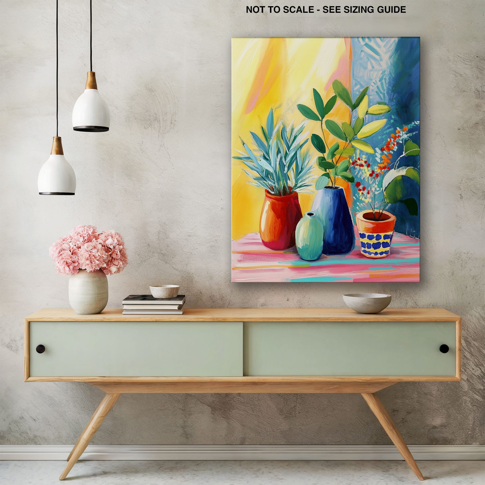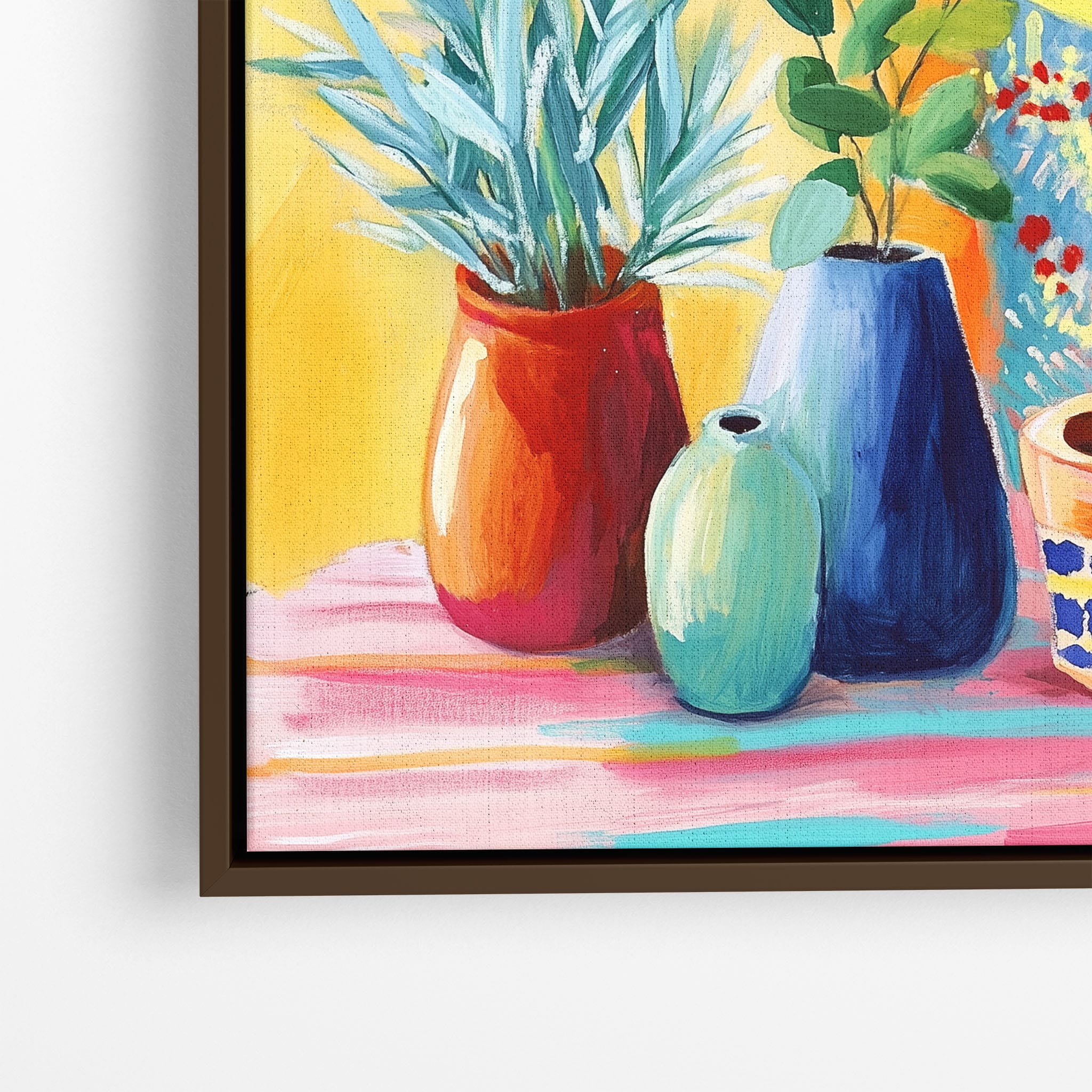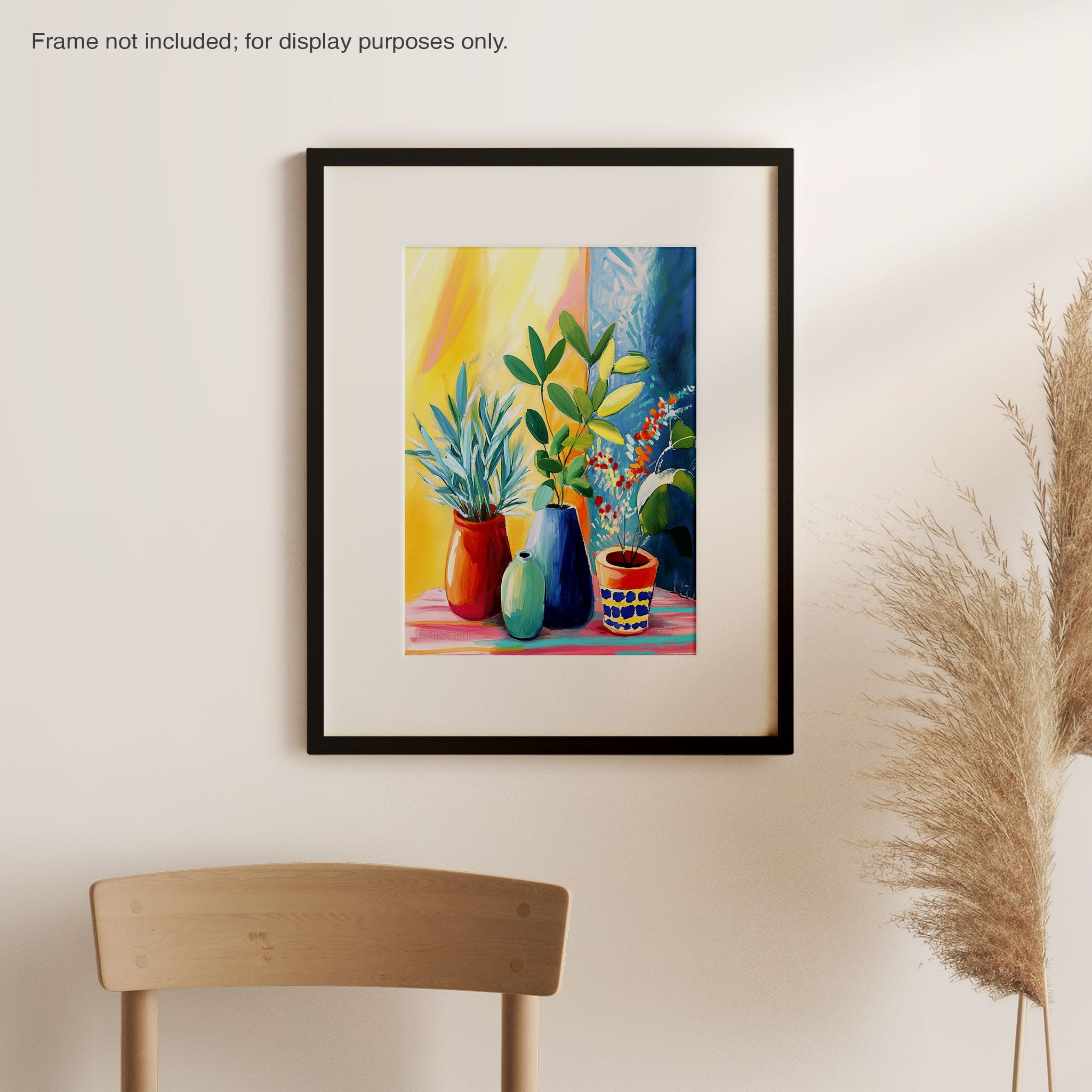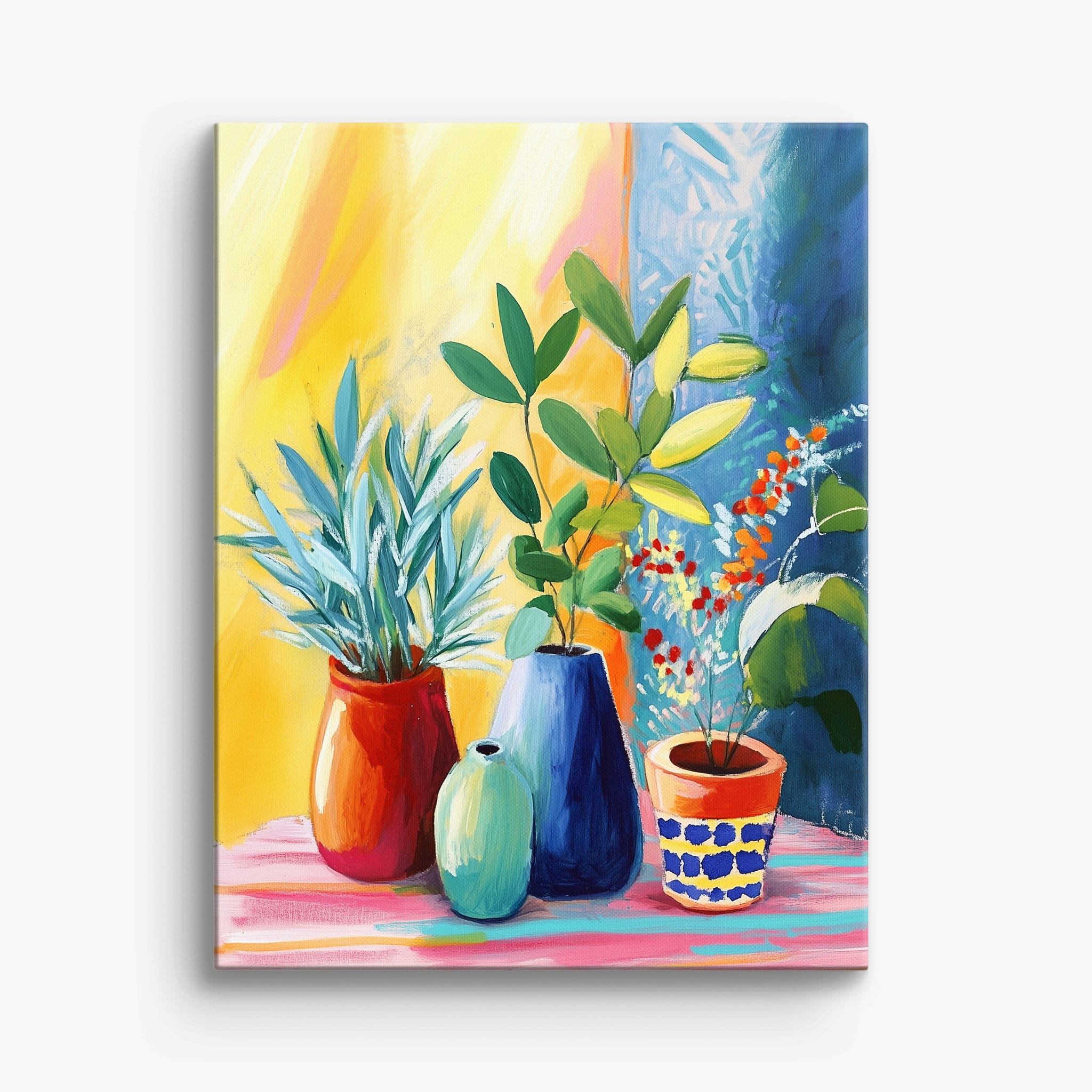 Vivid strokes and bright colors define this painting, presenting a charming collection of flora in vibrant vases. The artwork beautifully captures the essence of a whimsical still life with an impressionistic touch, making it an appealing piece for any room. The energetic backdrop vividly contrasts with the serene subject, drawing the viewer's eye across its playful composition. Ideal for a modern space or as a lively addition to an eclectic art collection, this painting offers a refreshing splash of color and simplicity. Bring this visual joy into your home and brighten your everyday surroundings.