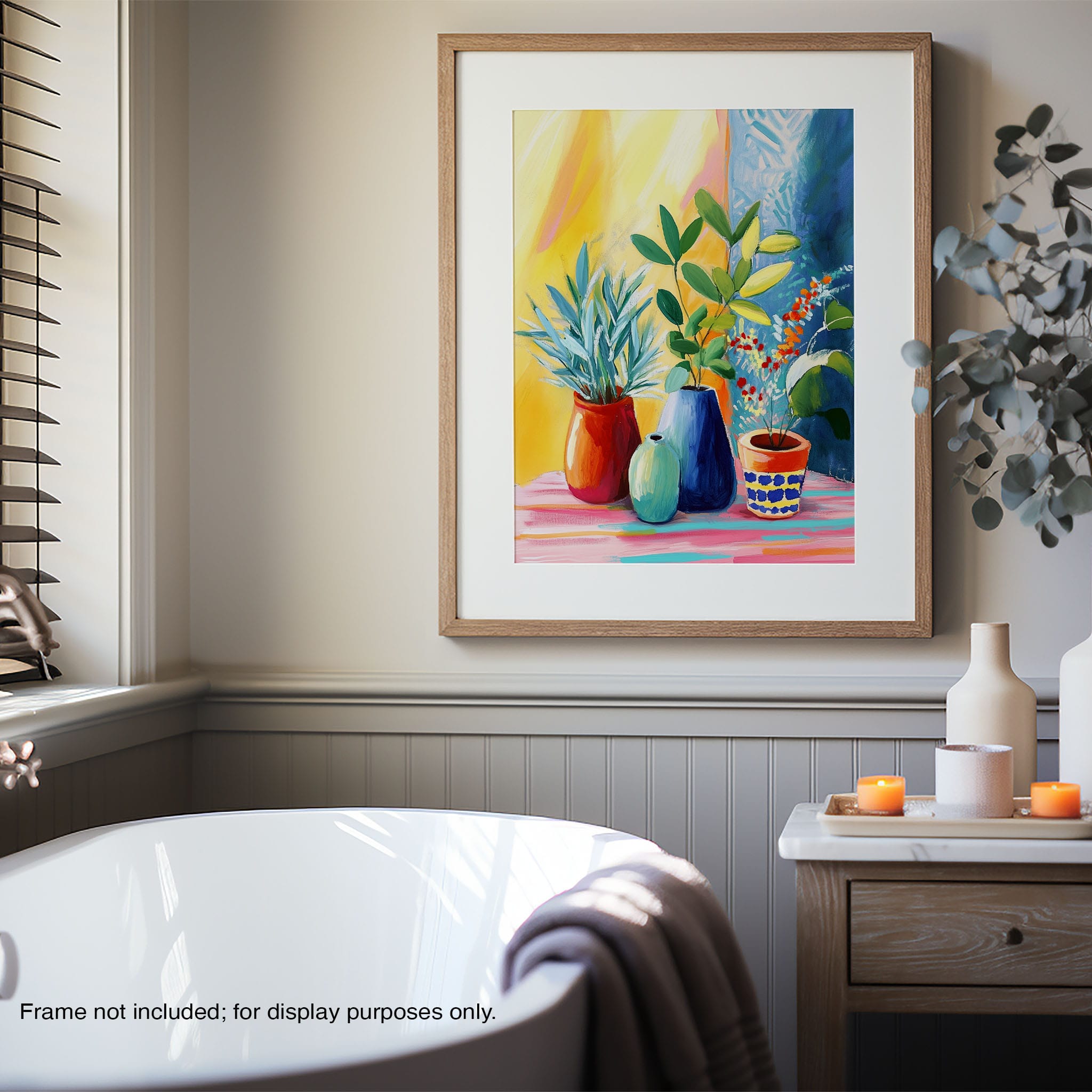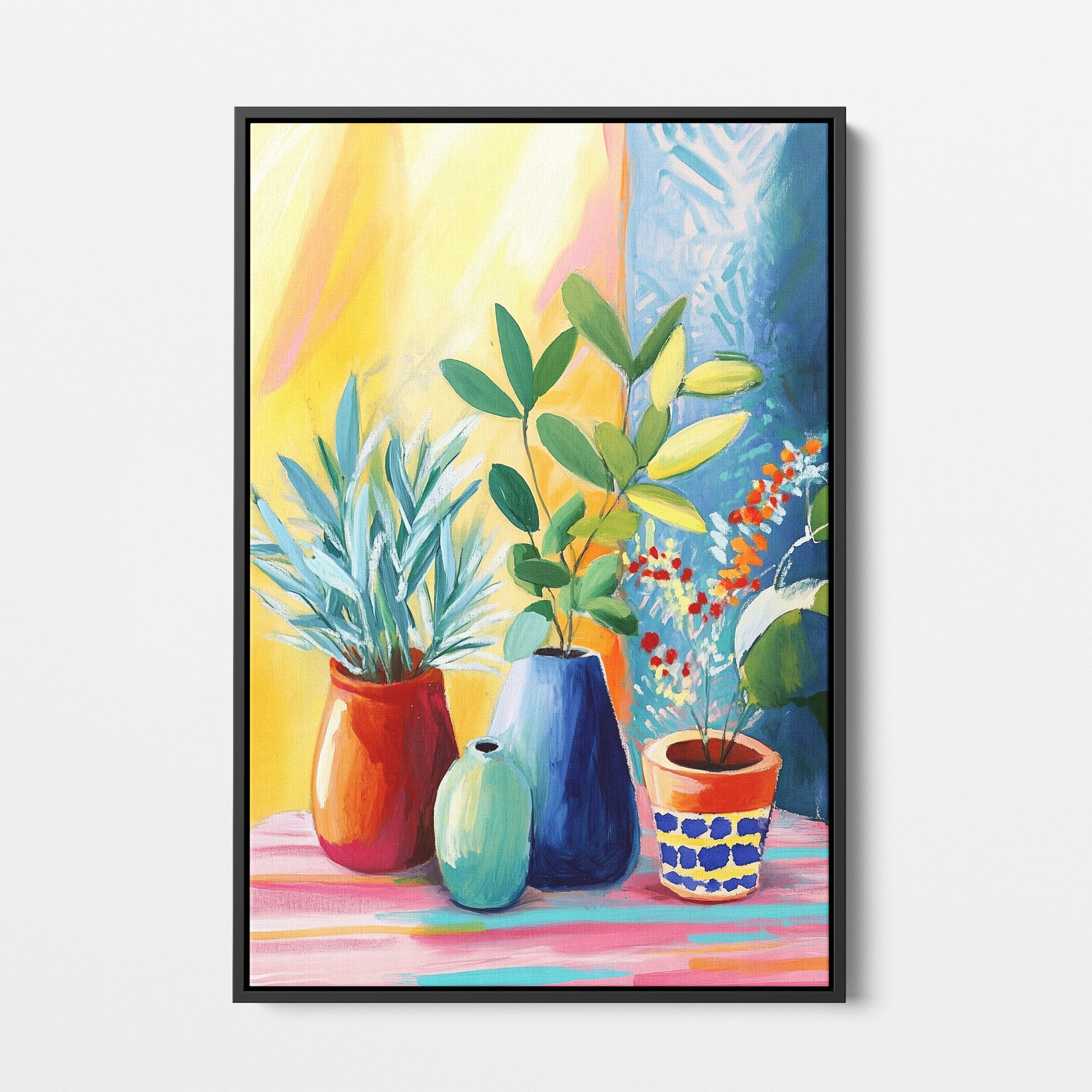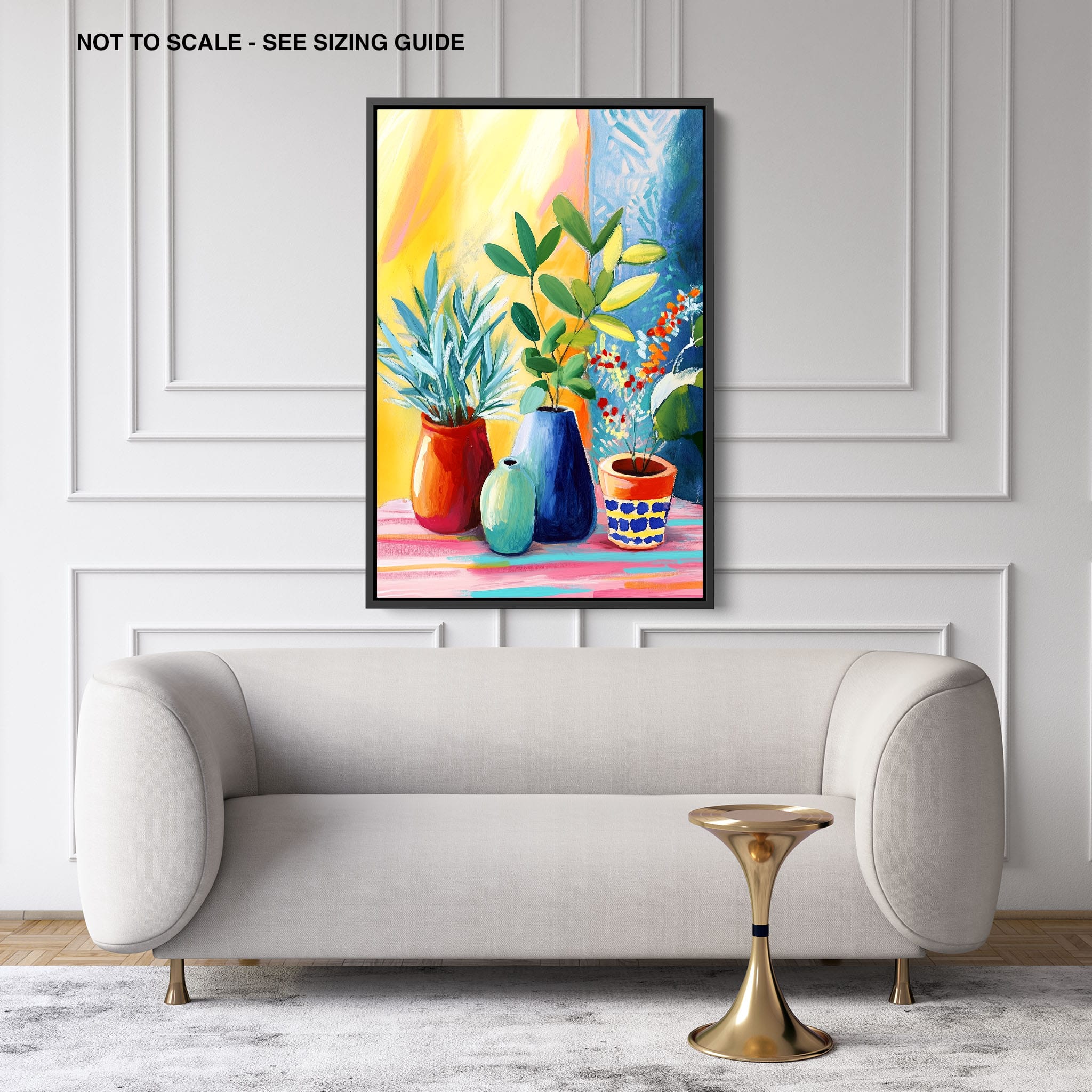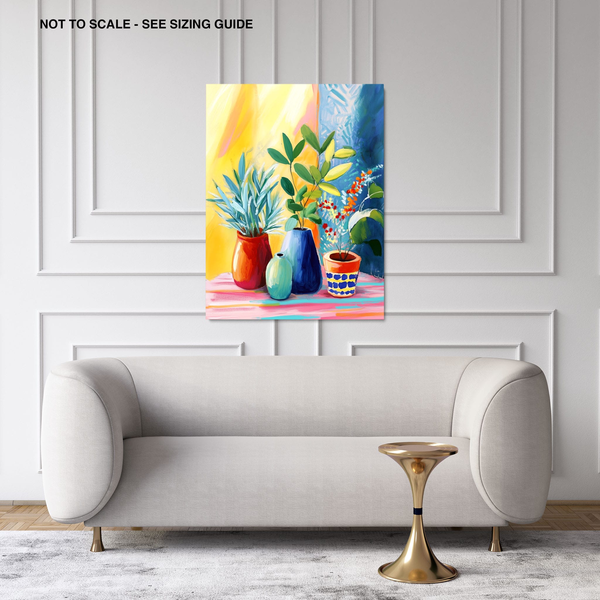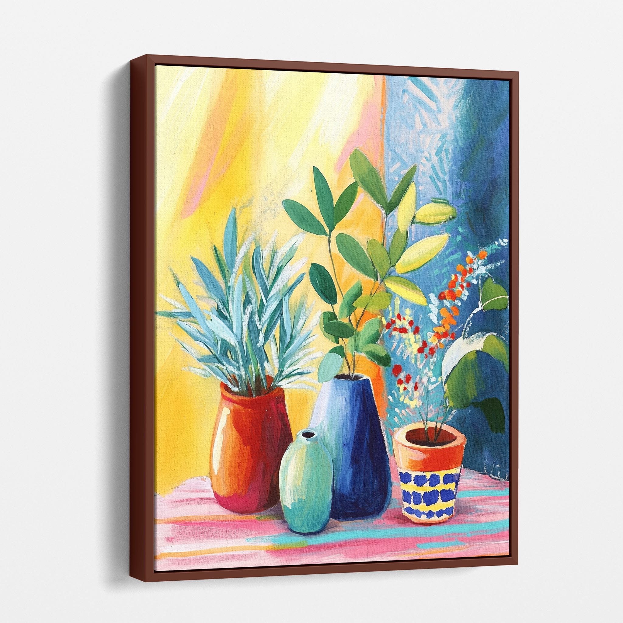 Vivid strokes and bright colors define this painting, presenting a charming collection of flora in vibrant vases. The artwork beautifully captures the essence of a whimsical still life with an impressionistic touch, making it an appealing piece for any room. The energetic backdrop vividly contrasts with the serene subject, drawing the viewer's eye across its playful composition. Ideal for a modern space or as a lively addition to an eclectic art collection, this painting offers a refreshing splash of color and simplicity. Bring this visual joy into your home and brighten your everyday surroundings.