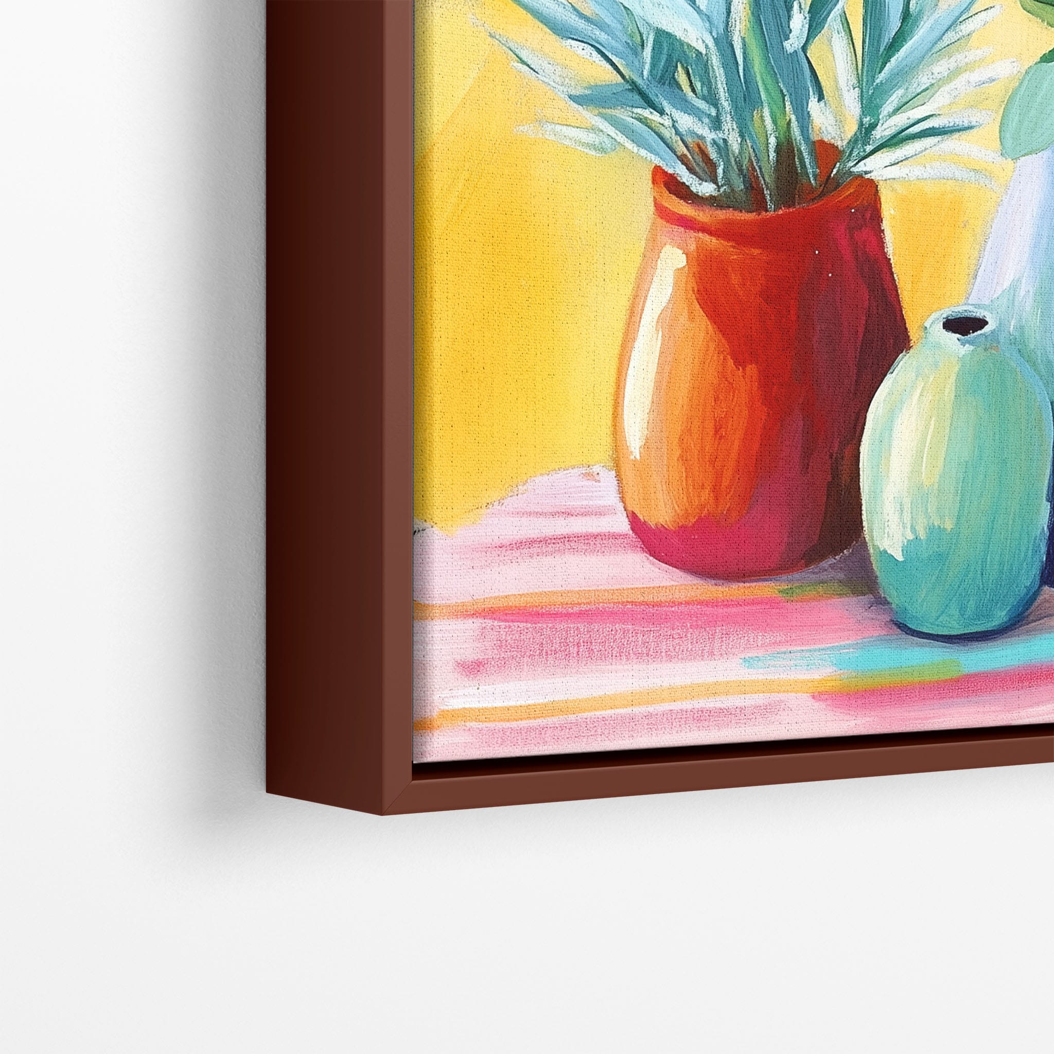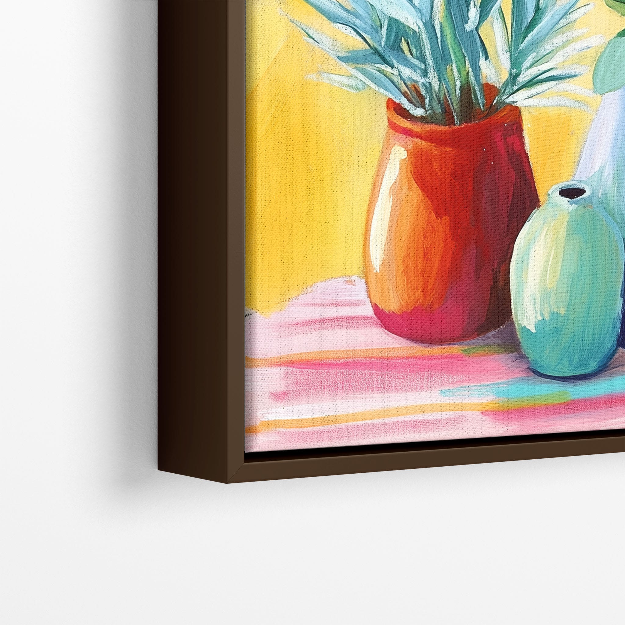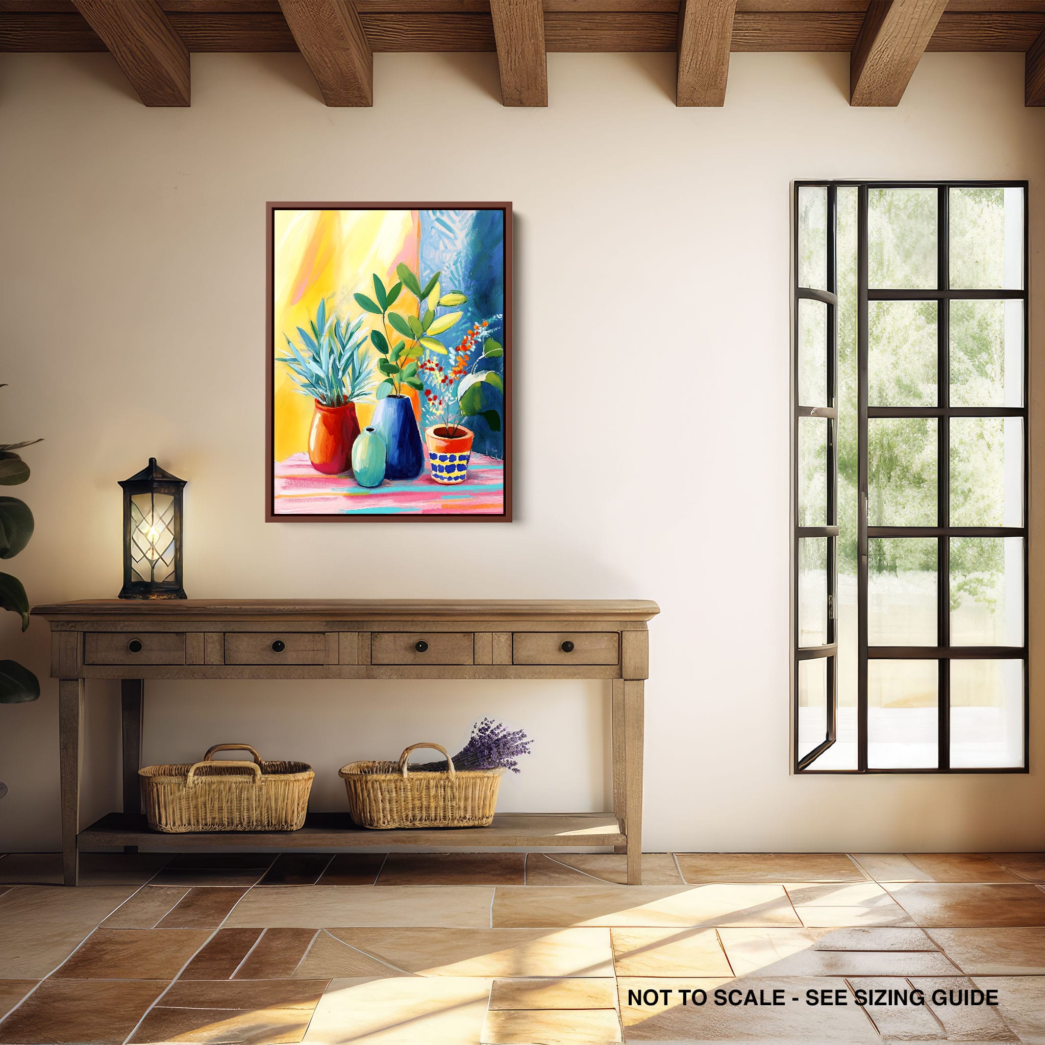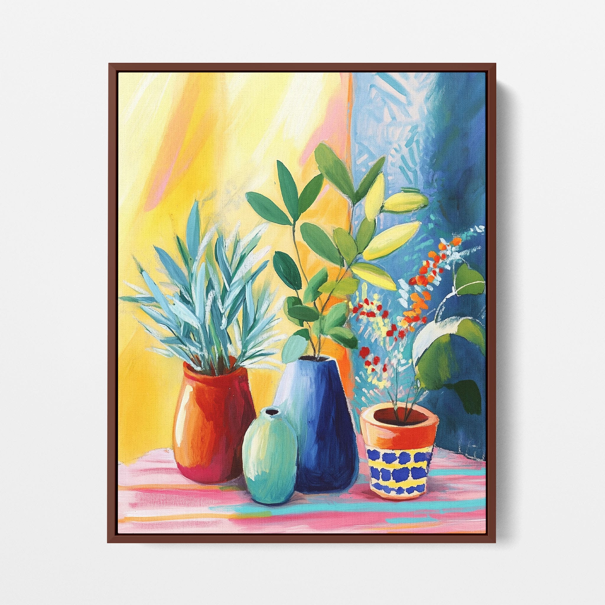 Vivid strokes and bright colors define this painting, presenting a charming collection of flora in vibrant vases. The artwork beautifully captures the essence of a whimsical still life with an impressionistic touch, making it an appealing piece for any room. The energetic backdrop vividly contrasts with the serene subject, drawing the viewer's eye across its playful composition. Ideal for a modern space or as a lively addition to an eclectic art collection, this painting offers a refreshing splash of color and simplicity. Bring this visual joy into your home and brighten your everyday surroundings.