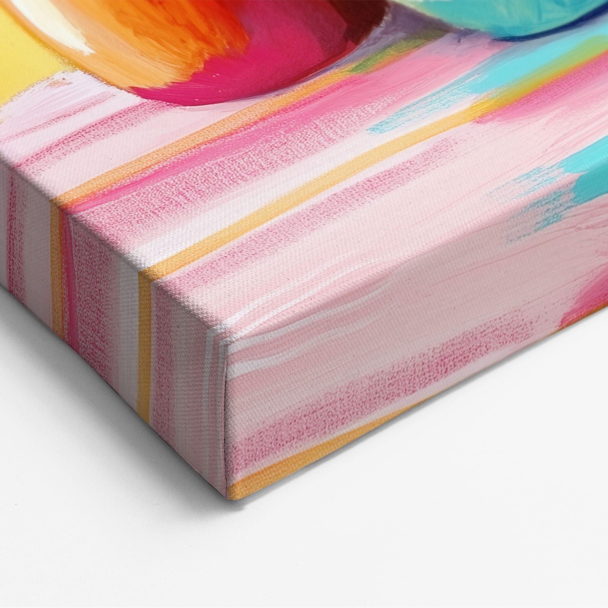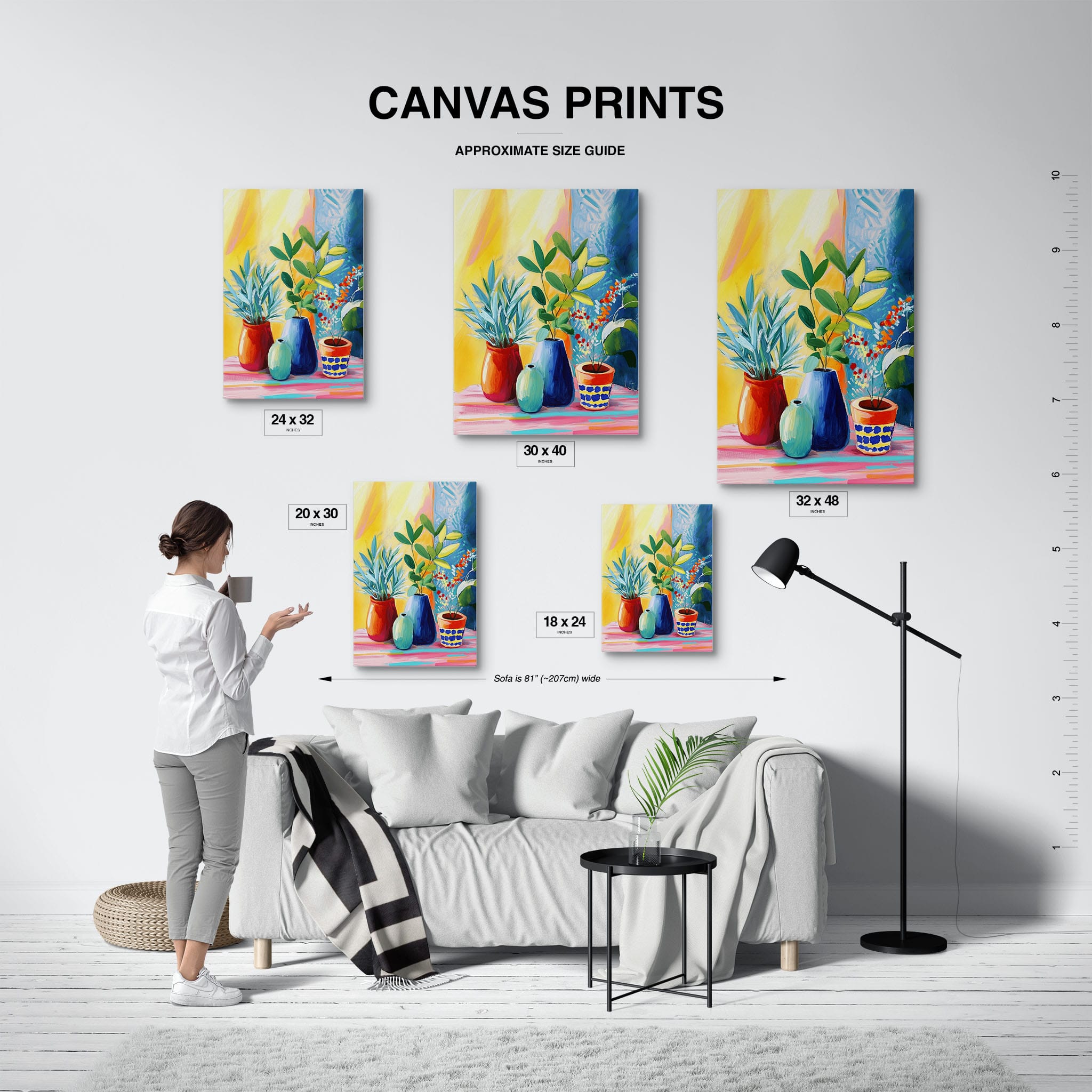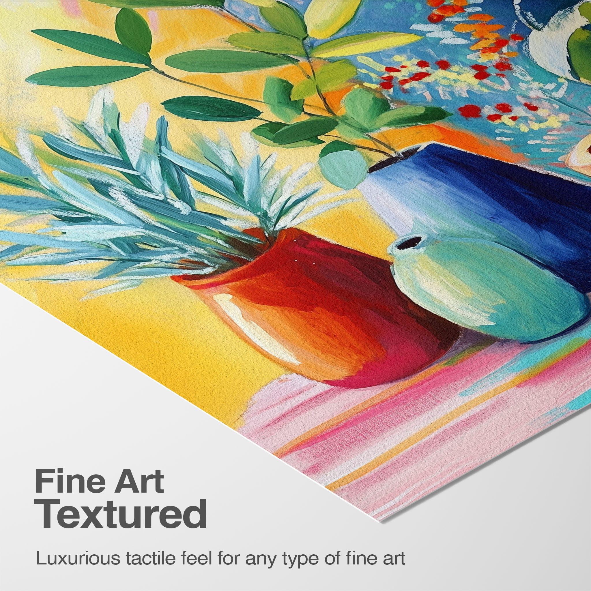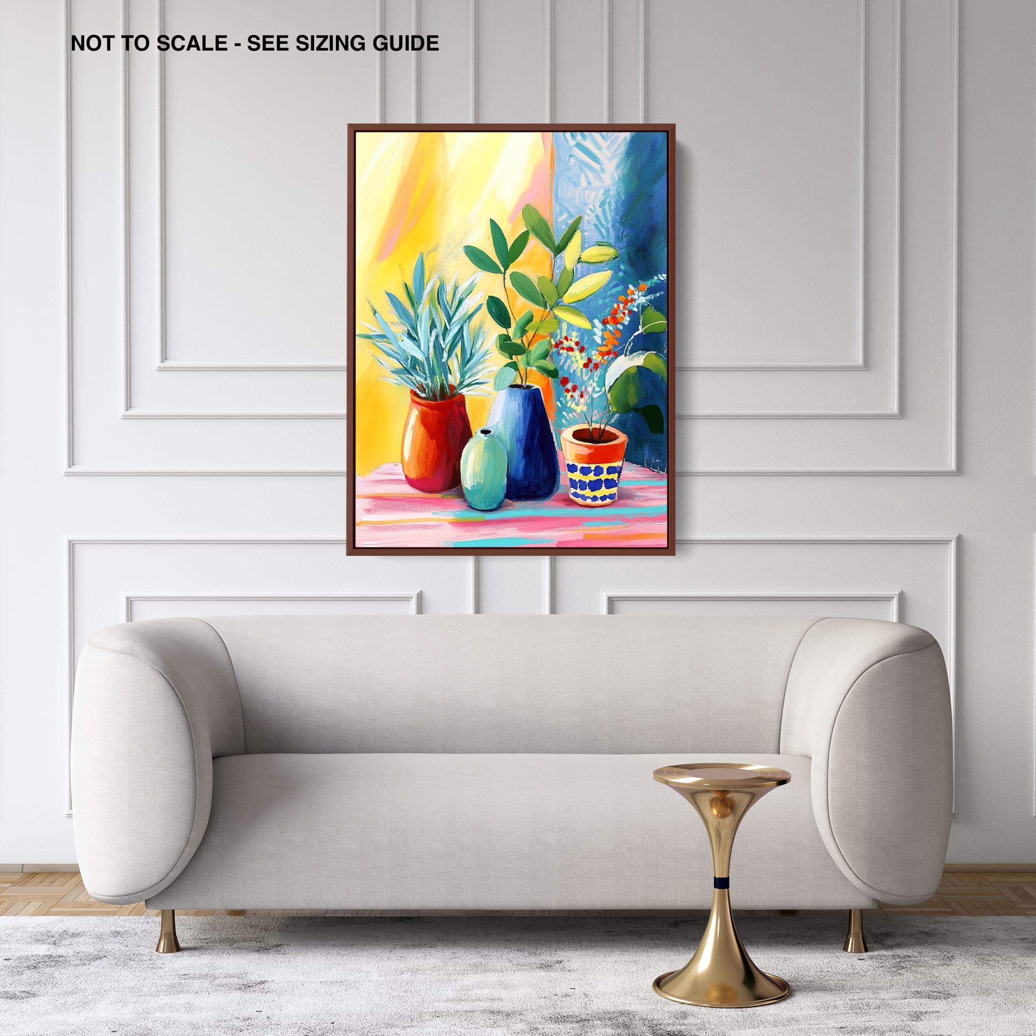 Vivid strokes and bright colors define this painting, presenting a charming collection of flora in vibrant vases. The artwork beautifully captures the essence of a whimsical still life with an impressionistic touch, making it an appealing piece for any room. The energetic backdrop vividly contrasts with the serene subject, drawing the viewer's eye across its playful composition. Ideal for a modern space or as a lively addition to an eclectic art collection, this painting offers a refreshing splash of color and simplicity. Bring this visual joy into your home and brighten your everyday surroundings.