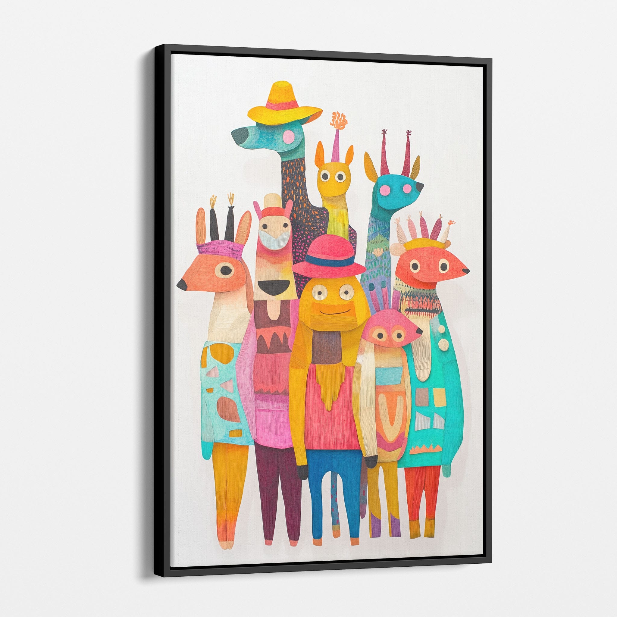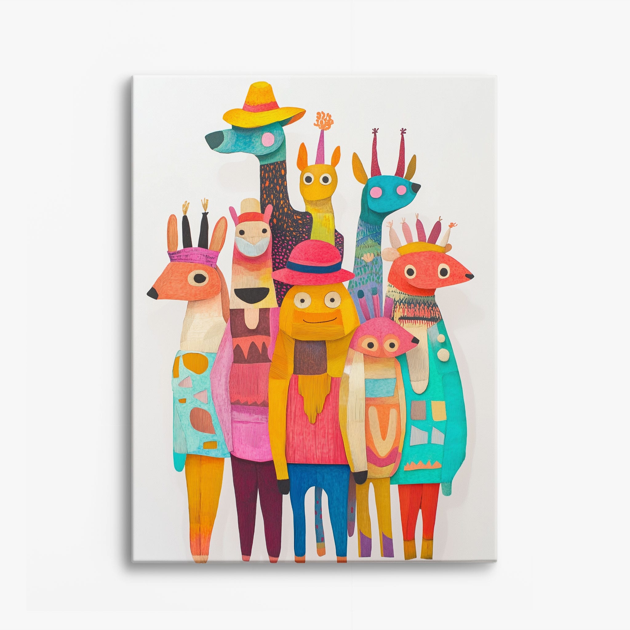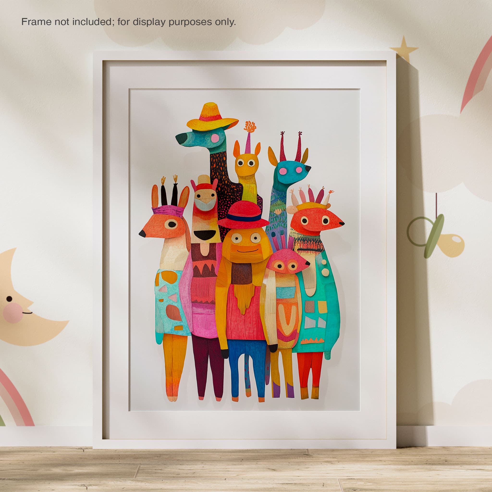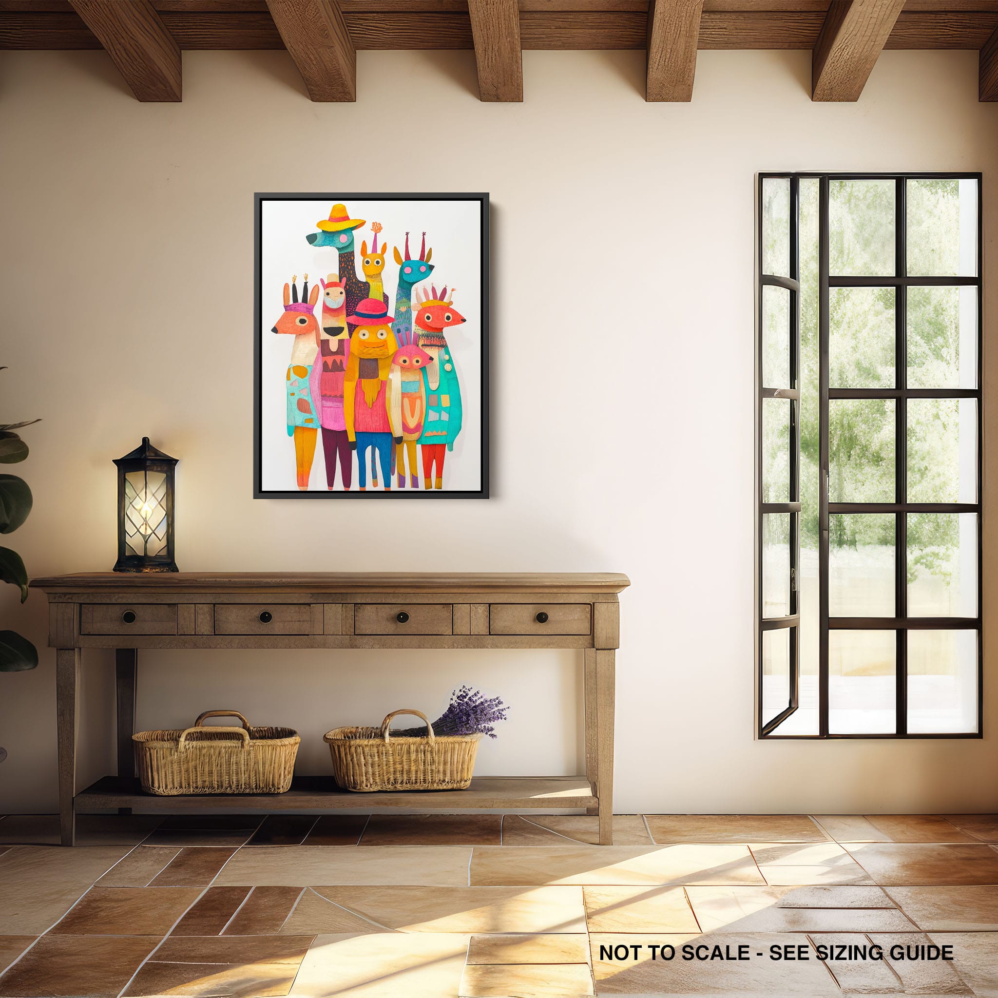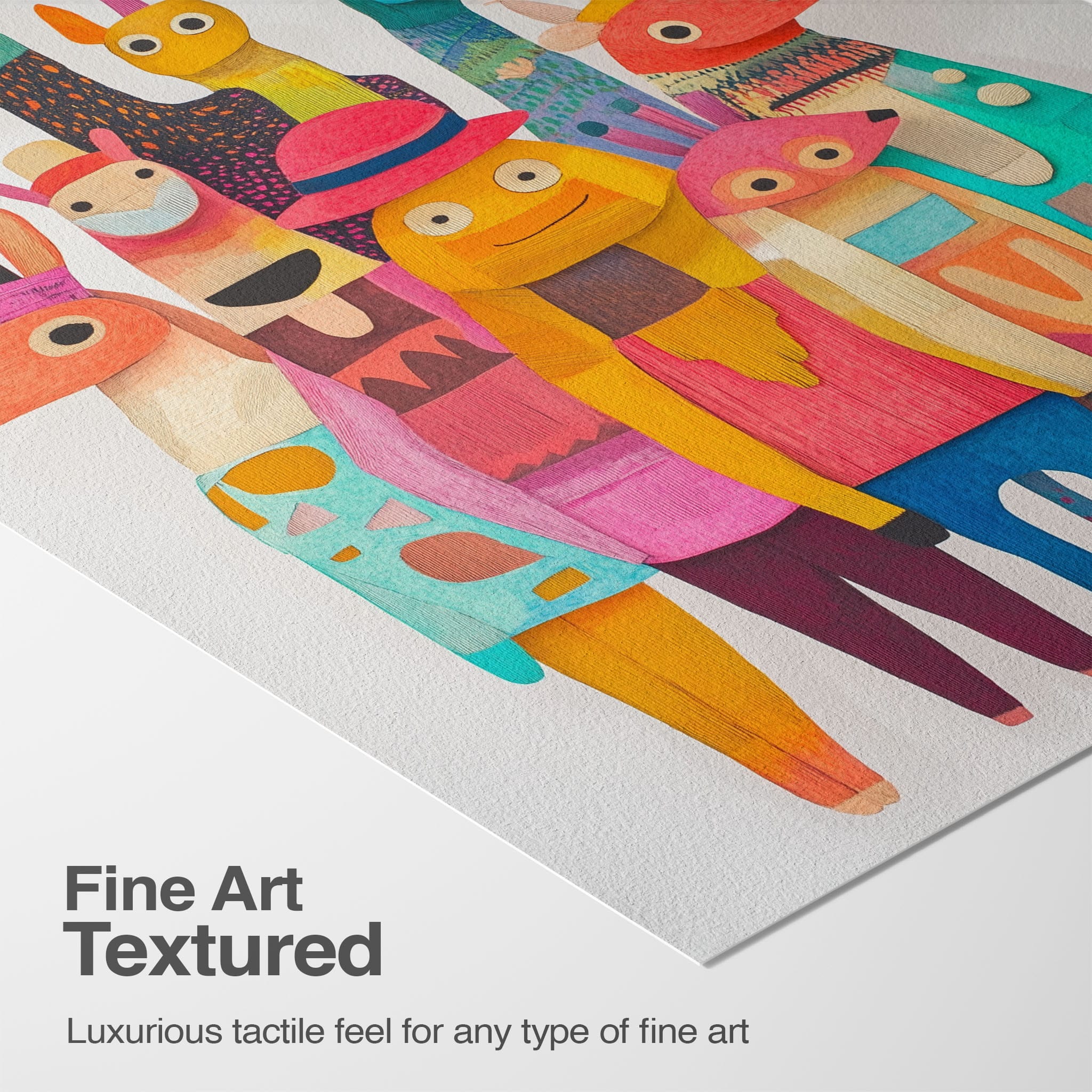 Dive into the vivacious world of Colorful Parade, a captivating digital illustration that brings to life a whimsical gathering of vibrant creatures. Each character, adorned with an array of bright hues and delightful textures, stands out with its unique charm. The striking use of color and folk art influences give this piece a lively and inviting atmosphere, perfect for adding a splash of joy to any space. Ideal for art enthusiasts seeking contemporary artwork with a playful twist, it's a reminder of the simple joys and exuberance found in artistic expression. This contemporary folk masterpiece is a must-have for those looking to infuse their walls with energy and imagination.