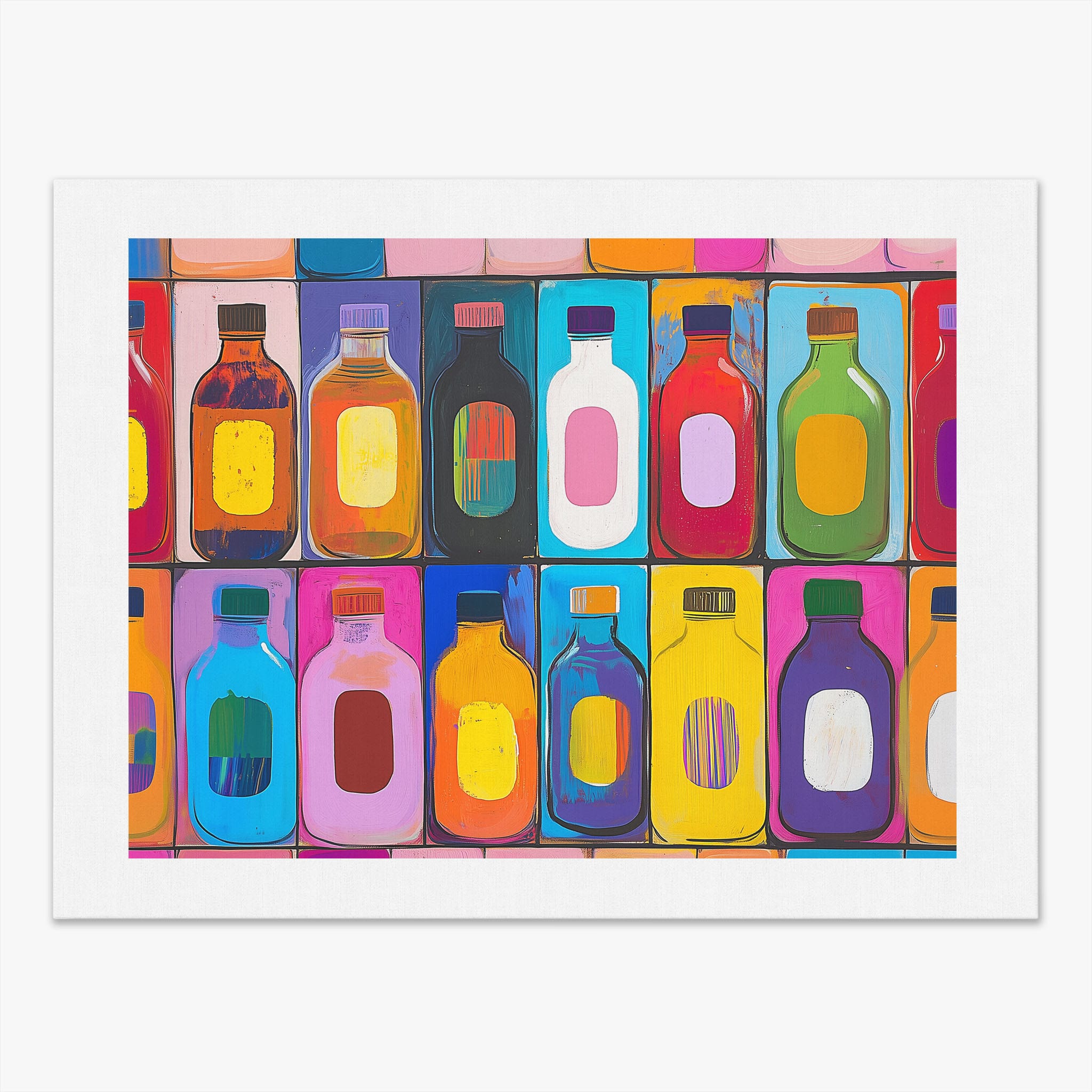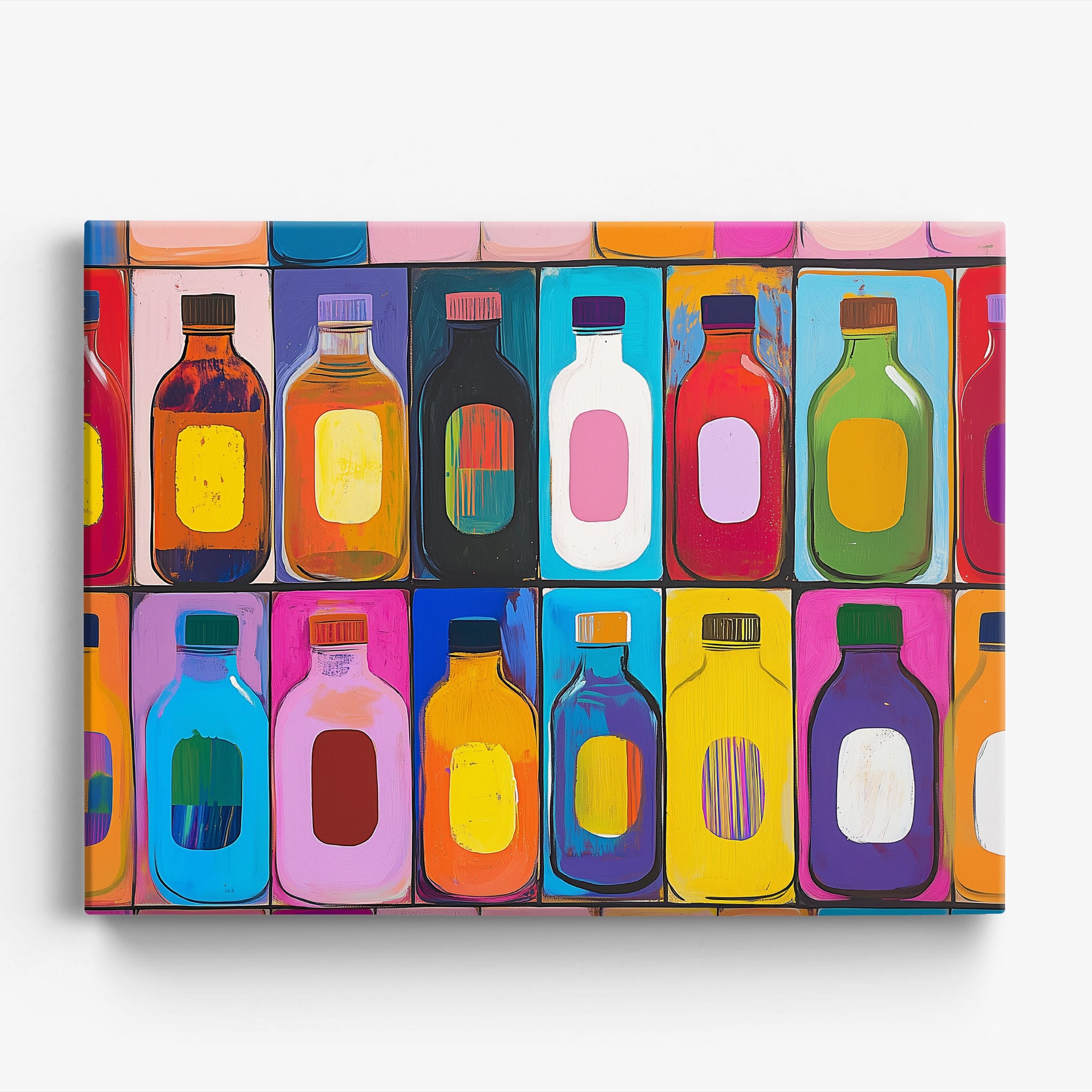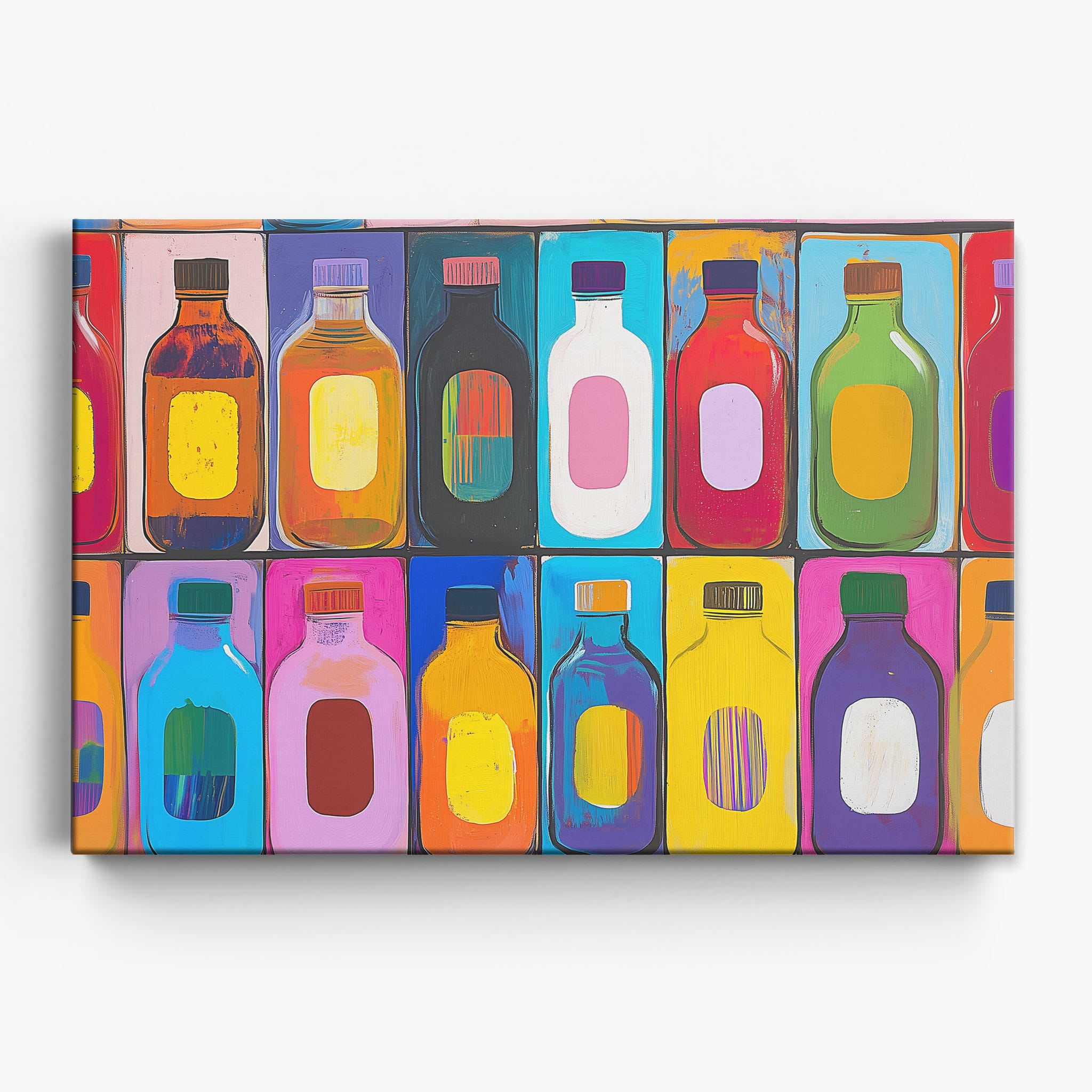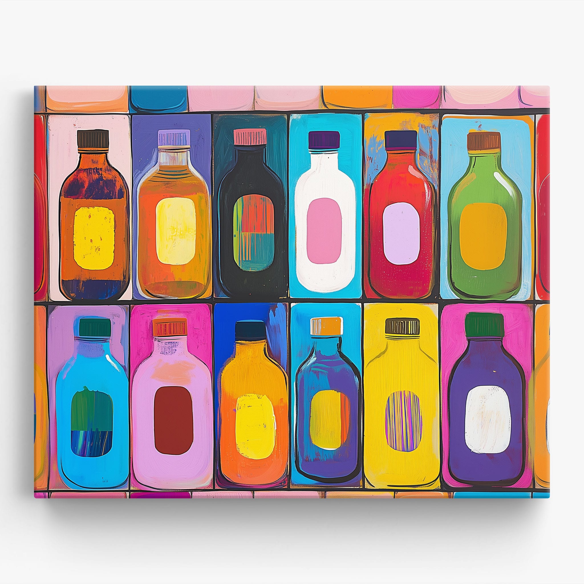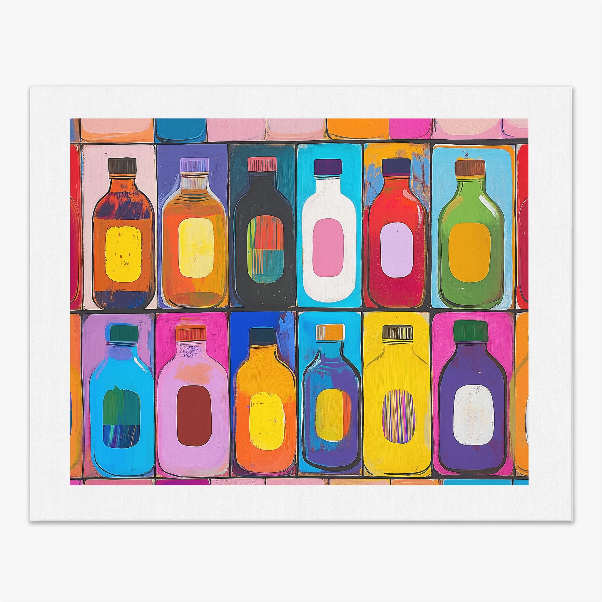 A vibrant selection of colorful painted bottles aligns perfectly in a geometric grid, creating a captivating visual pattern that sparks joy and inspires creativity. This painting leverages a modern yet pop-art style, employing bold, saturated colors and clean lines to draw the viewer's attention. Ideal for modern art lovers and those who appreciate colorful accents in their decor, this artwork adds a playful yet sophisticated touch to any space. Add this piece to brighten up your home or office with a splash of color and a dash of artistic flair.