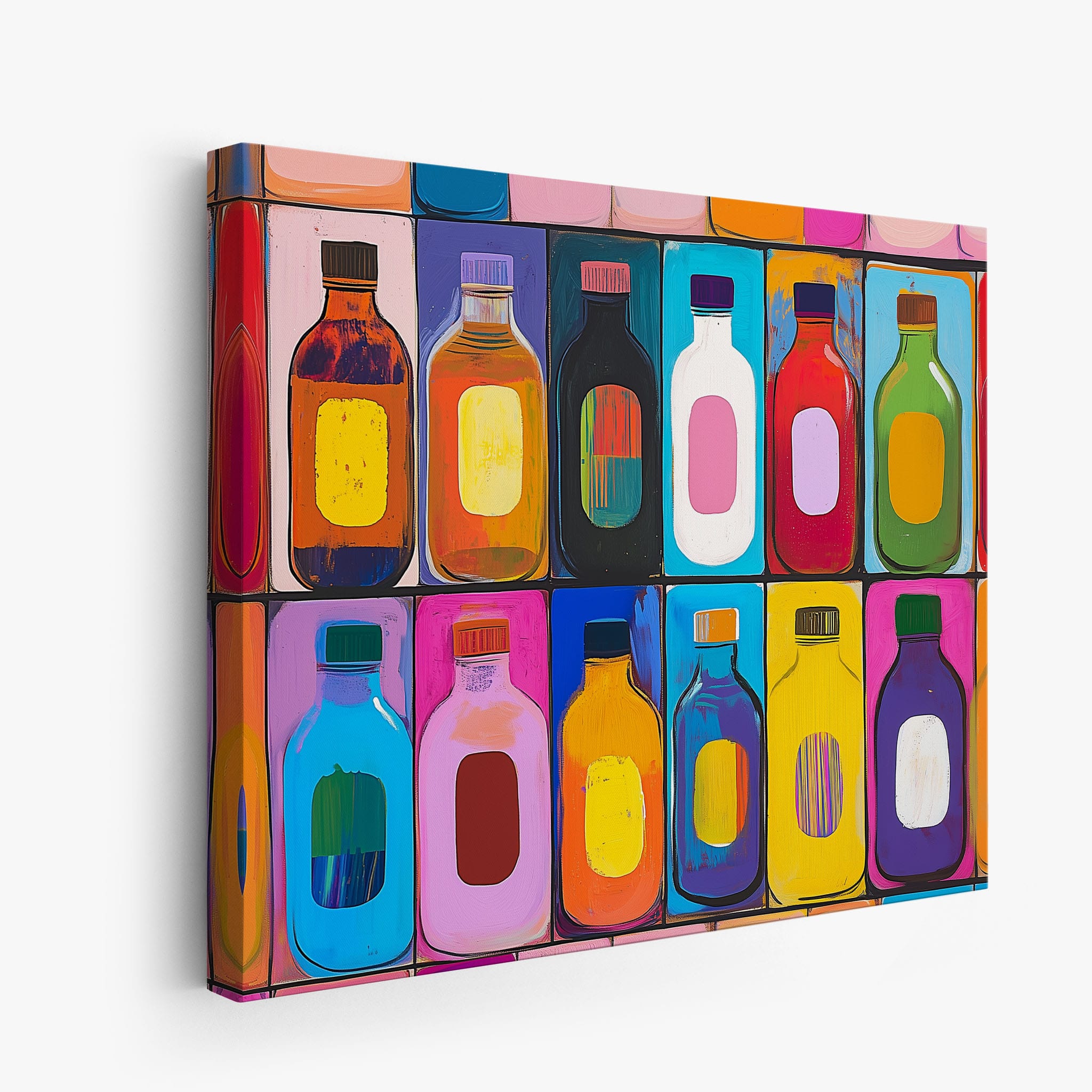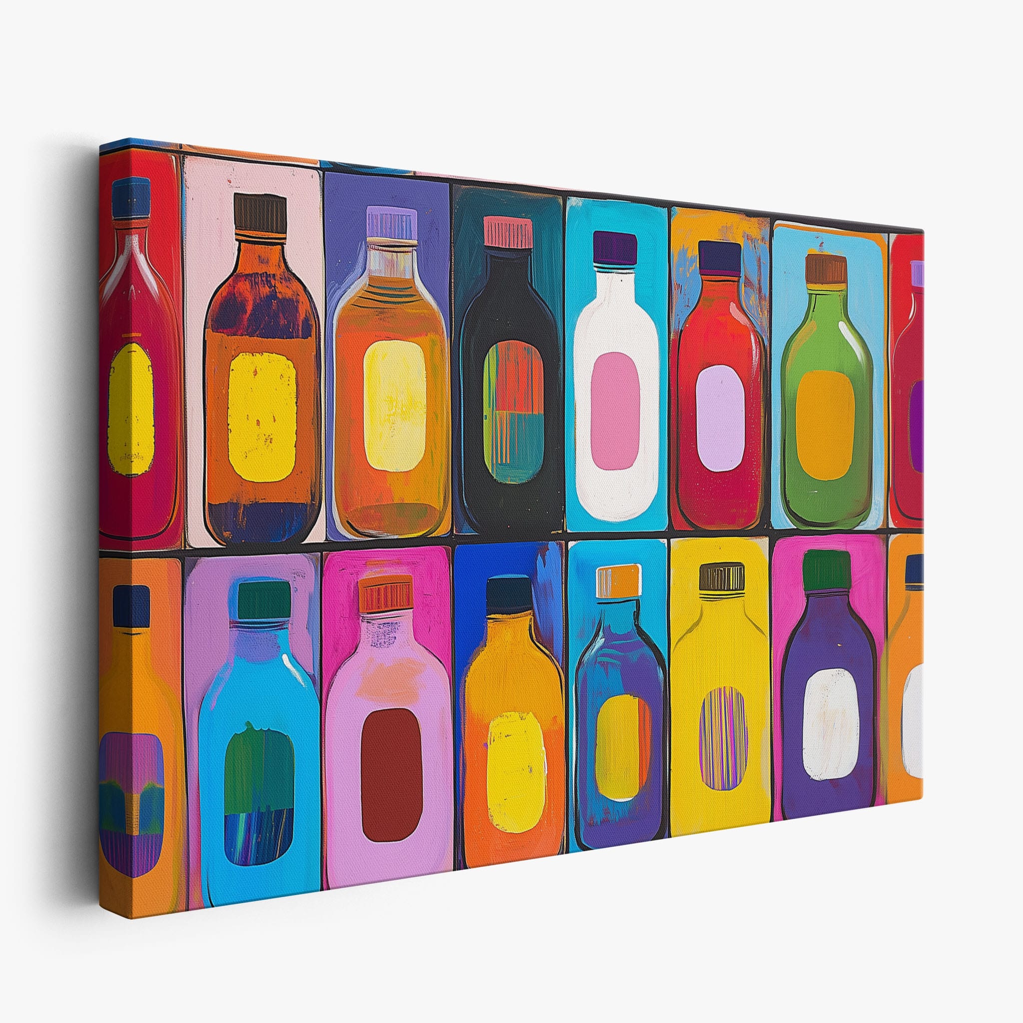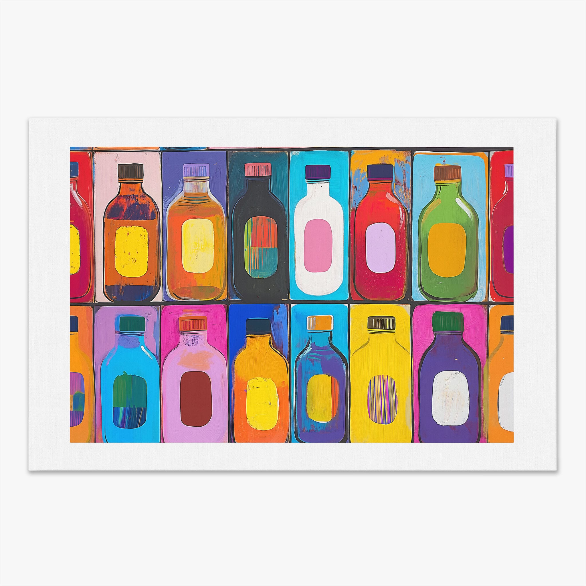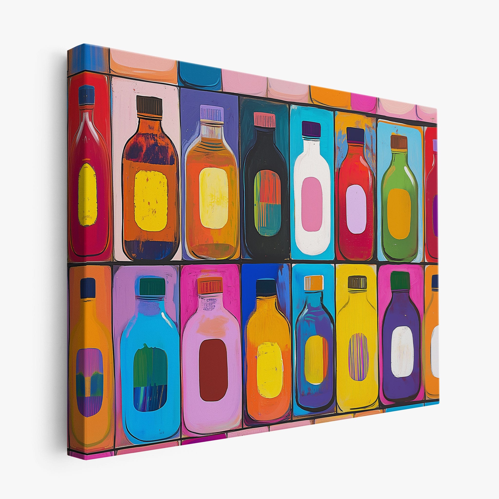 A vibrant selection of colorful painted bottles aligns perfectly in a geometric grid, creating a captivating visual pattern that sparks joy and inspires creativity. This painting leverages a modern yet pop-art style, employing bold, saturated colors and clean lines to draw the viewer's attention. Ideal for modern art lovers and those who appreciate colorful accents in their decor, this artwork adds a playful yet sophisticated touch to any space. Add this piece to brighten up your home or office with a splash of color and a dash of artistic flair.