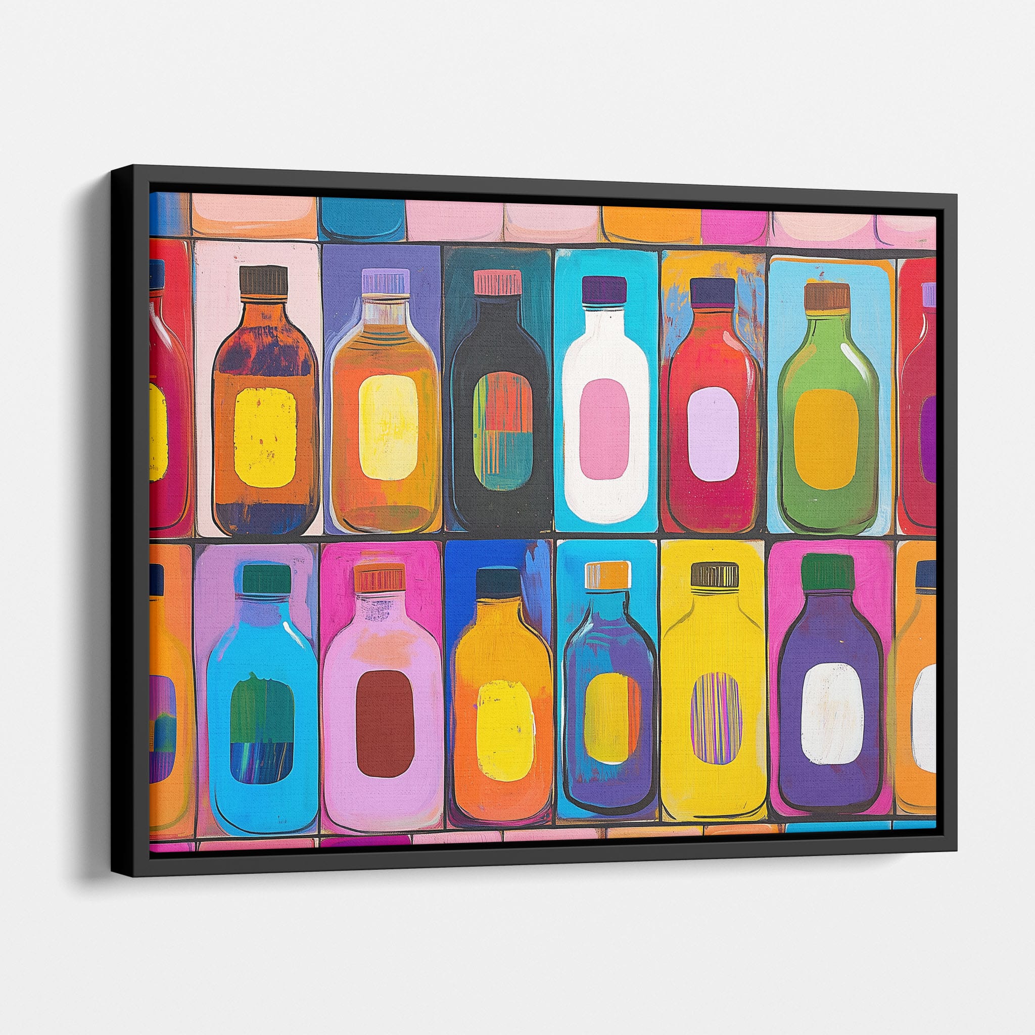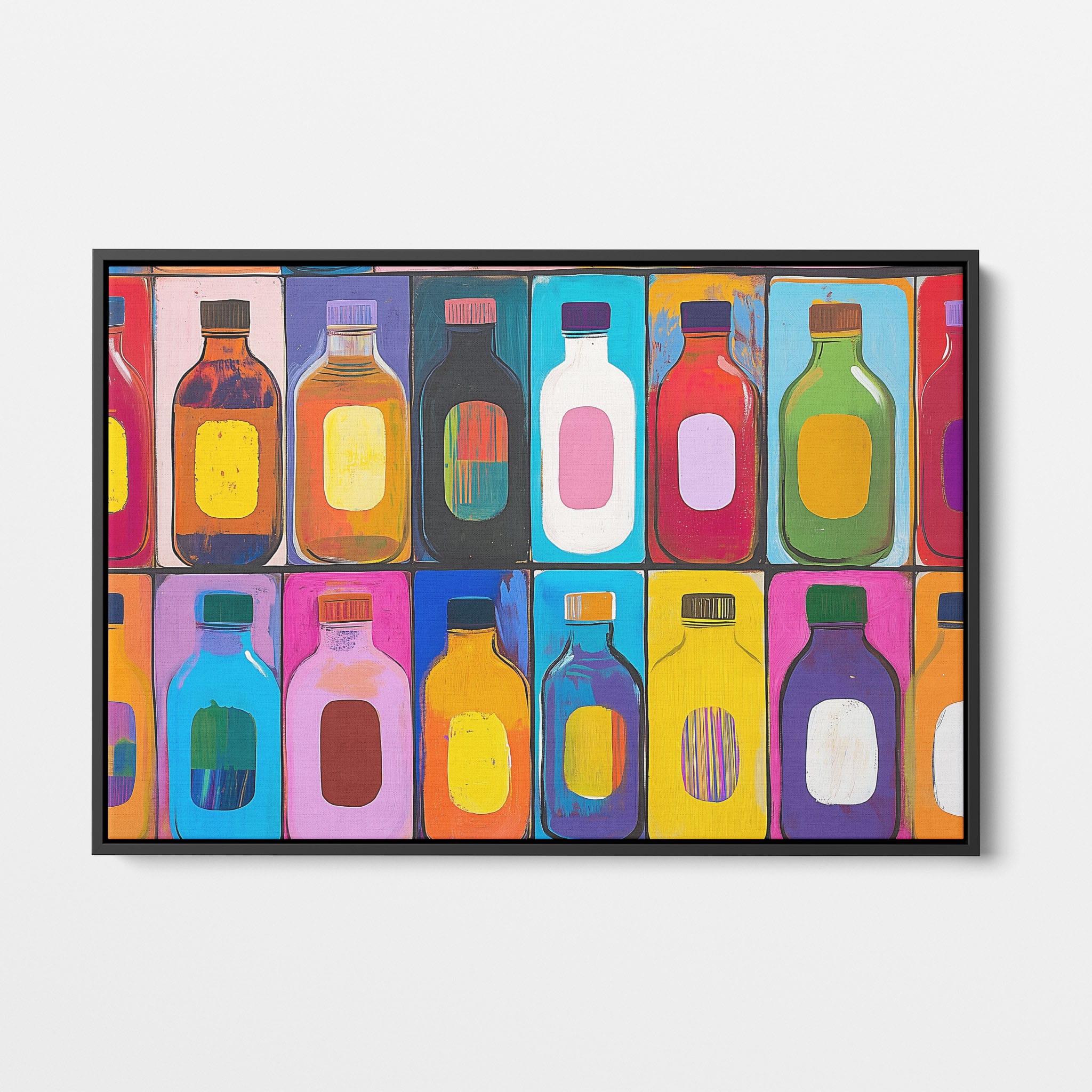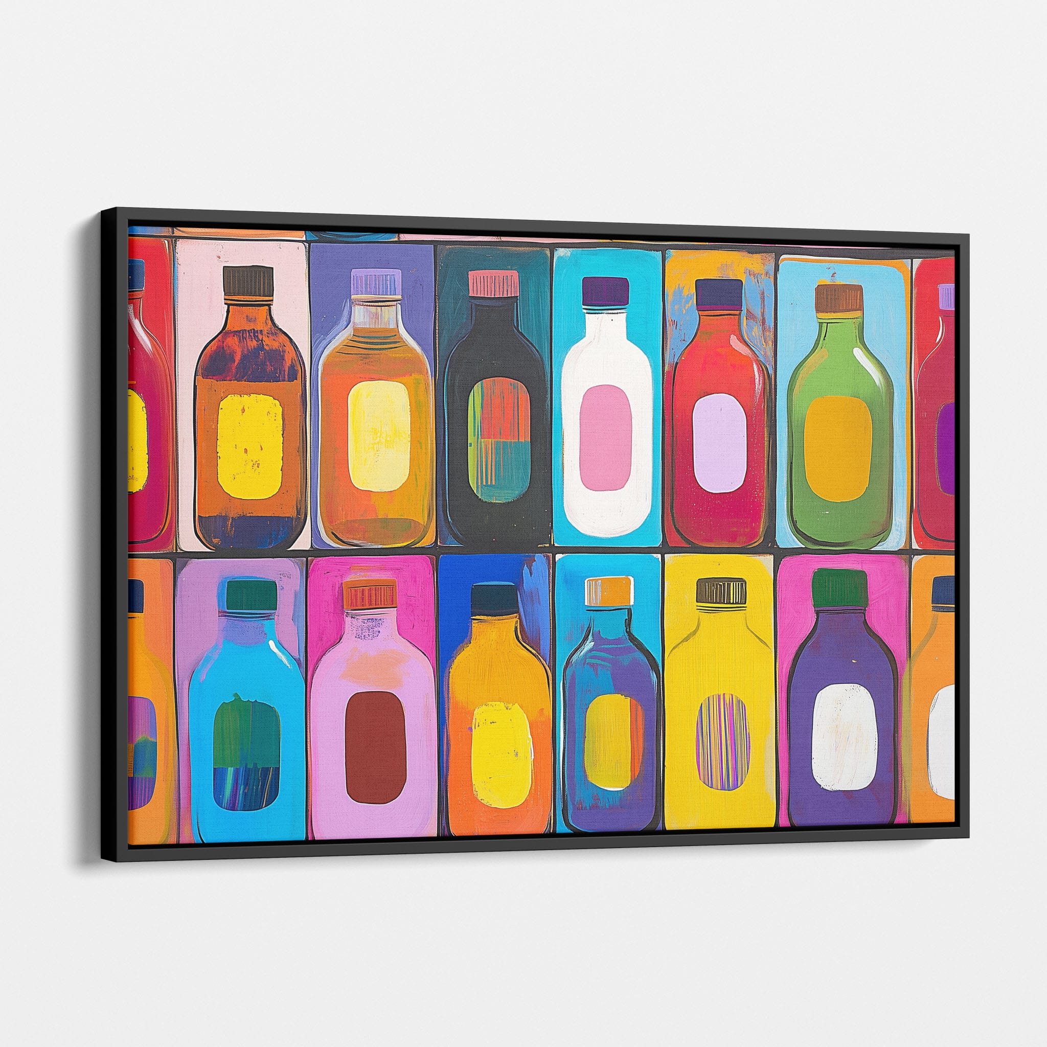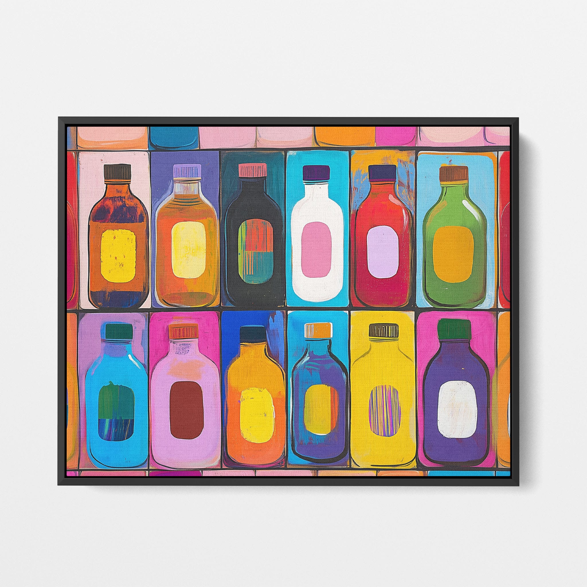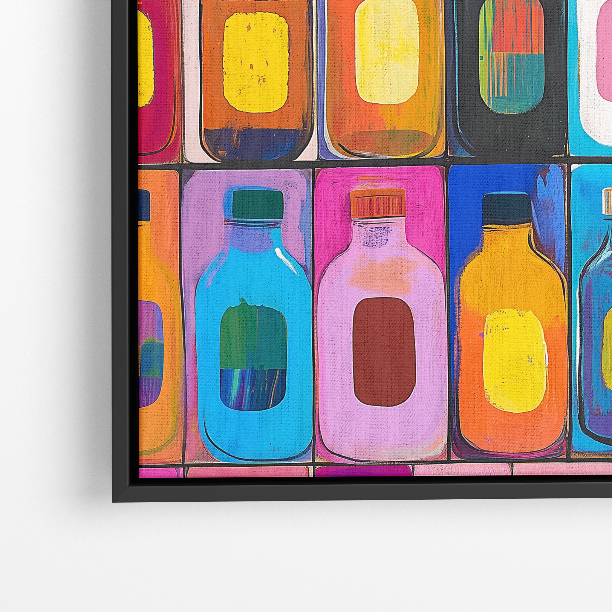 A vibrant selection of colorful painted bottles aligns perfectly in a geometric grid, creating a captivating visual pattern that sparks joy and inspires creativity. This painting leverages a modern yet pop-art style, employing bold, saturated colors and clean lines to draw the viewer's attention. Ideal for modern art lovers and those who appreciate colorful accents in their decor, this artwork adds a playful yet sophisticated touch to any space. Add this piece to brighten up your home or office with a splash of color and a dash of artistic flair.