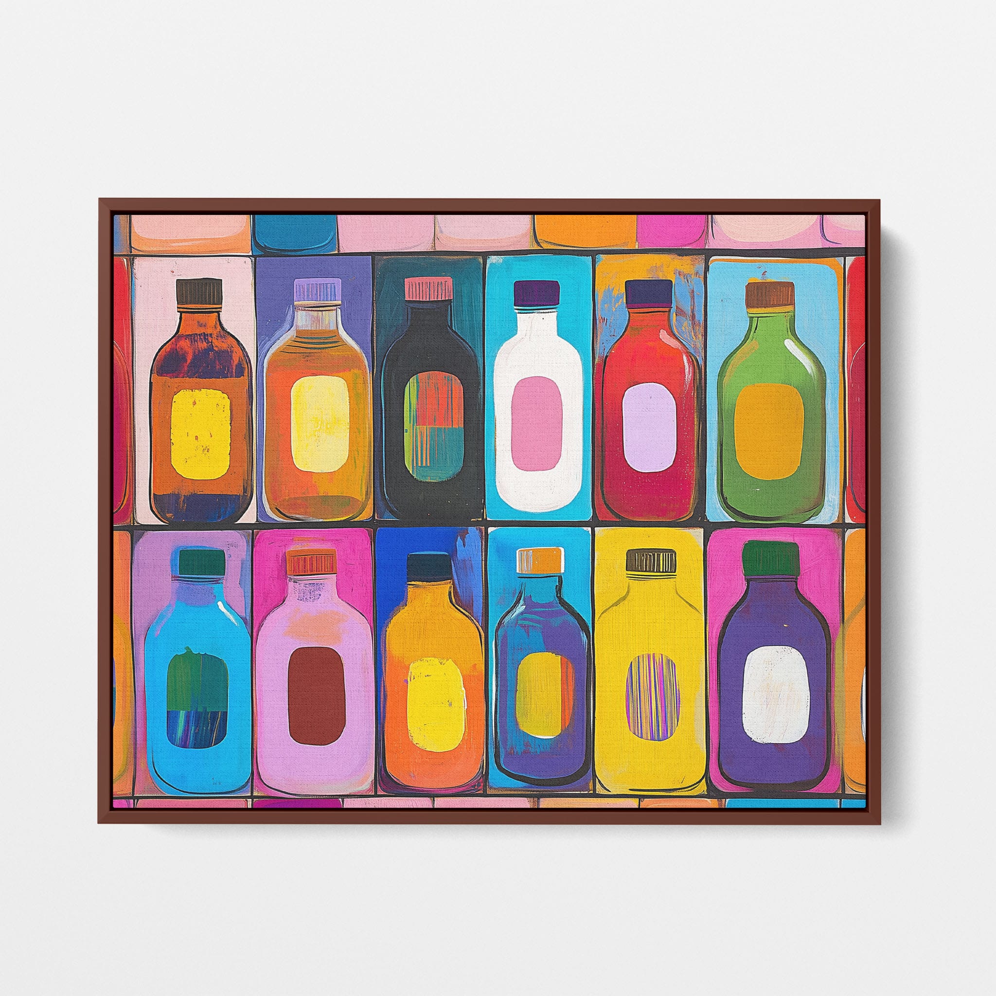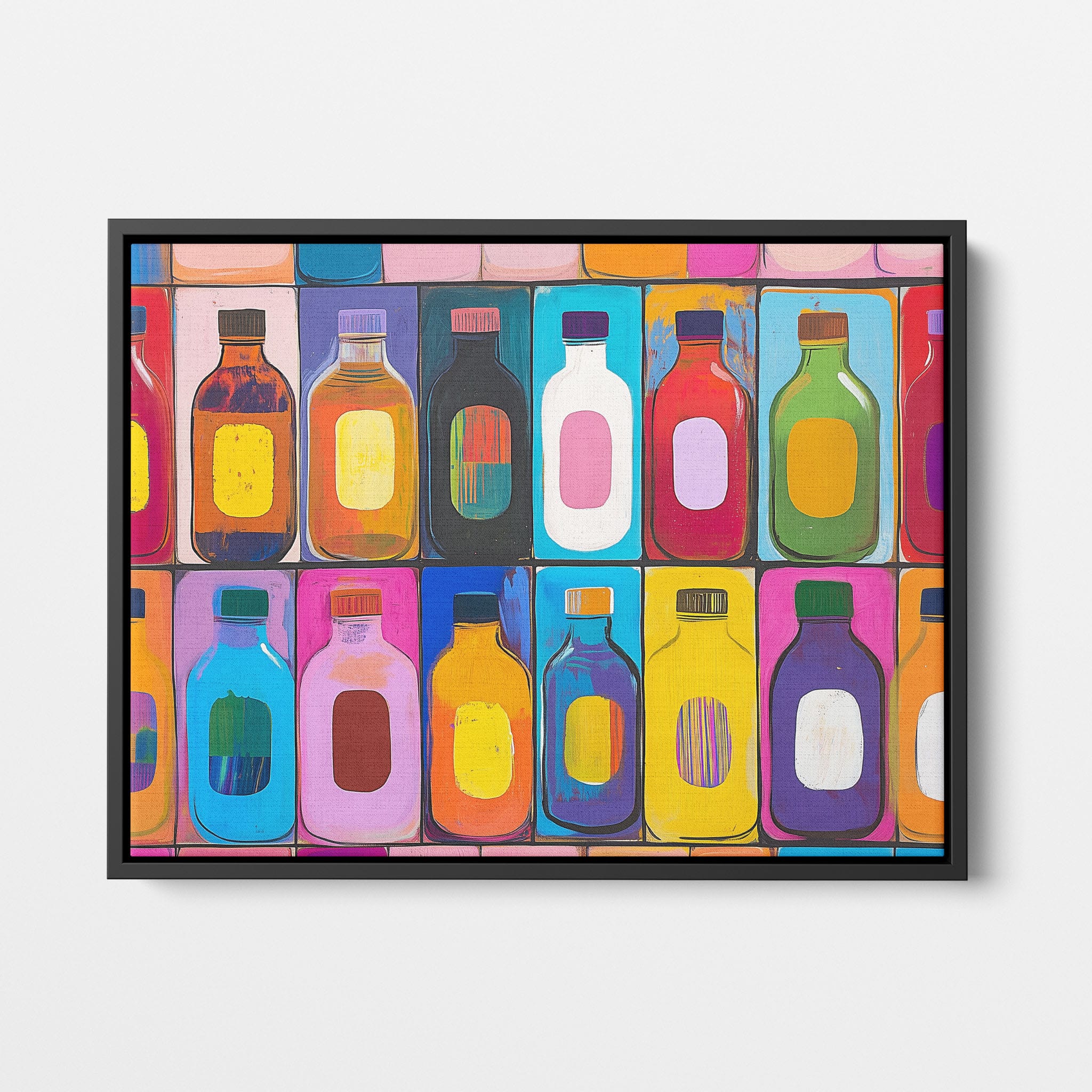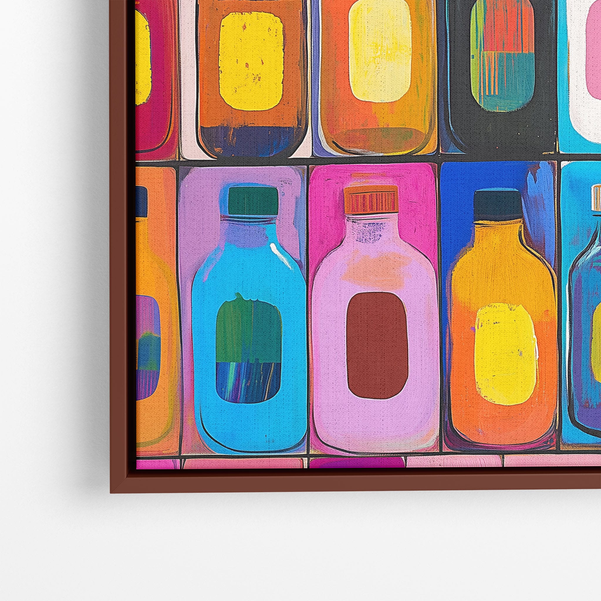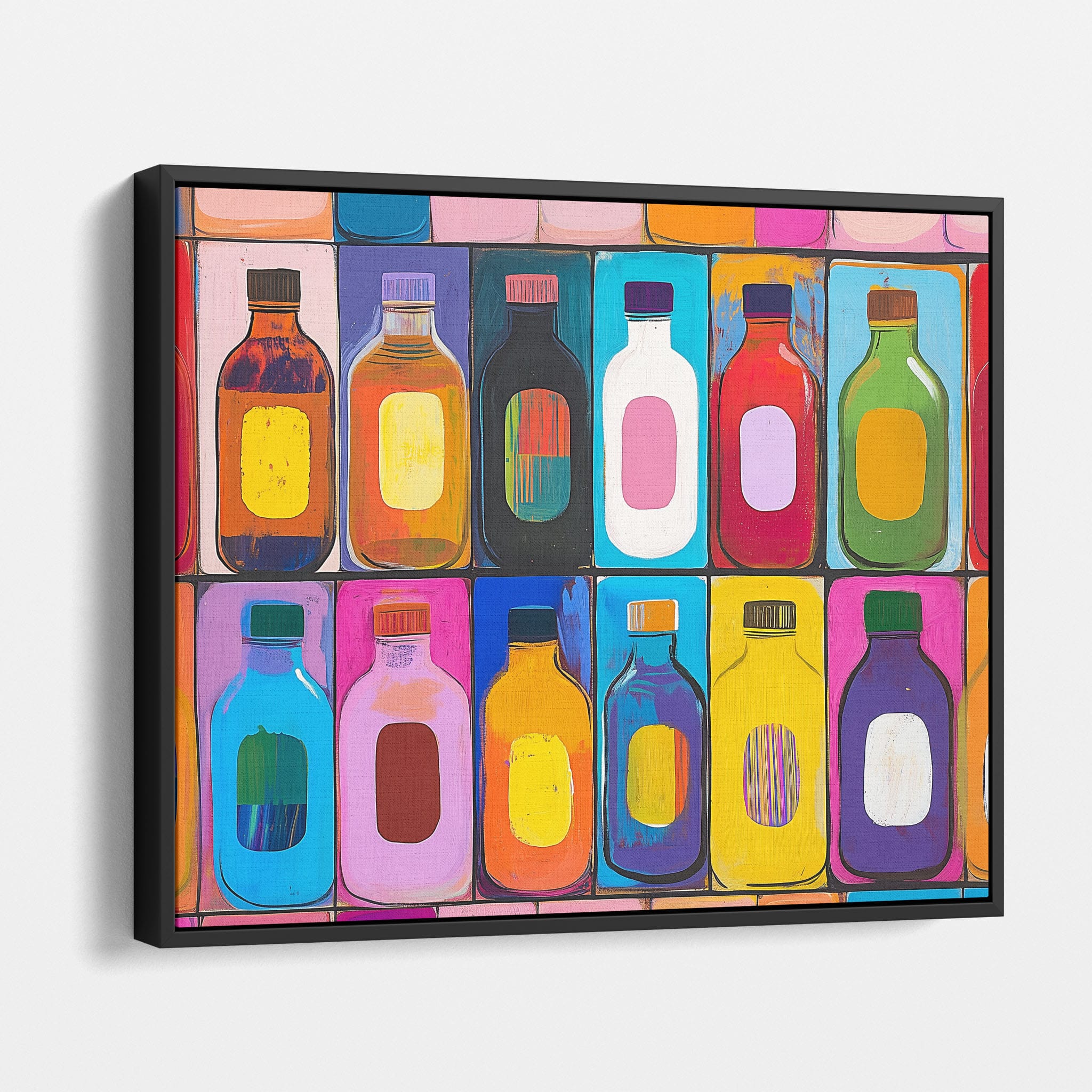 A vibrant selection of colorful painted bottles aligns perfectly in a geometric grid, creating a captivating visual pattern that sparks joy and inspires creativity. This painting leverages a modern yet pop-art style, employing bold, saturated colors and clean lines to draw the viewer's attention. Ideal for modern art lovers and those who appreciate colorful accents in their decor, this artwork adds a playful yet sophisticated touch to any space. Add this piece to brighten up your home or office with a splash of color and a dash of artistic flair.