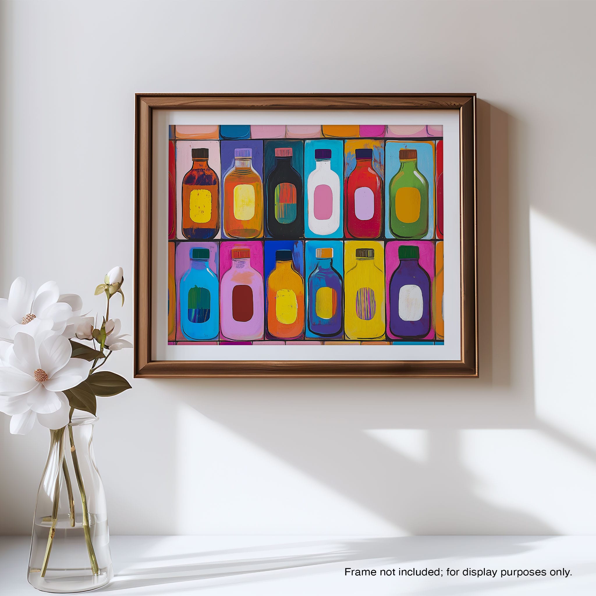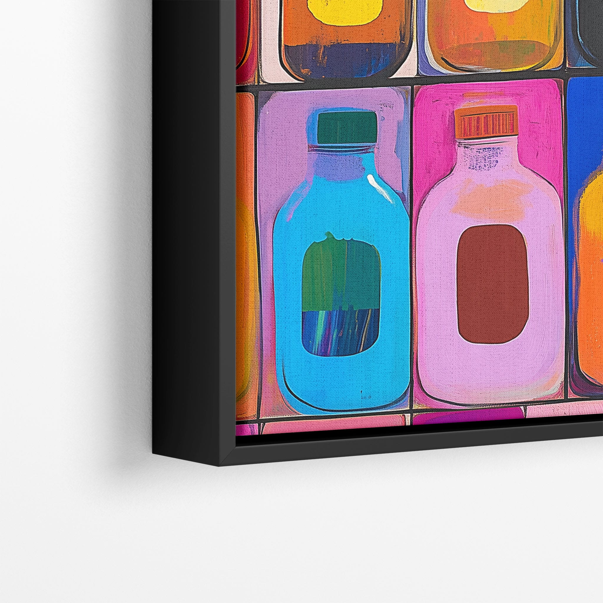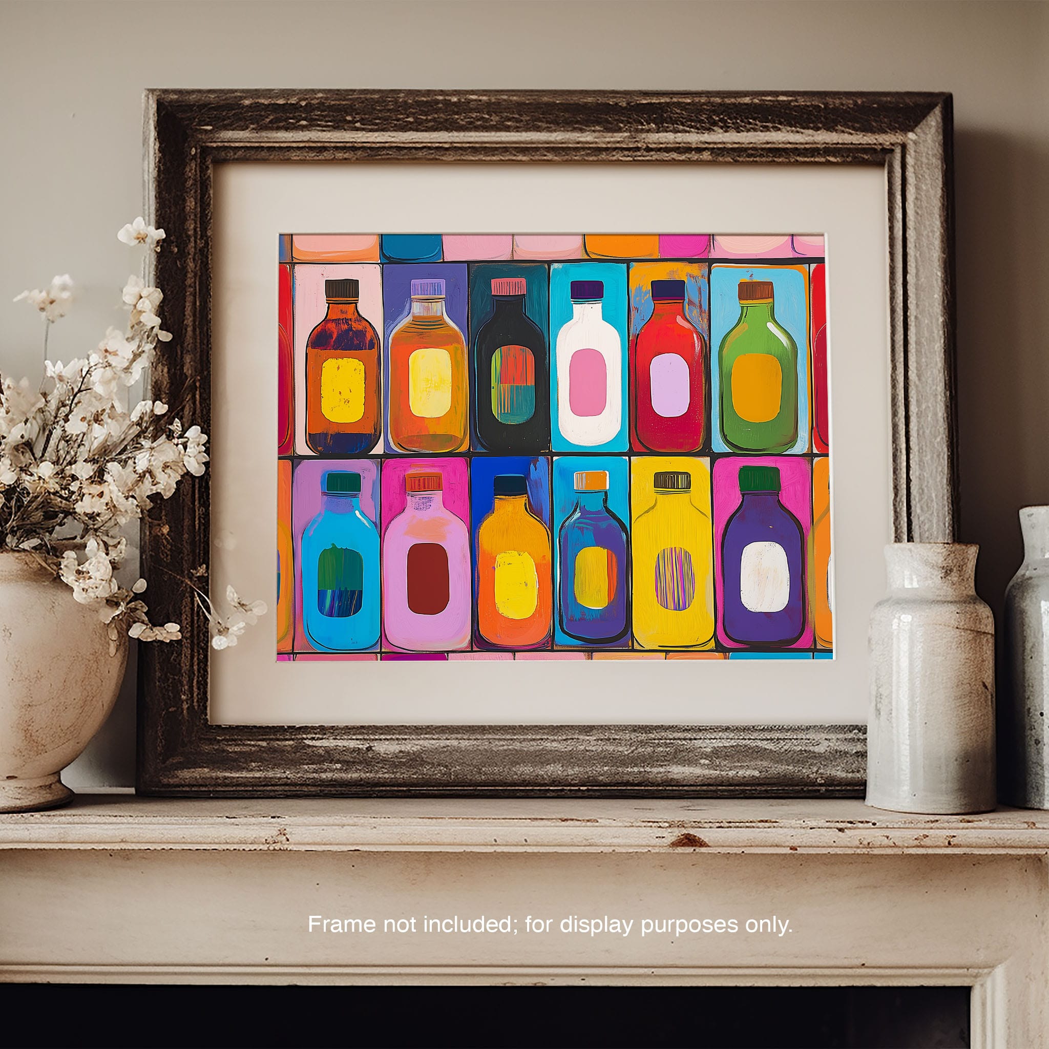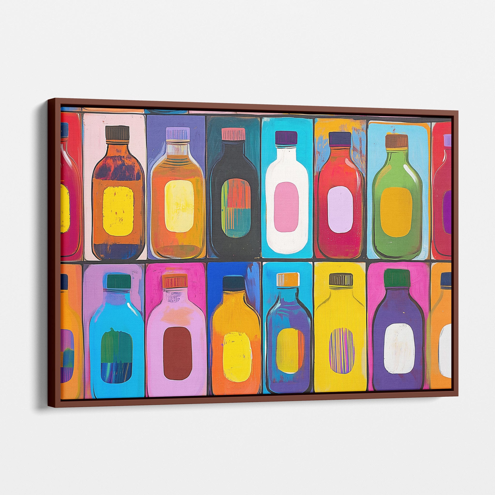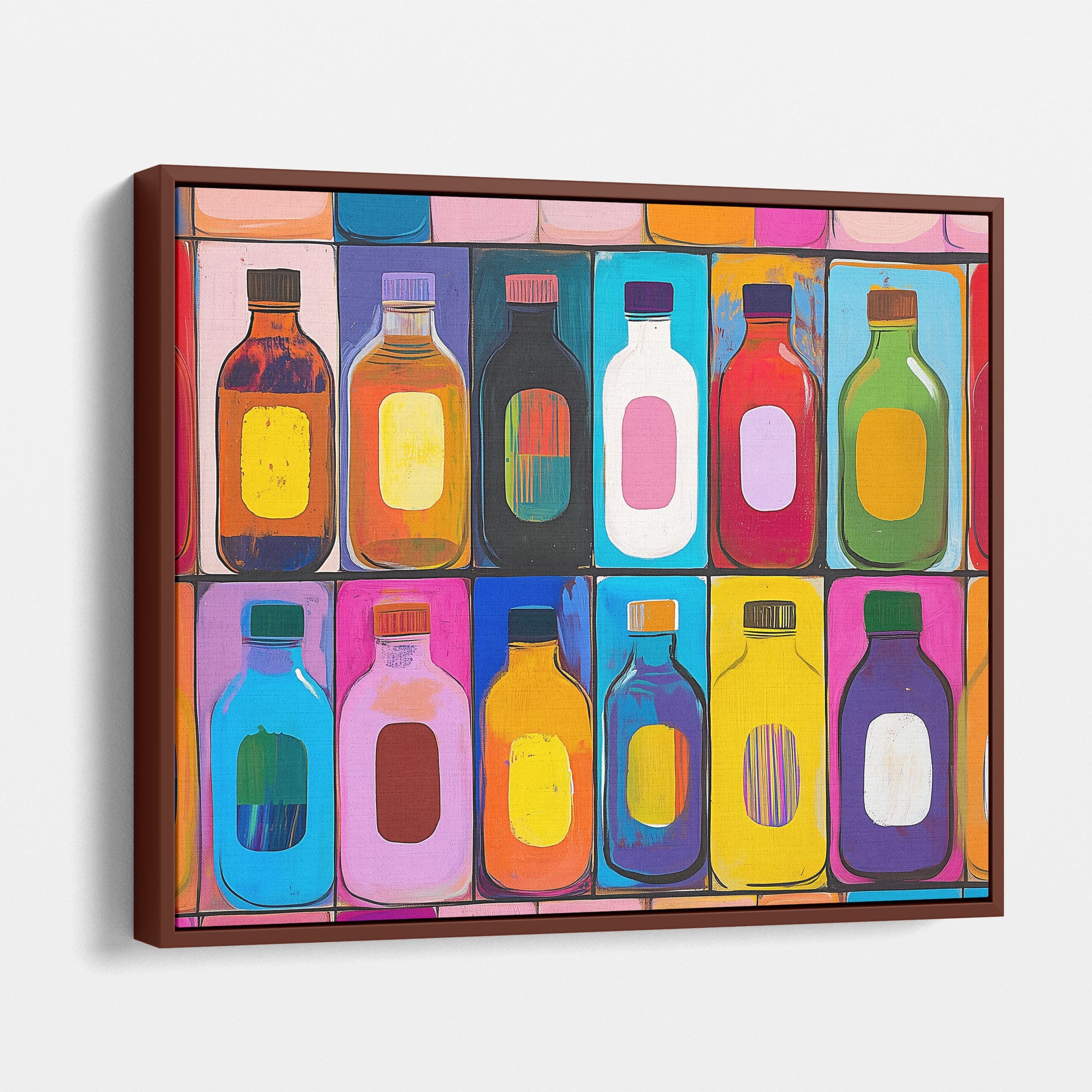 A vibrant selection of colorful painted bottles aligns perfectly in a geometric grid, creating a captivating visual pattern that sparks joy and inspires creativity. This painting leverages a modern yet pop-art style, employing bold, saturated colors and clean lines to draw the viewer's attention. Ideal for modern art lovers and those who appreciate colorful accents in their decor, this artwork adds a playful yet sophisticated touch to any space. Add this piece to brighten up your home or office with a splash of color and a dash of artistic flair.