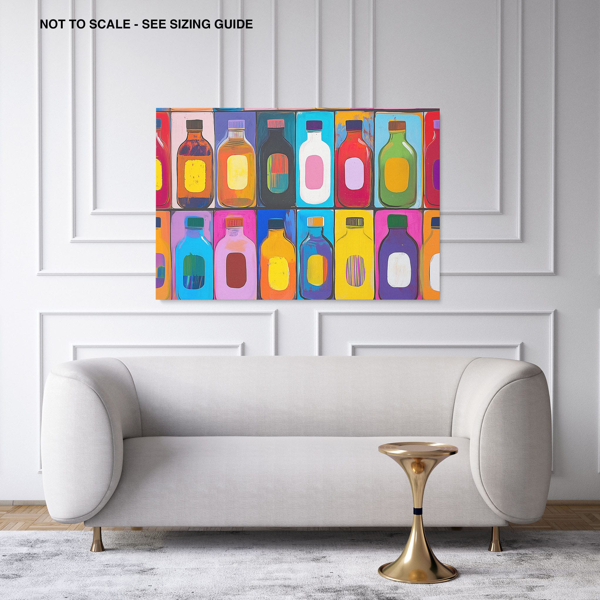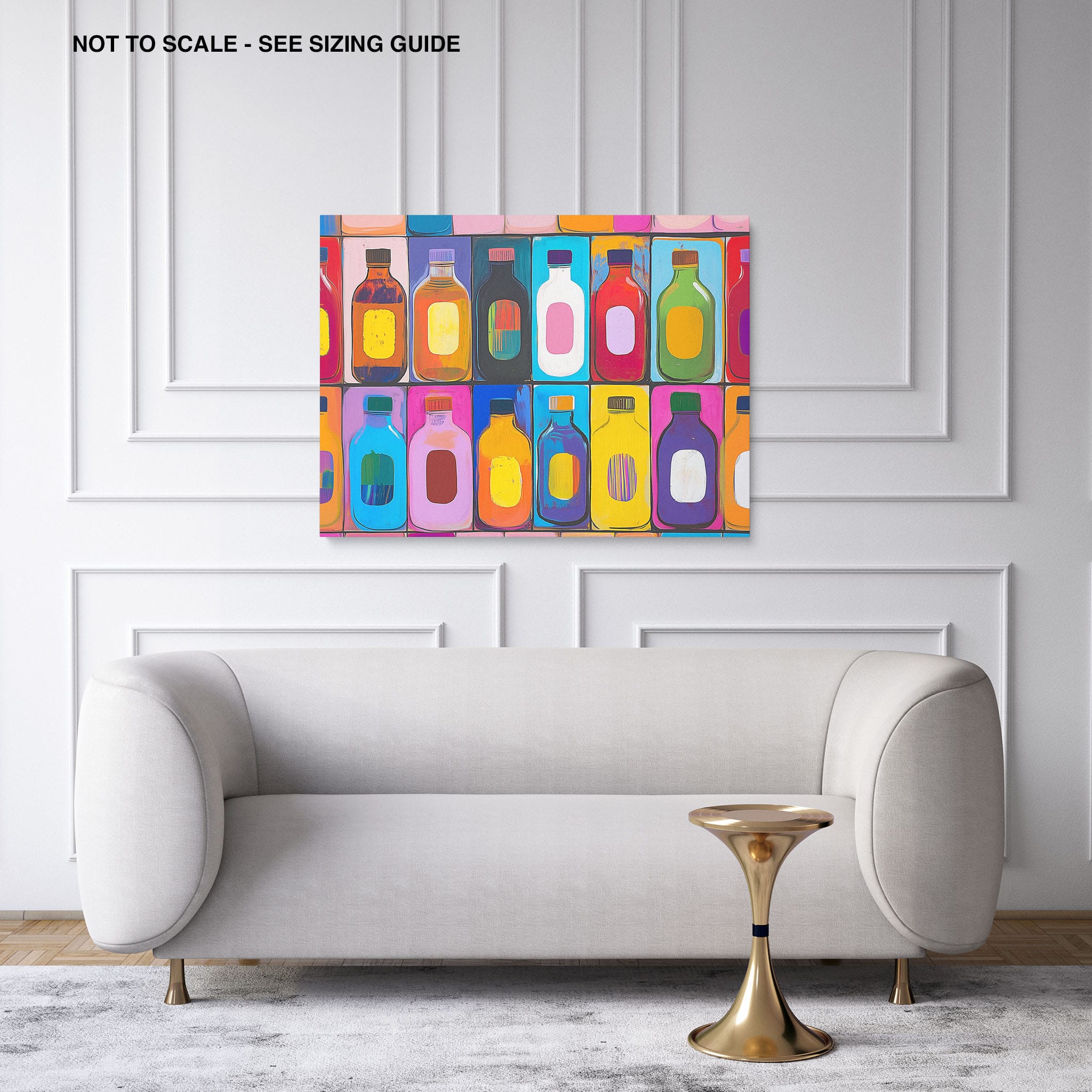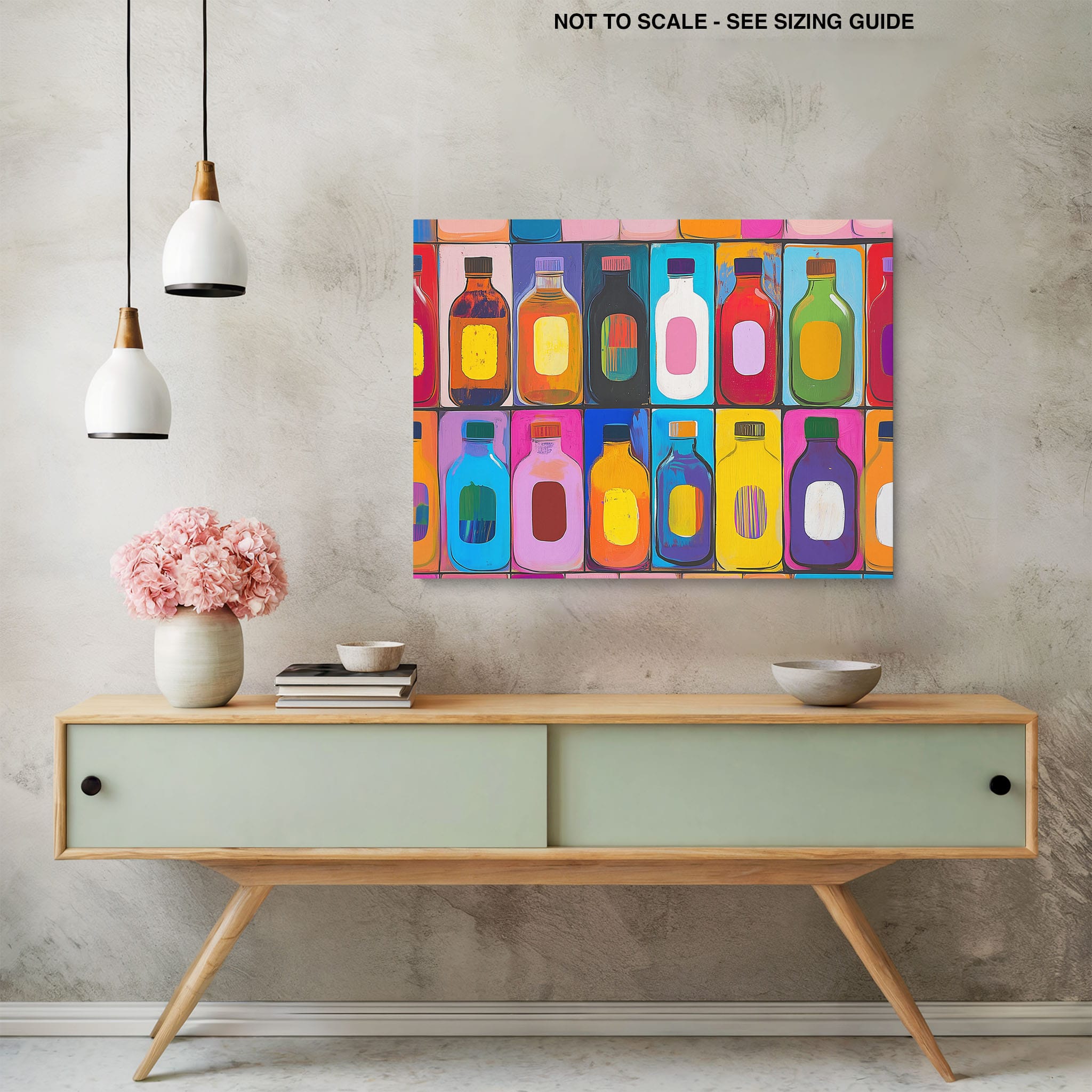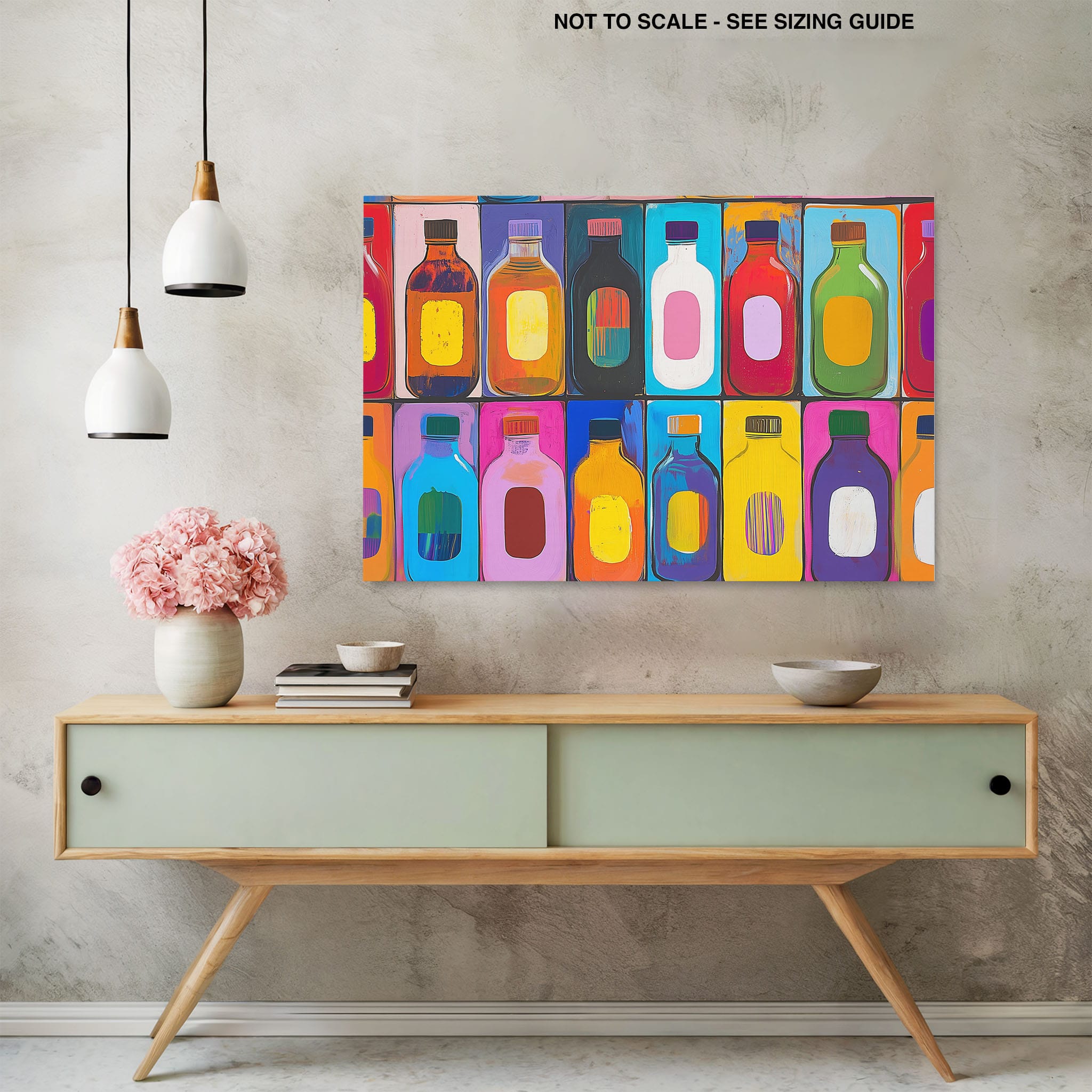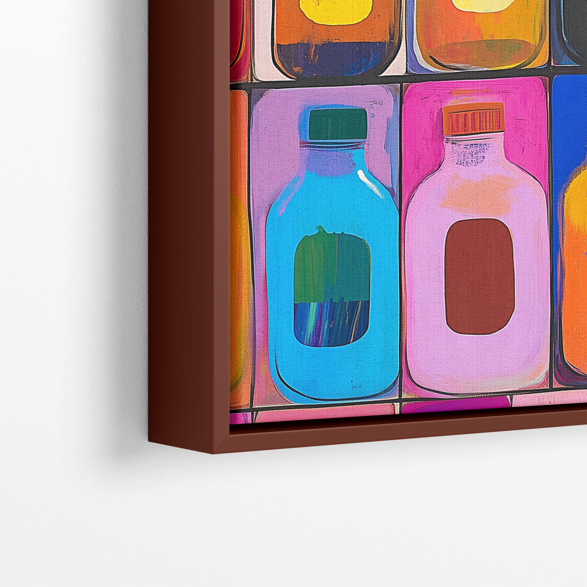 A vibrant selection of colorful painted bottles aligns perfectly in a geometric grid, creating a captivating visual pattern that sparks joy and inspires creativity. This painting leverages a modern yet pop-art style, employing bold, saturated colors and clean lines to draw the viewer's attention. Ideal for modern art lovers and those who appreciate colorful accents in their decor, this artwork adds a playful yet sophisticated touch to any space. Add this piece to brighten up your home or office with a splash of color and a dash of artistic flair.