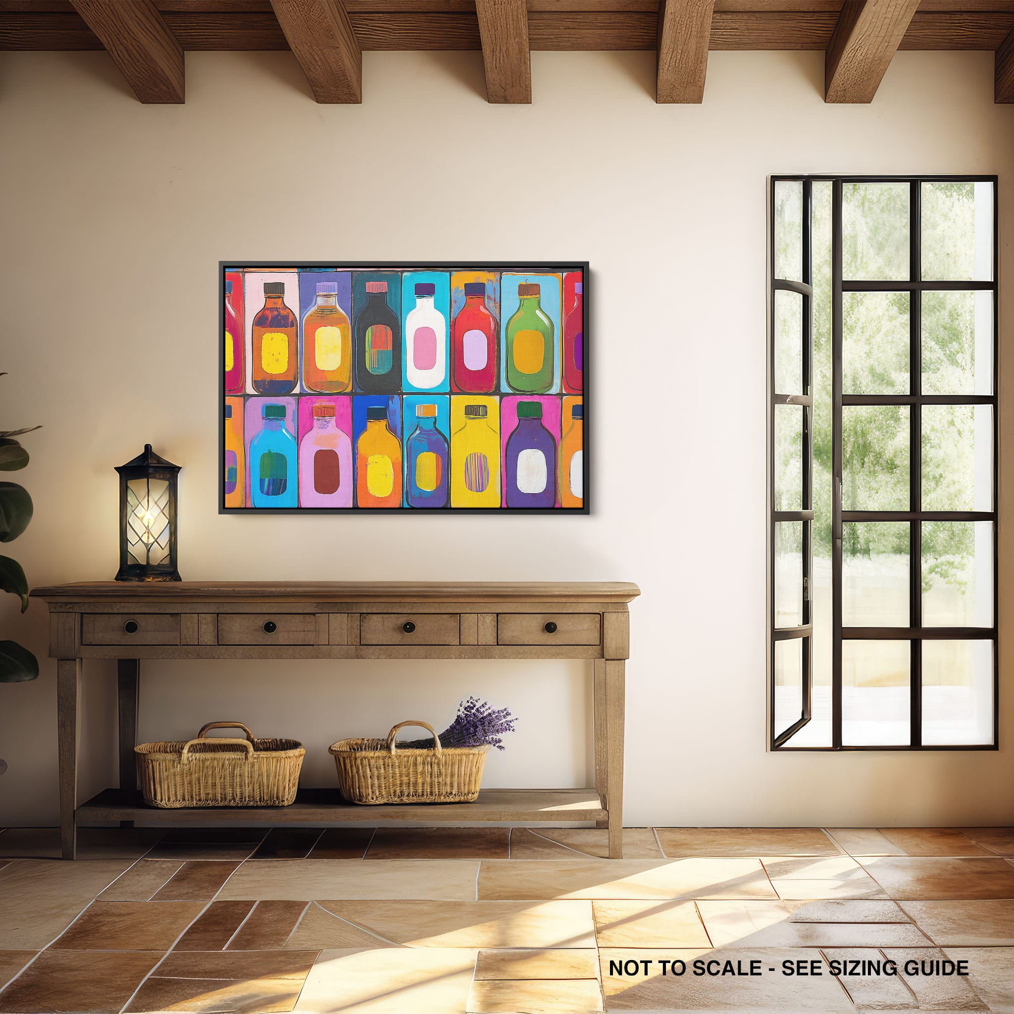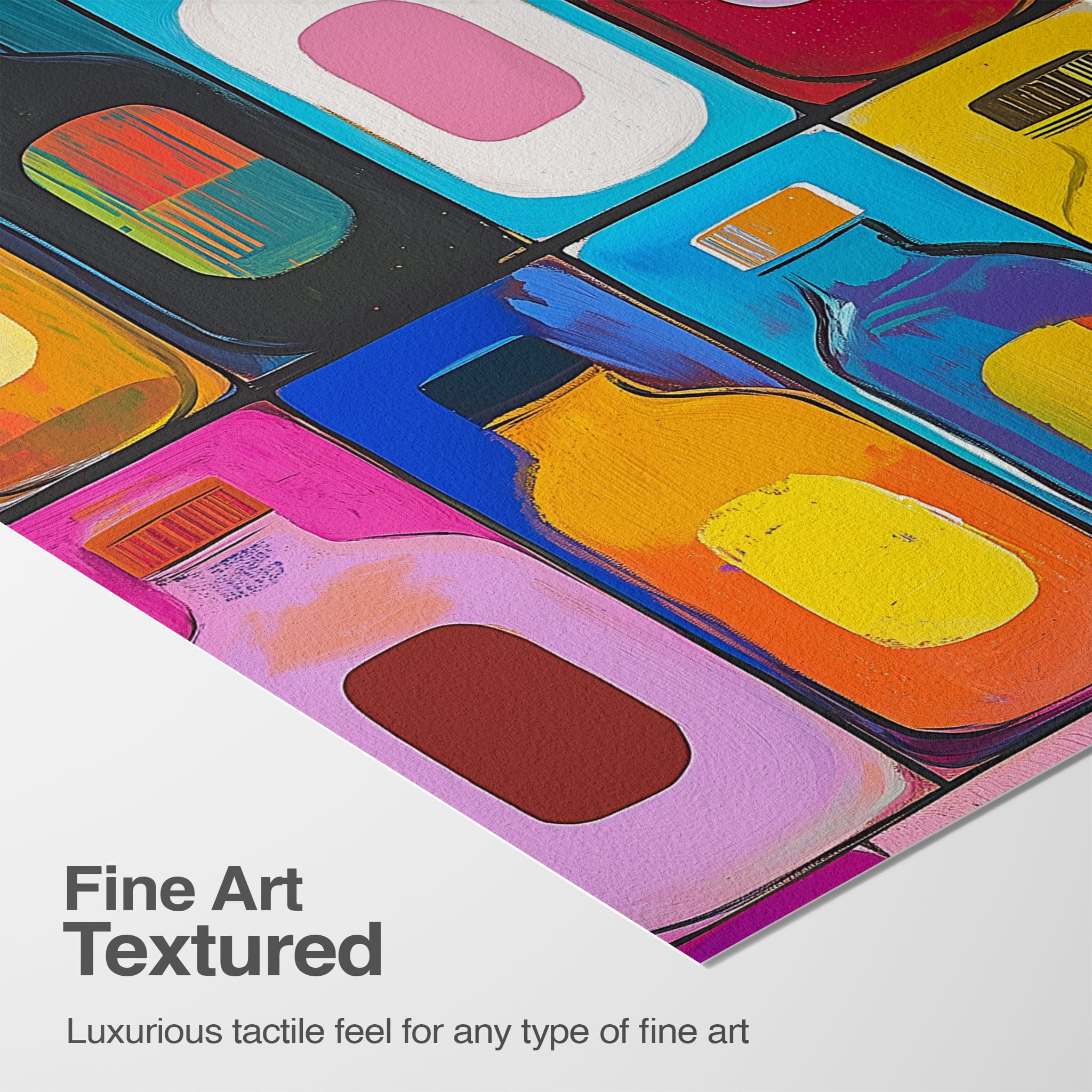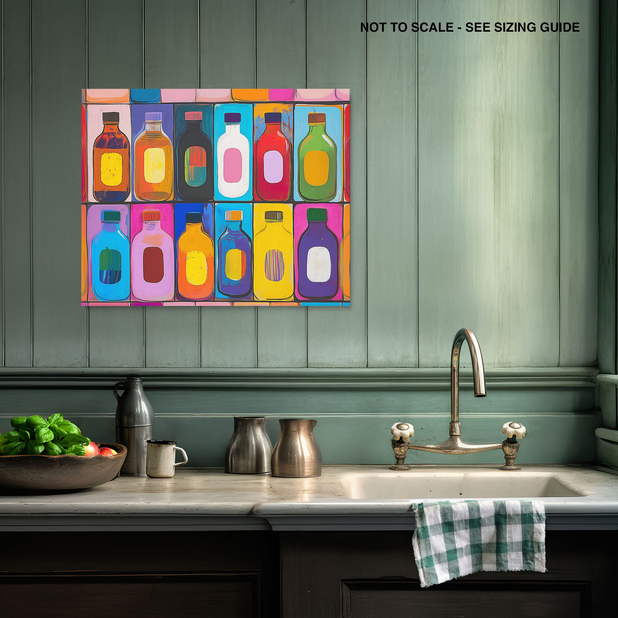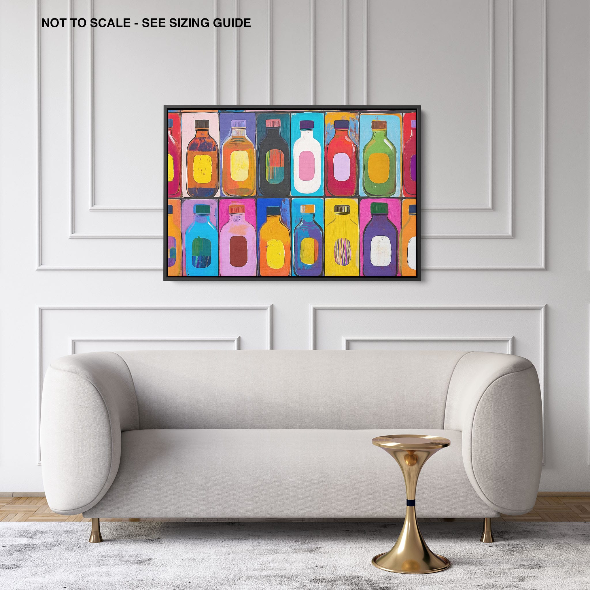 A vibrant selection of colorful painted bottles aligns perfectly in a geometric grid, creating a captivating visual pattern that sparks joy and inspires creativity. This painting leverages a modern yet pop-art style, employing bold, saturated colors and clean lines to draw the viewer's attention. Ideal for modern art lovers and those who appreciate colorful accents in their decor, this artwork adds a playful yet sophisticated touch to any space. Add this piece to brighten up your home or office with a splash of color and a dash of artistic flair.