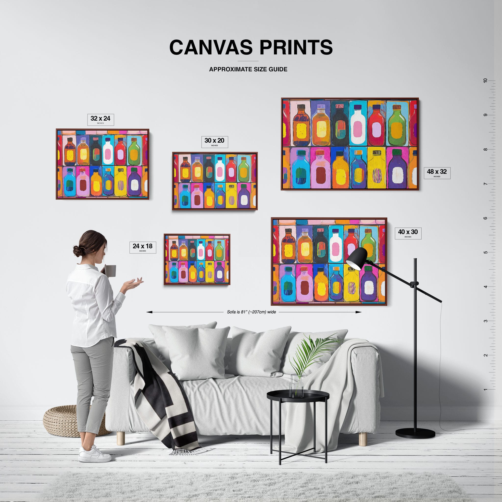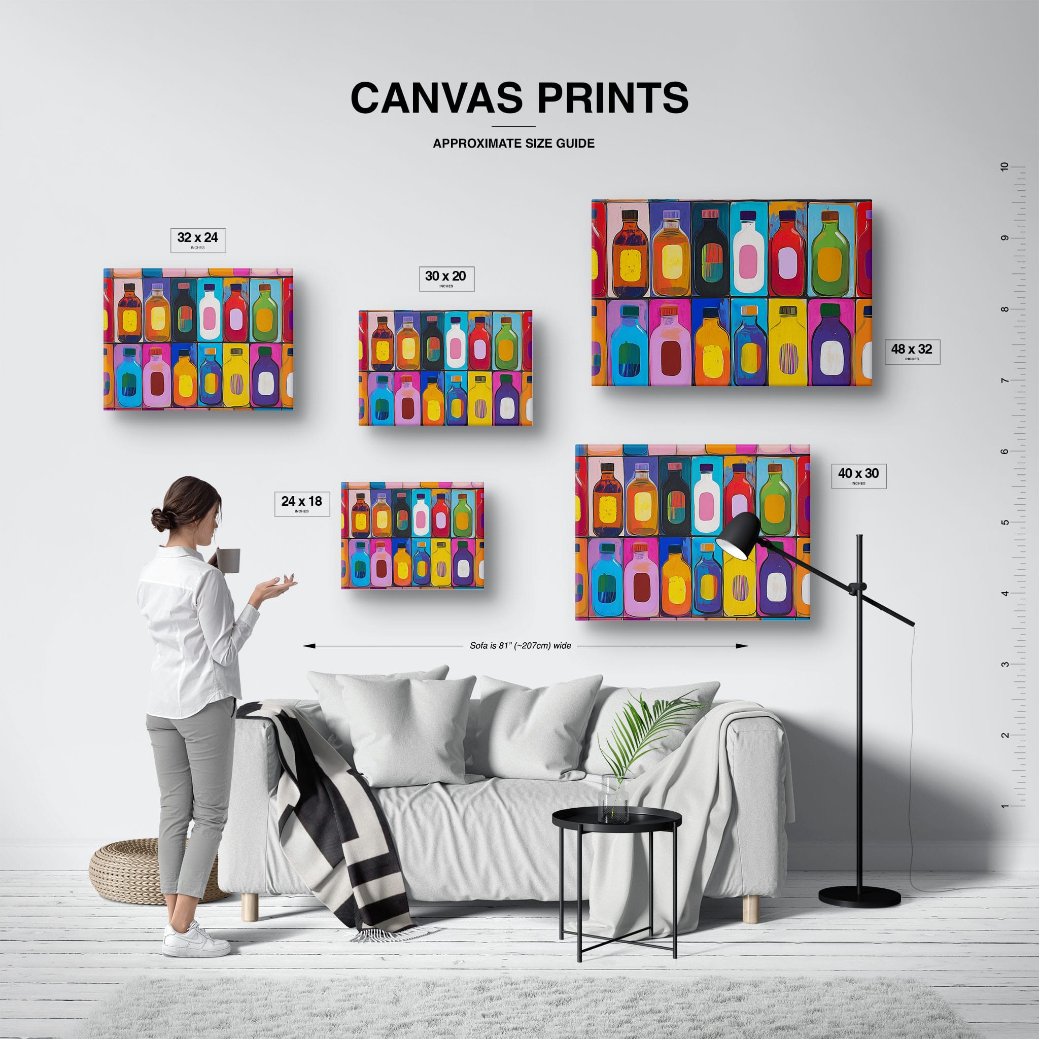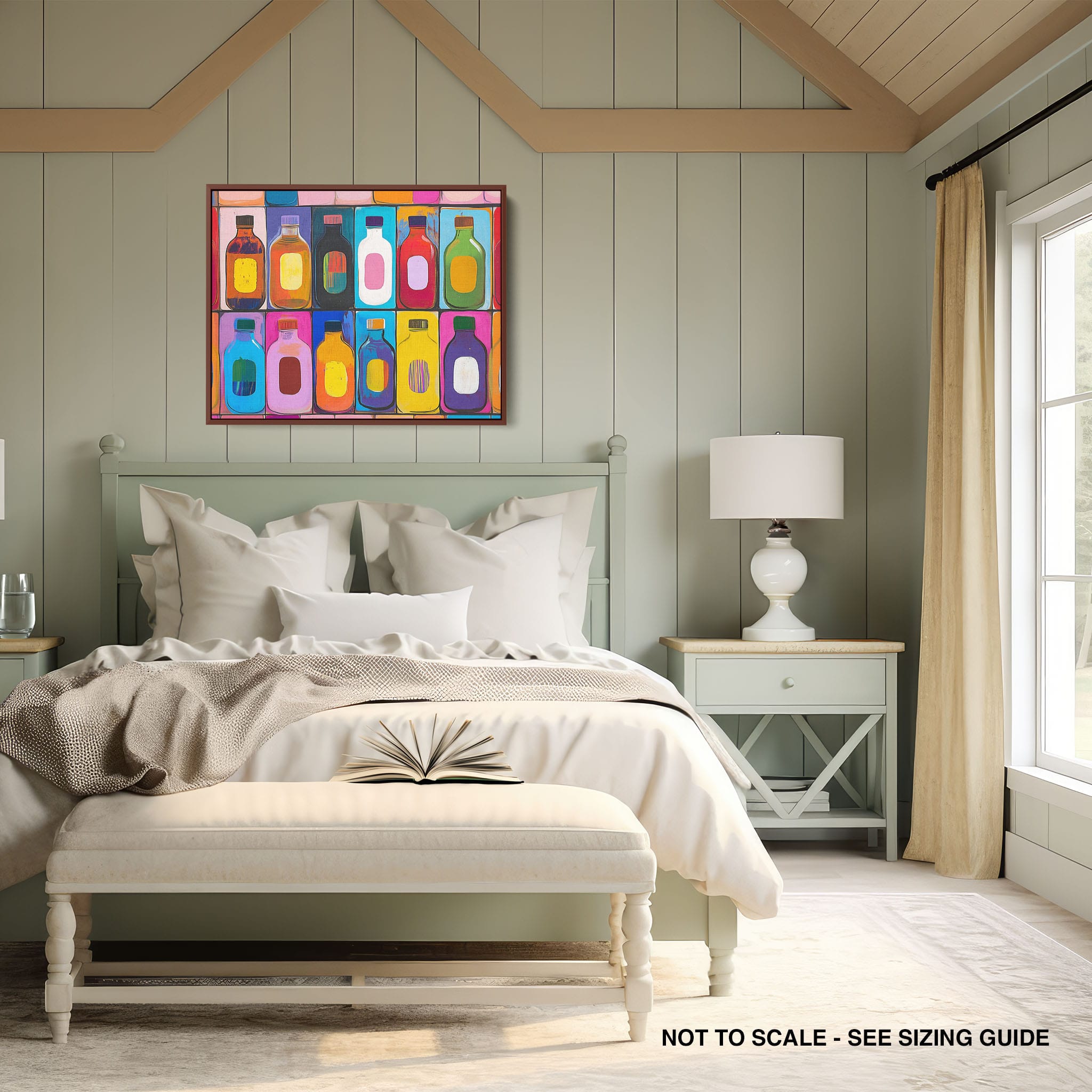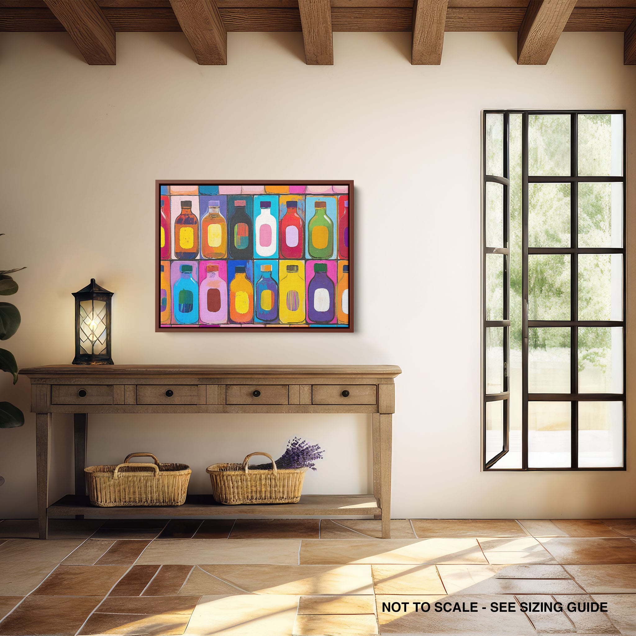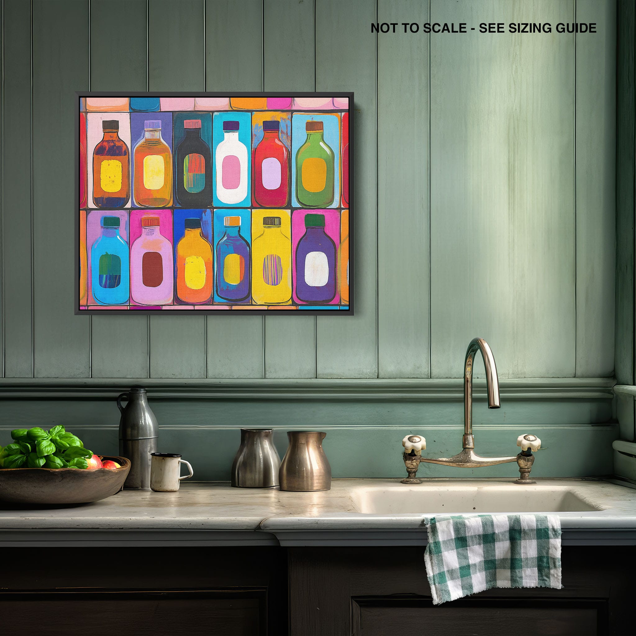A vibrant selection of colorful painted bottles aligns perfectly in a geometric grid, creating a captivating visual pattern that sparks joy and inspires creativity. This painting leverages a modern yet pop-art style, employing bold, saturated colors and clean lines to draw the viewer's attention. Ideal for modern art lovers and those who appreciate colorful accents in their decor, this artwork adds a playful yet sophisticated touch to any space. Add this piece to brighten up your home or office with a splash of color and a dash of artistic flair.