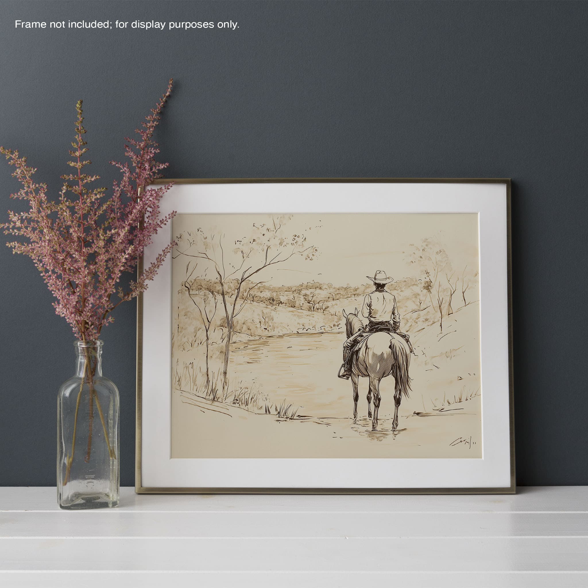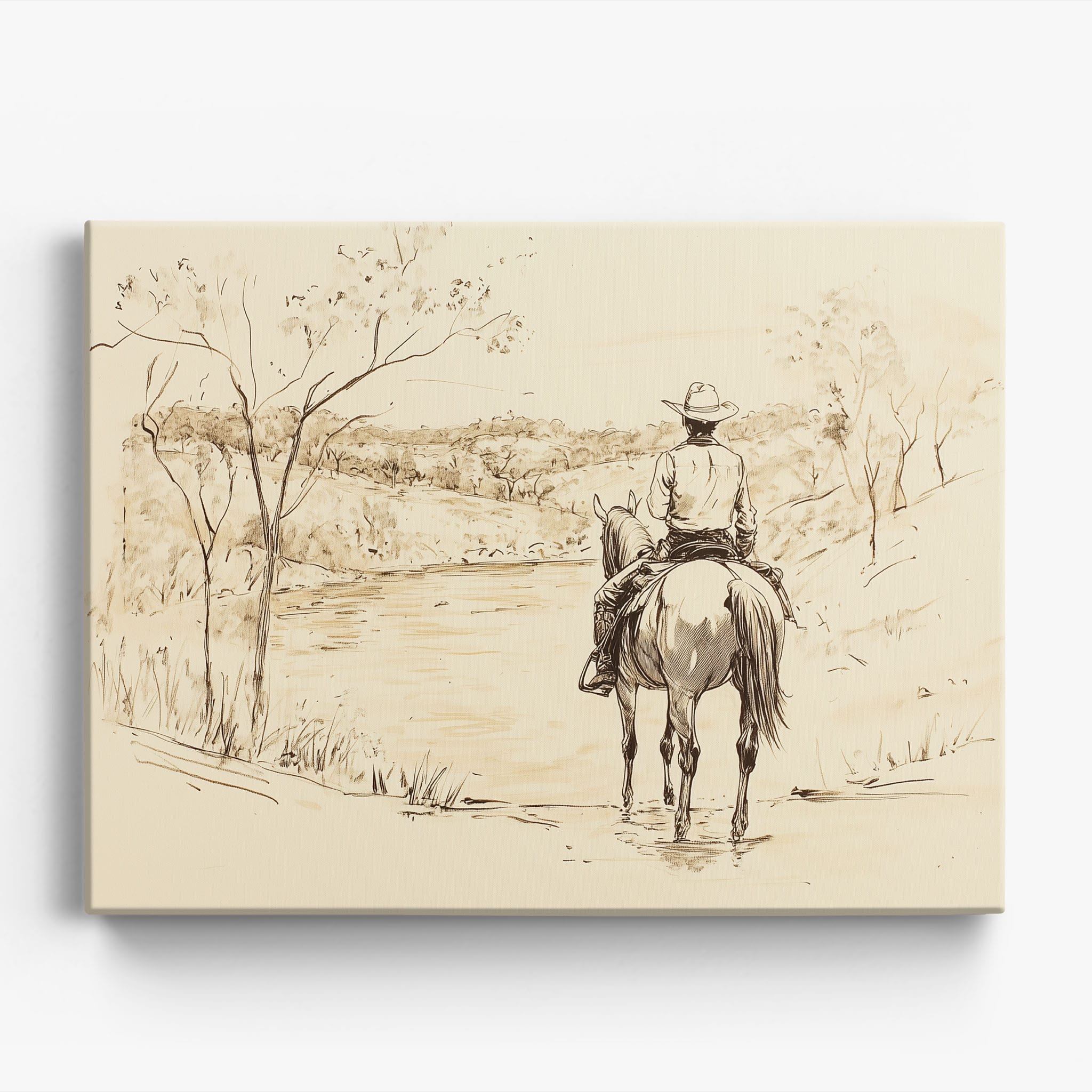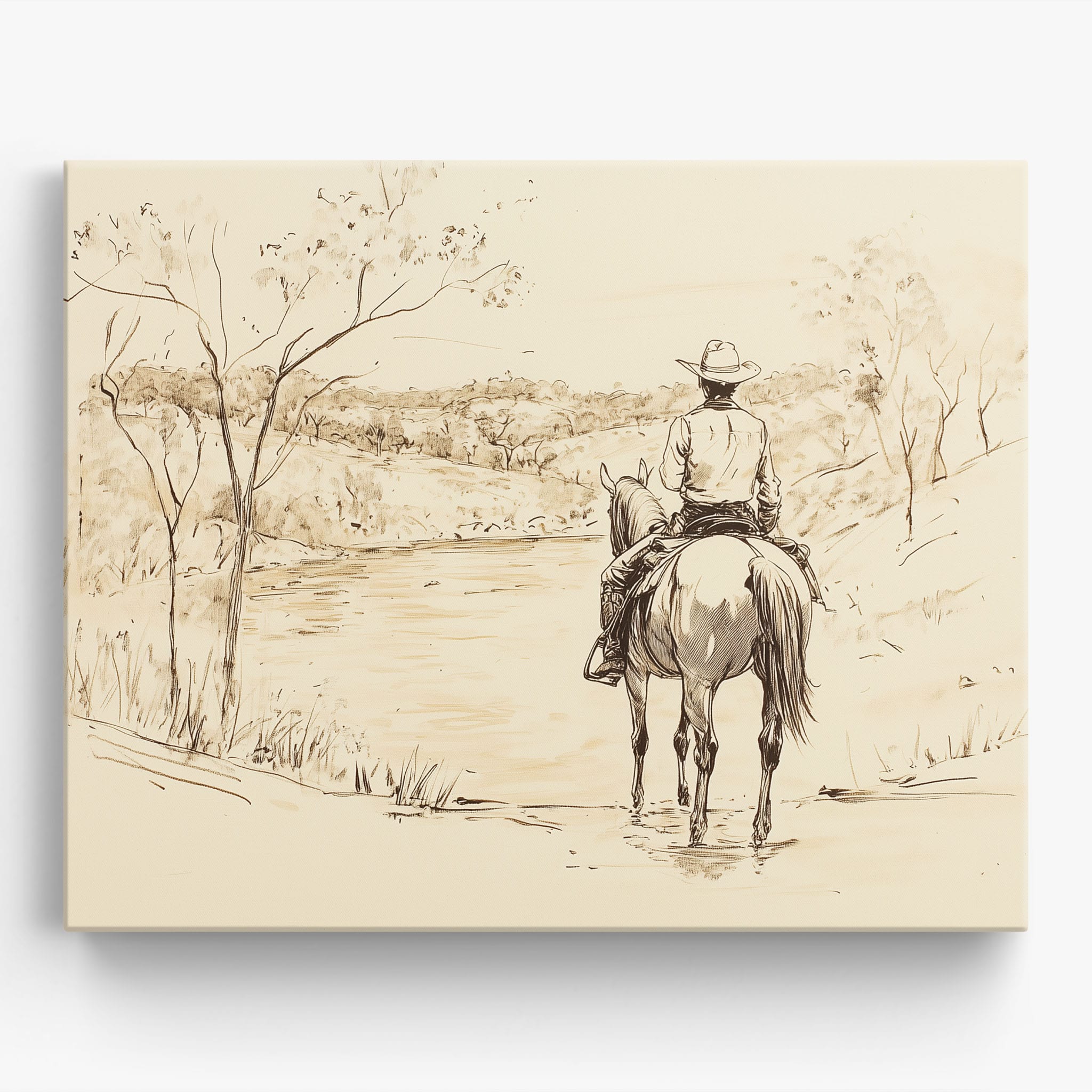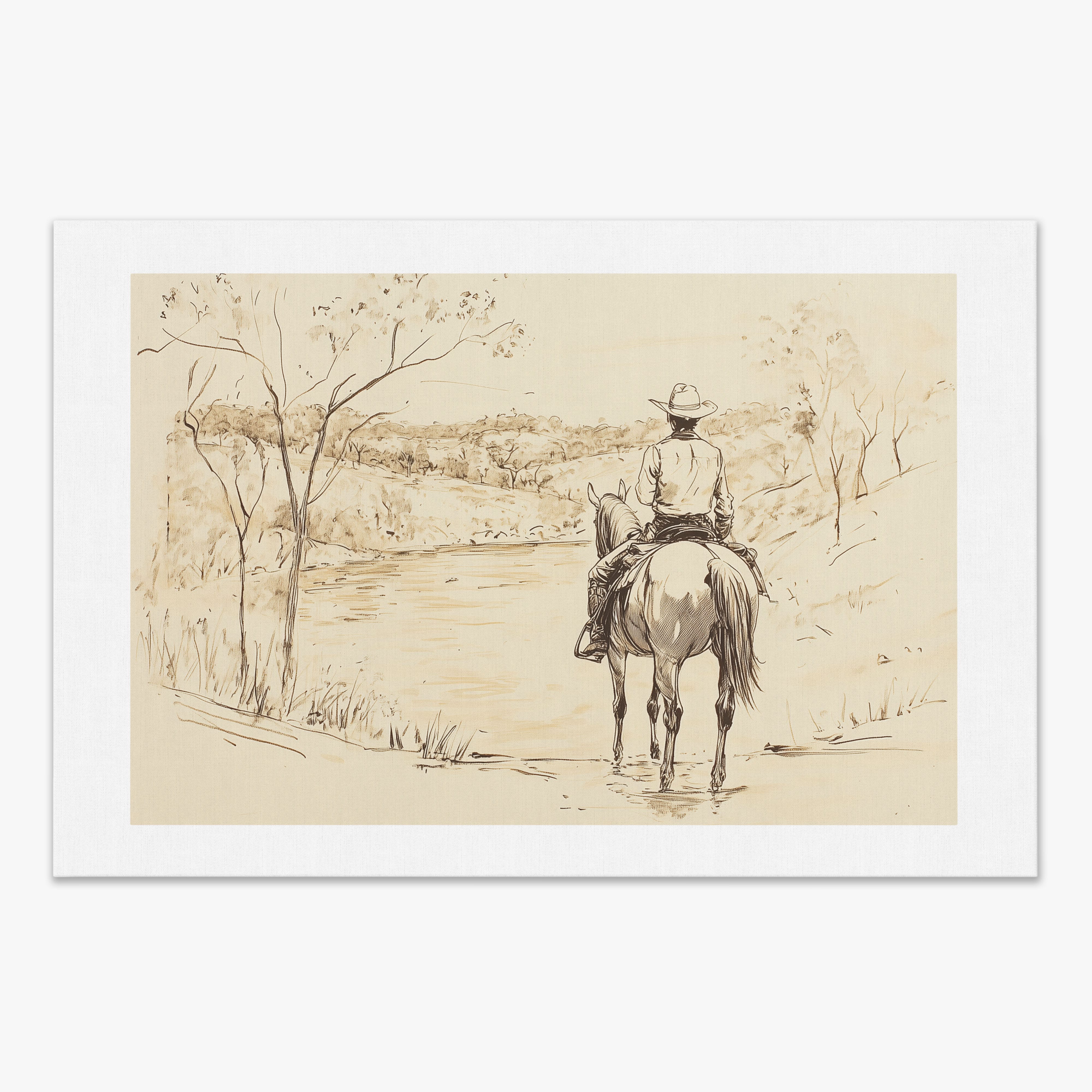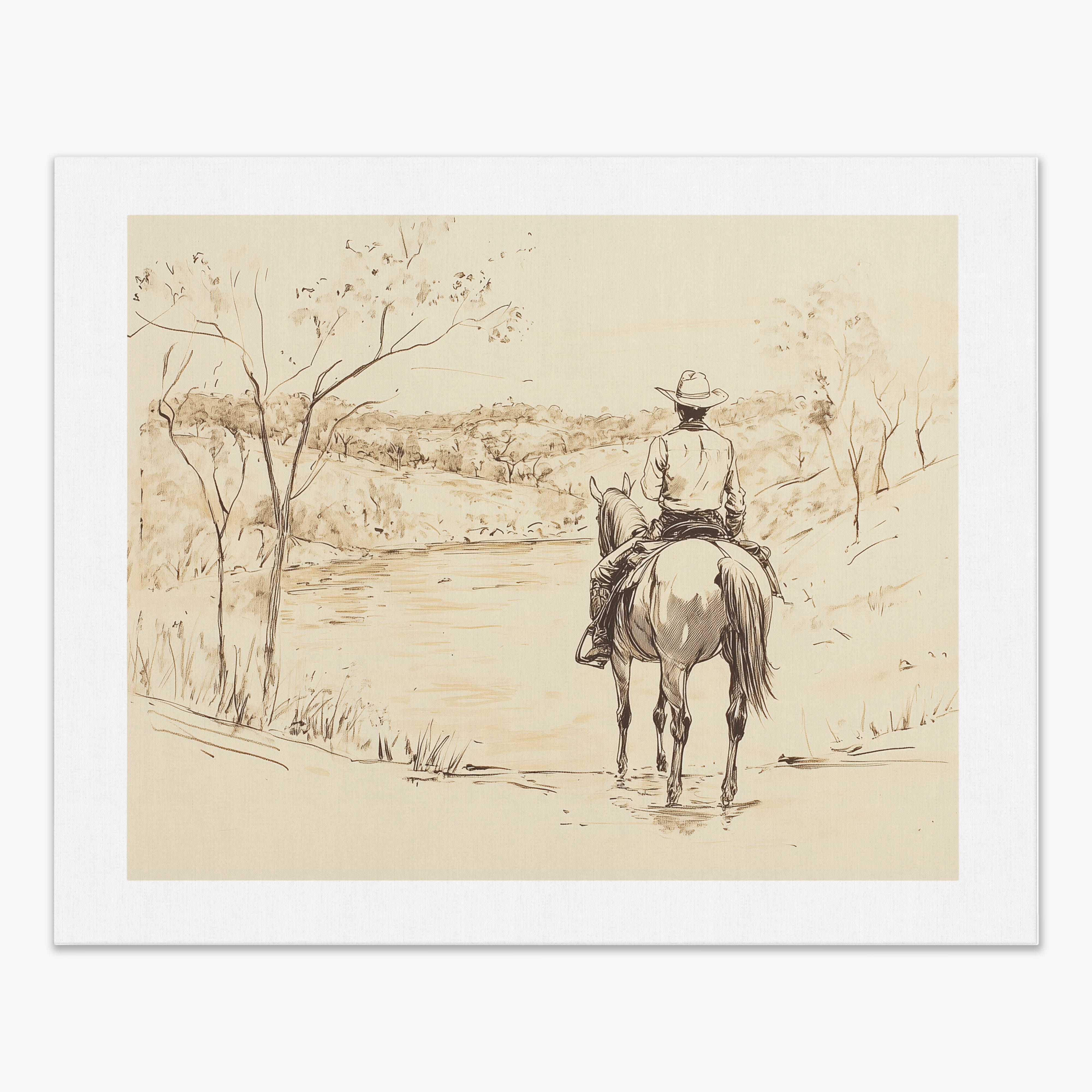 This evocative drawing portrays a lone cowboy on horseback, gazing over a serene lakeside landscape. The fluid lines and subtle shading capture the peaceful ambiance and timeless essence of the American West. With its minimalist style, the drawing emphasizes simplicity while conveying deep emotion and narrative. Perfect for Western art enthusiasts, this artwork adds a rustic charm to any space. Ideal for collectors seeking a classic yet understated piece, this drawing beautifully encapsulates the spirit of solitude and reflection. Enhance your collection with this stunning depiction of cowboy life and Western scenery.