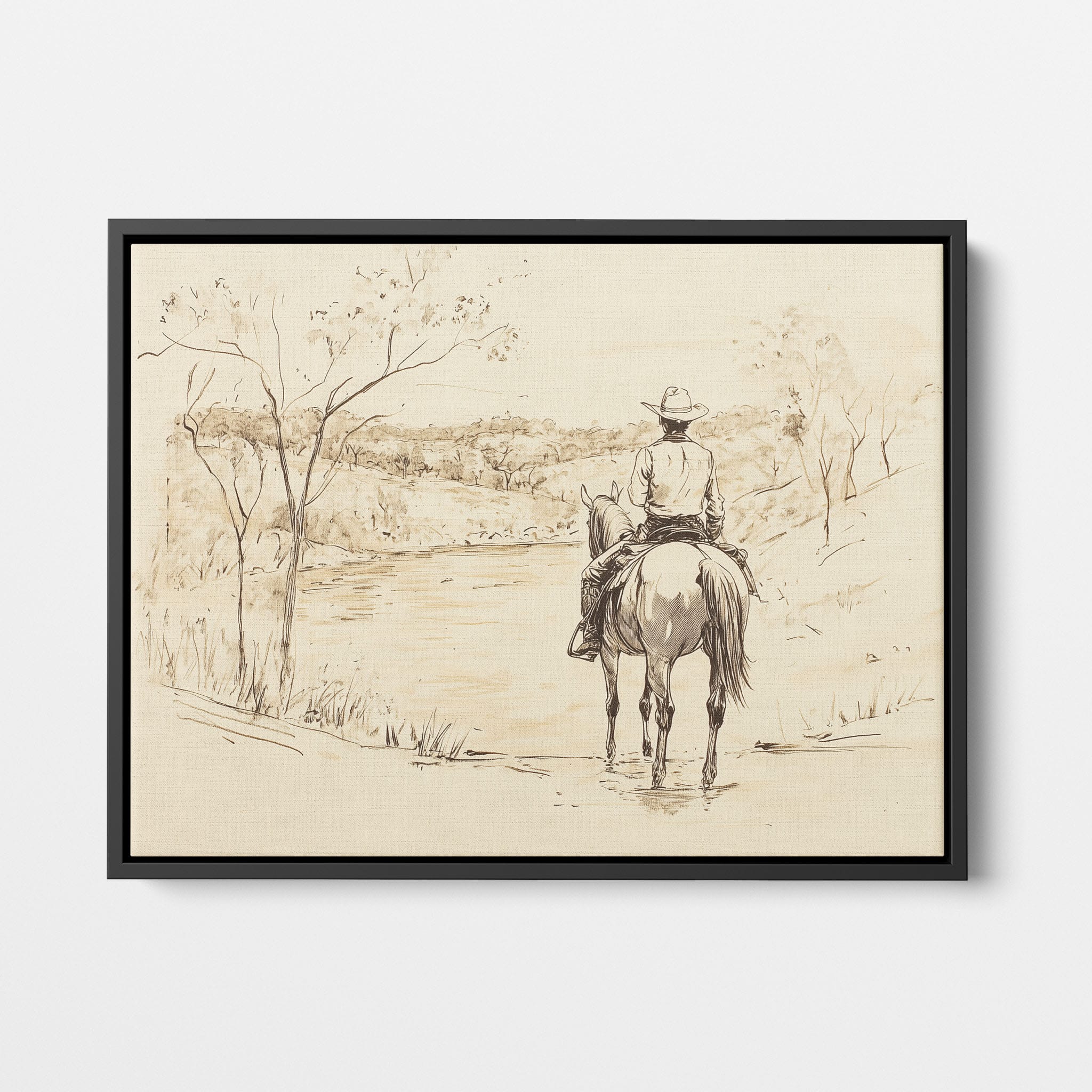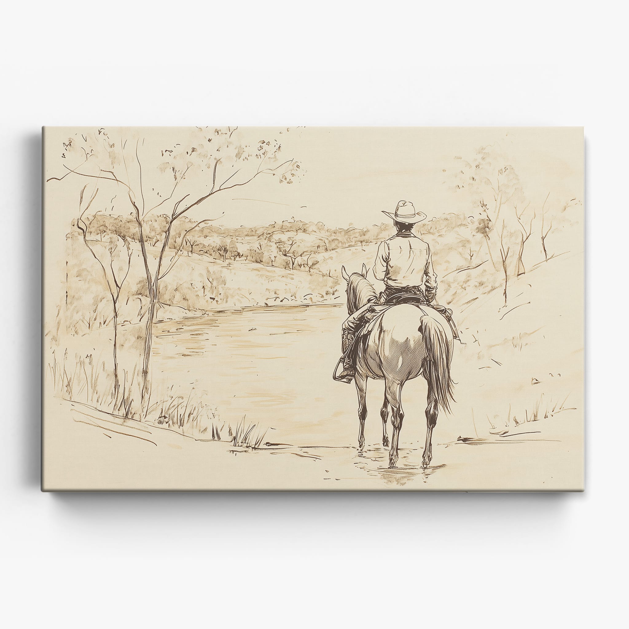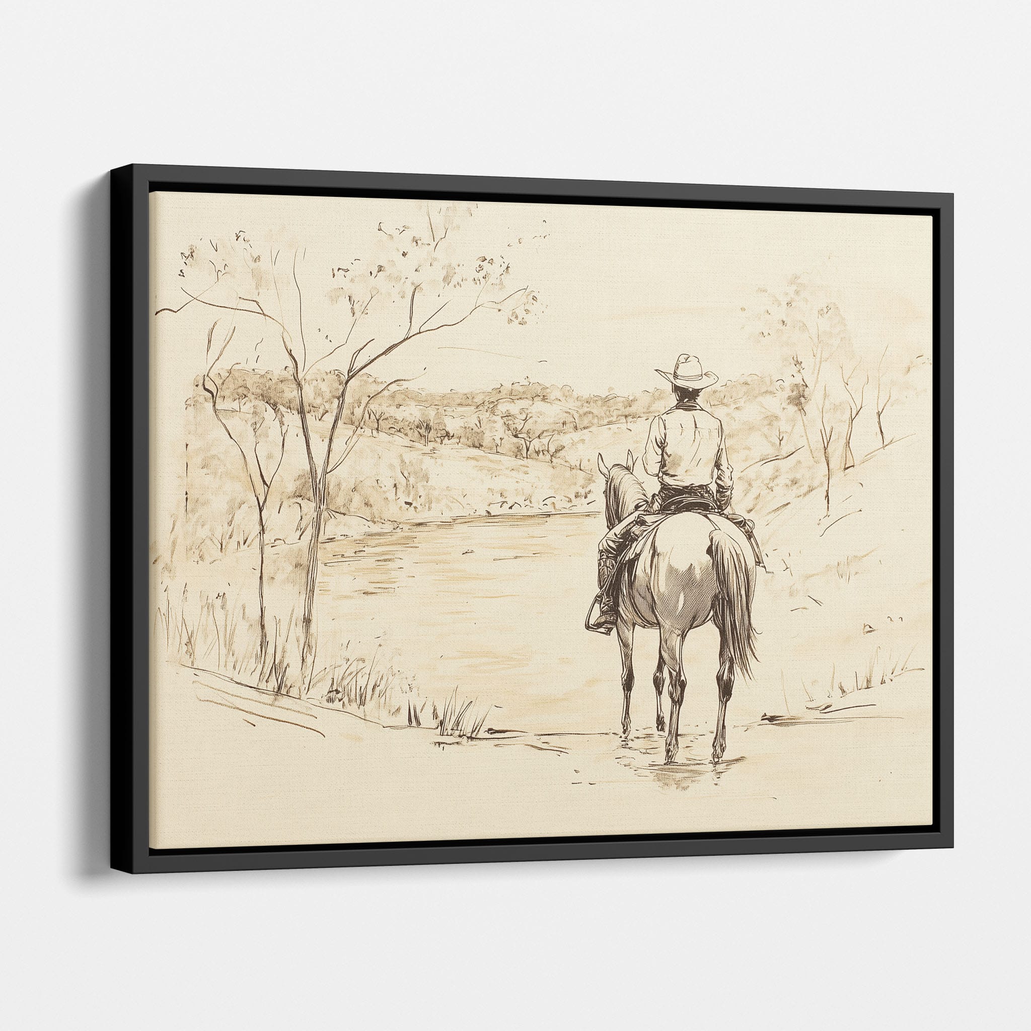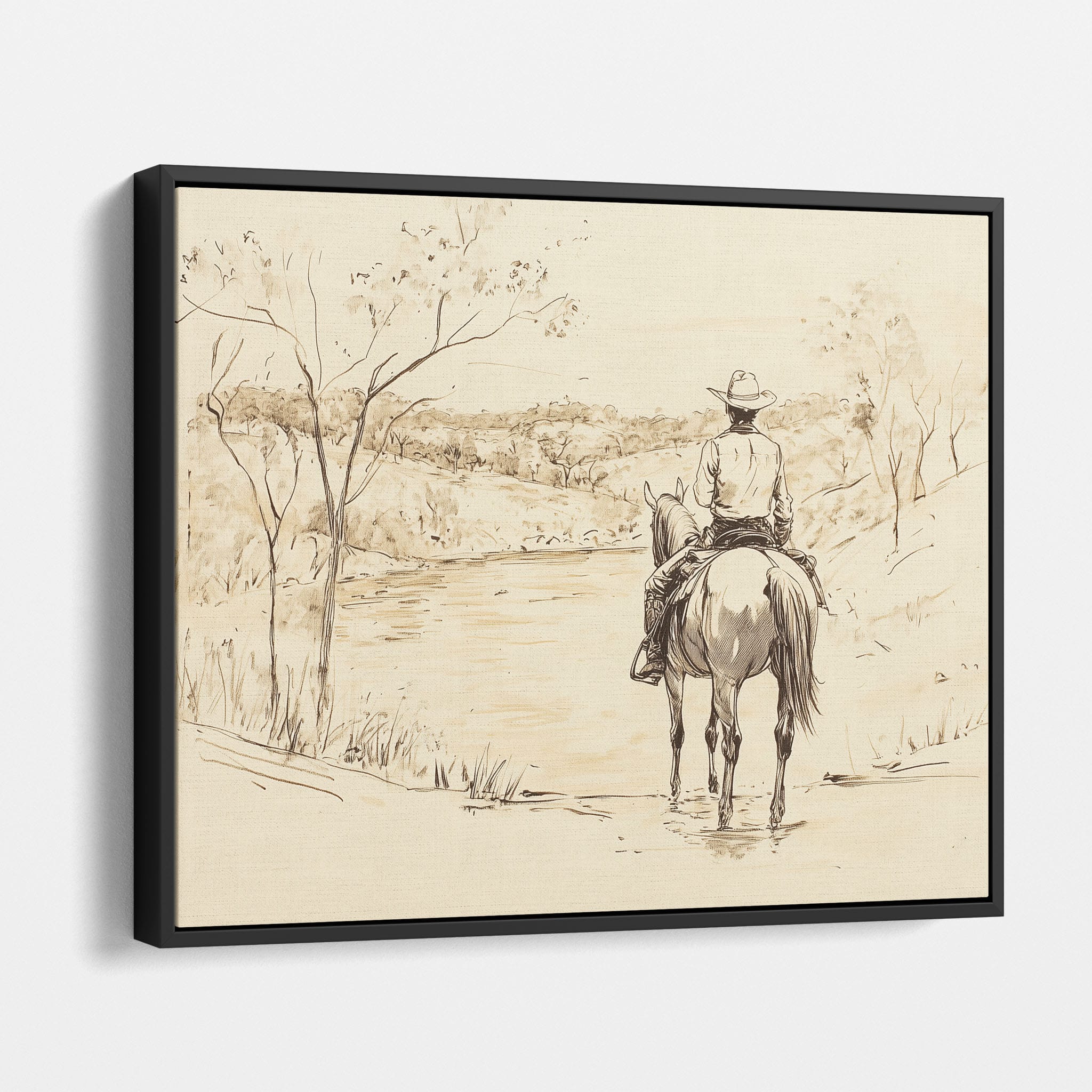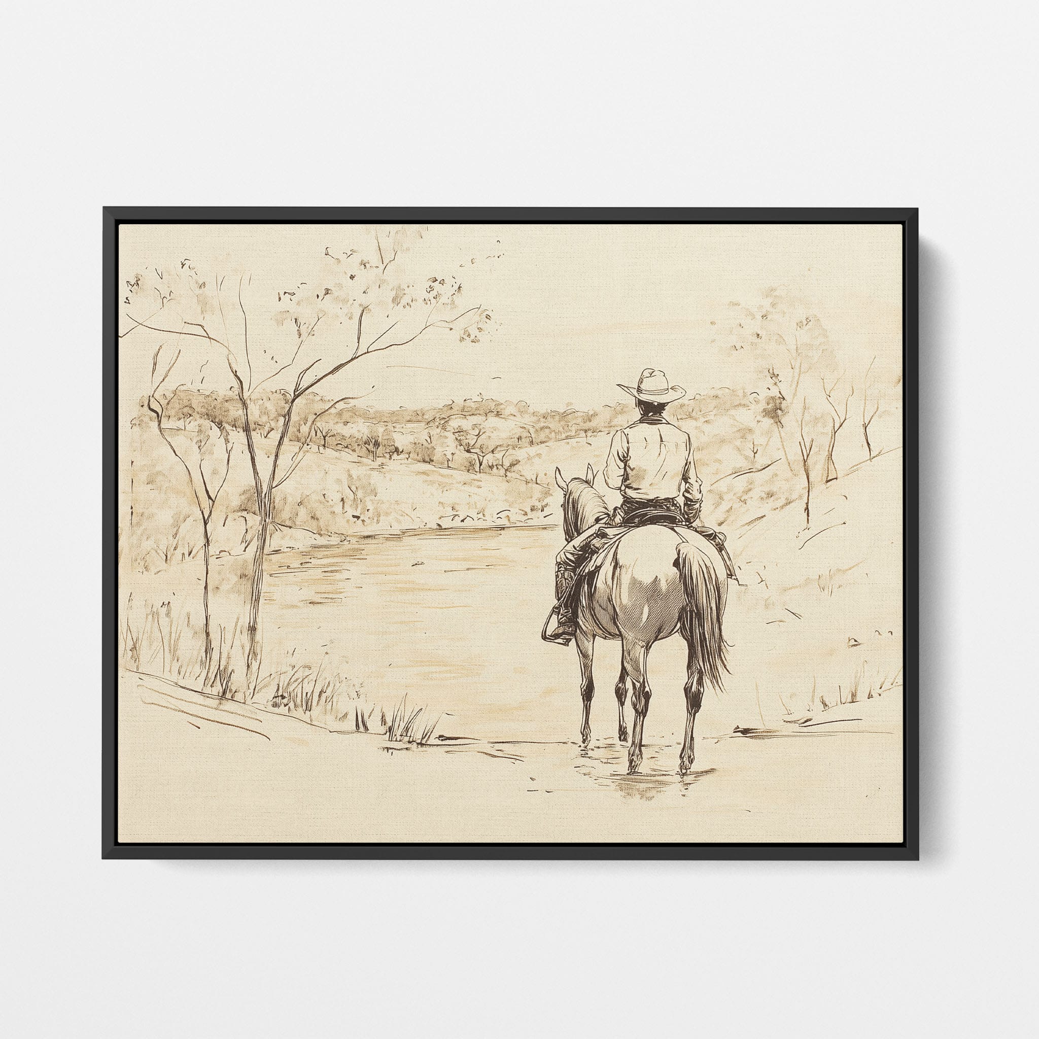 This evocative drawing portrays a lone cowboy on horseback, gazing over a serene lakeside landscape. The fluid lines and subtle shading capture the peaceful ambiance and timeless essence of the American West. With its minimalist style, the drawing emphasizes simplicity while conveying deep emotion and narrative. Perfect for Western art enthusiasts, this artwork adds a rustic charm to any space. Ideal for collectors seeking a classic yet understated piece, this drawing beautifully encapsulates the spirit of solitude and reflection. Enhance your collection with this stunning depiction of cowboy life and Western scenery.