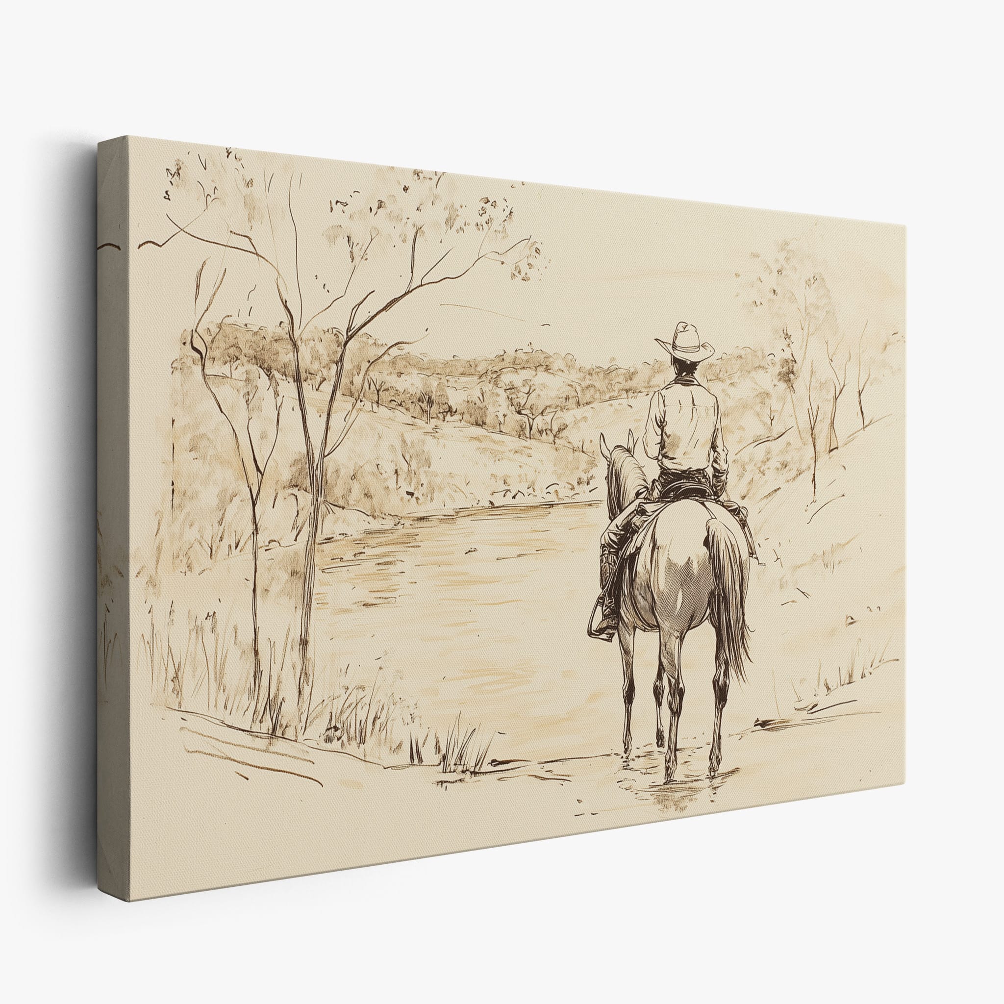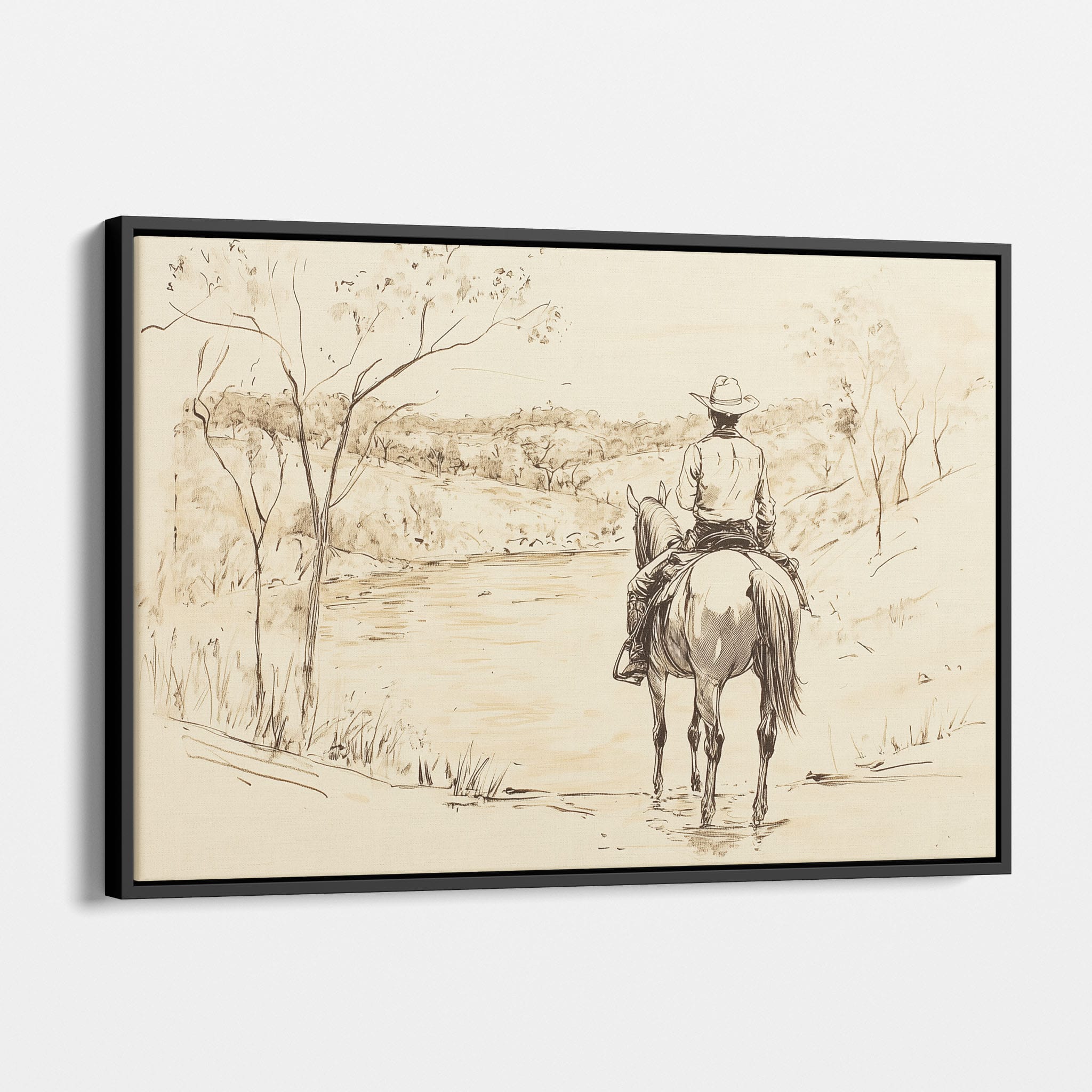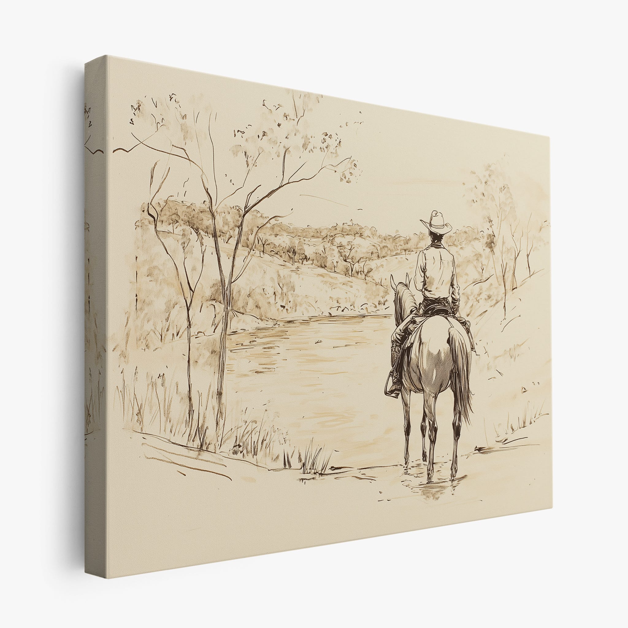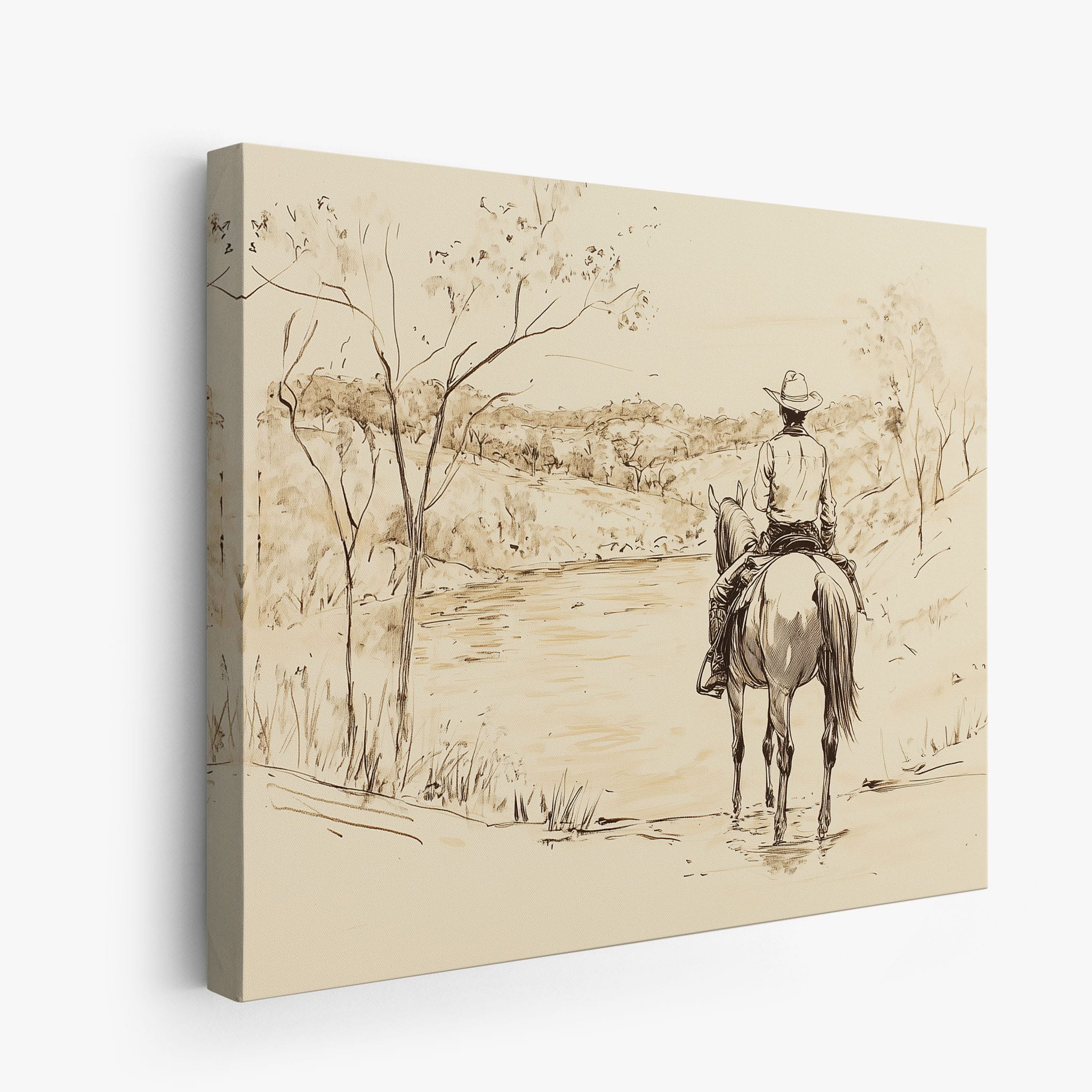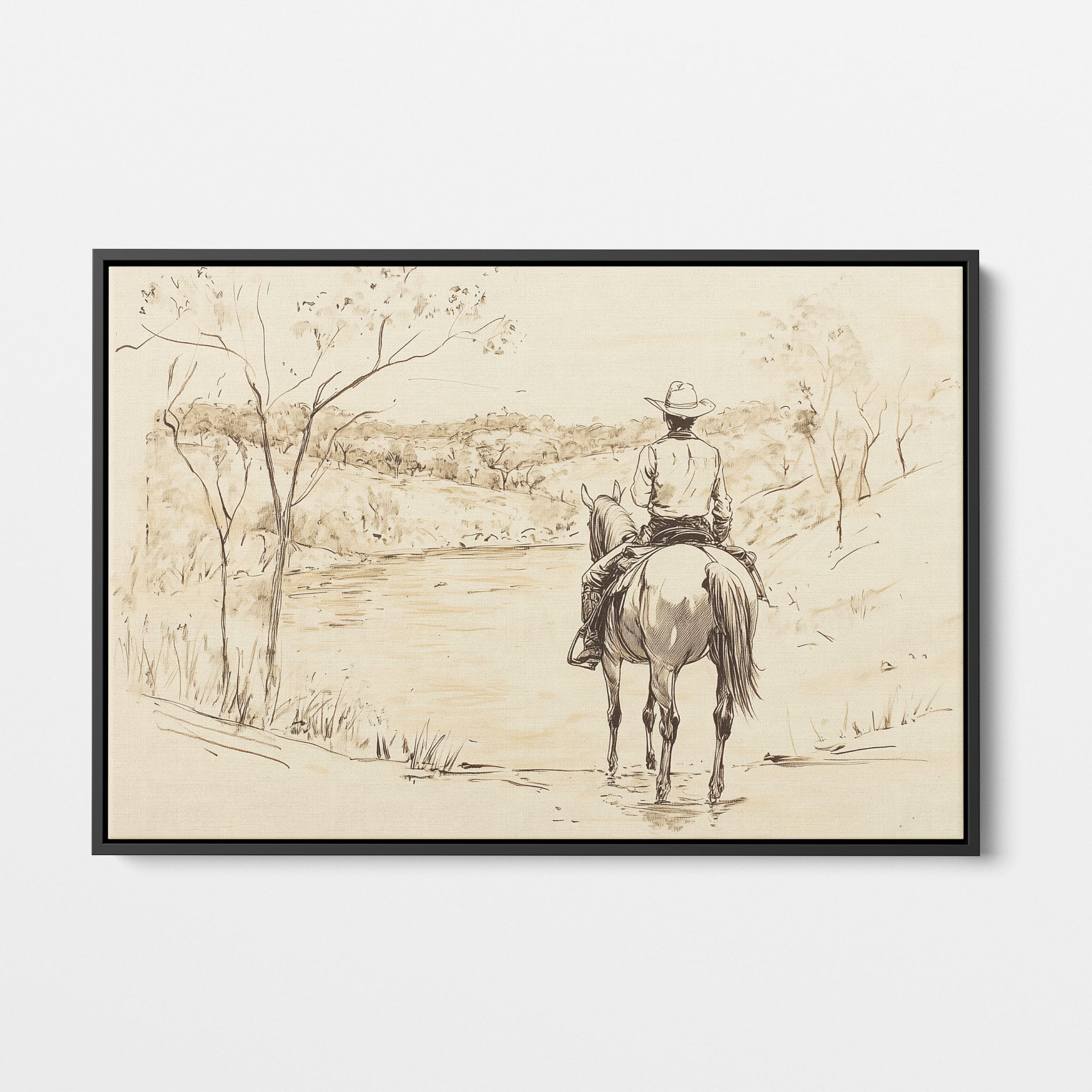 This evocative drawing portrays a lone cowboy on horseback, gazing over a serene lakeside landscape. The fluid lines and subtle shading capture the peaceful ambiance and timeless essence of the American West. With its minimalist style, the drawing emphasizes simplicity while conveying deep emotion and narrative. Perfect for Western art enthusiasts, this artwork adds a rustic charm to any space. Ideal for collectors seeking a classic yet understated piece, this drawing beautifully encapsulates the spirit of solitude and reflection. Enhance your collection with this stunning depiction of cowboy life and Western scenery.