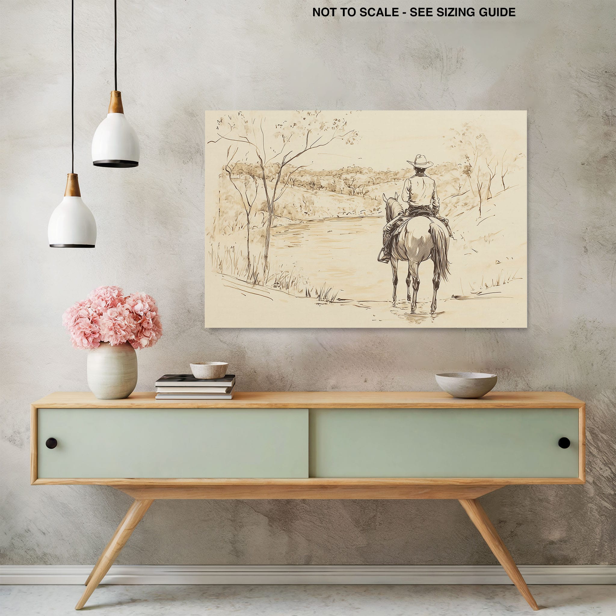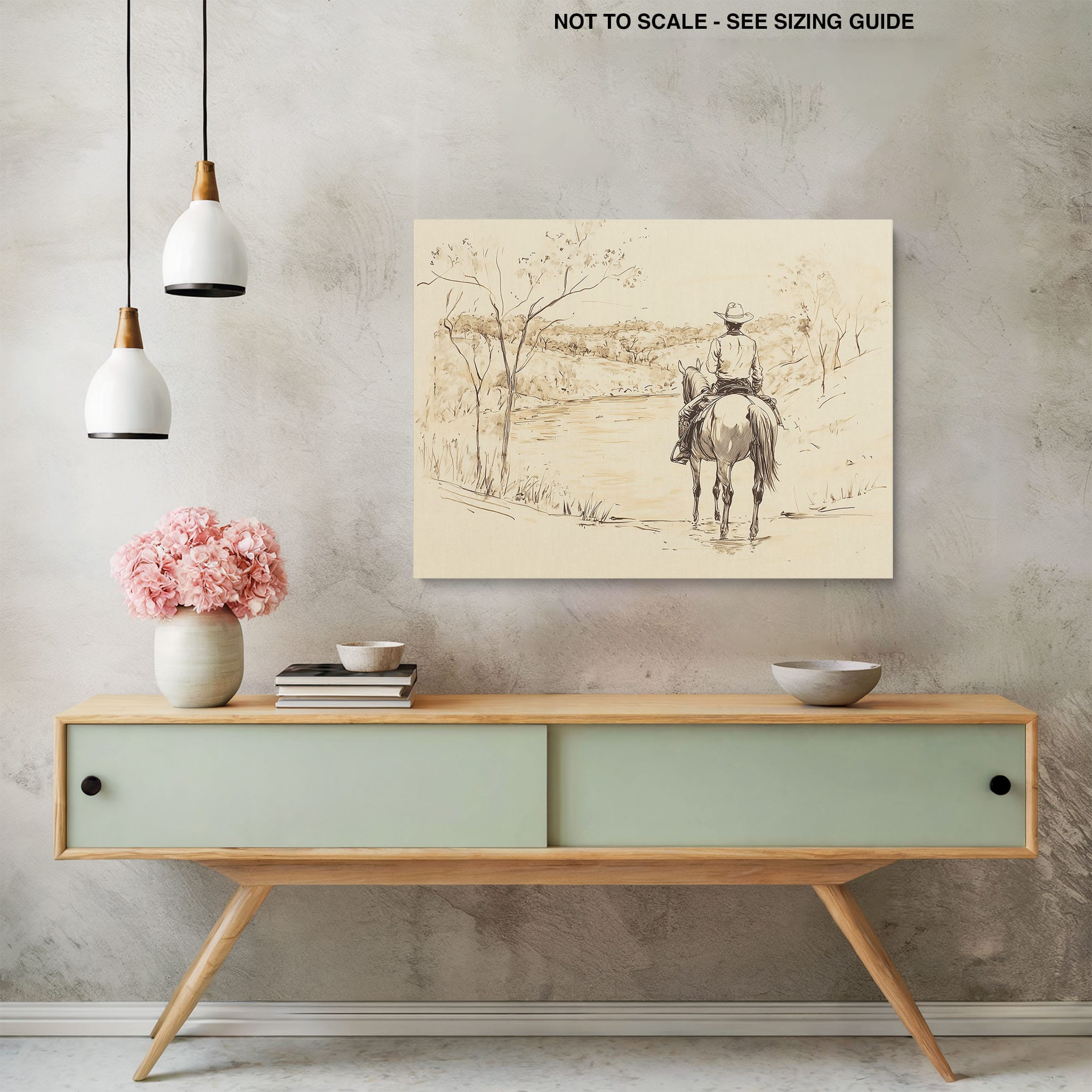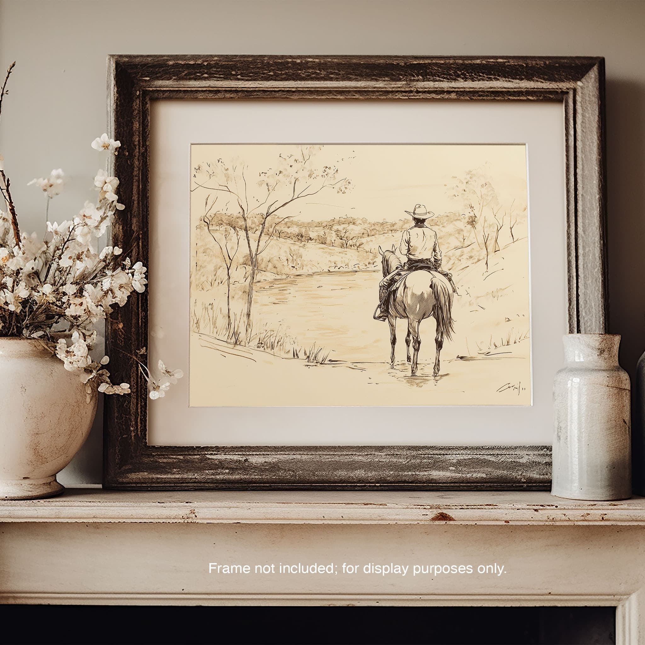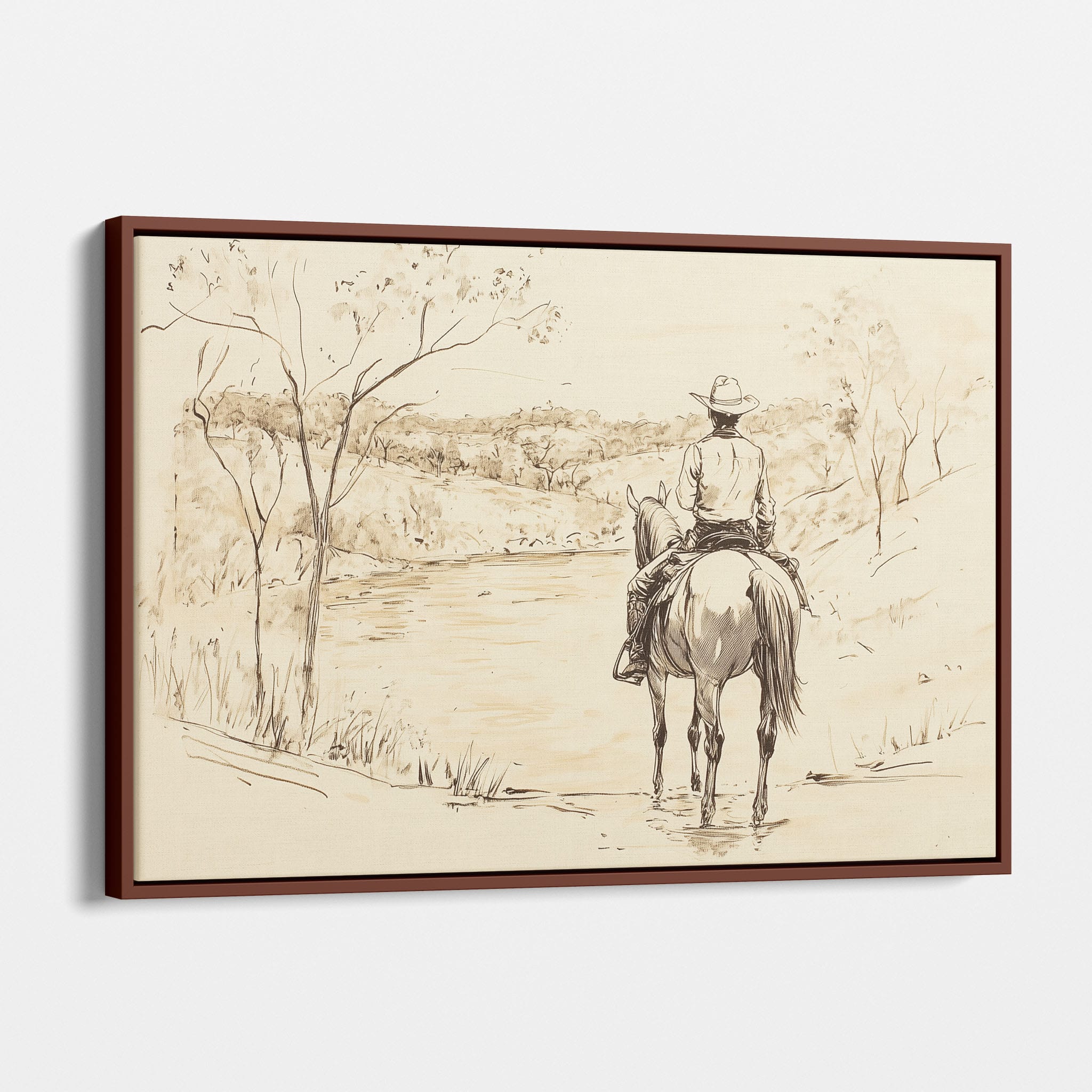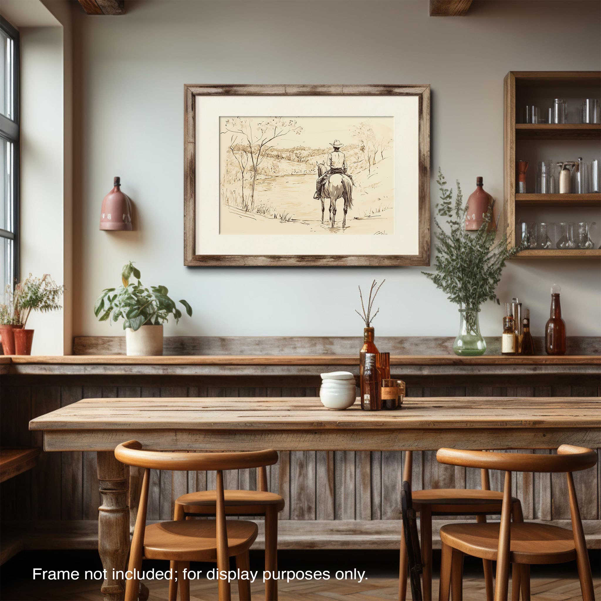 This evocative drawing portrays a lone cowboy on horseback, gazing over a serene lakeside landscape. The fluid lines and subtle shading capture the peaceful ambiance and timeless essence of the American West. With its minimalist style, the drawing emphasizes simplicity while conveying deep emotion and narrative. Perfect for Western art enthusiasts, this artwork adds a rustic charm to any space. Ideal for collectors seeking a classic yet understated piece, this drawing beautifully encapsulates the spirit of solitude and reflection. Enhance your collection with this stunning depiction of cowboy life and Western scenery.