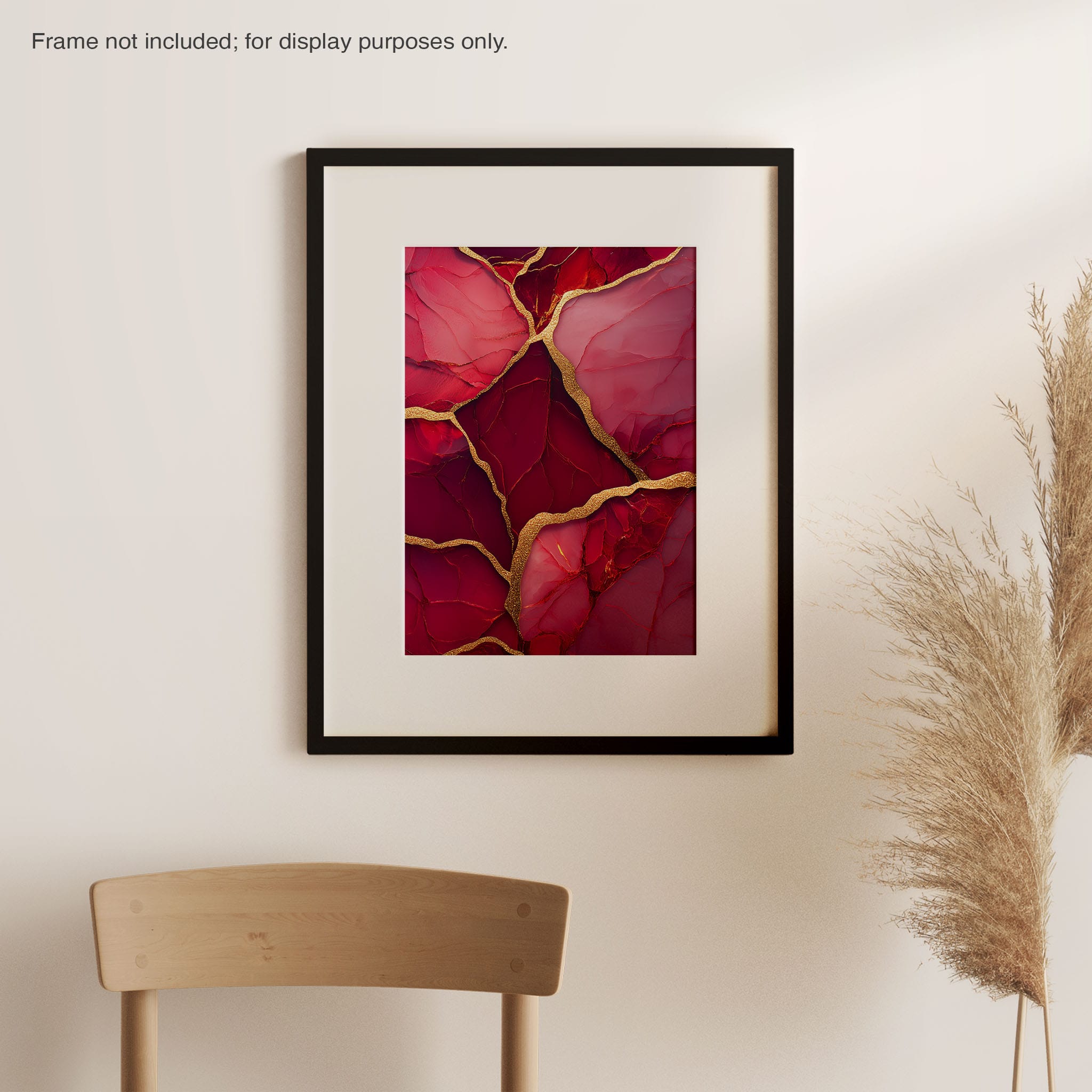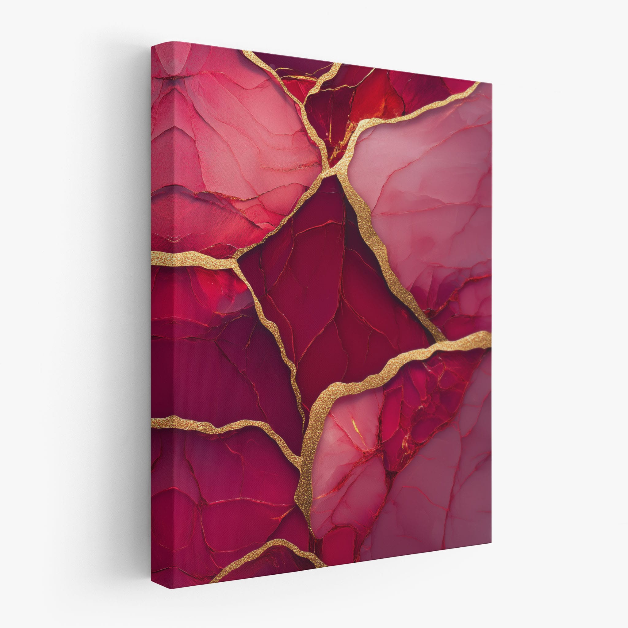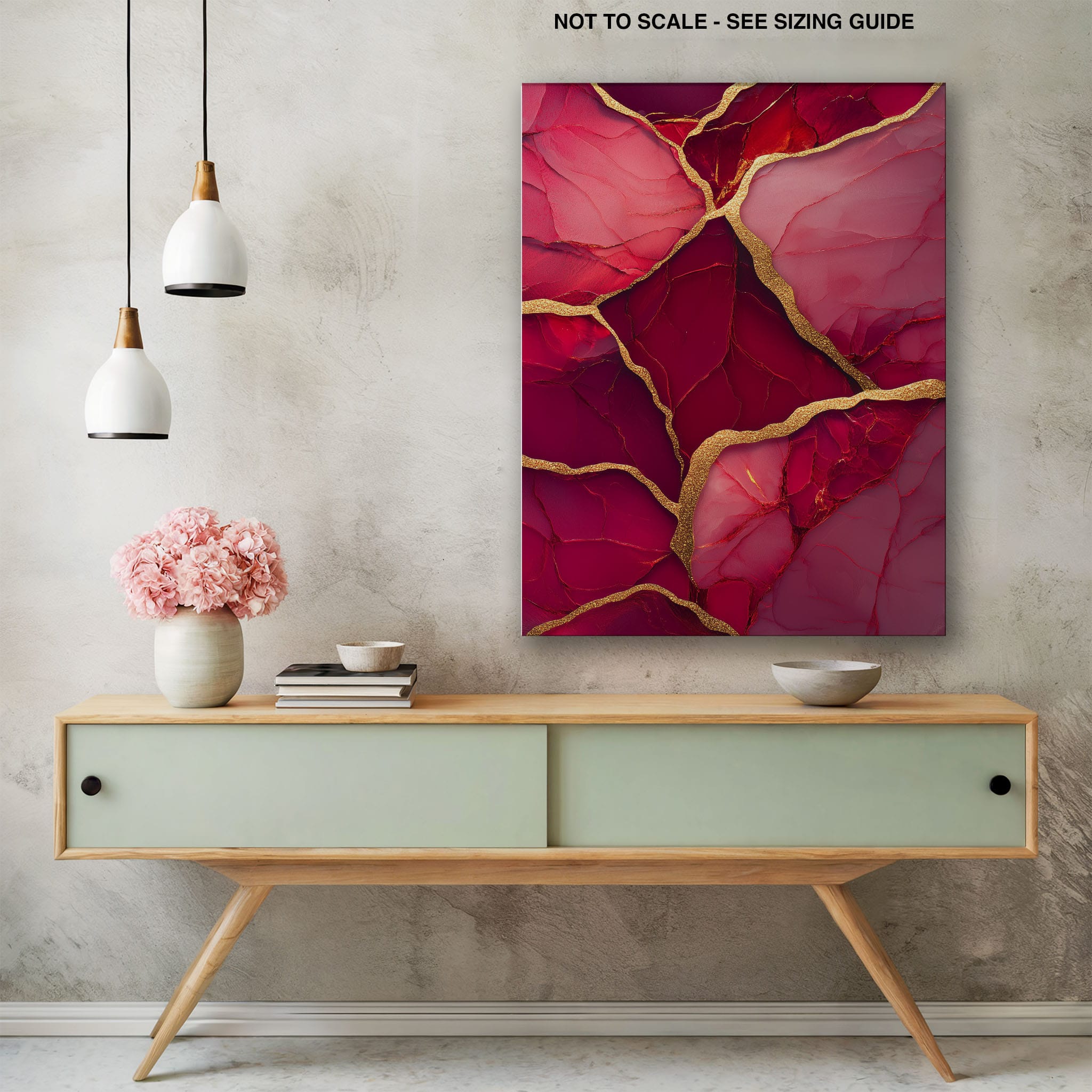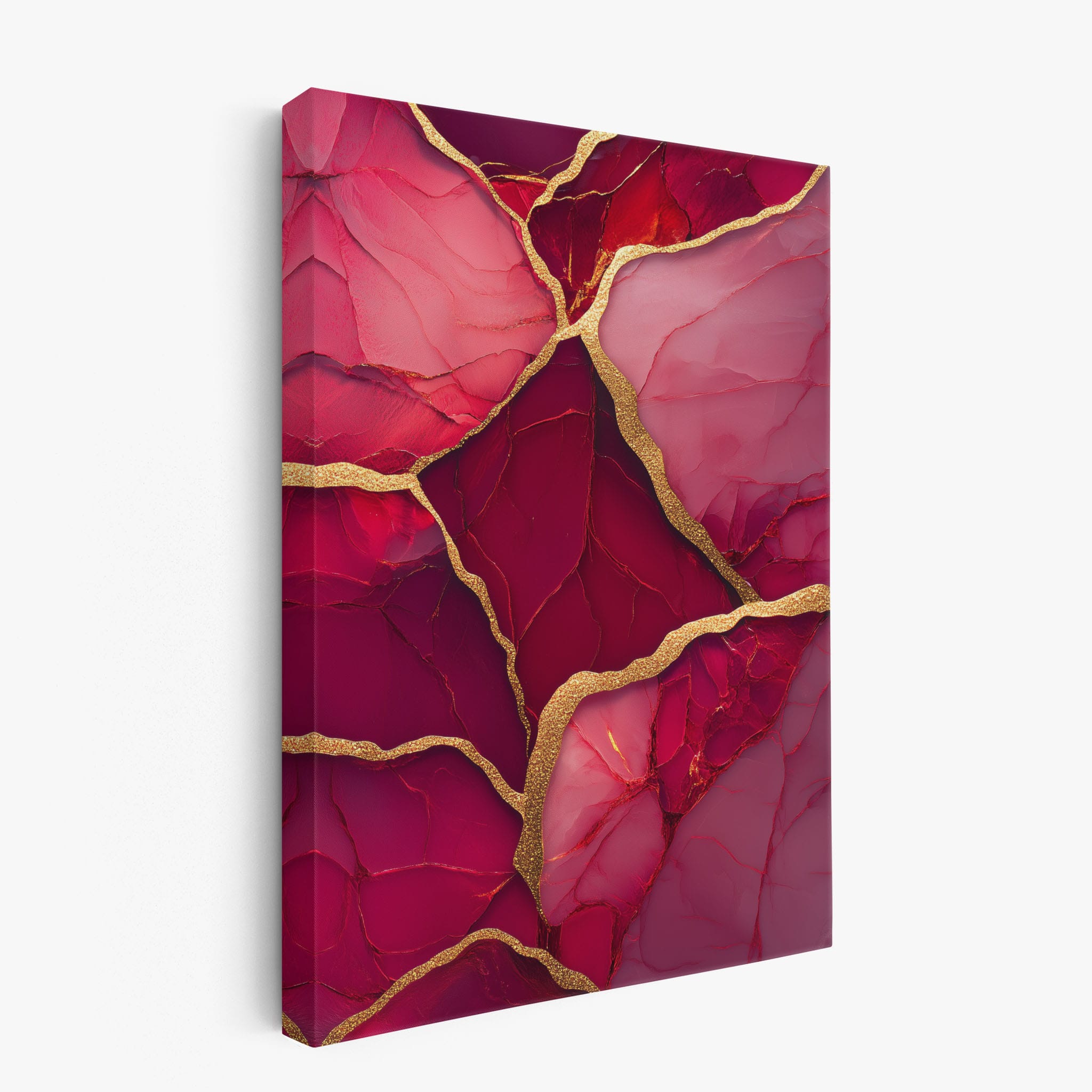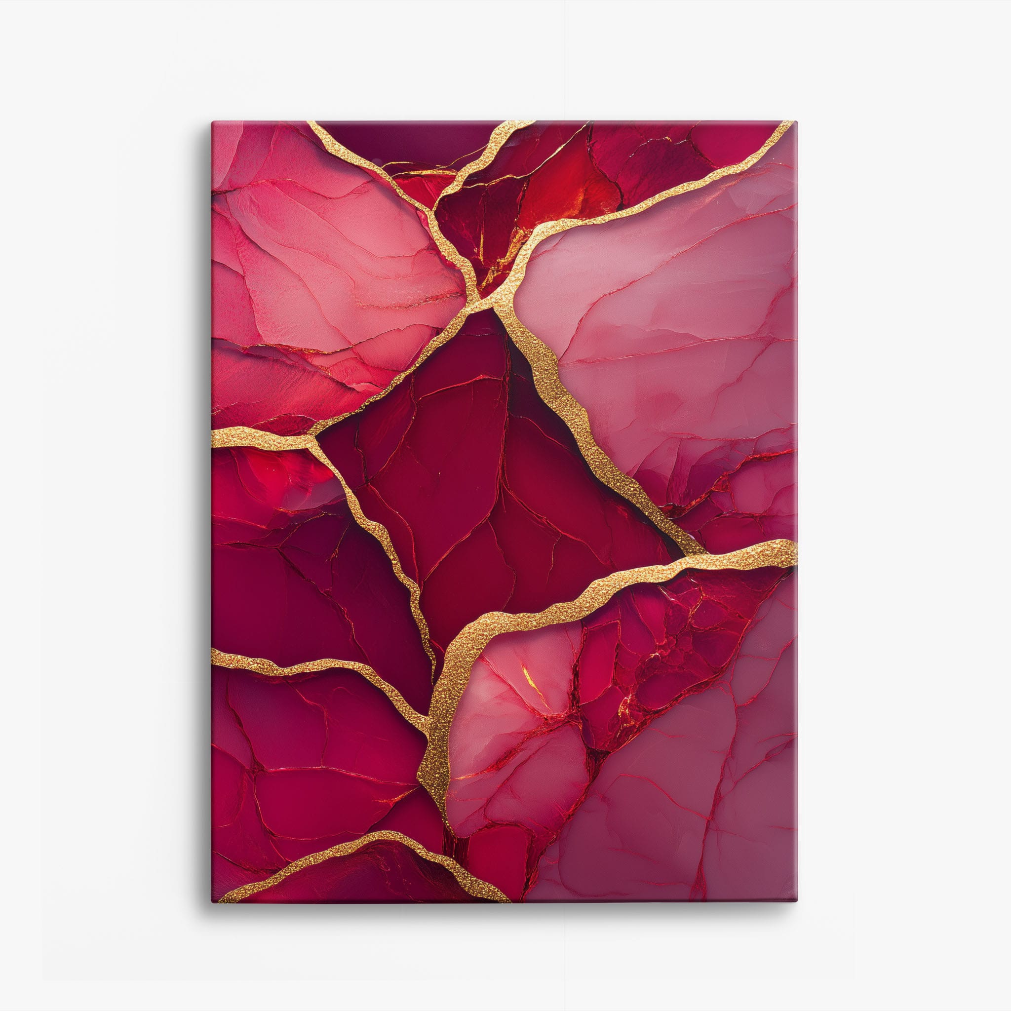 This mixed media masterpiece showcases a compelling abstract and modern design with geometric influences, employing deep crimson hues interlaced with striking golden lines. The luminous, gilded veins contrast starkly against the layers of rich red, creating a dynamic visual tension that captures the viewer's eye. This art piece appeals to those who value bold, vibrant colors and unique textural interplays. It makes a remarkable focal point in any room, offering both aesthetics and conversation. Elevate your space with this captivating work of art.