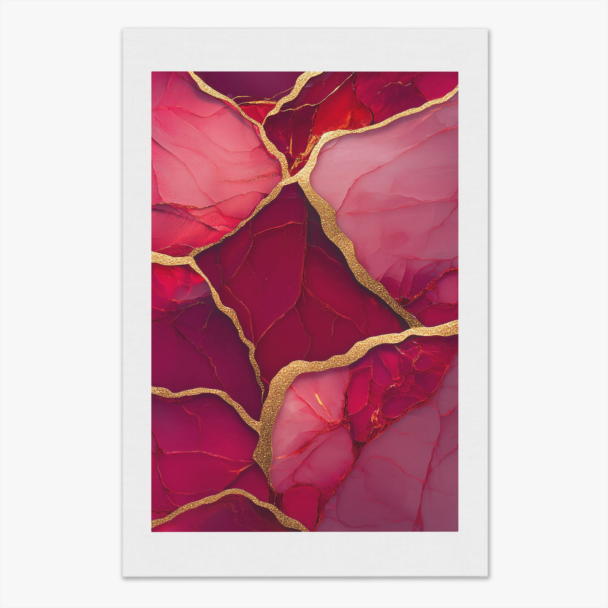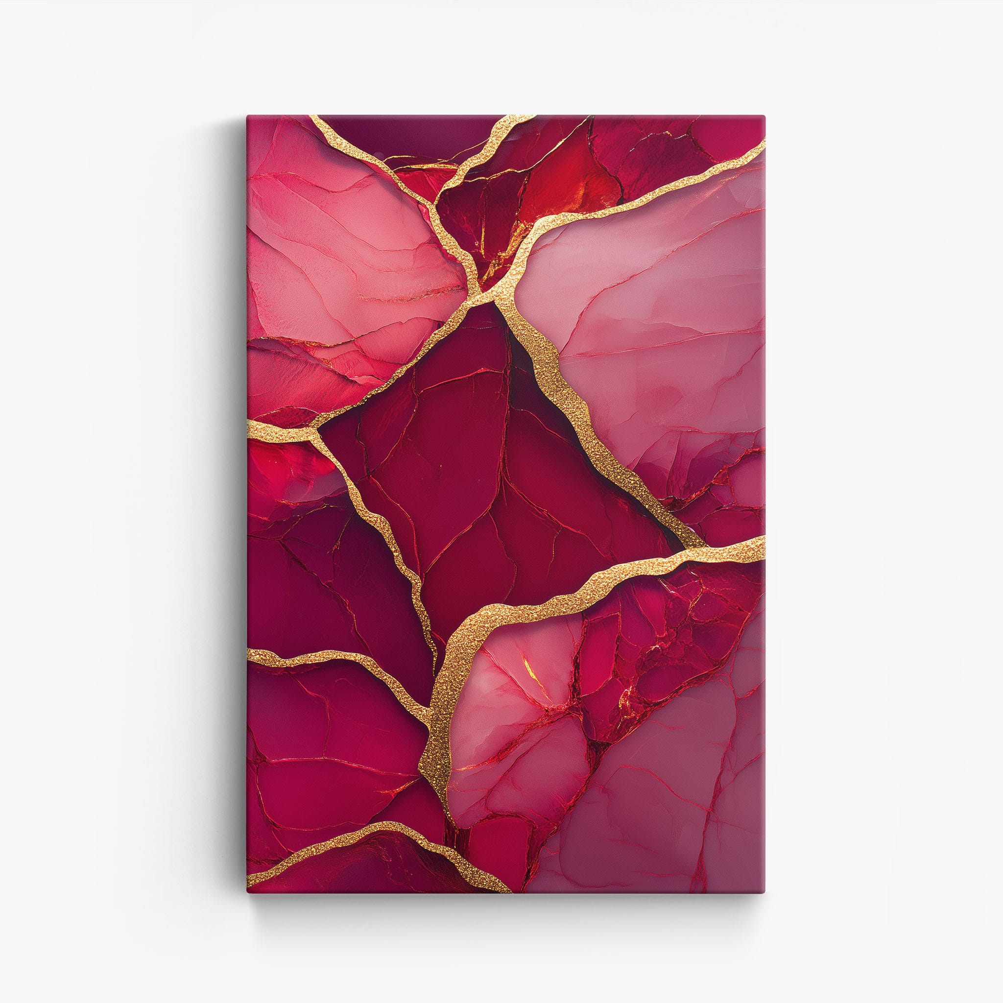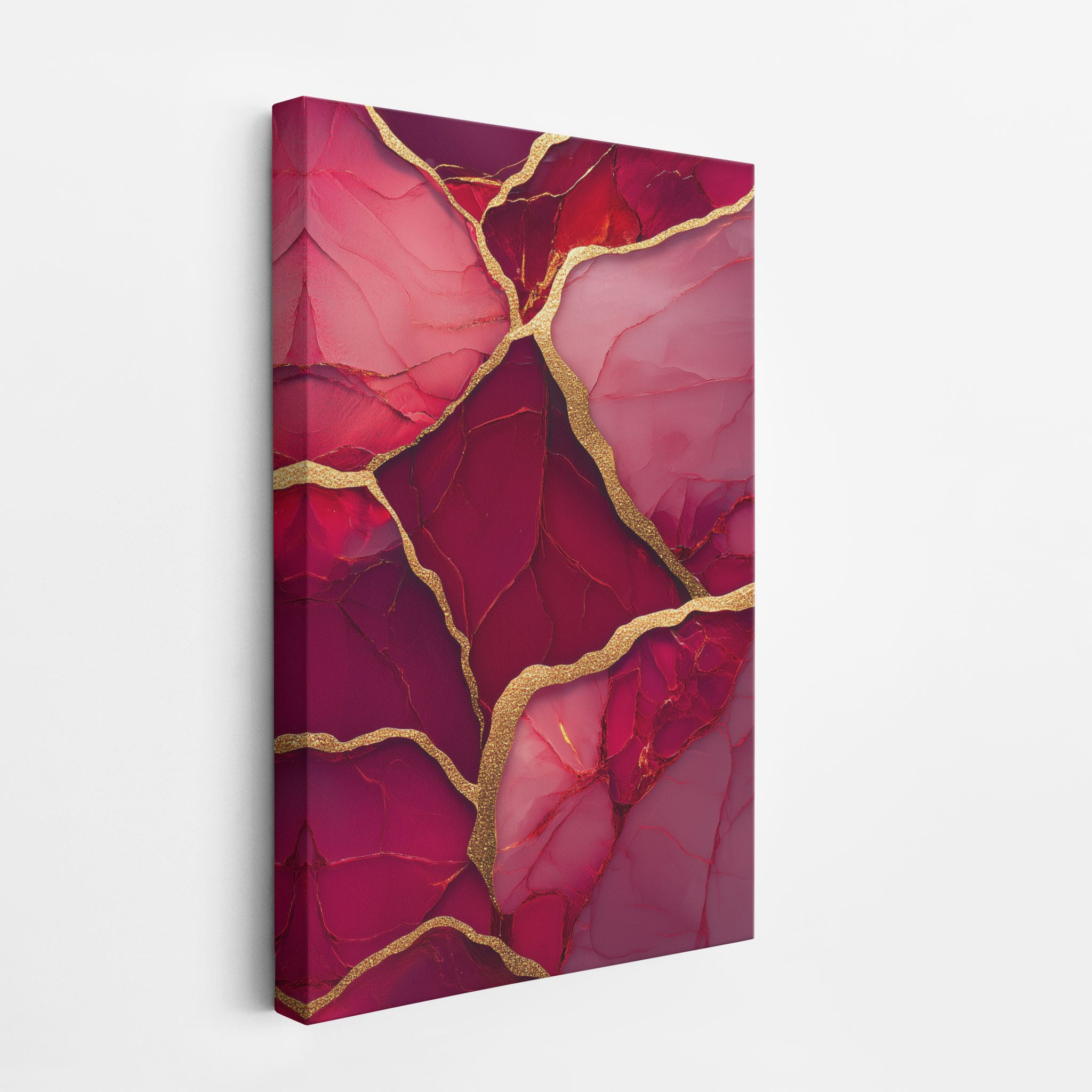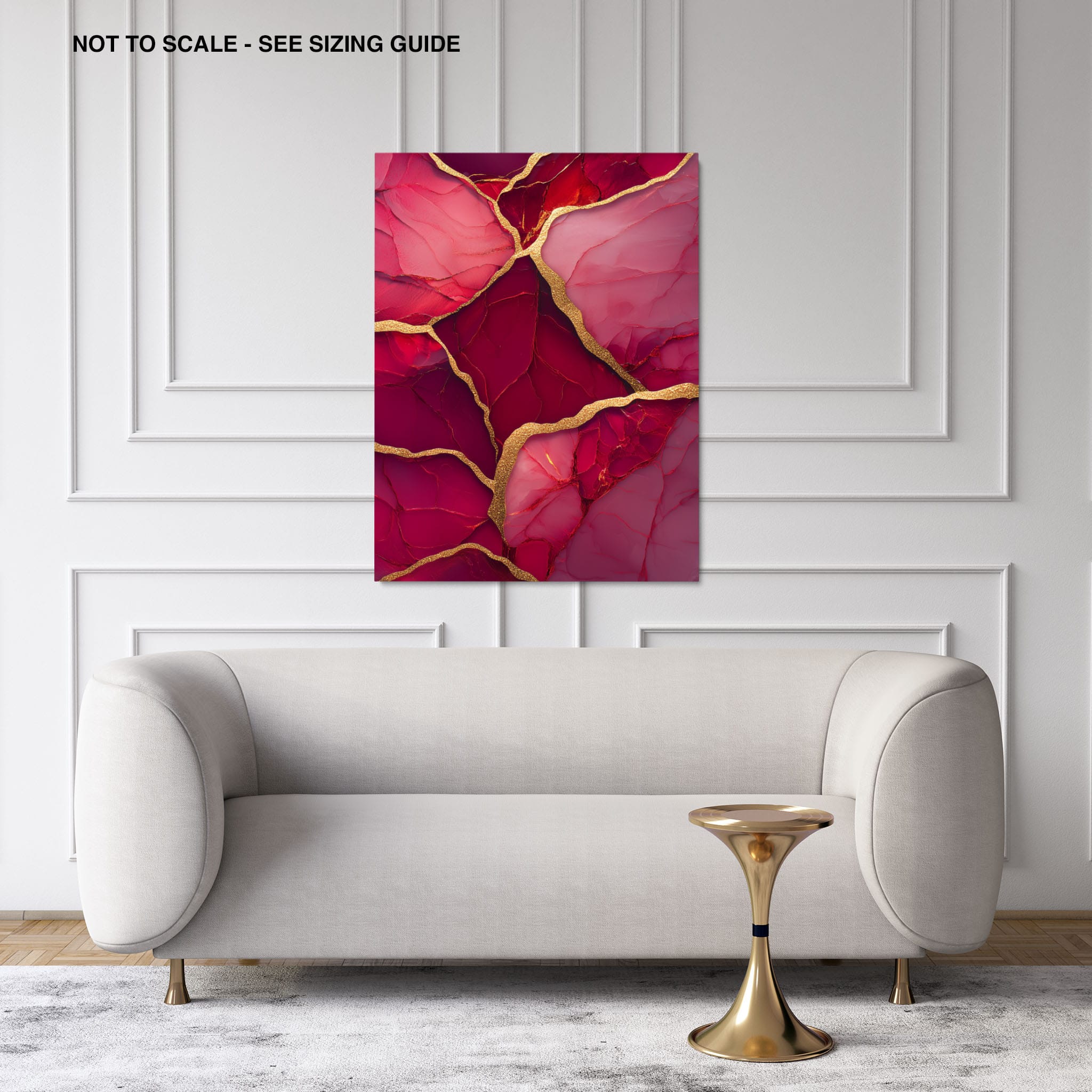 This mixed media masterpiece showcases a compelling abstract and modern design with geometric influences, employing deep crimson hues interlaced with striking golden lines. The luminous, gilded veins contrast starkly against the layers of rich red, creating a dynamic visual tension that captures the viewer's eye. This art piece appeals to those who value bold, vibrant colors and unique textural interplays. It makes a remarkable focal point in any room, offering both aesthetics and conversation. Elevate your space with this captivating work of art.