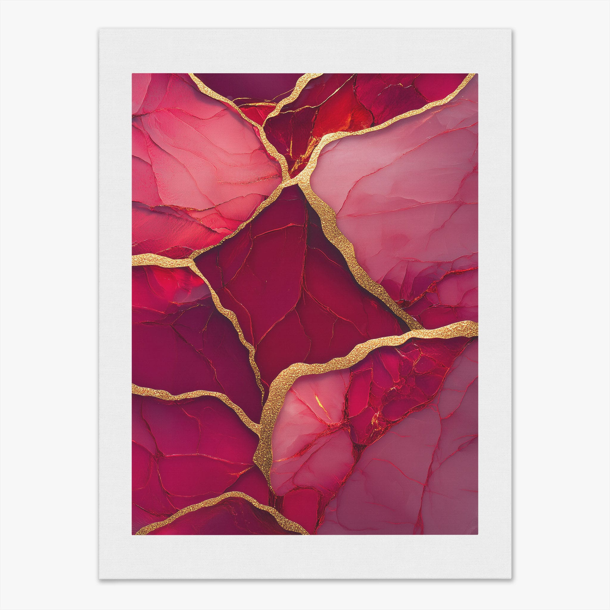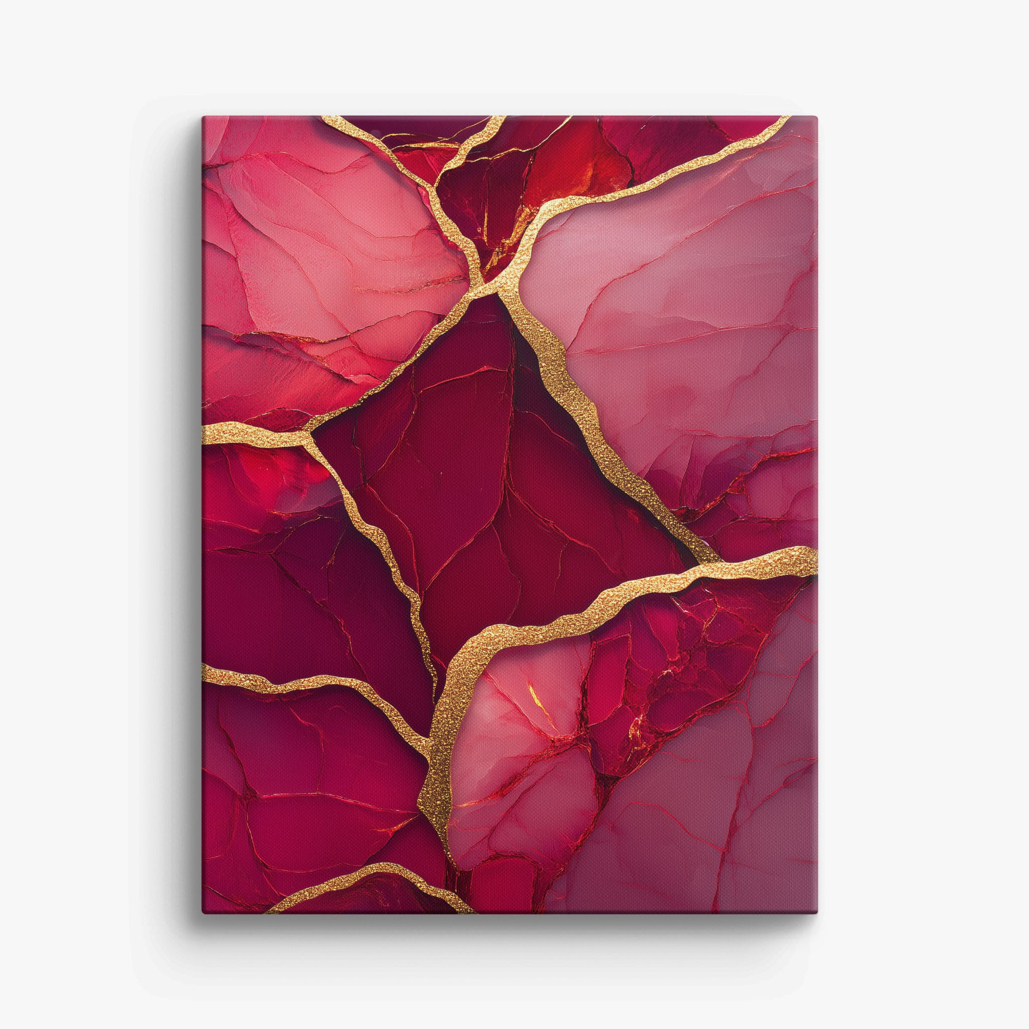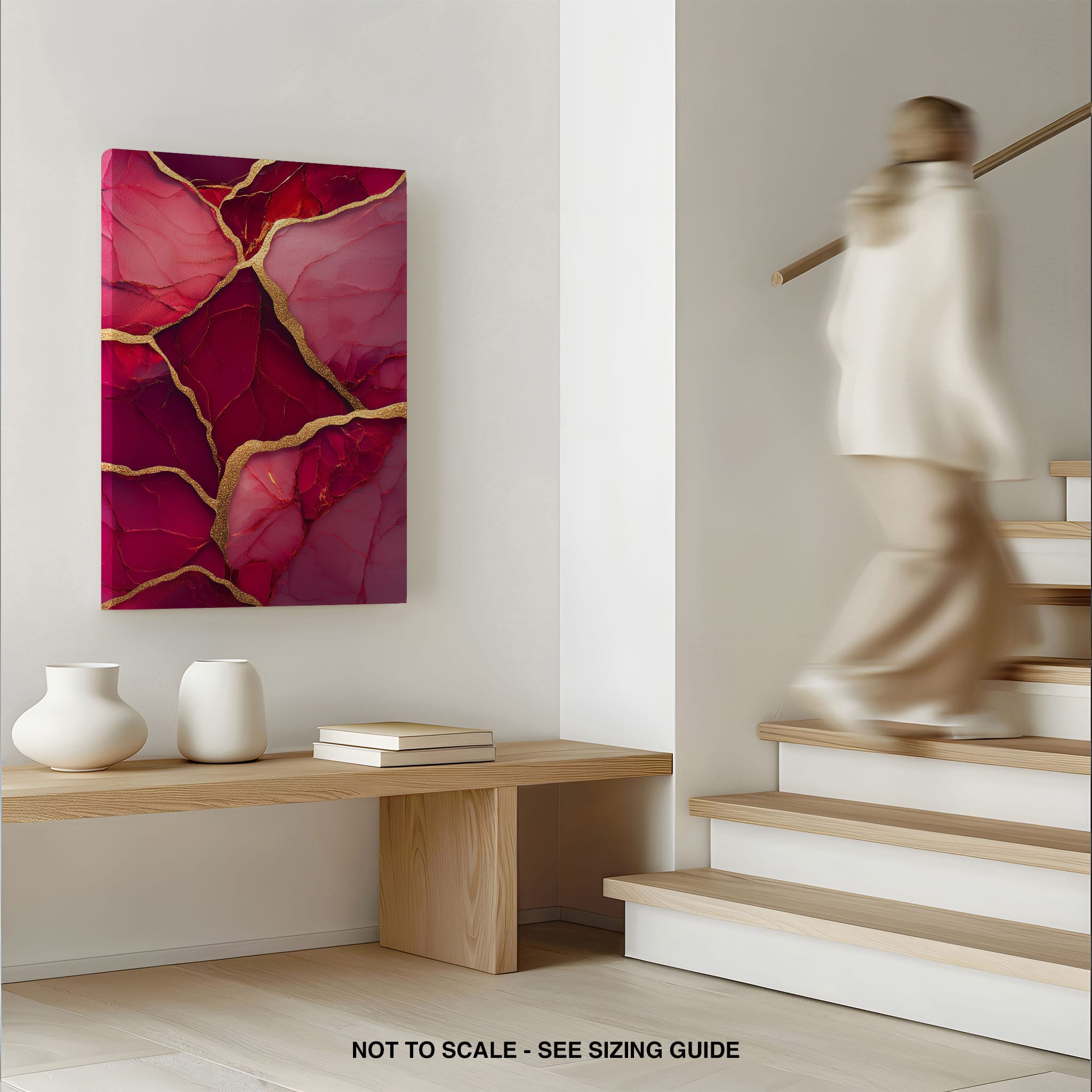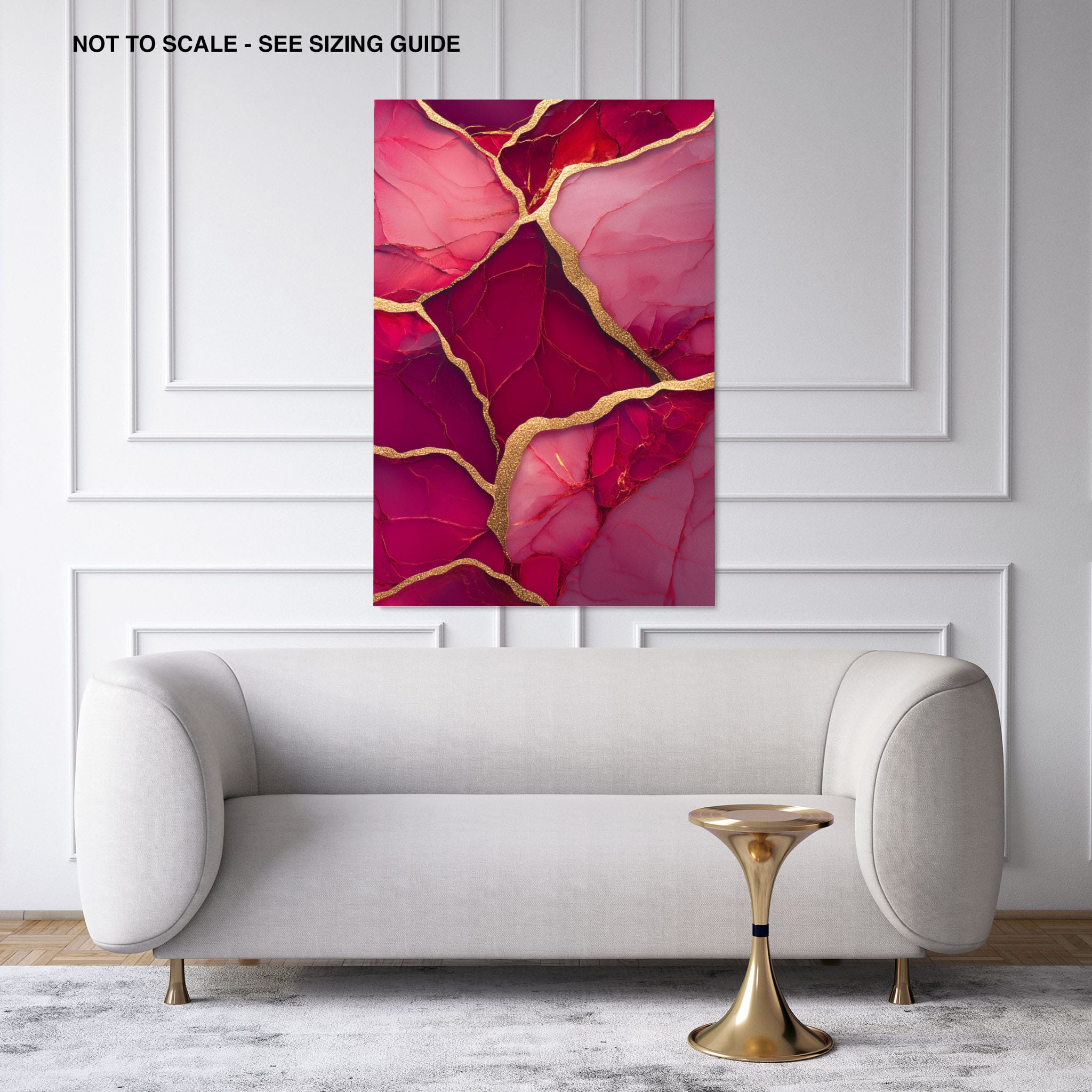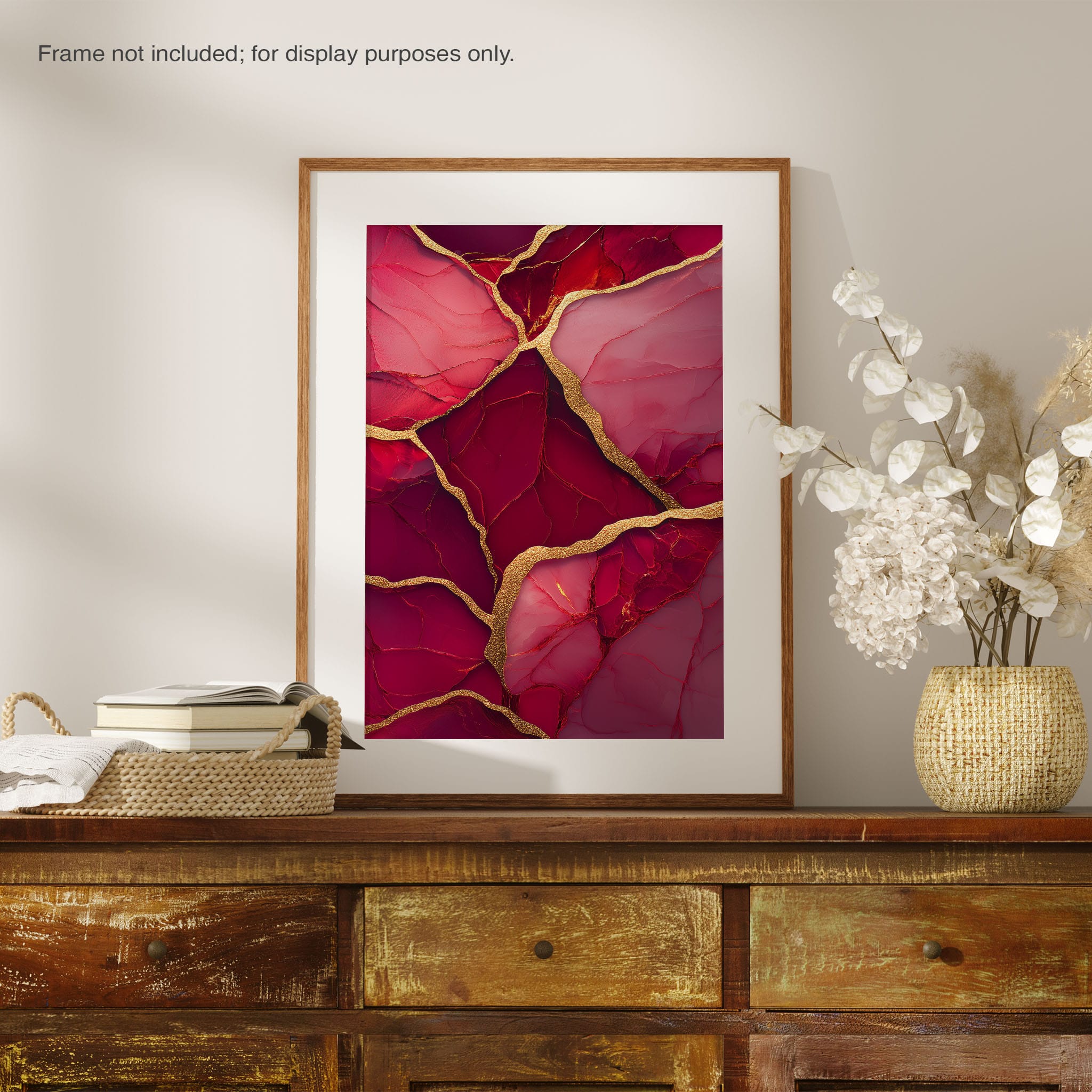 This mixed media masterpiece showcases a compelling abstract and modern design with geometric influences, employing deep crimson hues interlaced with striking golden lines. The luminous, gilded veins contrast starkly against the layers of rich red, creating a dynamic visual tension that captures the viewer's eye. This art piece appeals to those who value bold, vibrant colors and unique textural interplays. It makes a remarkable focal point in any room, offering both aesthetics and conversation. Elevate your space with this captivating work of art.