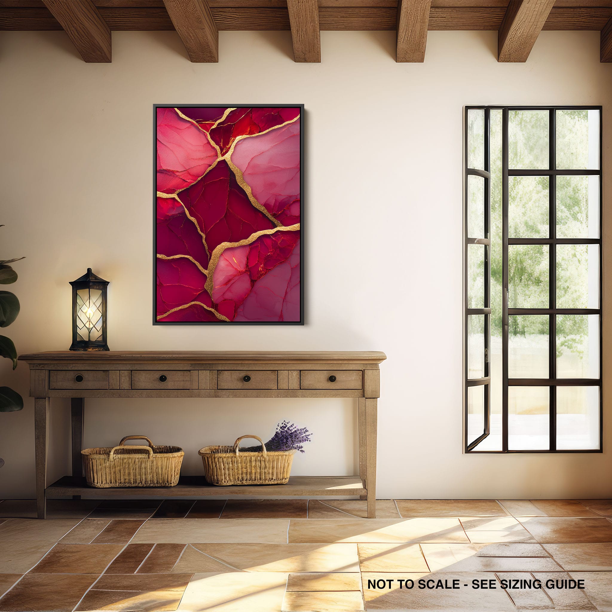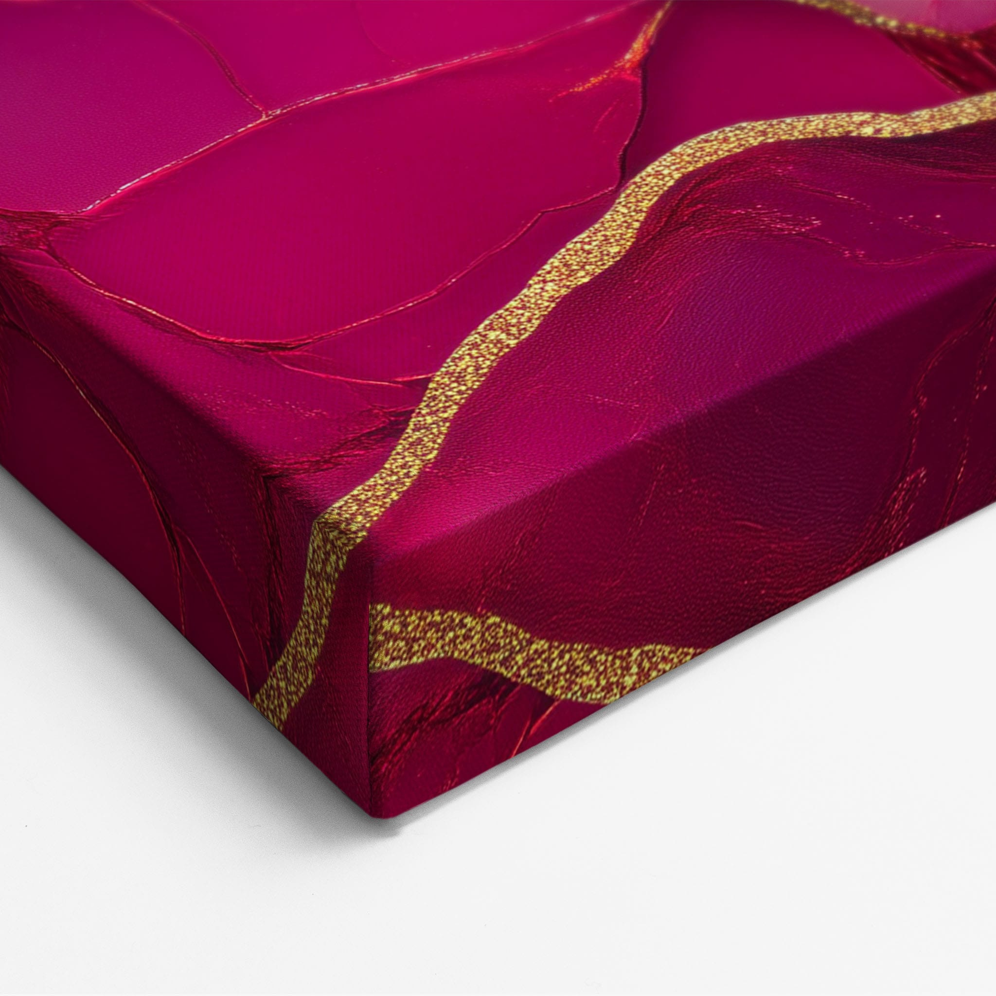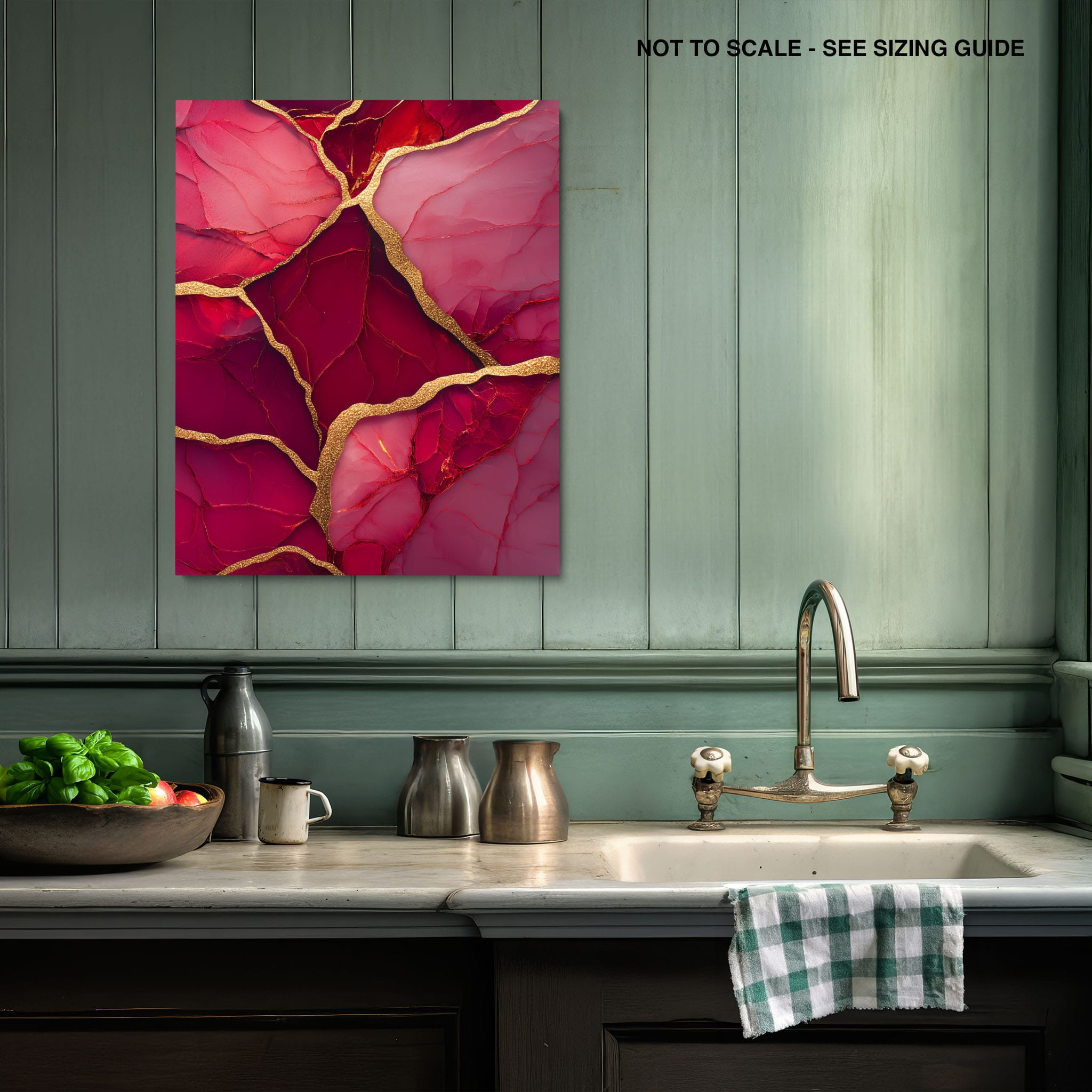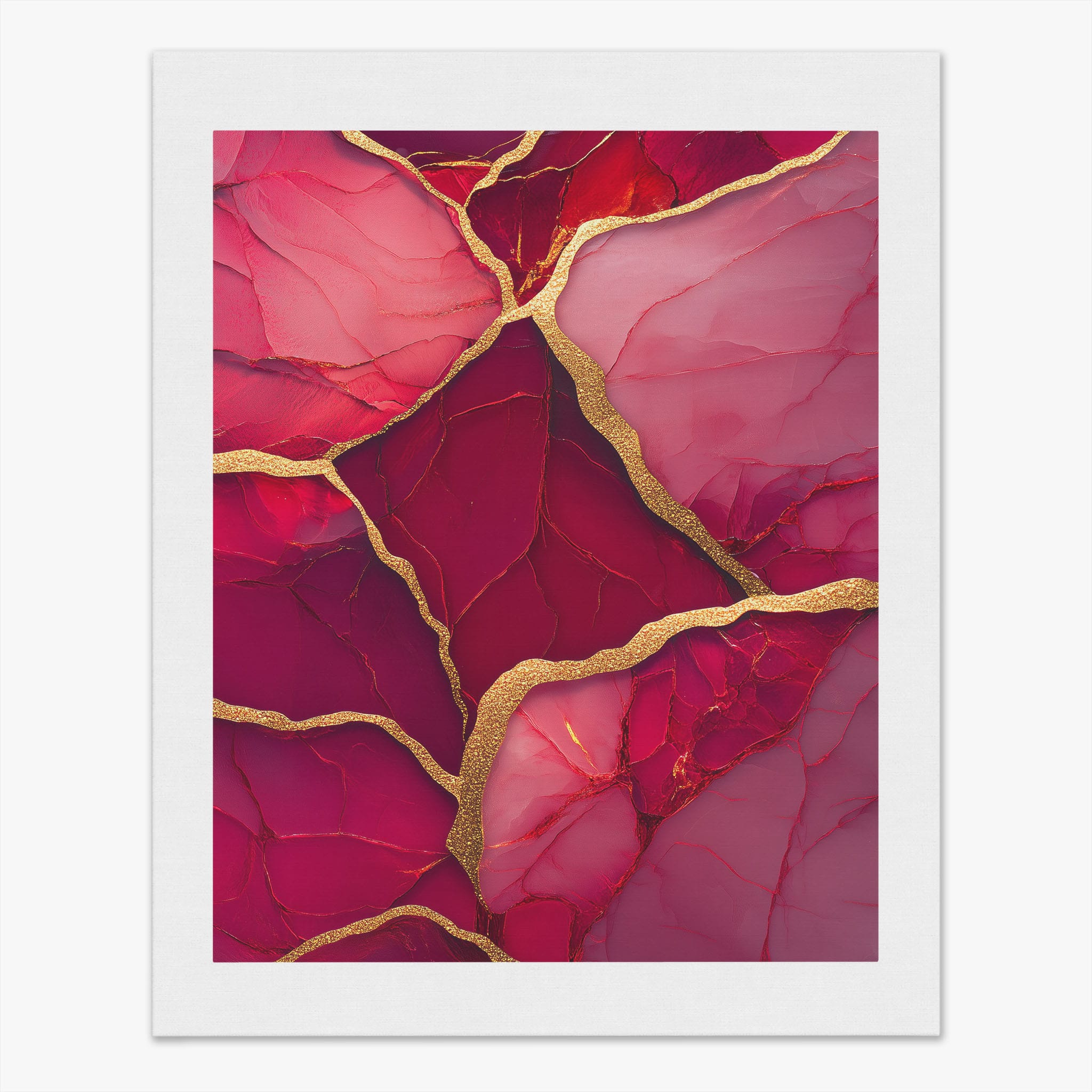 This mixed media masterpiece showcases a compelling abstract and modern design with geometric influences, employing deep crimson hues interlaced with striking golden lines. The luminous, gilded veins contrast starkly against the layers of rich red, creating a dynamic visual tension that captures the viewer's eye. This art piece appeals to those who value bold, vibrant colors and unique textural interplays. It makes a remarkable focal point in any room, offering both aesthetics and conversation. Elevate your space with this captivating work of art.