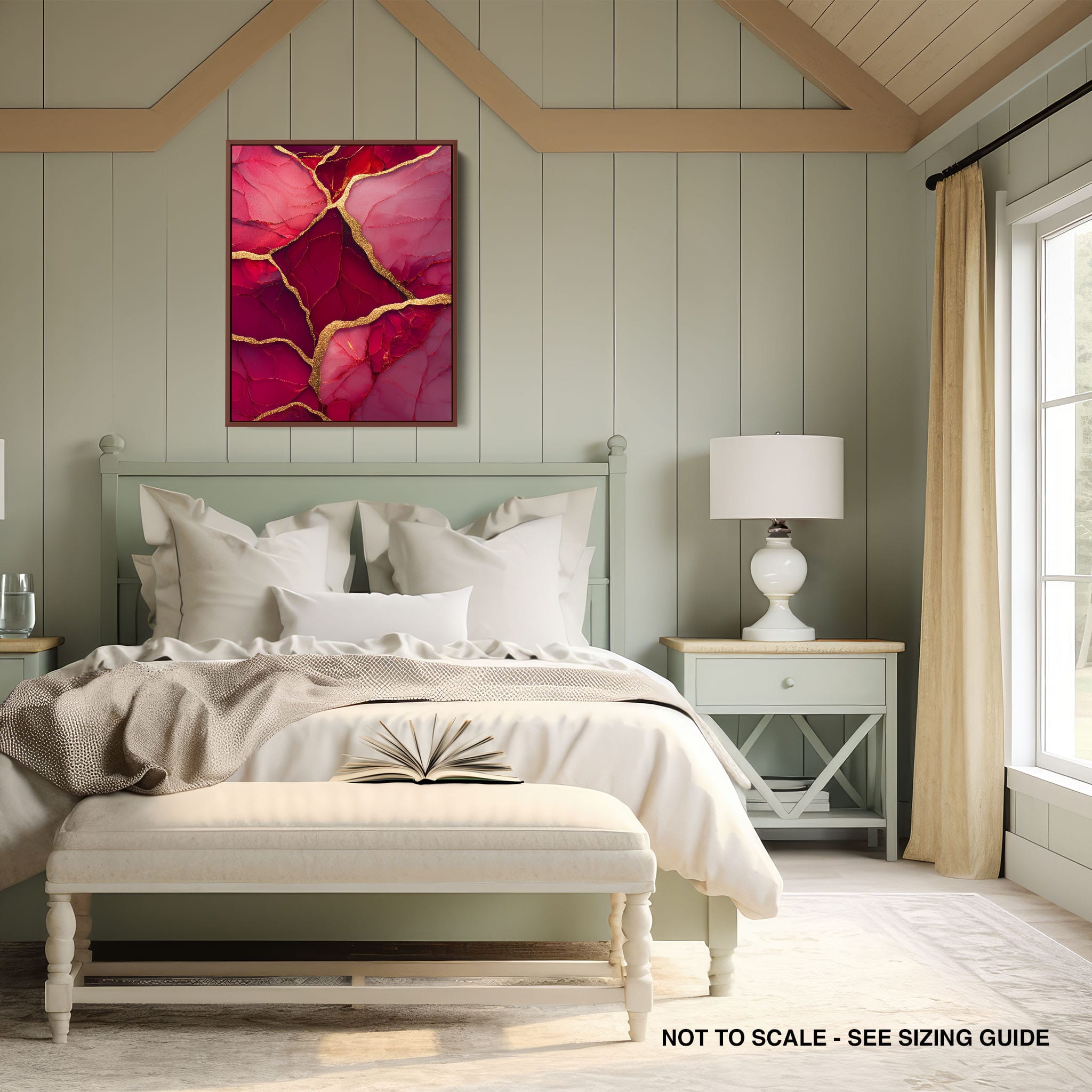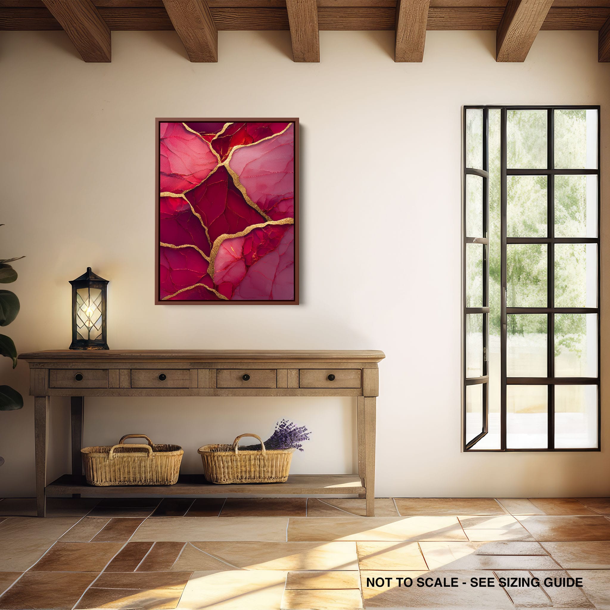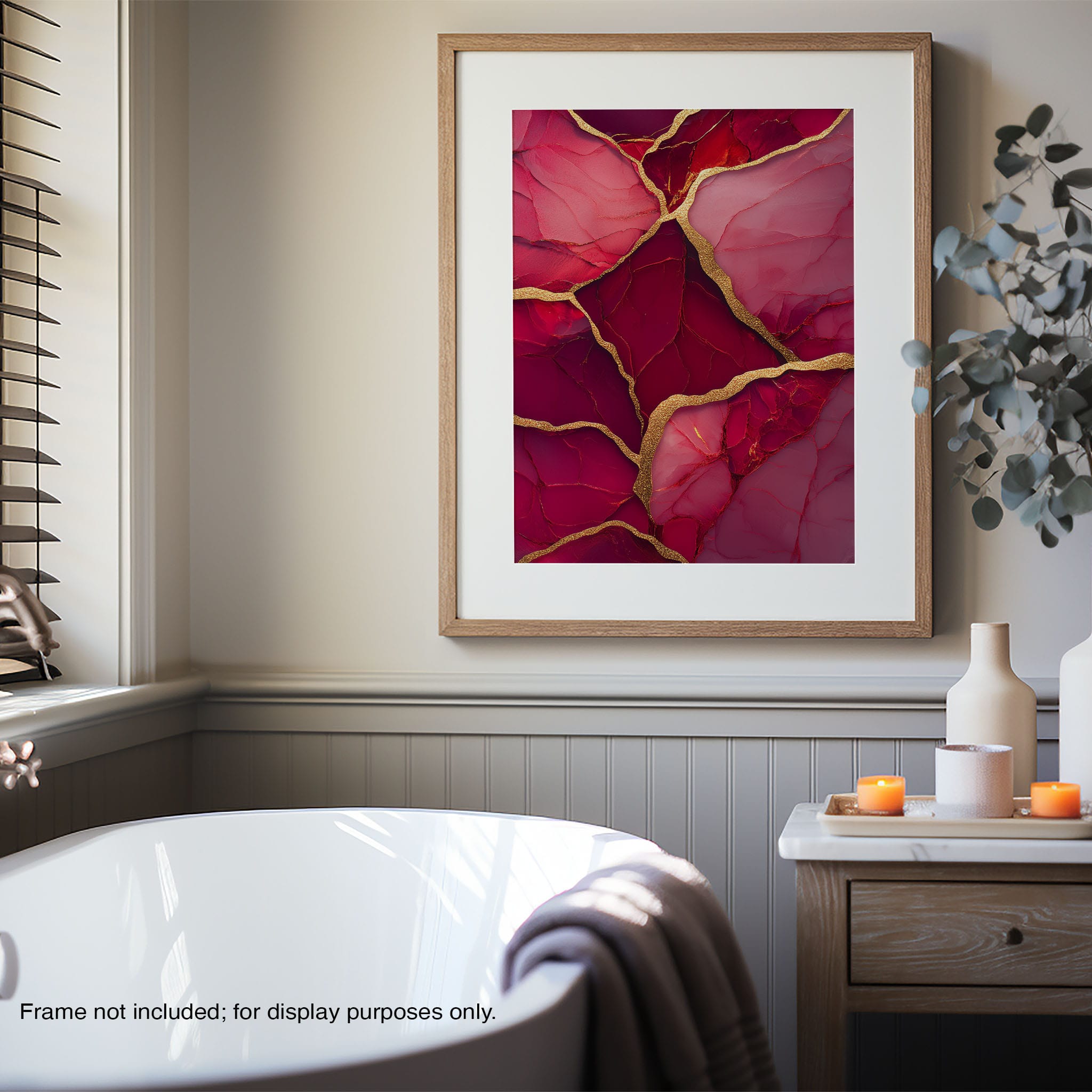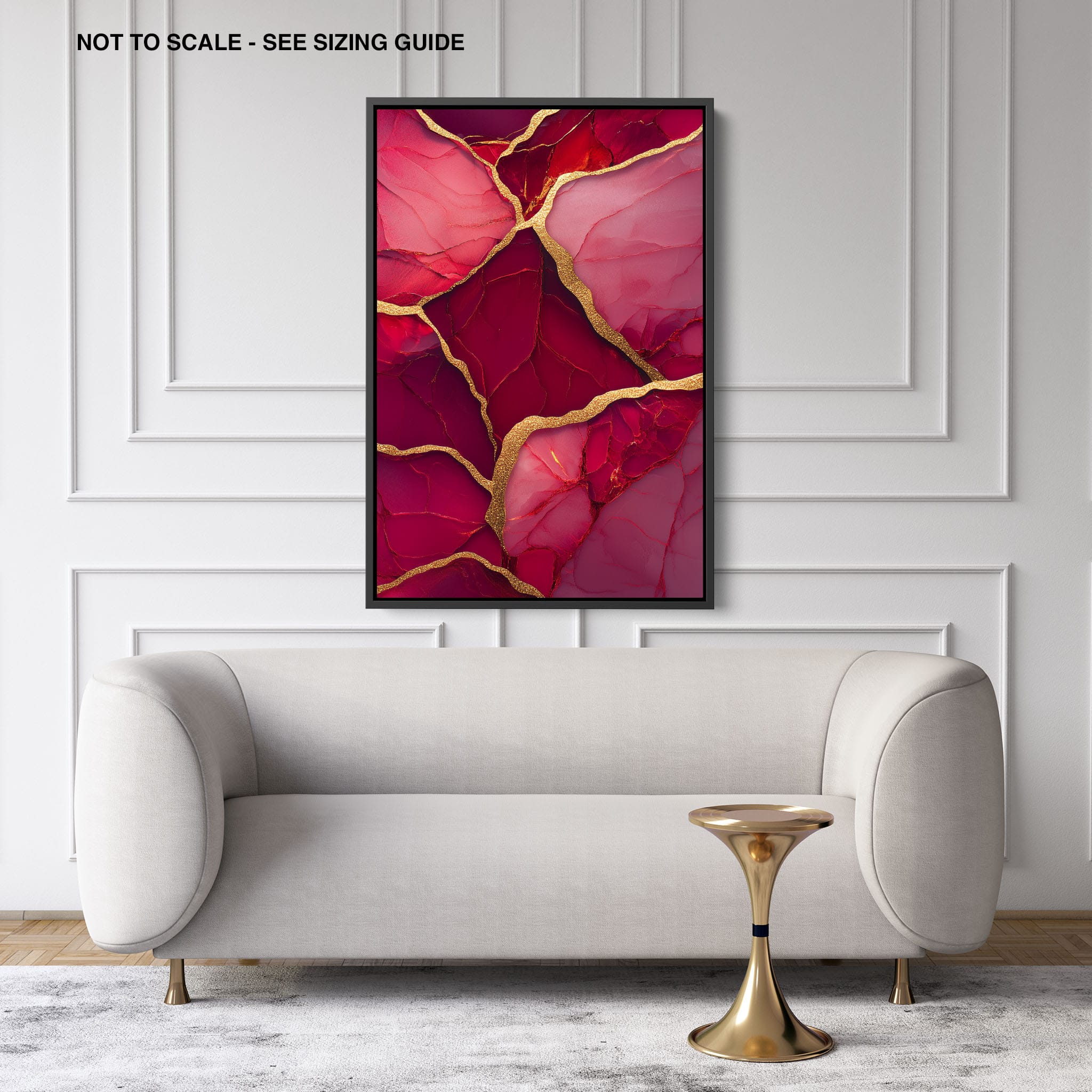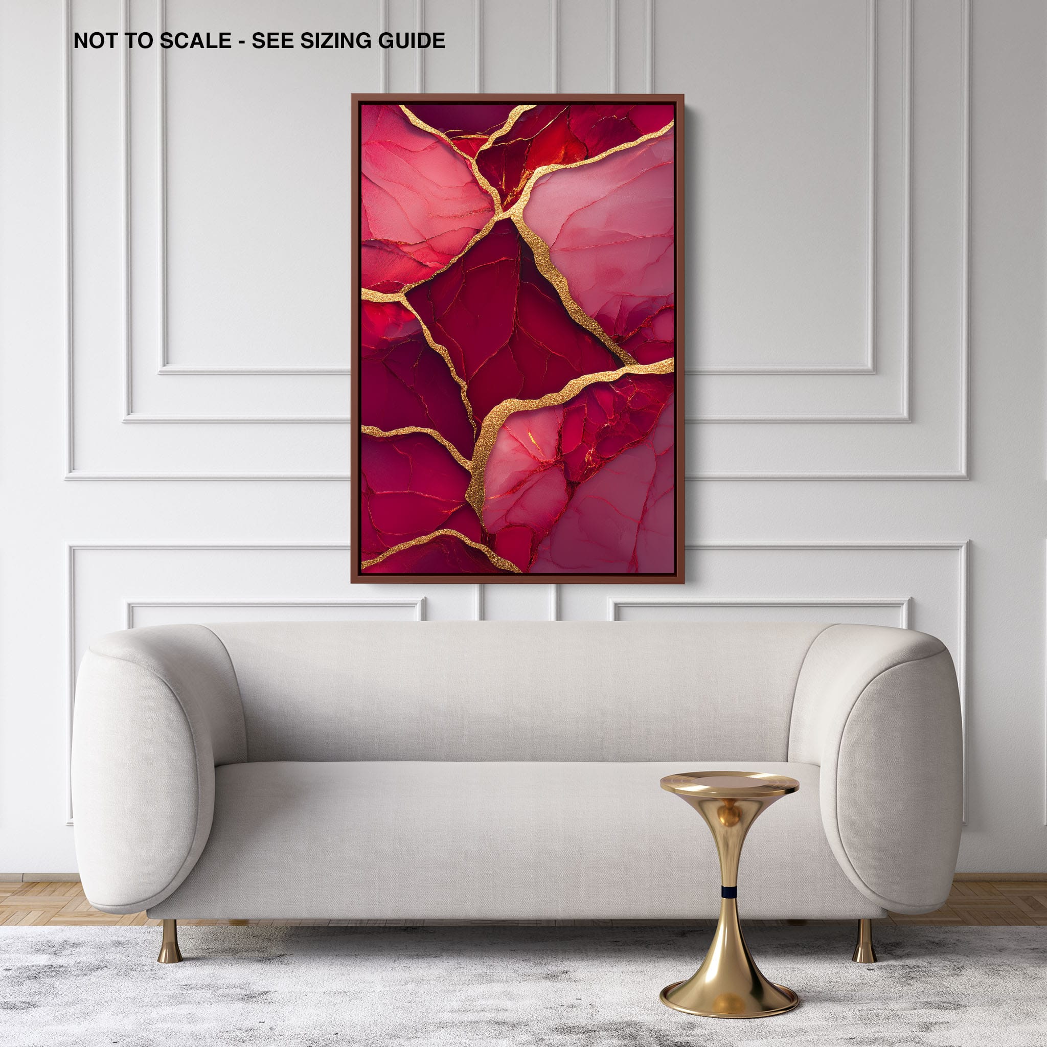 This mixed media masterpiece showcases a compelling abstract and modern design with geometric influences, employing deep crimson hues interlaced with striking golden lines. The luminous, gilded veins contrast starkly against the layers of rich red, creating a dynamic visual tension that captures the viewer's eye. This art piece appeals to those who value bold, vibrant colors and unique textural interplays. It makes a remarkable focal point in any room, offering both aesthetics and conversation. Elevate your space with this captivating work of art.