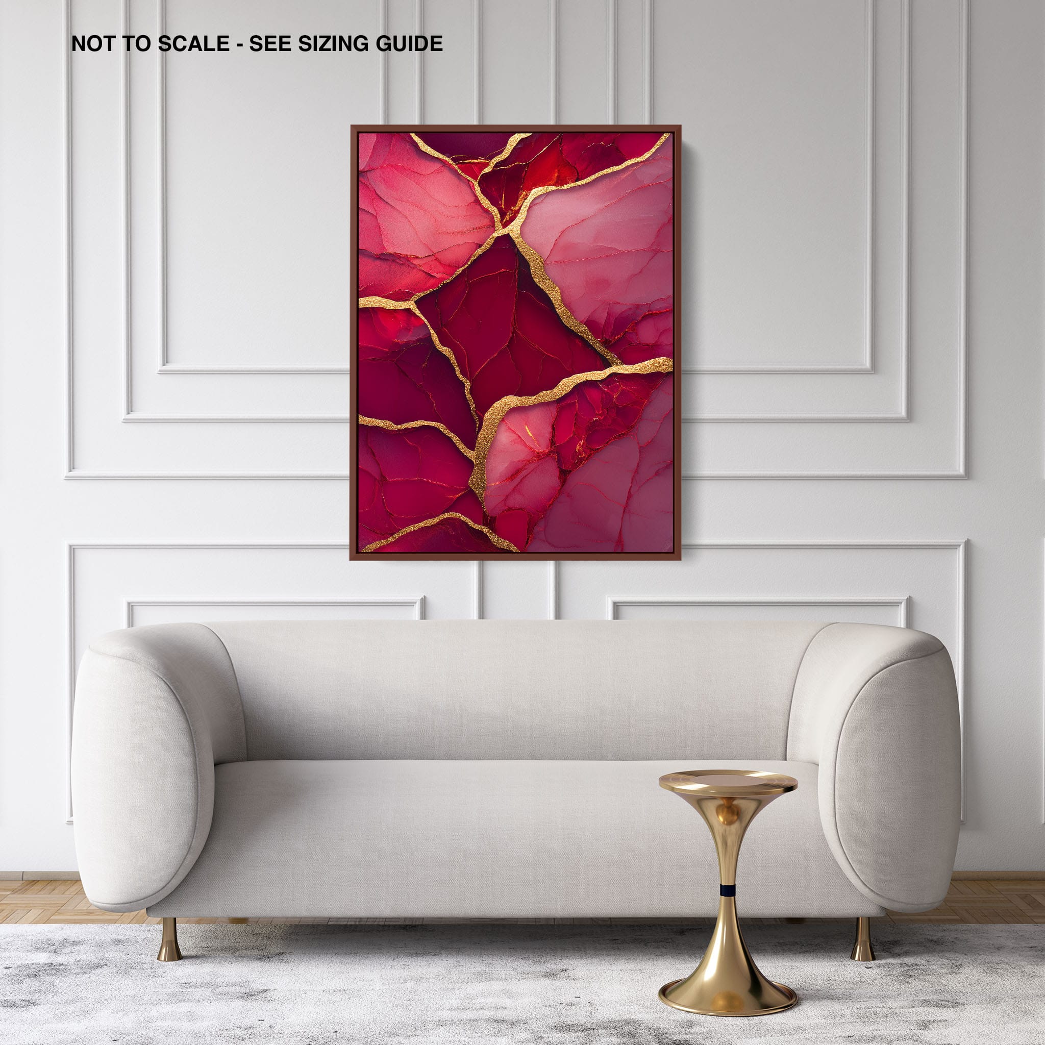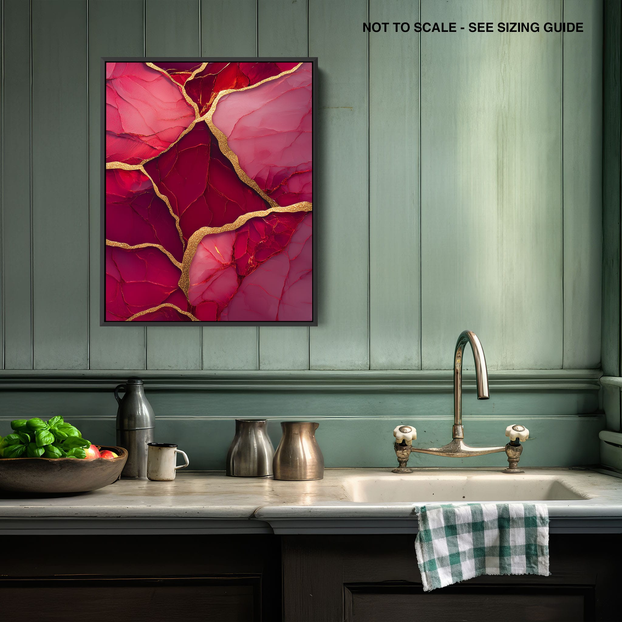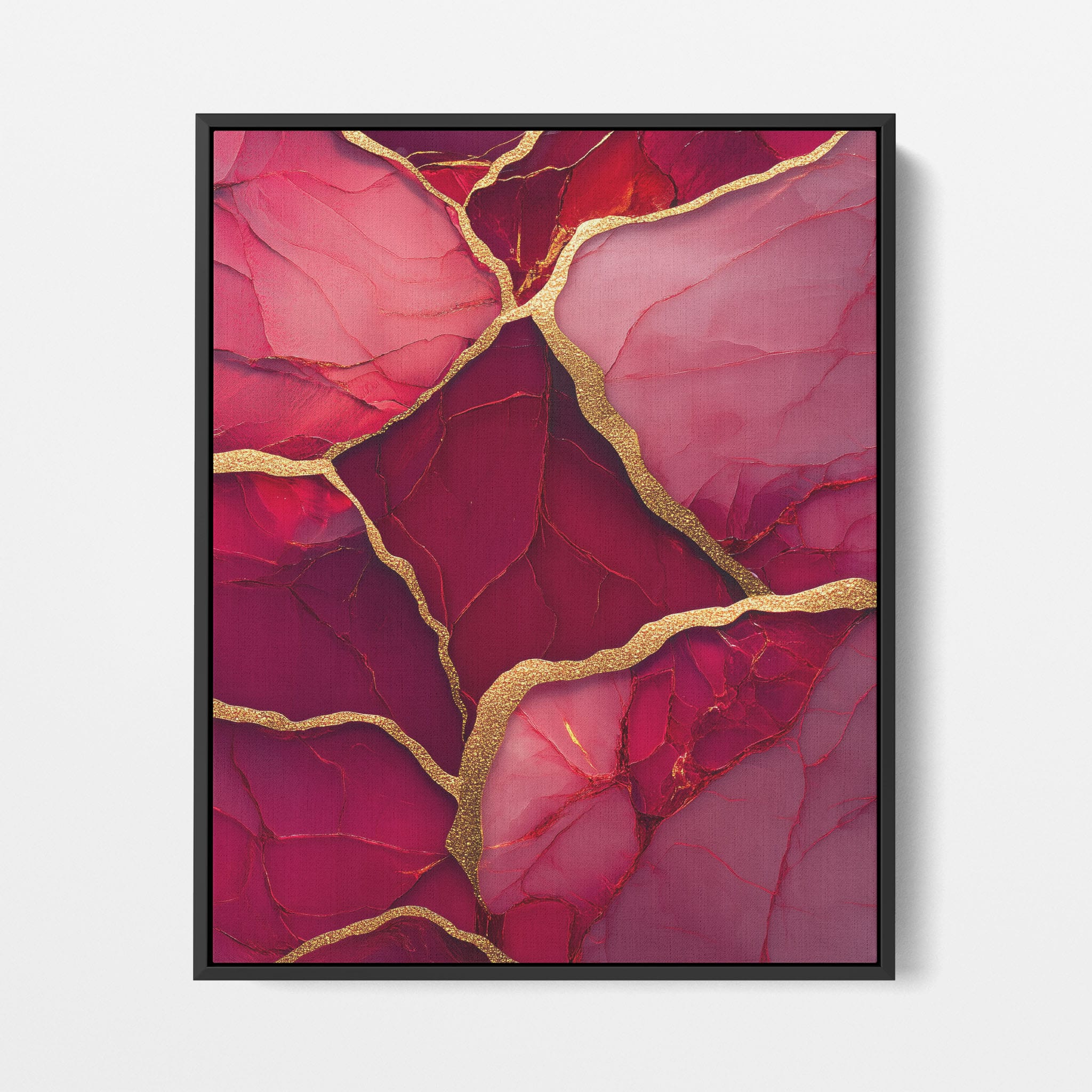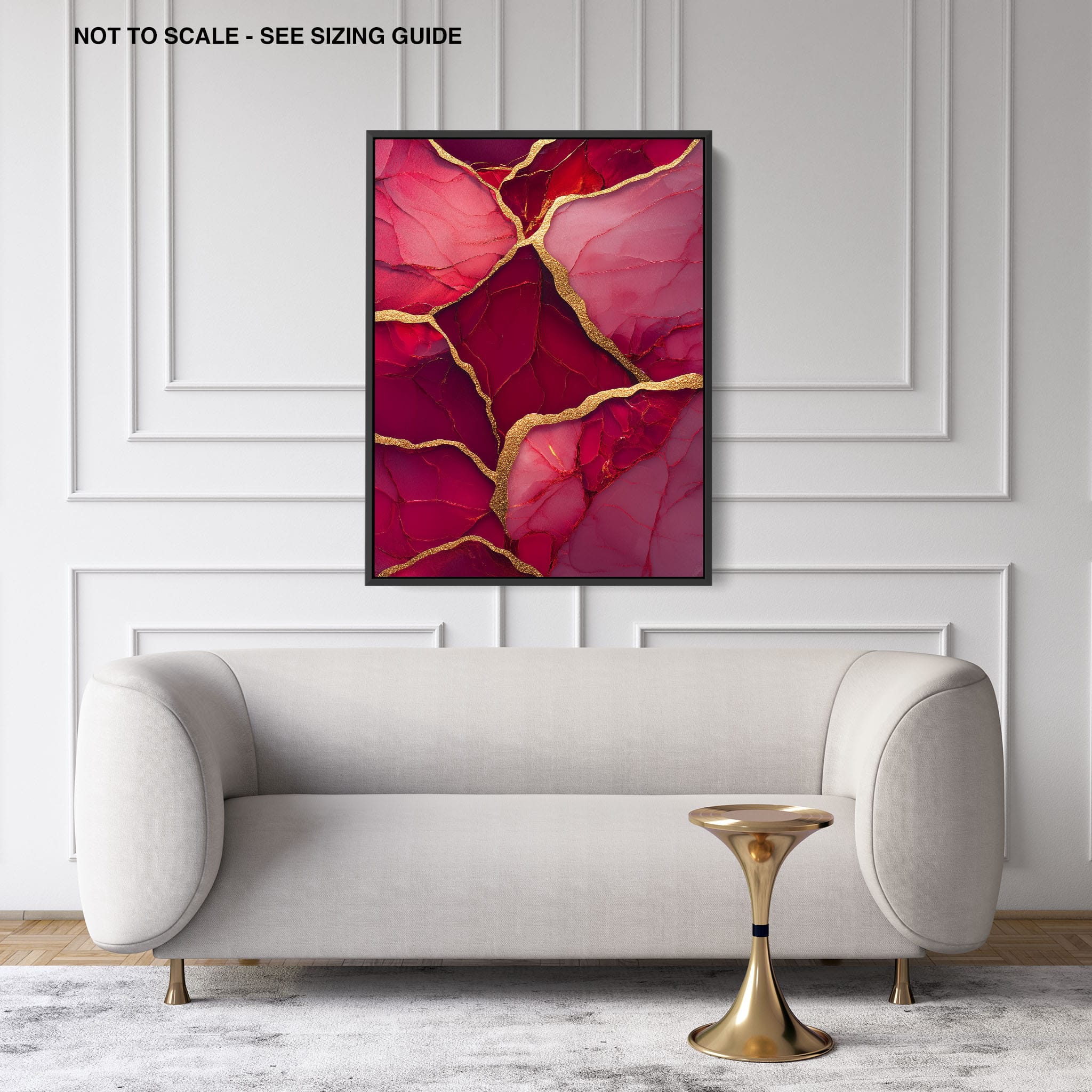 This mixed media masterpiece showcases a compelling abstract and modern design with geometric influences, employing deep crimson hues interlaced with striking golden lines. The luminous, gilded veins contrast starkly against the layers of rich red, creating a dynamic visual tension that captures the viewer's eye. This art piece appeals to those who value bold, vibrant colors and unique textural interplays. It makes a remarkable focal point in any room, offering both aesthetics and conversation. Elevate your space with this captivating work of art.