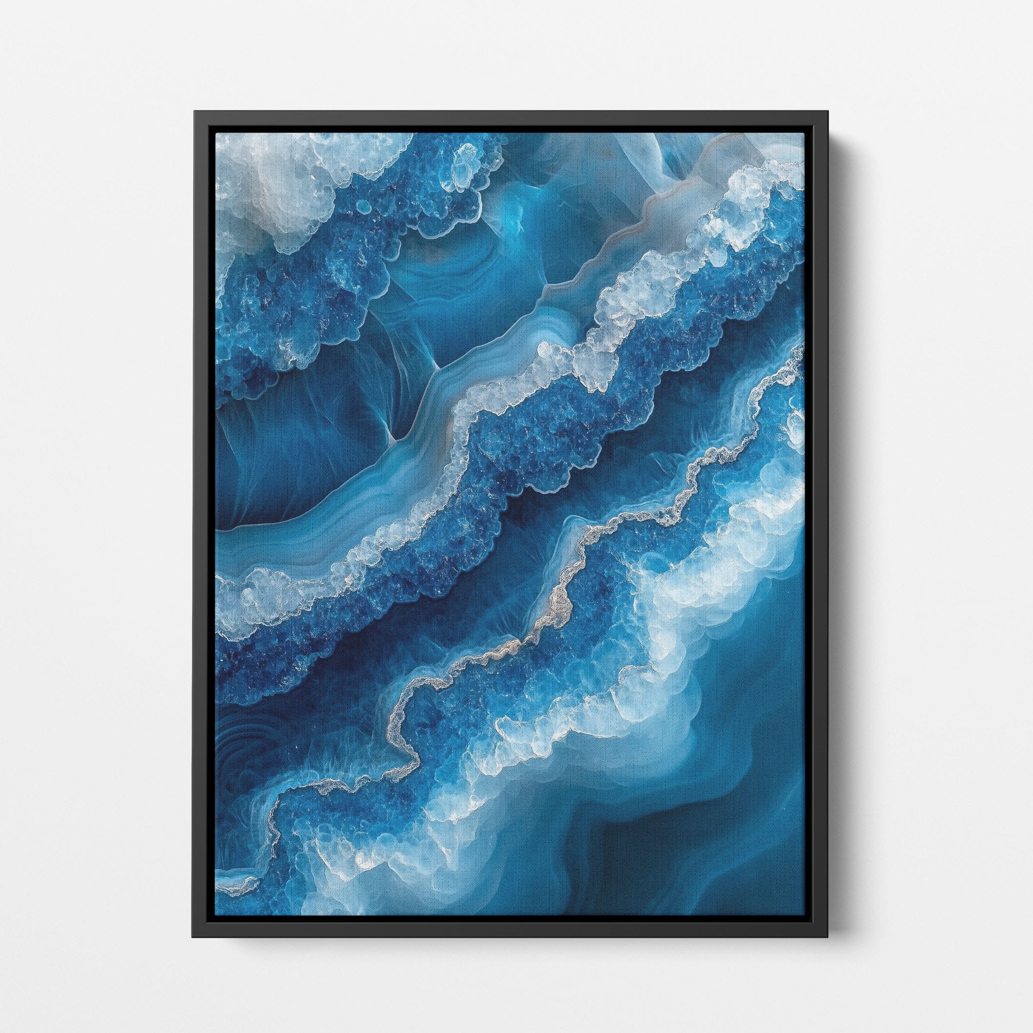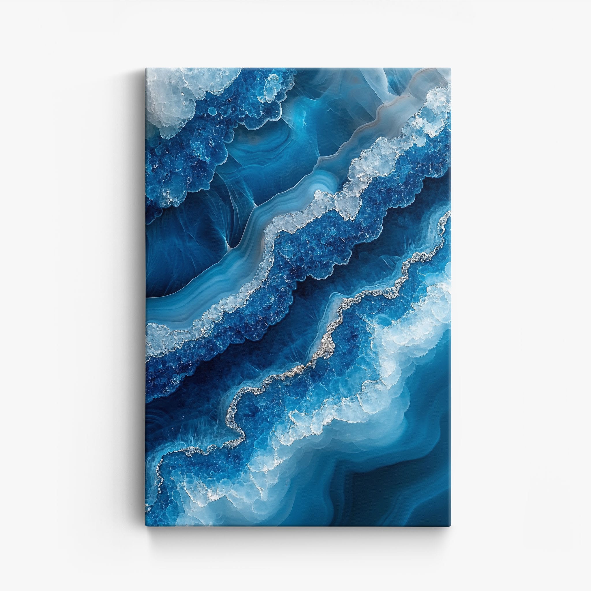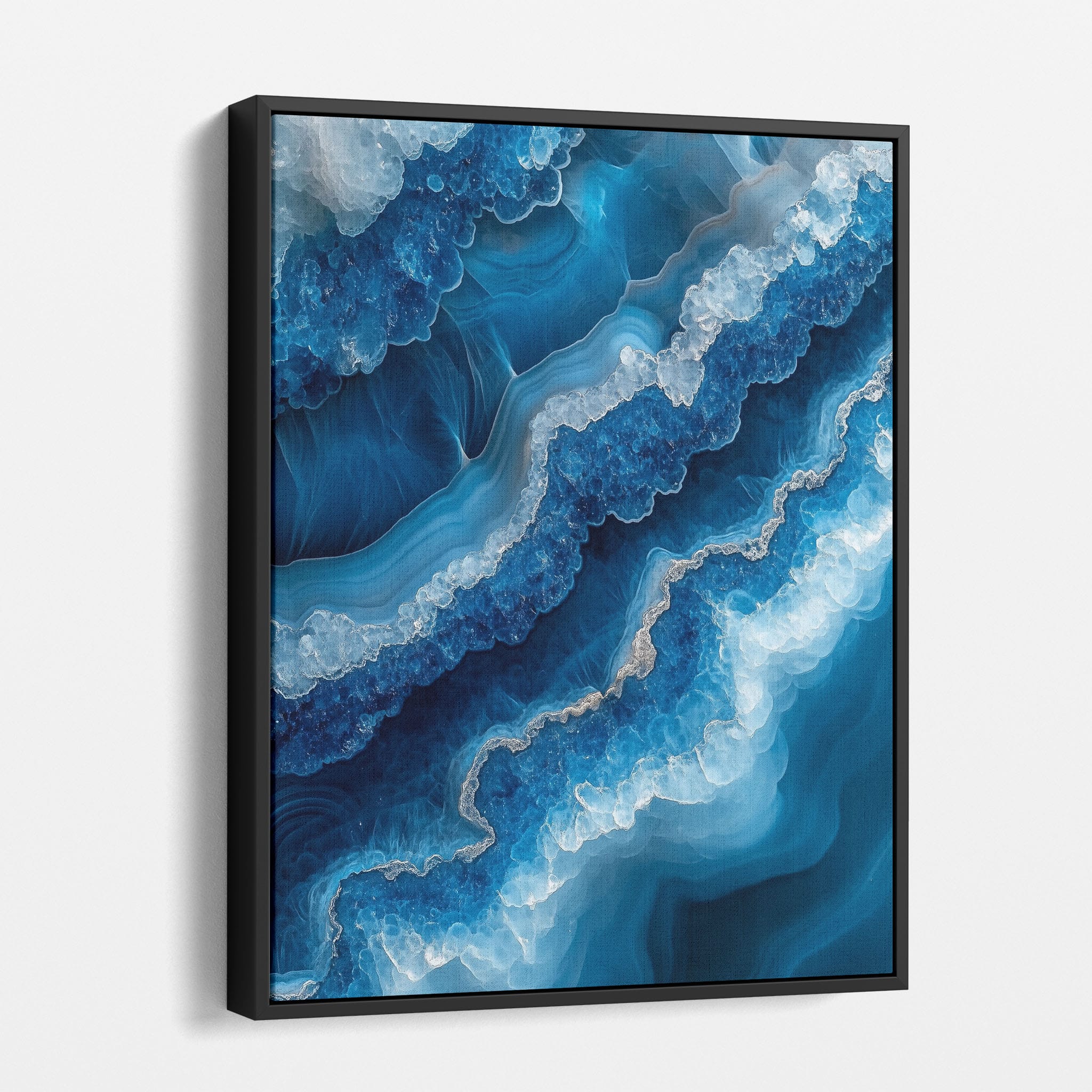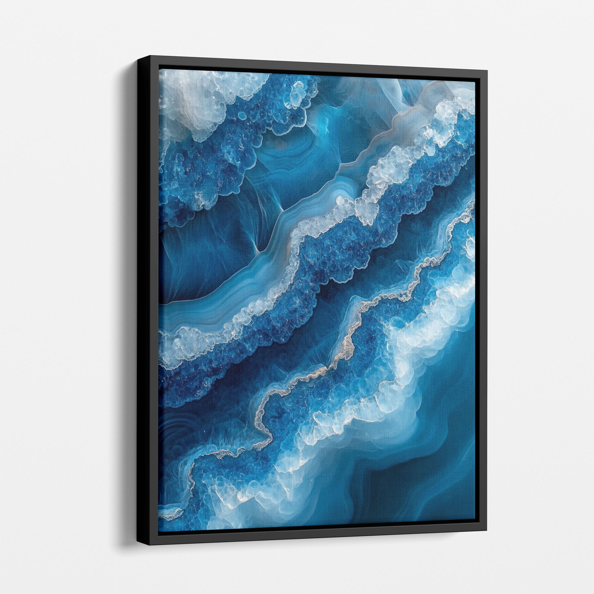 Capturing the essence of an abstract ocean, this digital illustration merges deep blues and transcendent whites to create a stunning visual of crystalline waves and oceanic abysses. The delicate balance of geometric and surreal elements invites viewers into a serene yet dynamic environment. Perfect for both modern decor and lovers of abstract art, this piece complements any space with its cool tones and imaginative design. Add this artwork to your space to introduce a touch of calm sophistication and innovative artistry.