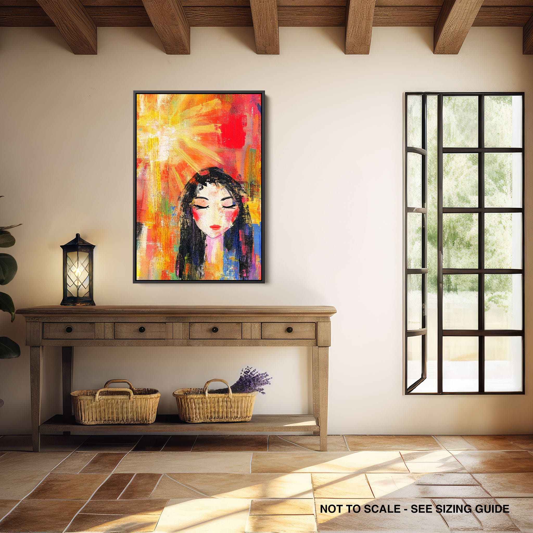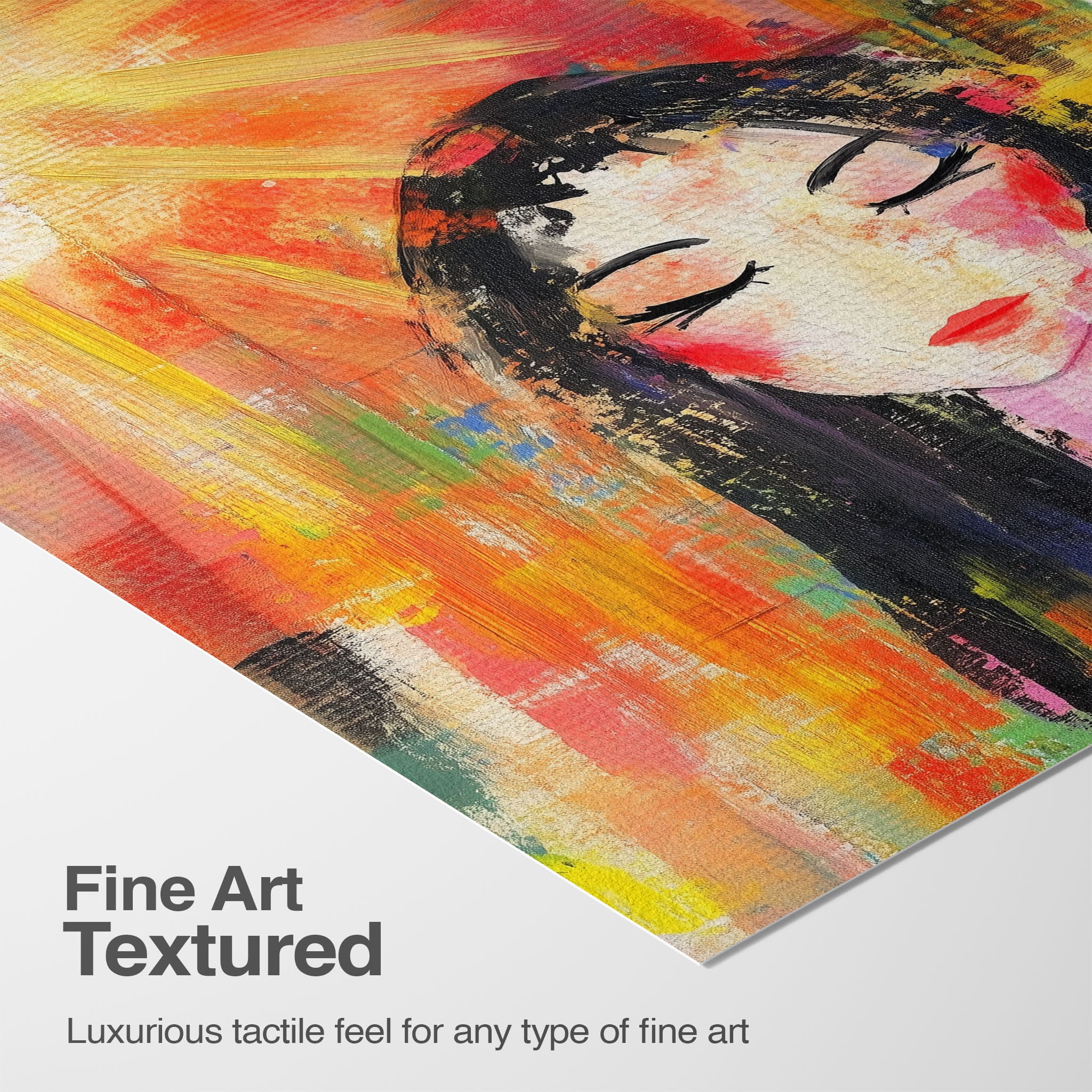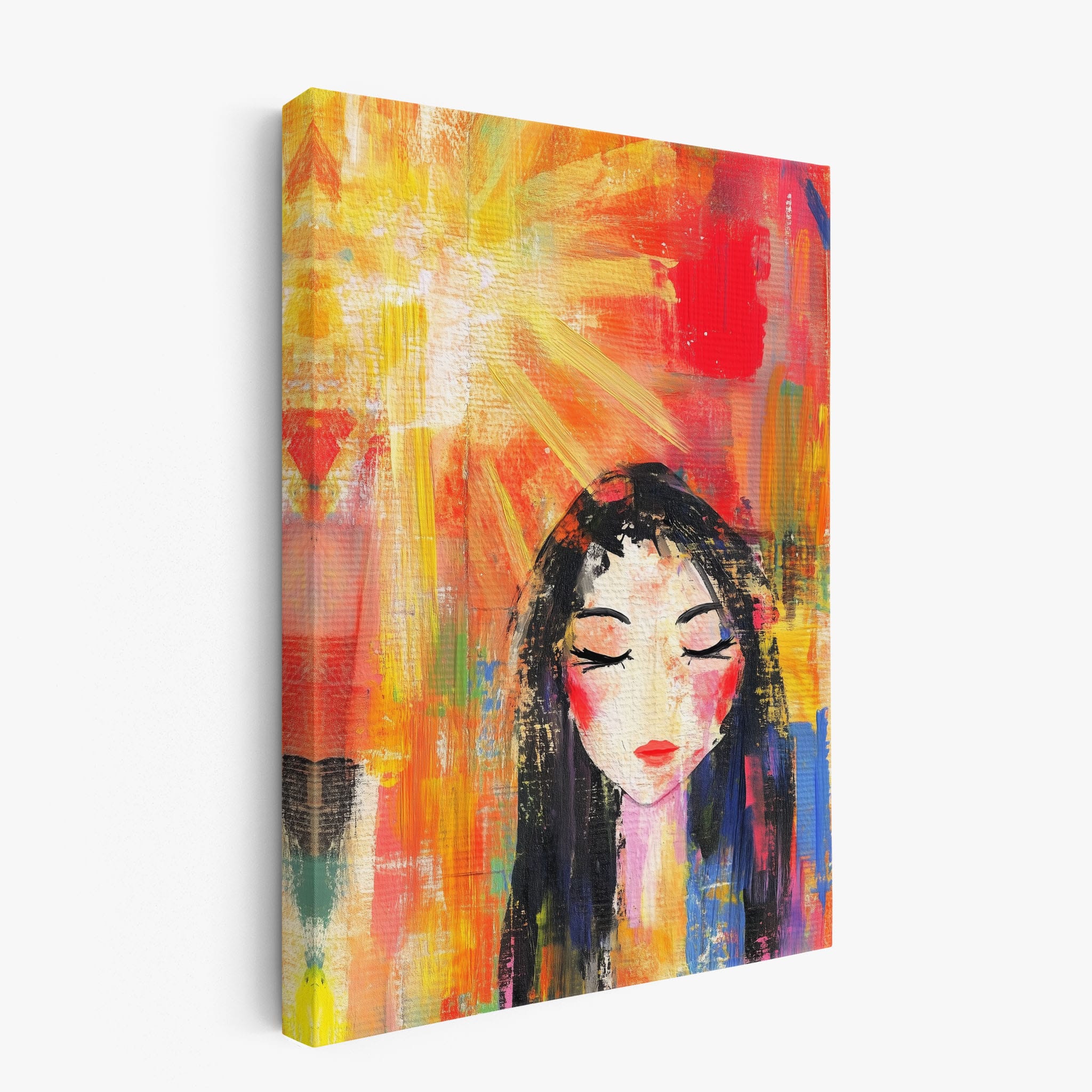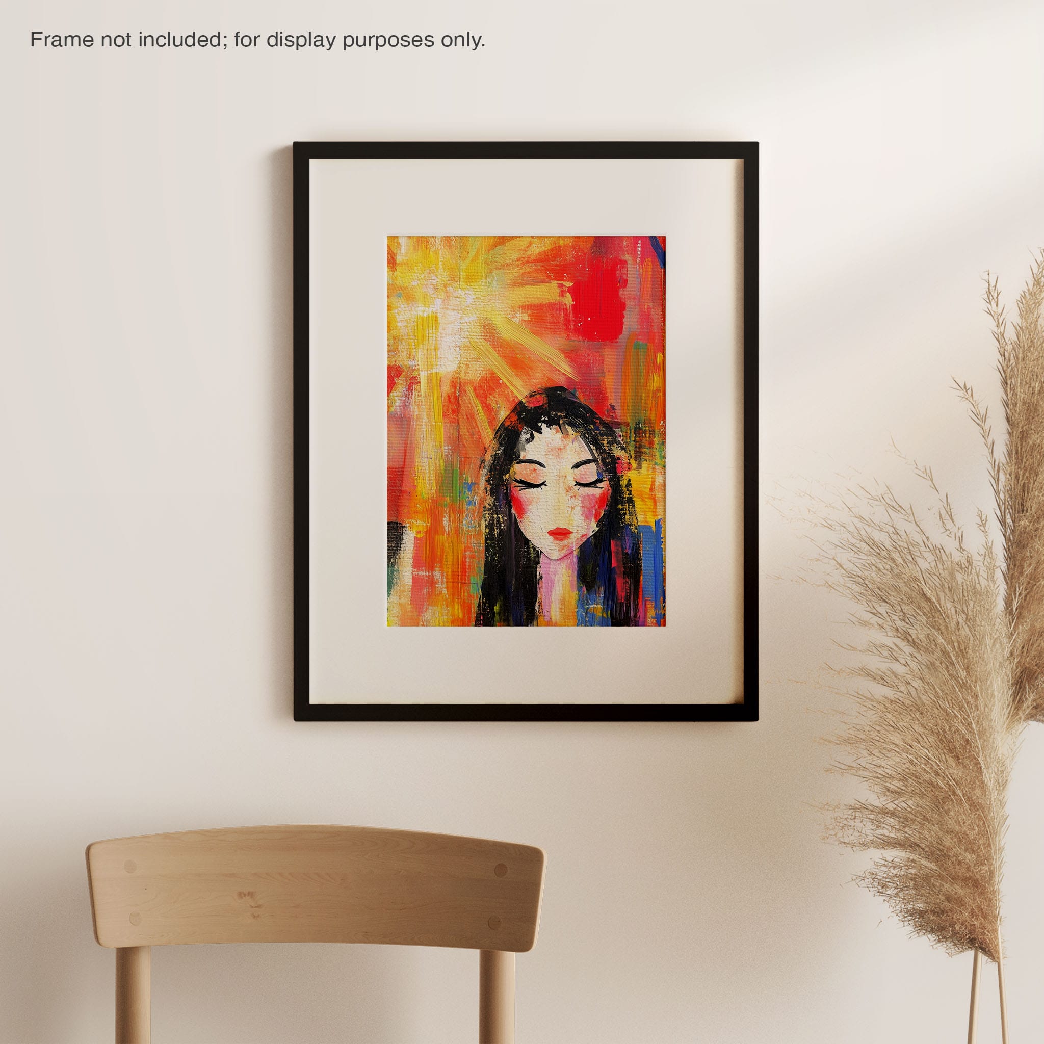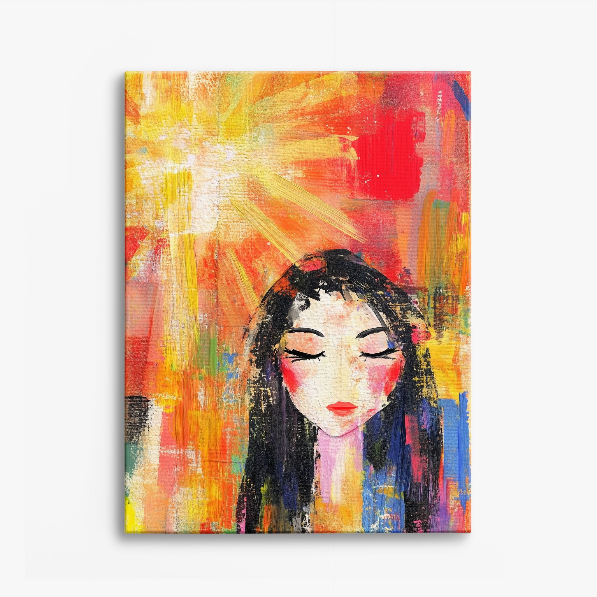 This vibrant painting features a figurative representation of a woman, her face painted with a palette of fiery reds, calming blues, and sunlit yellows that evoke a deep emotional response. The expressionist technique uses bold, sweeping strokes to capture the subject's serene expression and closed eyes, suggesting a moment of introspection or dream. Ideal for modern art lovers, this painting can add a burst of color and emotion to any living space or office, drawing viewers into a world where color speaks louder than words.
