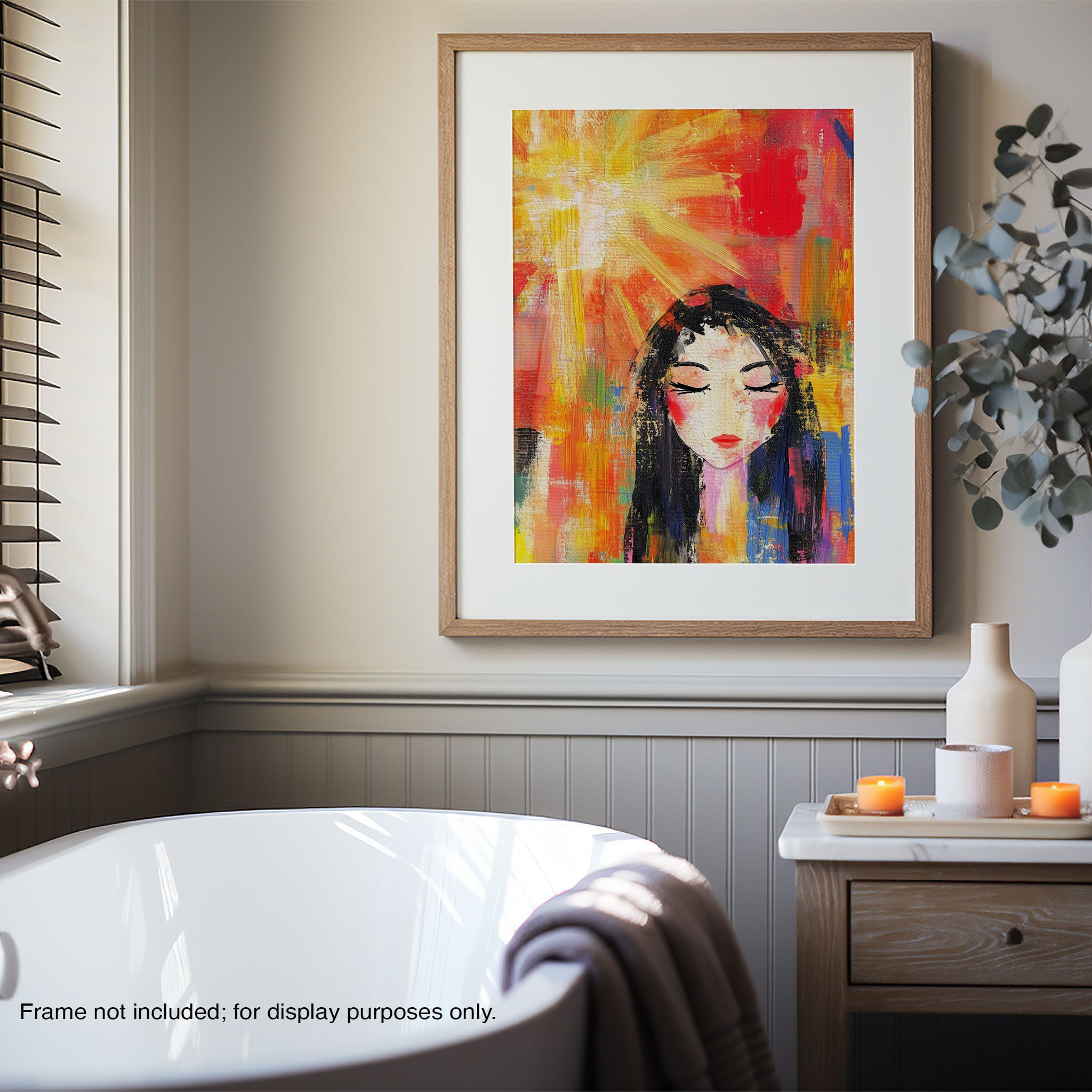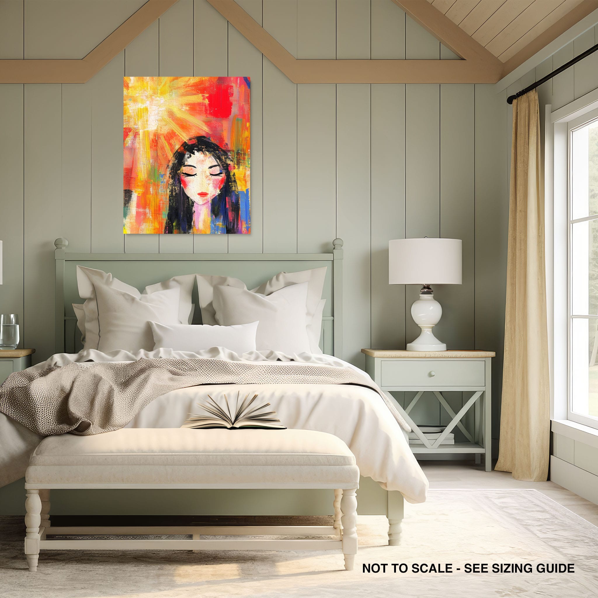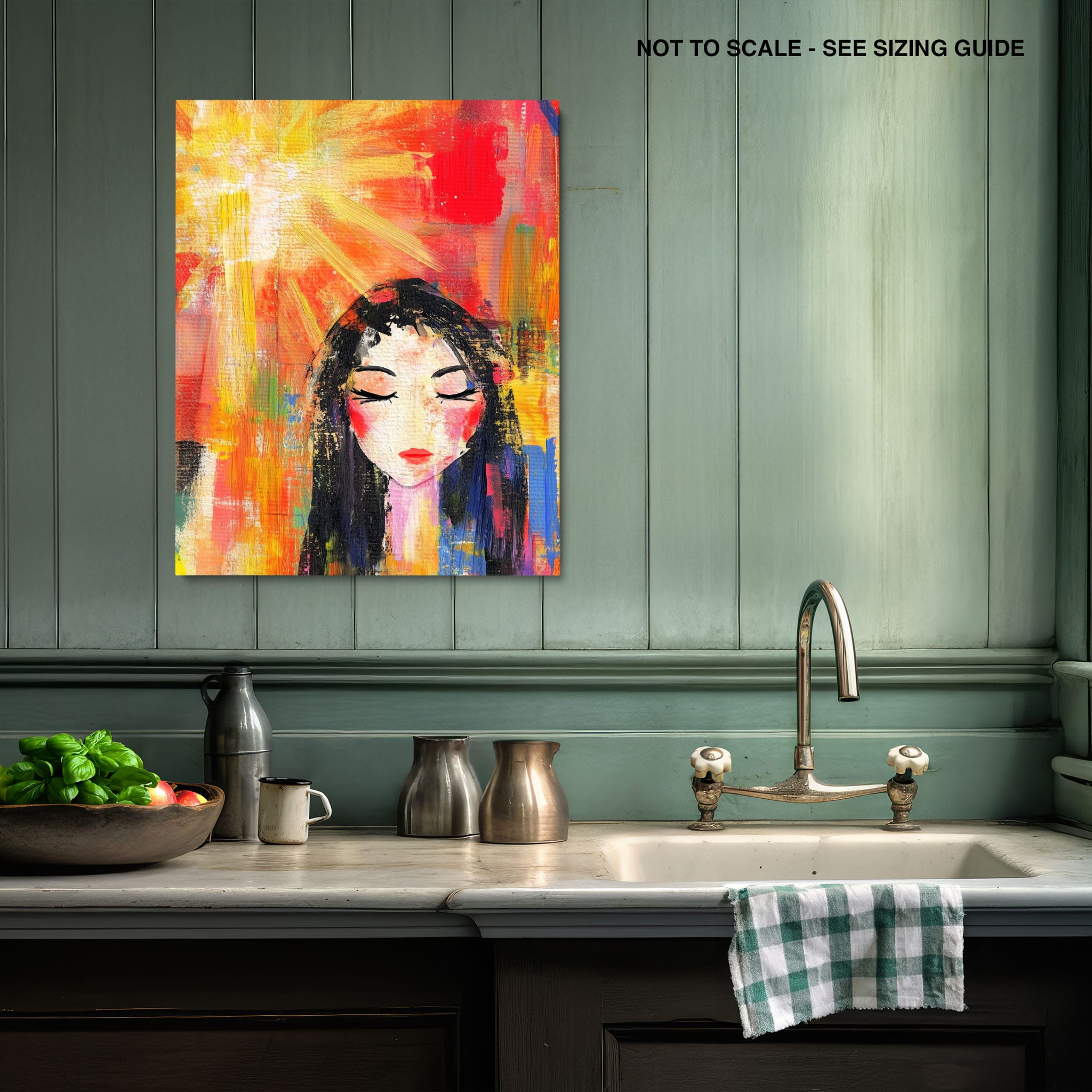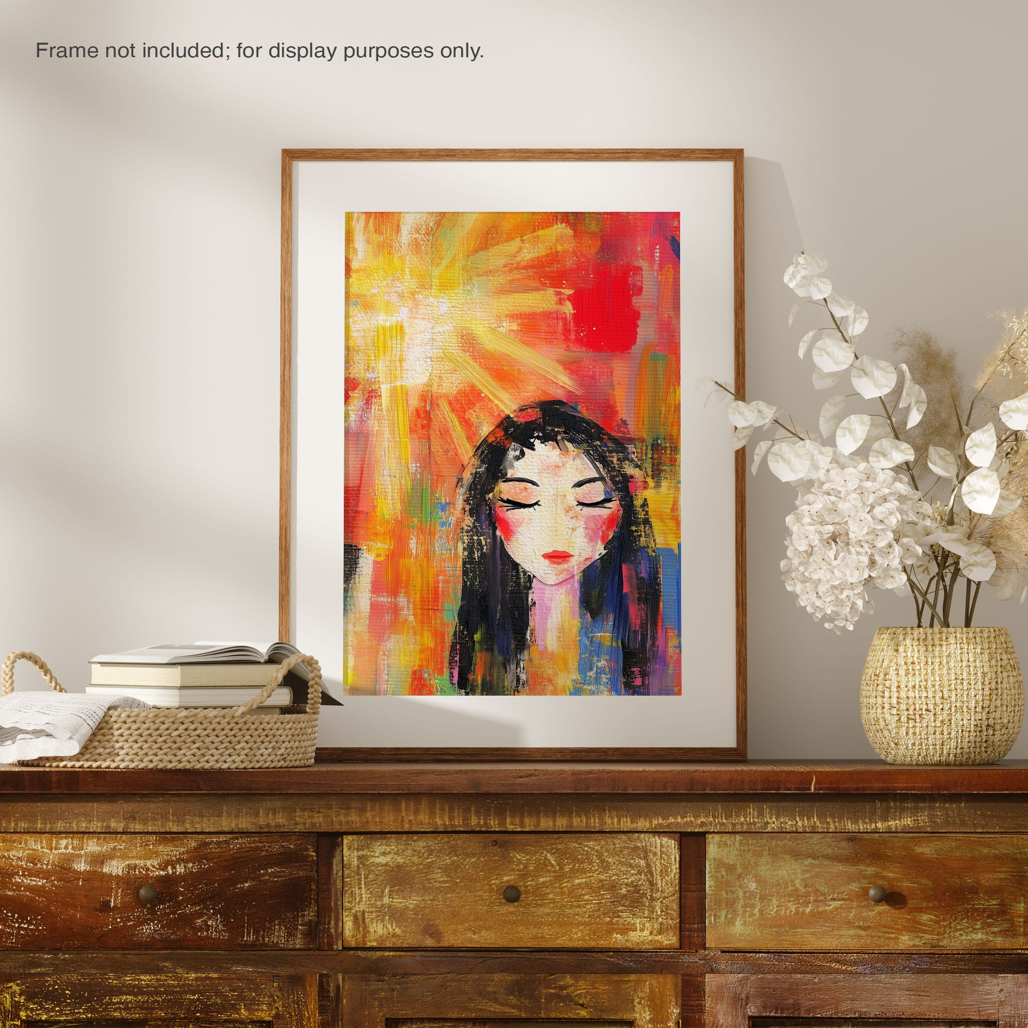 This vibrant painting features a figurative representation of a woman, her face painted with a palette of fiery reds, calming blues, and sunlit yellows that evoke a deep emotional response. The expressionist technique uses bold, sweeping strokes to capture the subject's serene expression and closed eyes, suggesting a moment of introspection or dream. Ideal for modern art lovers, this painting can add a burst of color and emotion to any living space or office, drawing viewers into a world where color speaks louder than words.
