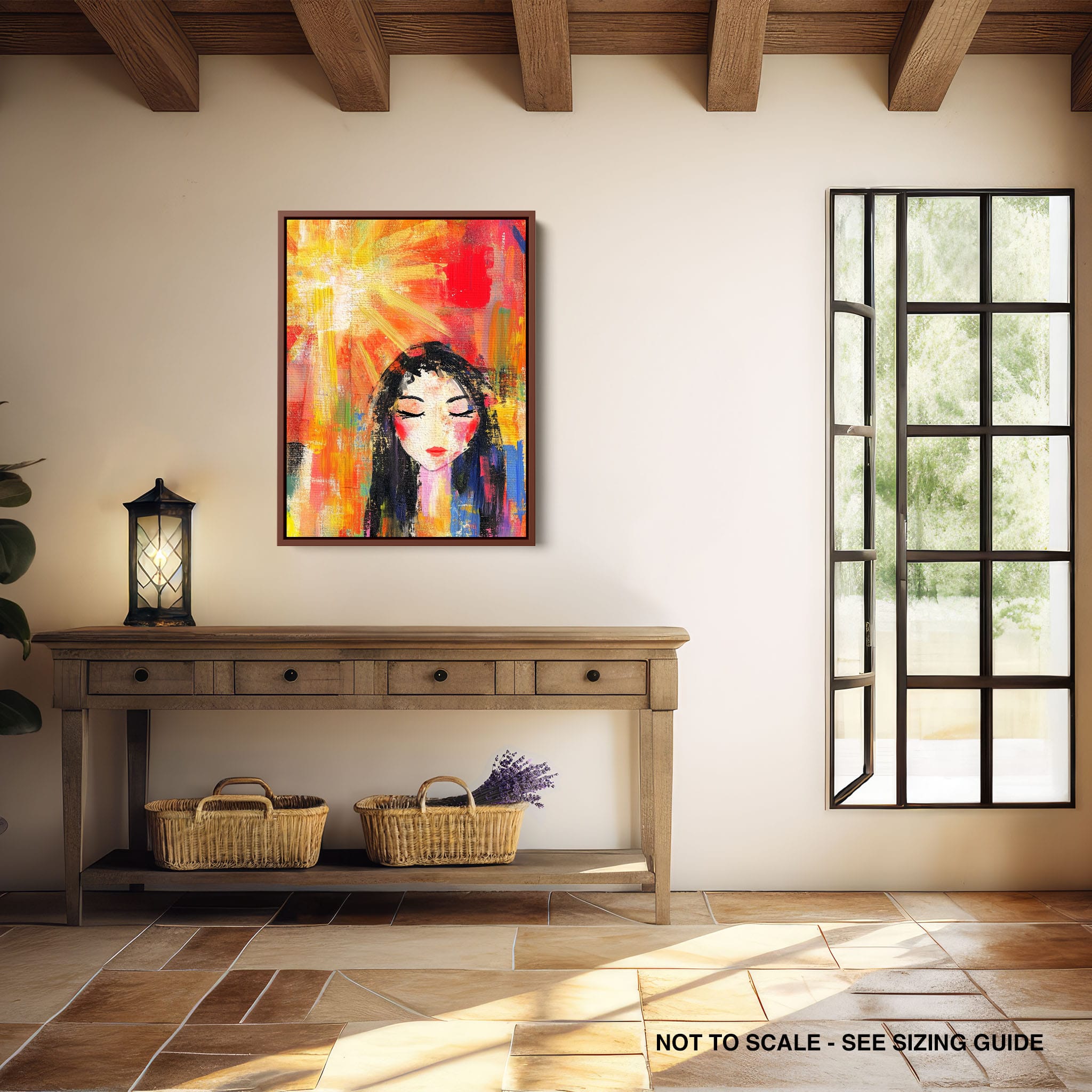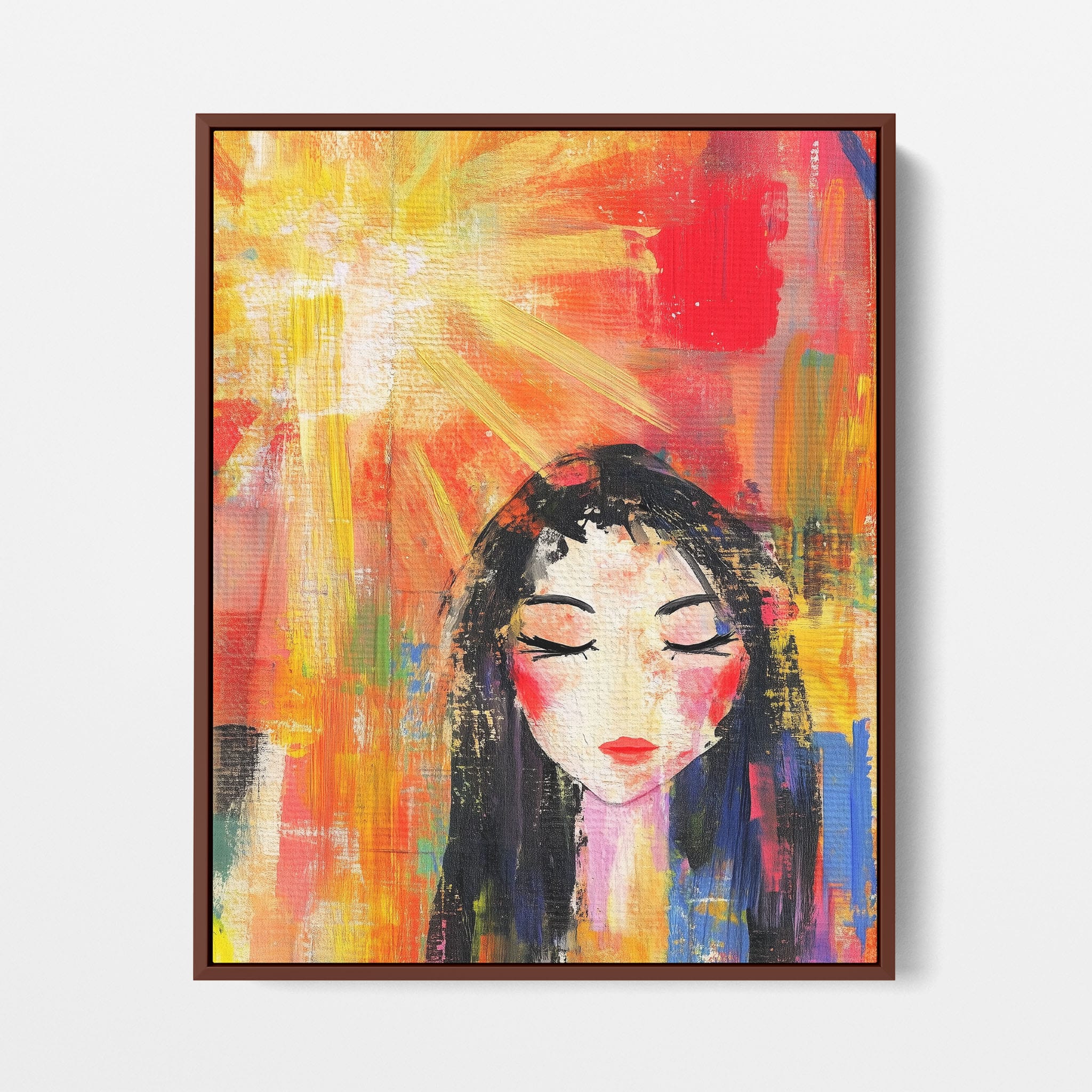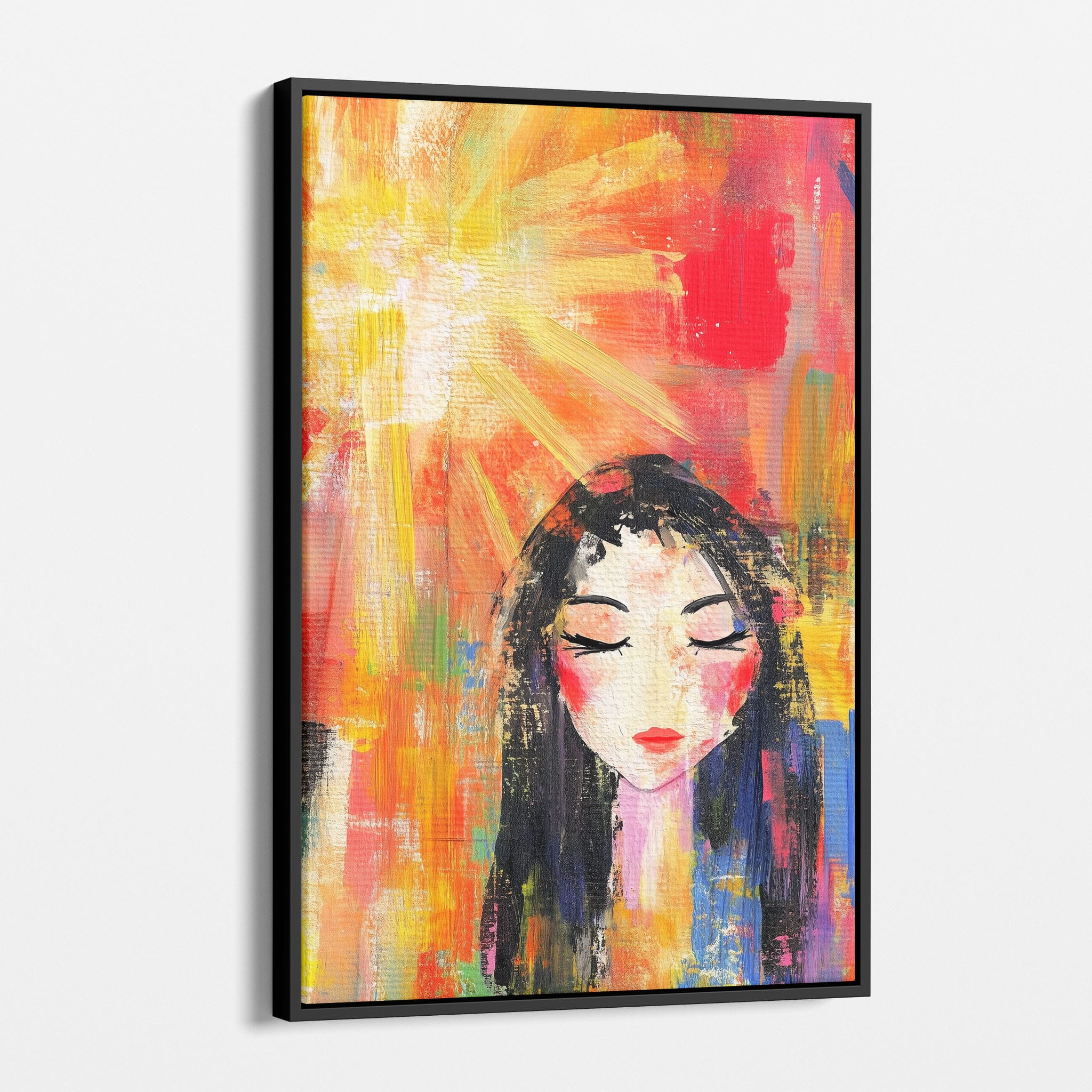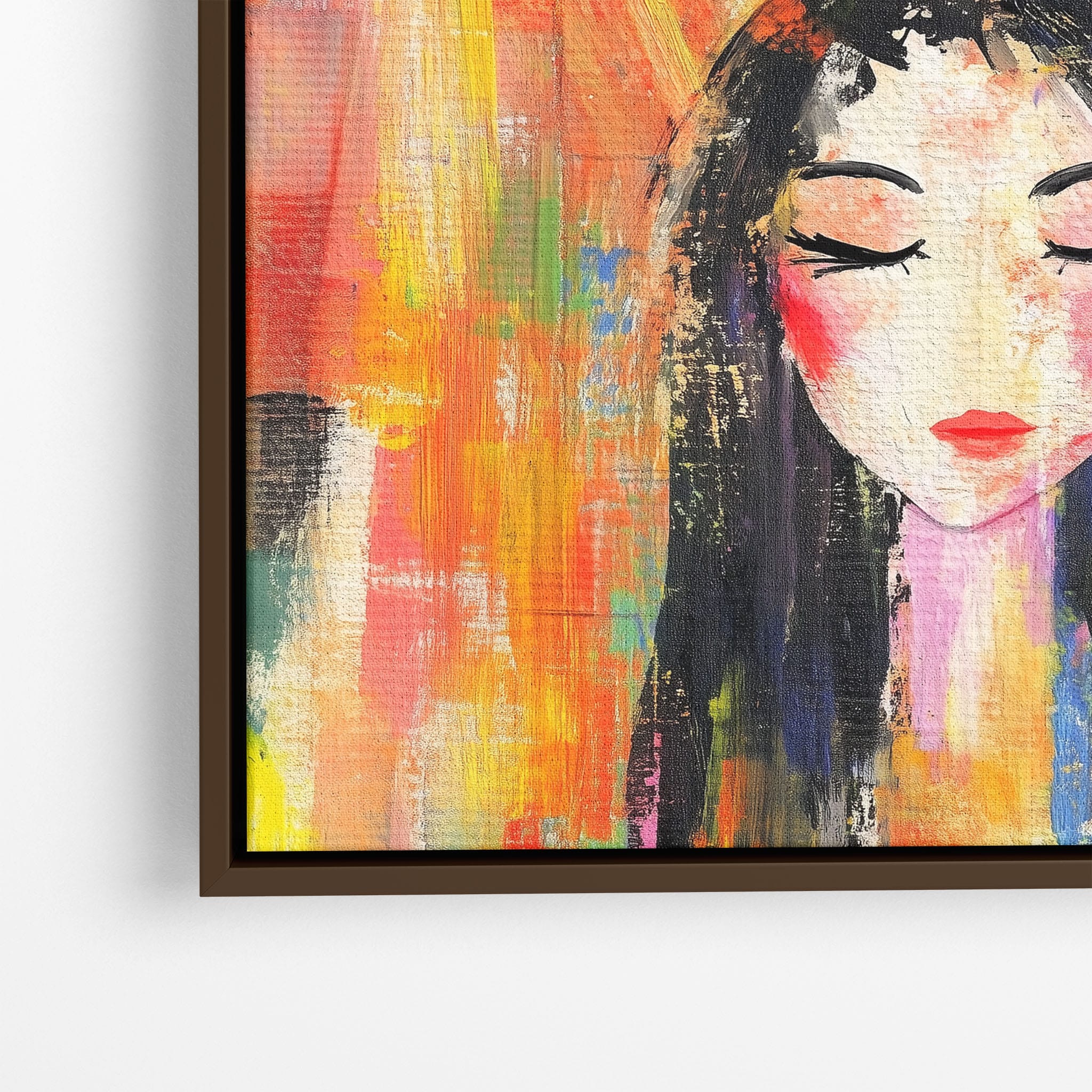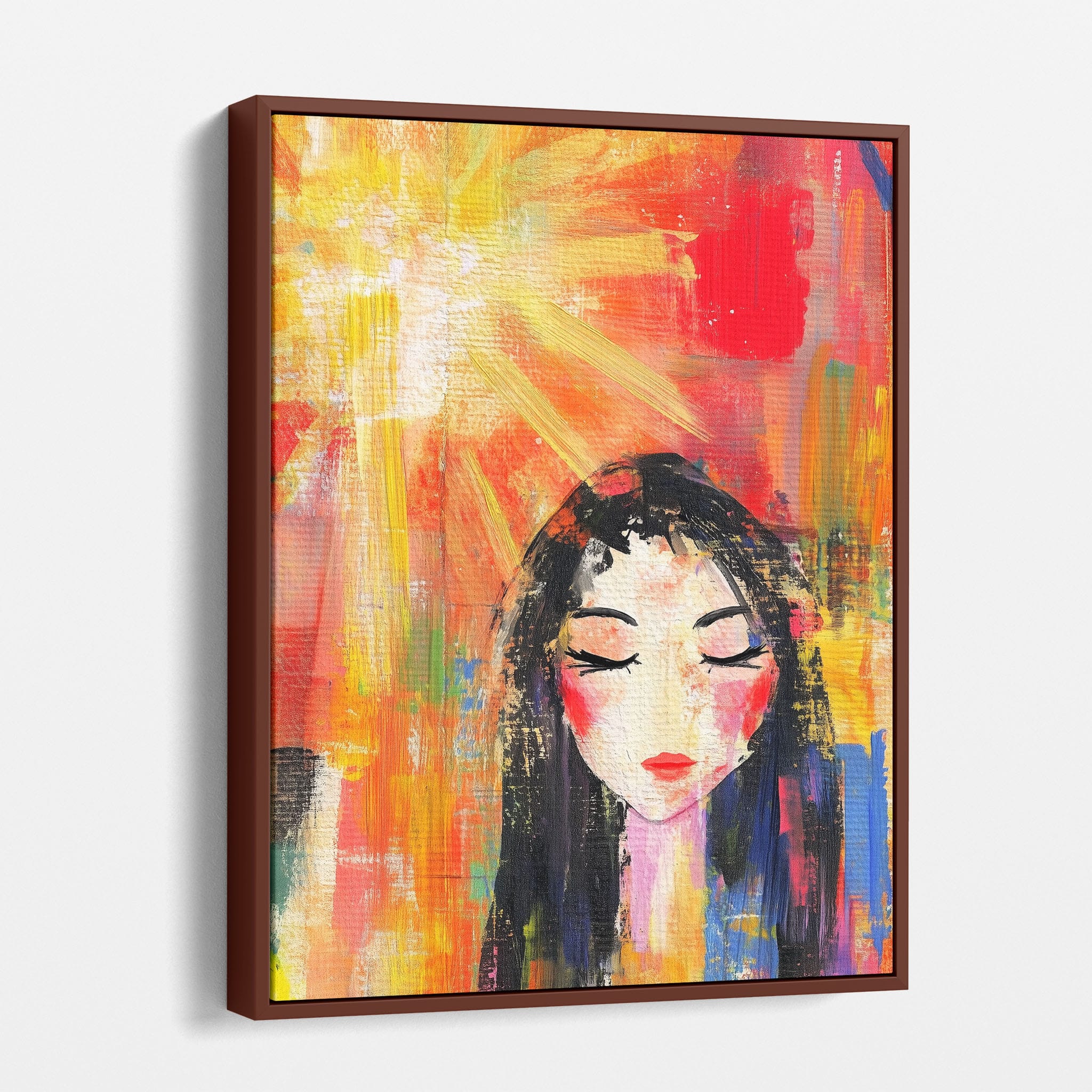This vibrant painting features a figurative representation of a woman, her face painted with a palette of fiery reds, calming blues, and sunlit yellows that evoke a deep emotional response. The expressionist technique uses bold, sweeping strokes to capture the subject's serene expression and closed eyes, suggesting a moment of introspection or dream. Ideal for modern art lovers, this painting can add a burst of color and emotion to any living space or office, drawing viewers into a world where color speaks louder than words.