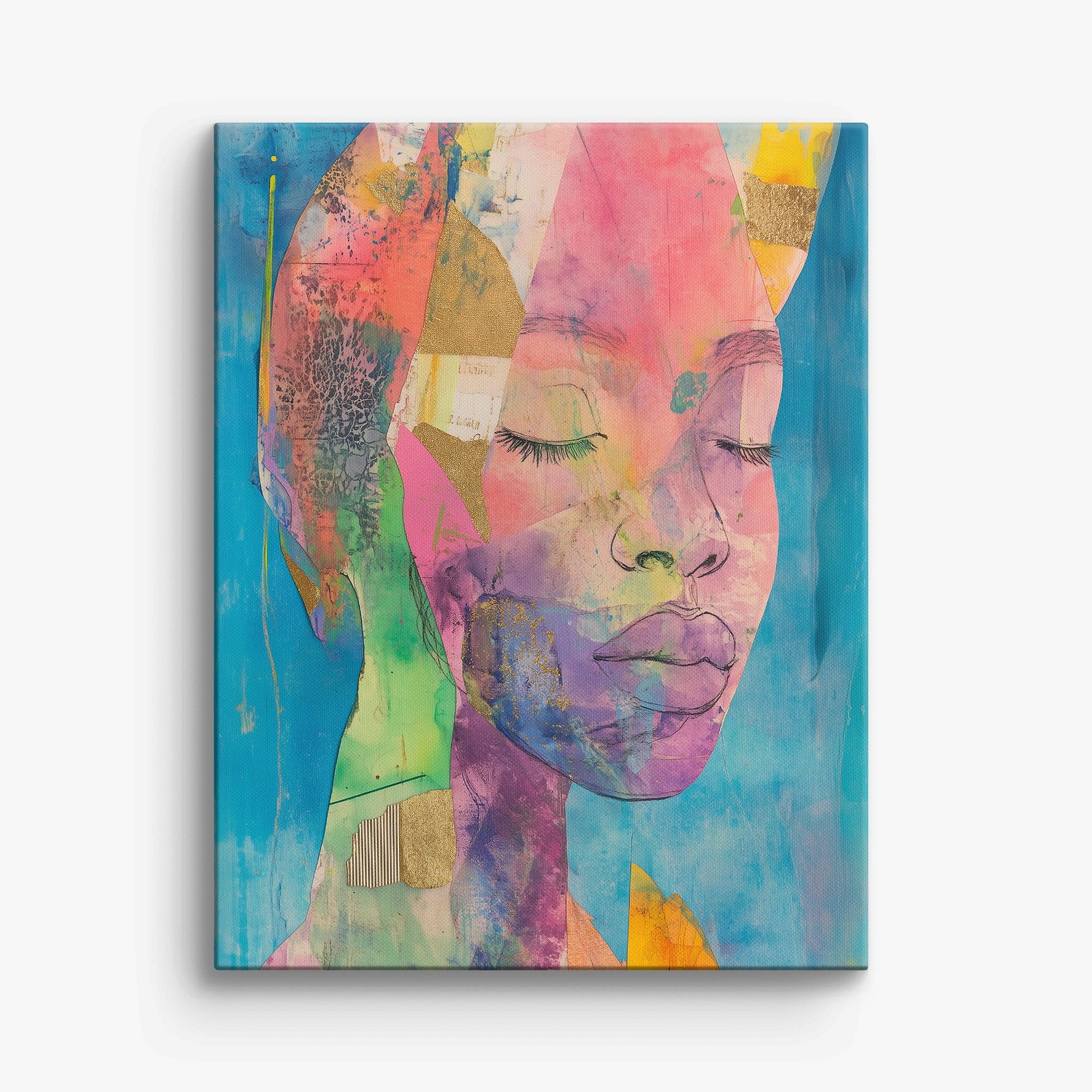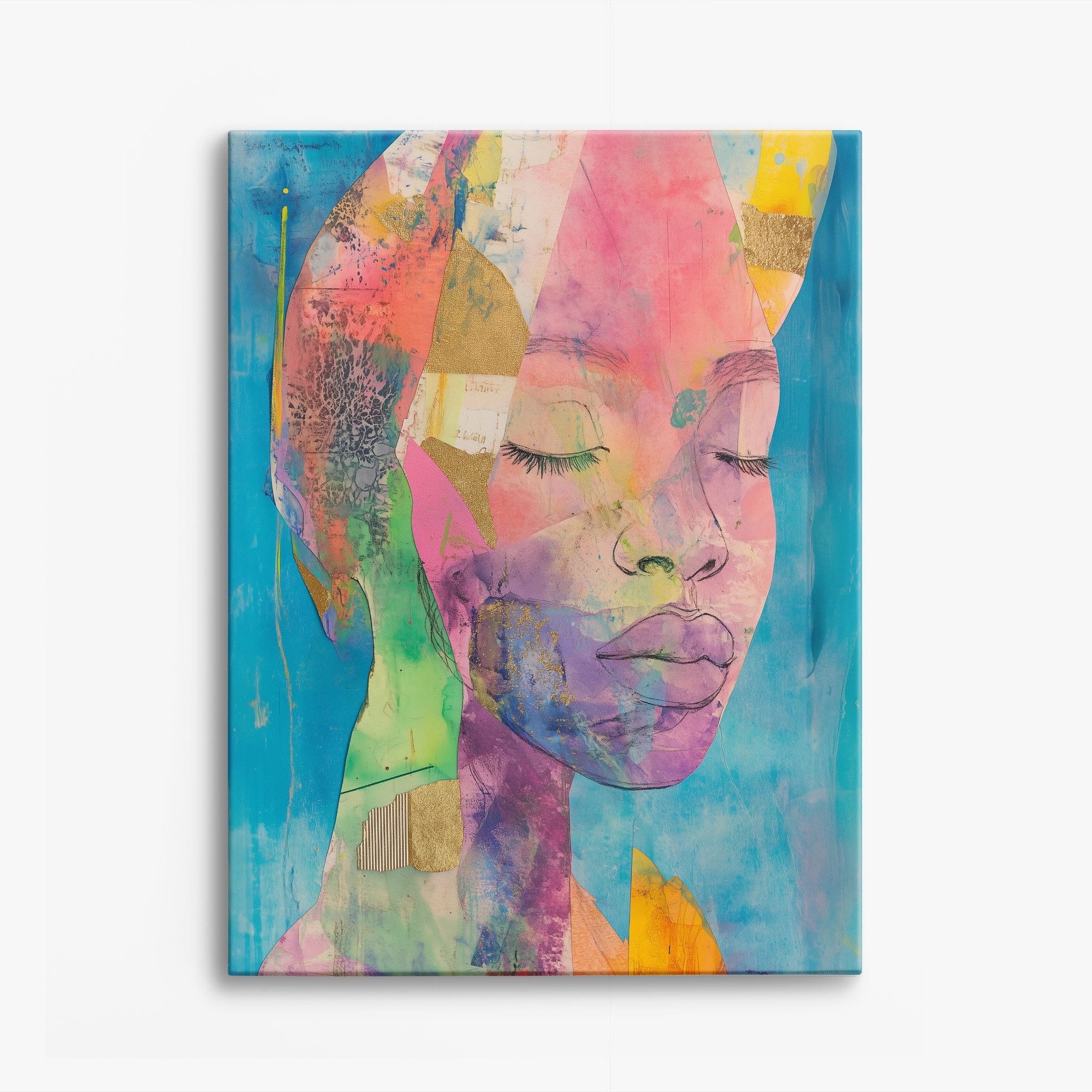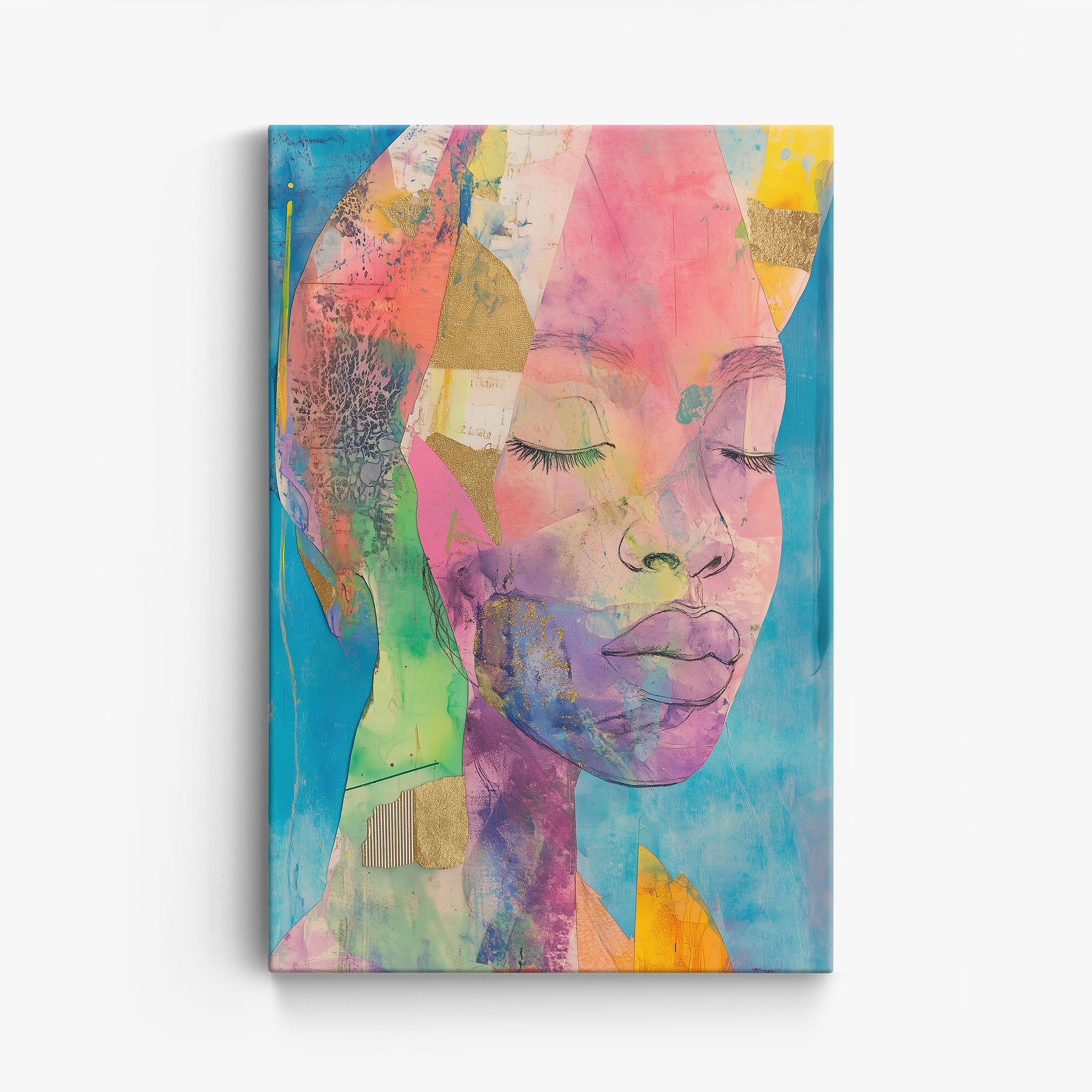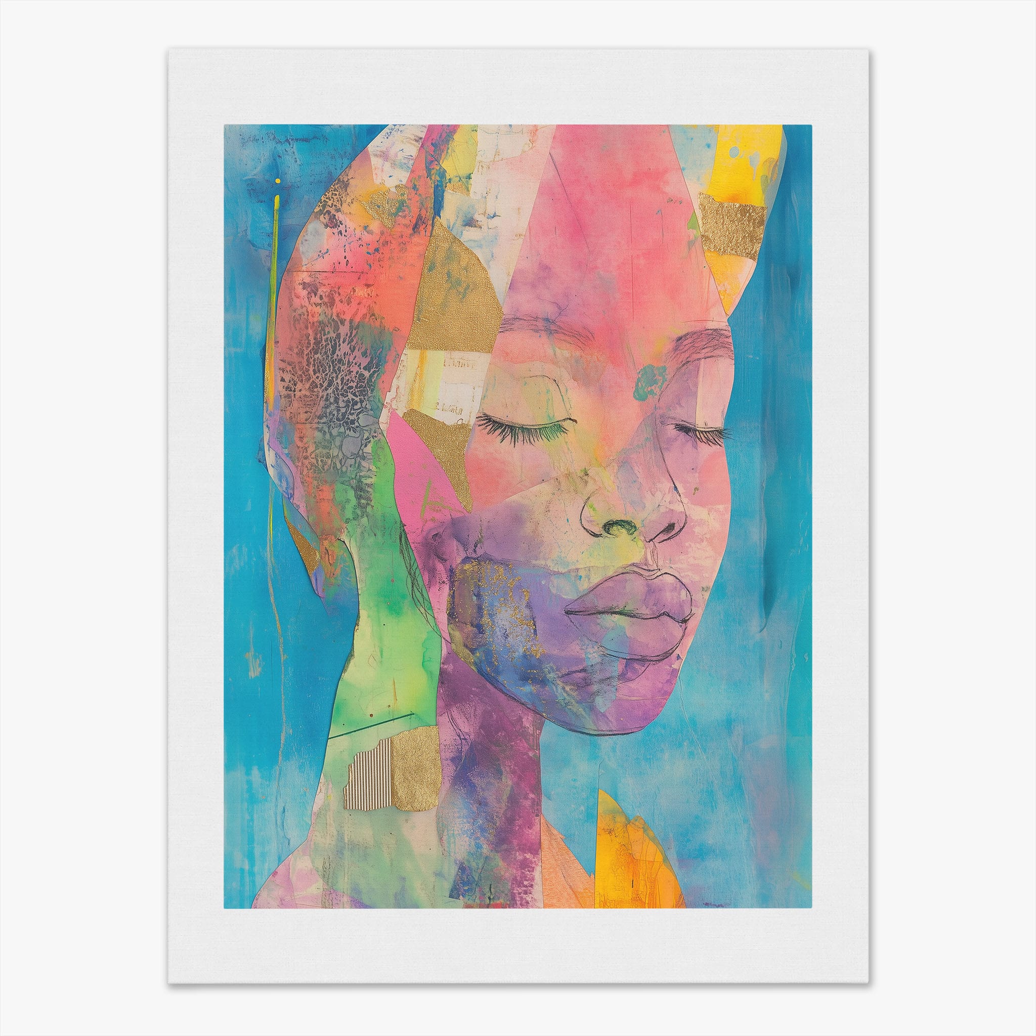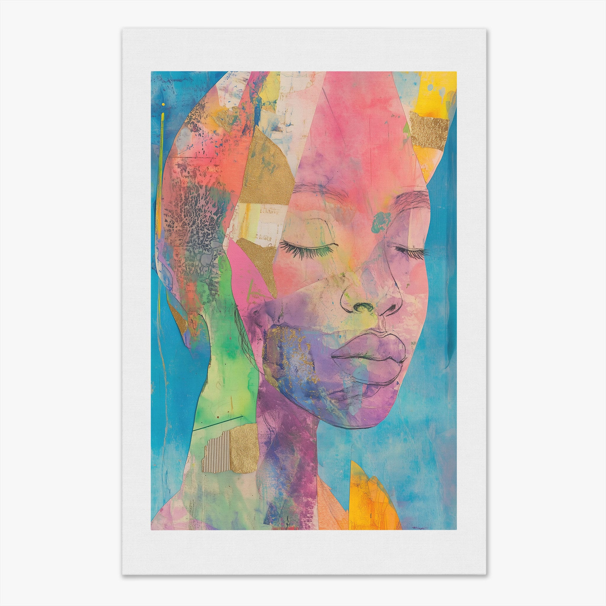 This striking artwork captures an ethereal portrait overlaid with vibrant patches and abstract textures, creating a visually intriguing mix of colors and forms. The mixed media technique adds depth and uniqueness, employing elements that flirt with surrealism and abstraction. Bold pinks mingle with serene blues, underlined by touches of gold — a palette that evokes emotion and thought. This piece is perfect for those who value the avant-garde in their decor, promising to be a thought-provoking centerpiece in any modern art lover’s collection. Bring this mesmerizing blend of color and form into your space today!