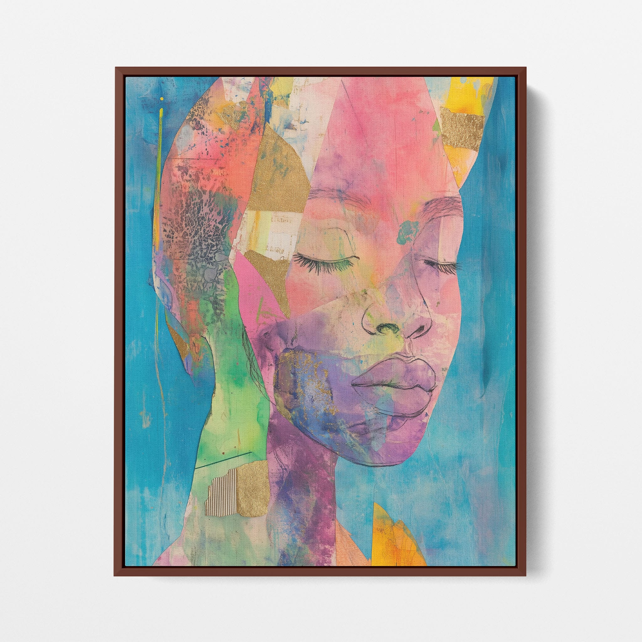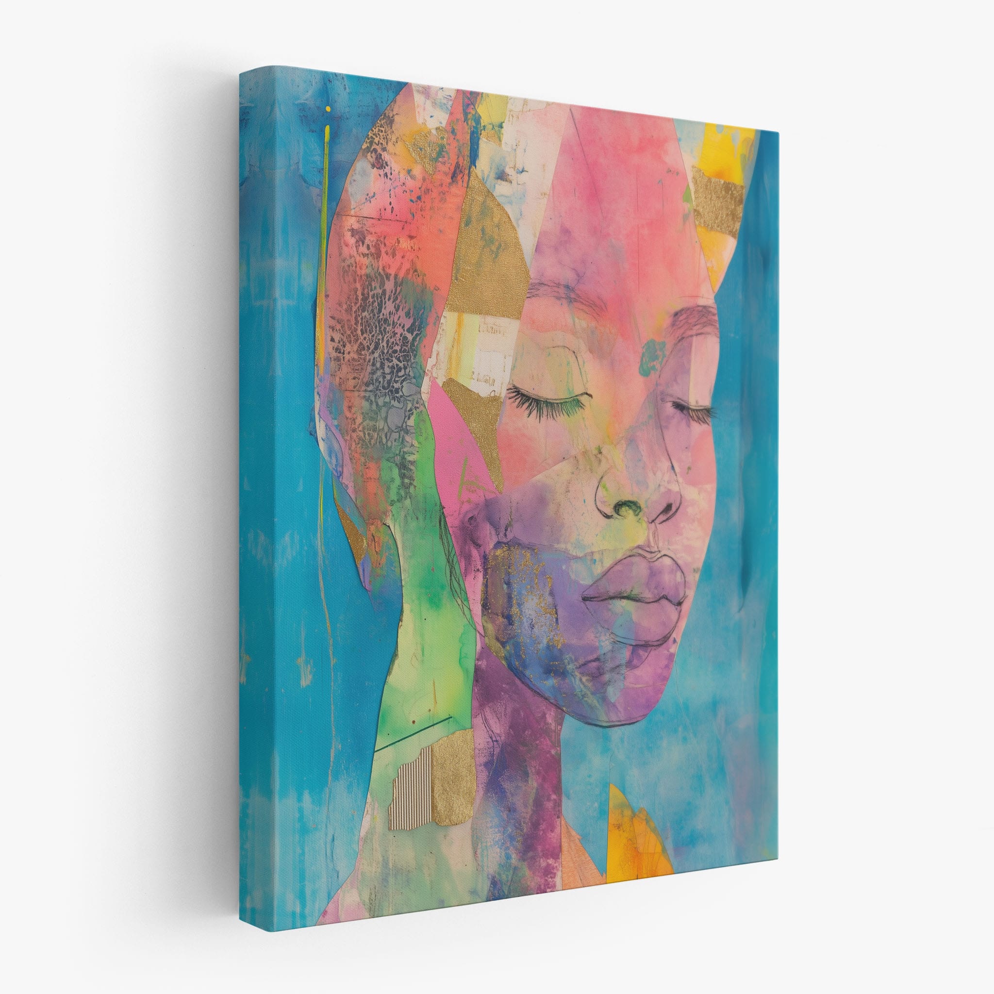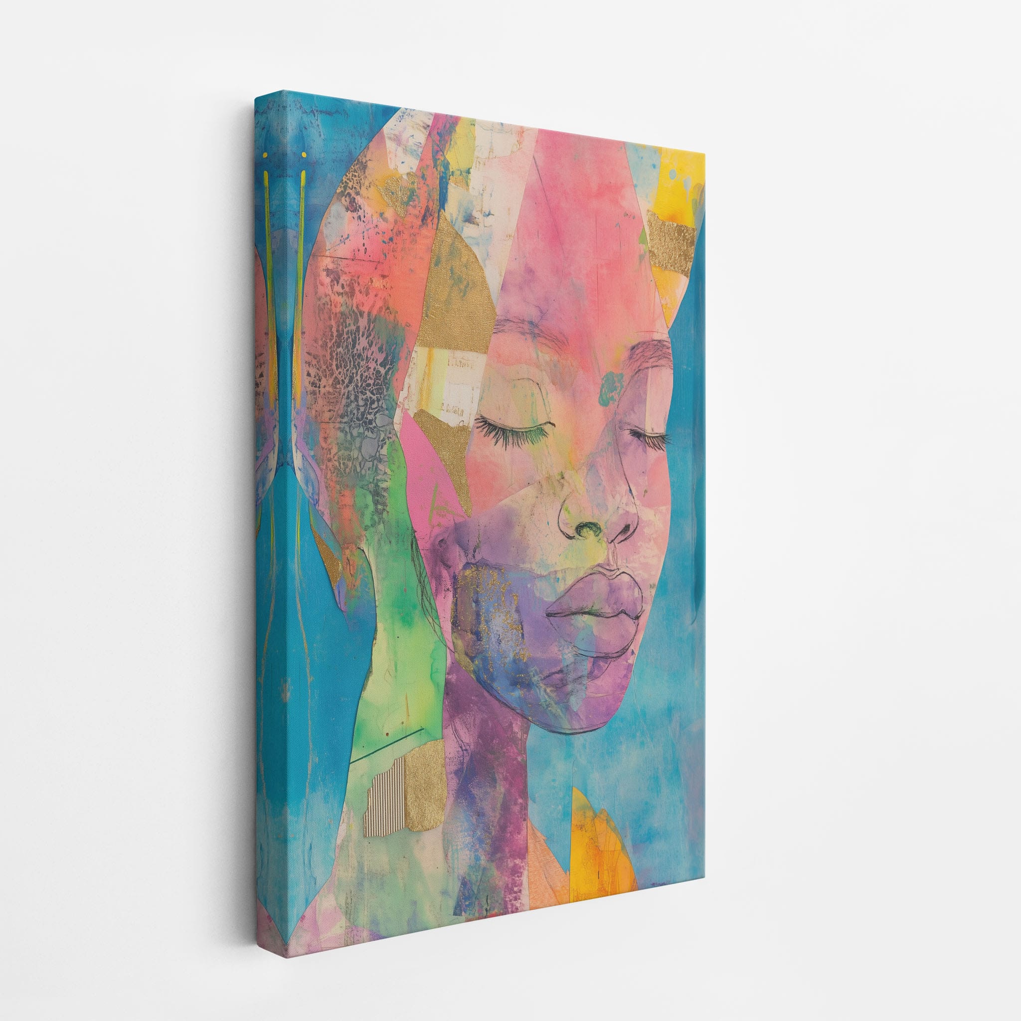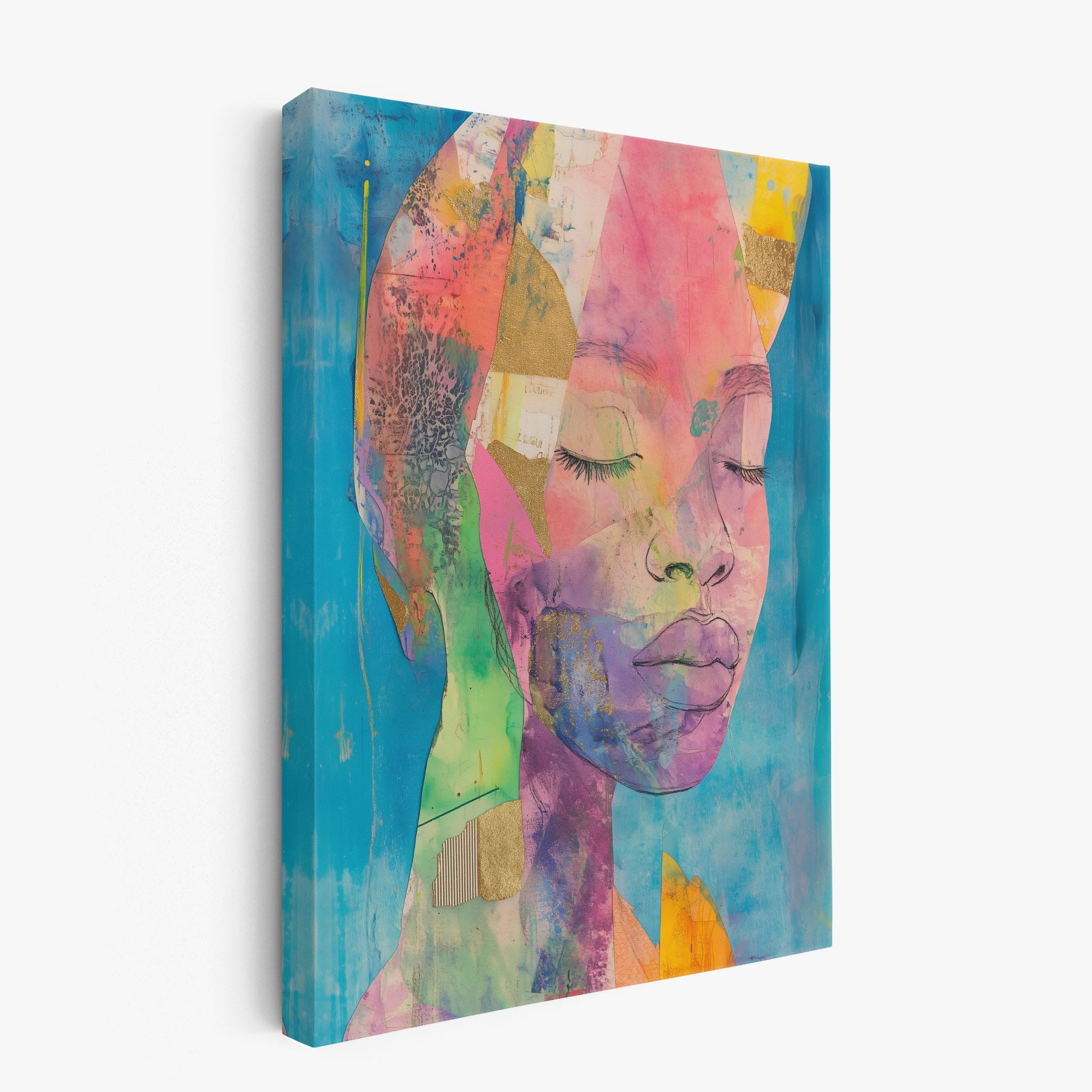 This striking artwork captures an ethereal portrait overlaid with vibrant patches and abstract textures, creating a visually intriguing mix of colors and forms. The mixed media technique adds depth and uniqueness, employing elements that flirt with surrealism and abstraction. Bold pinks mingle with serene blues, underlined by touches of gold — a palette that evokes emotion and thought. This piece is perfect for those who value the avant-garde in their decor, promising to be a thought-provoking centerpiece in any modern art lover’s collection. Bring this mesmerizing blend of color and form into your space today!