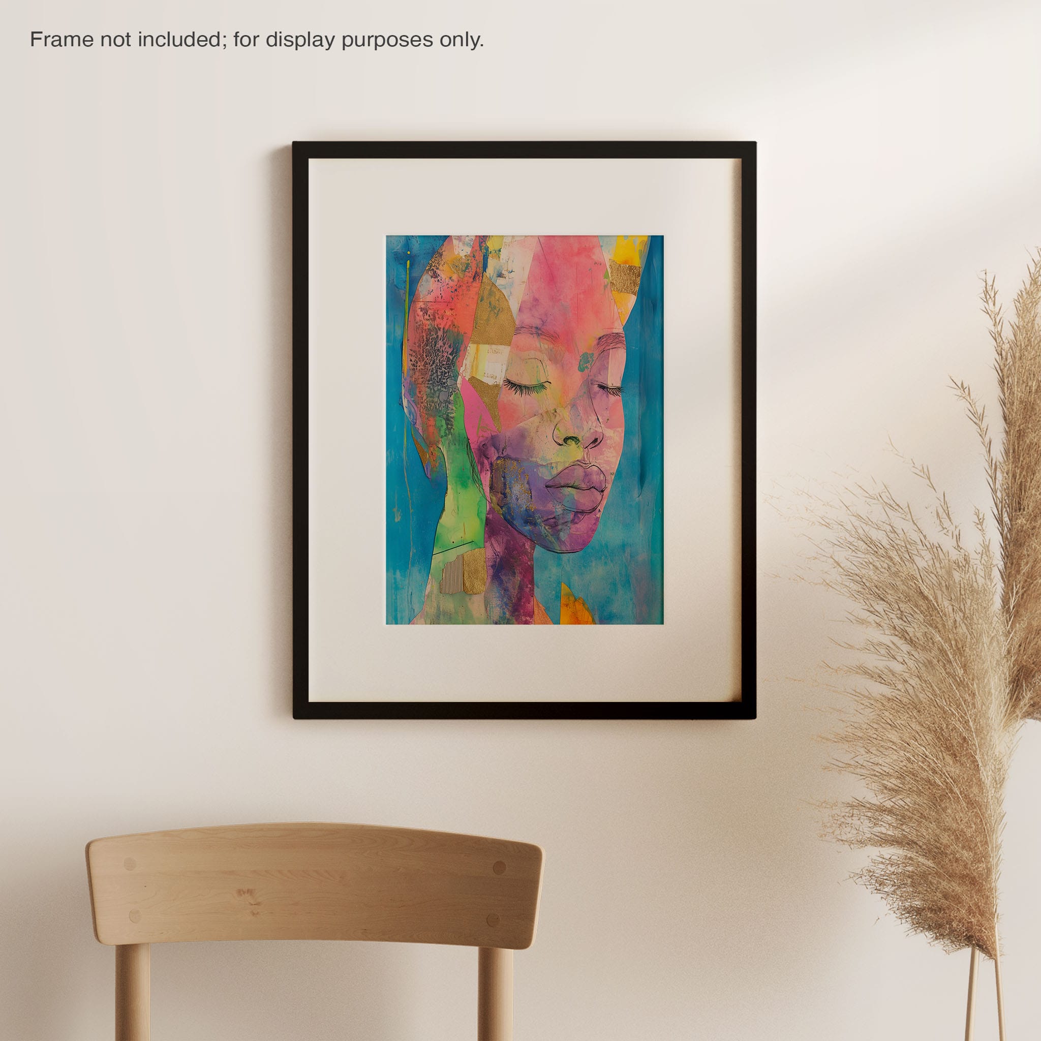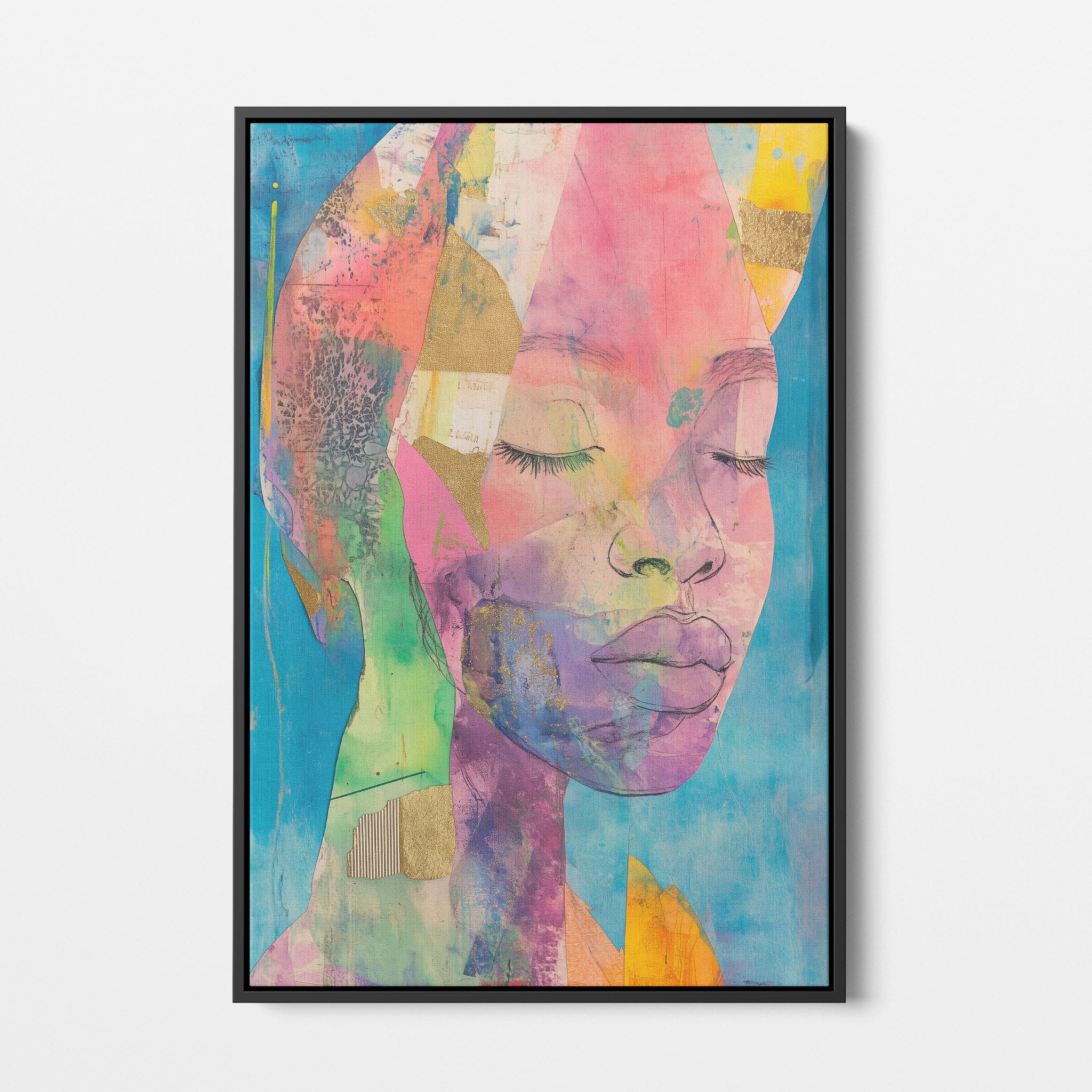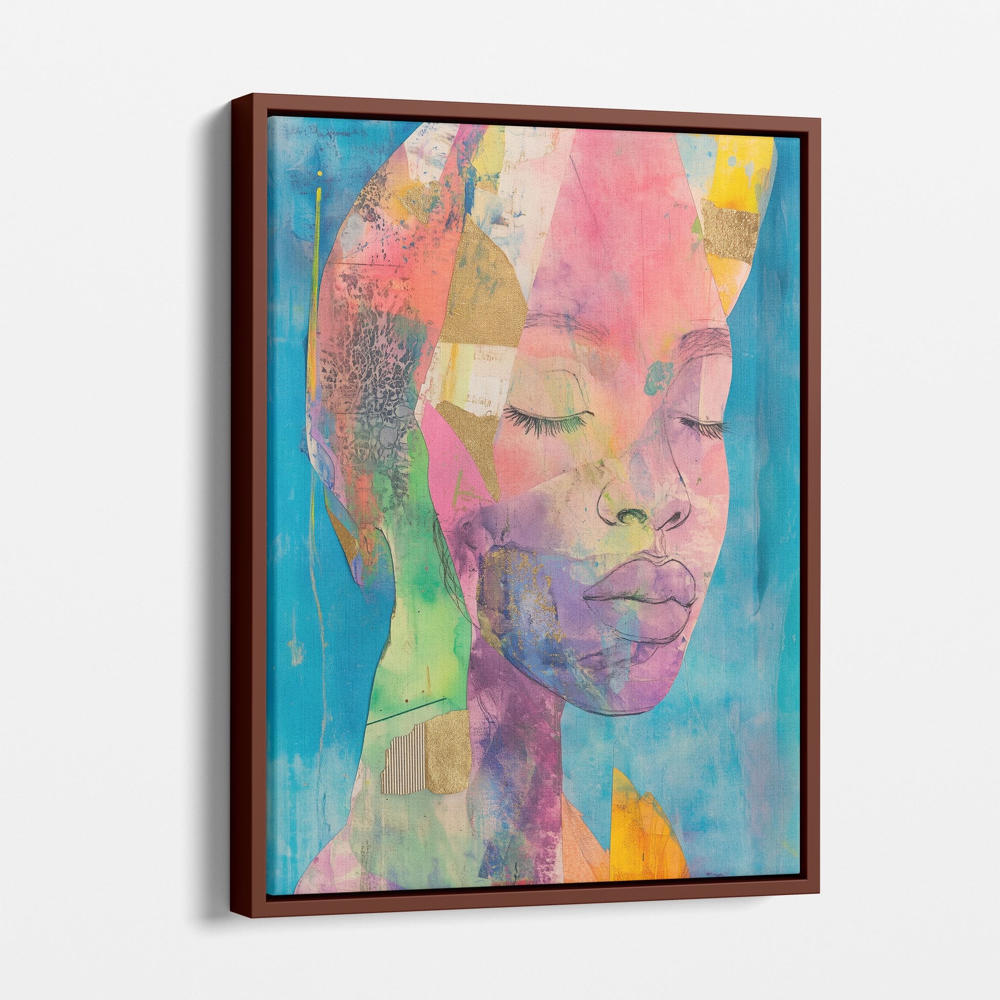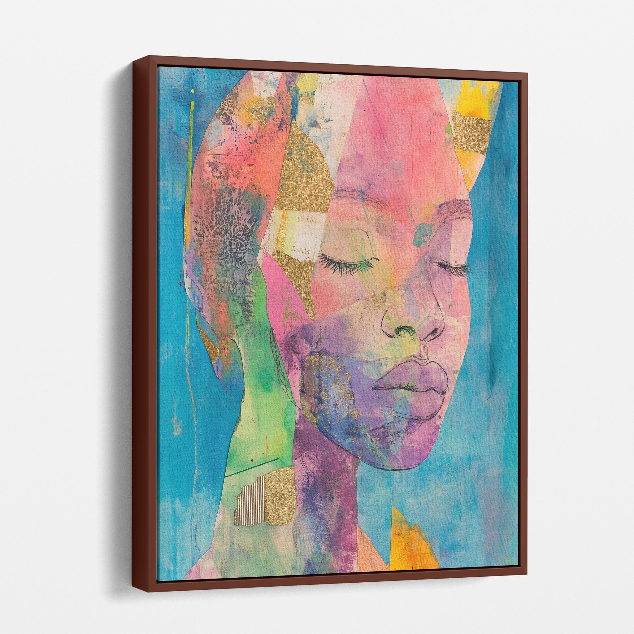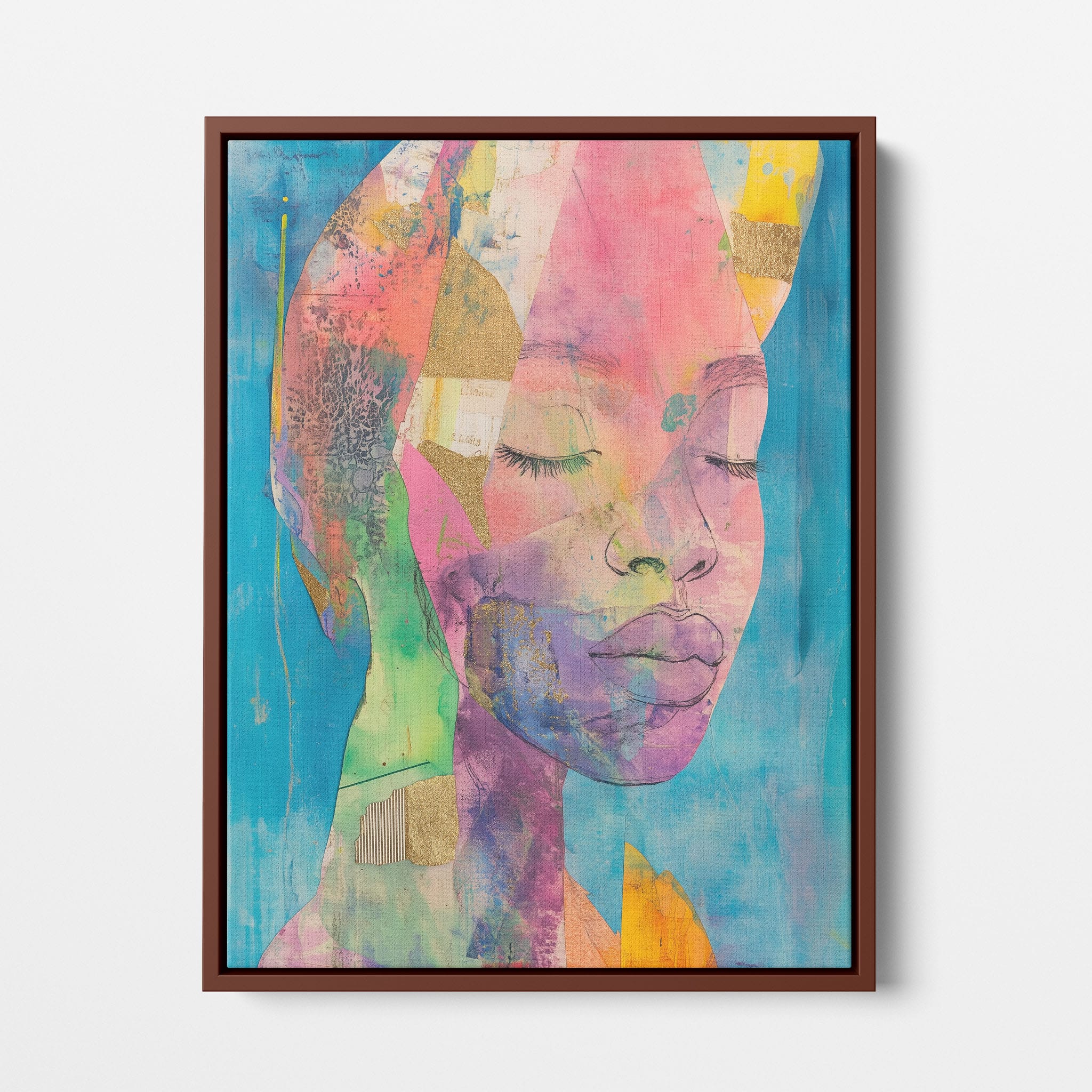 This striking artwork captures an ethereal portrait overlaid with vibrant patches and abstract textures, creating a visually intriguing mix of colors and forms. The mixed media technique adds depth and uniqueness, employing elements that flirt with surrealism and abstraction. Bold pinks mingle with serene blues, underlined by touches of gold — a palette that evokes emotion and thought. This piece is perfect for those who value the avant-garde in their decor, promising to be a thought-provoking centerpiece in any modern art lover’s collection. Bring this mesmerizing blend of color and form into your space today!