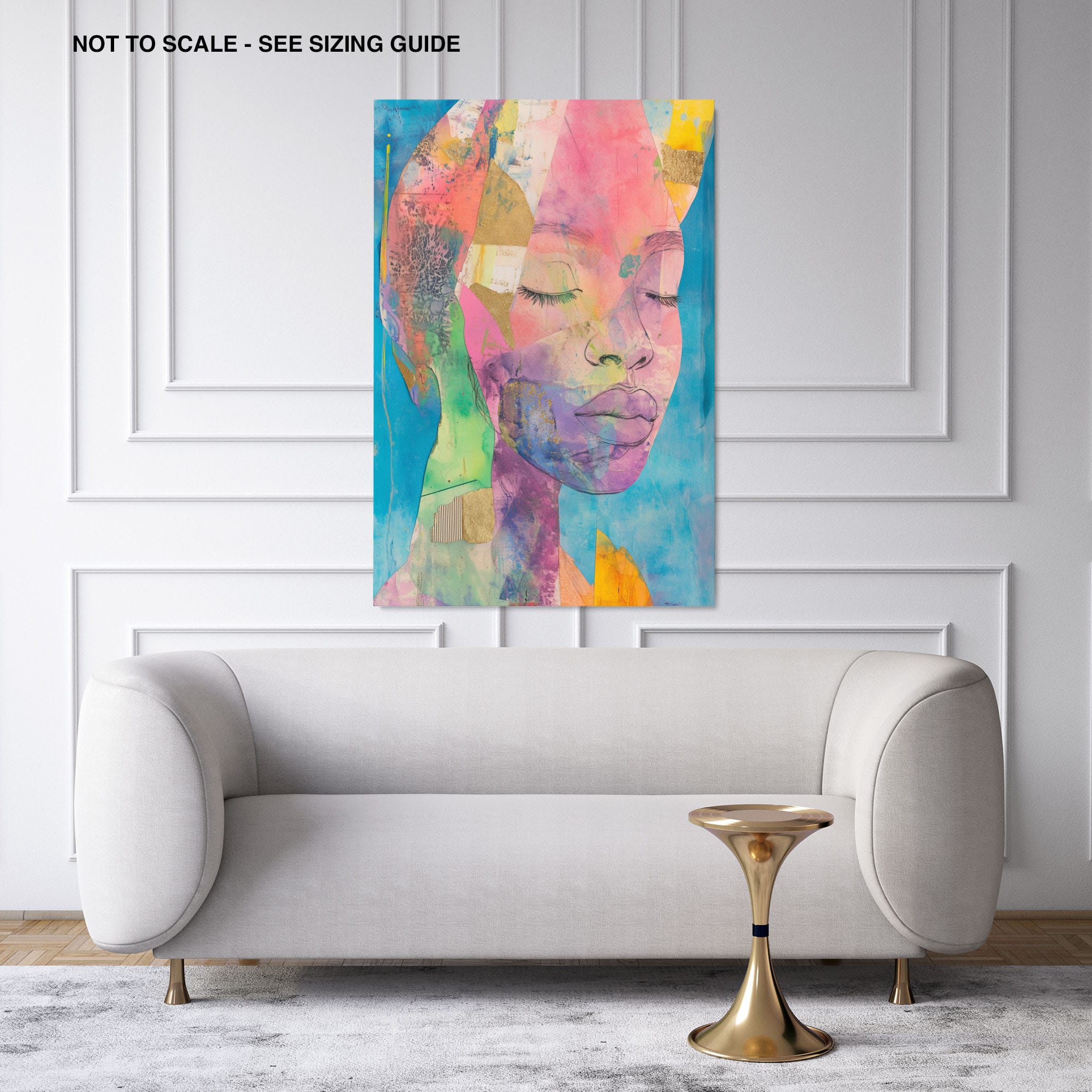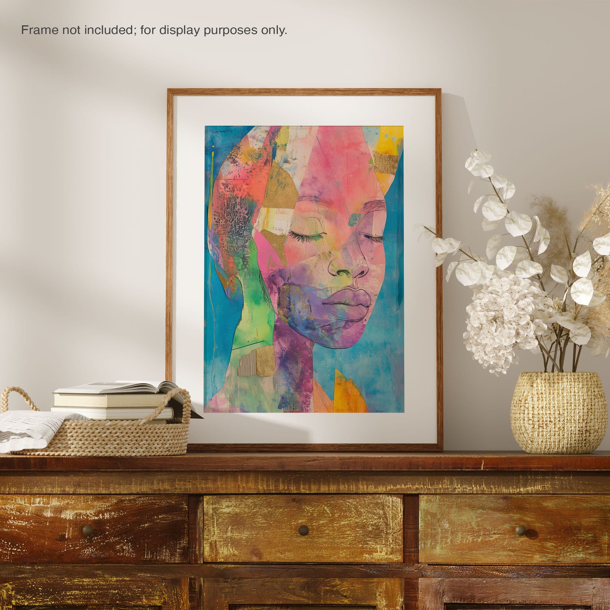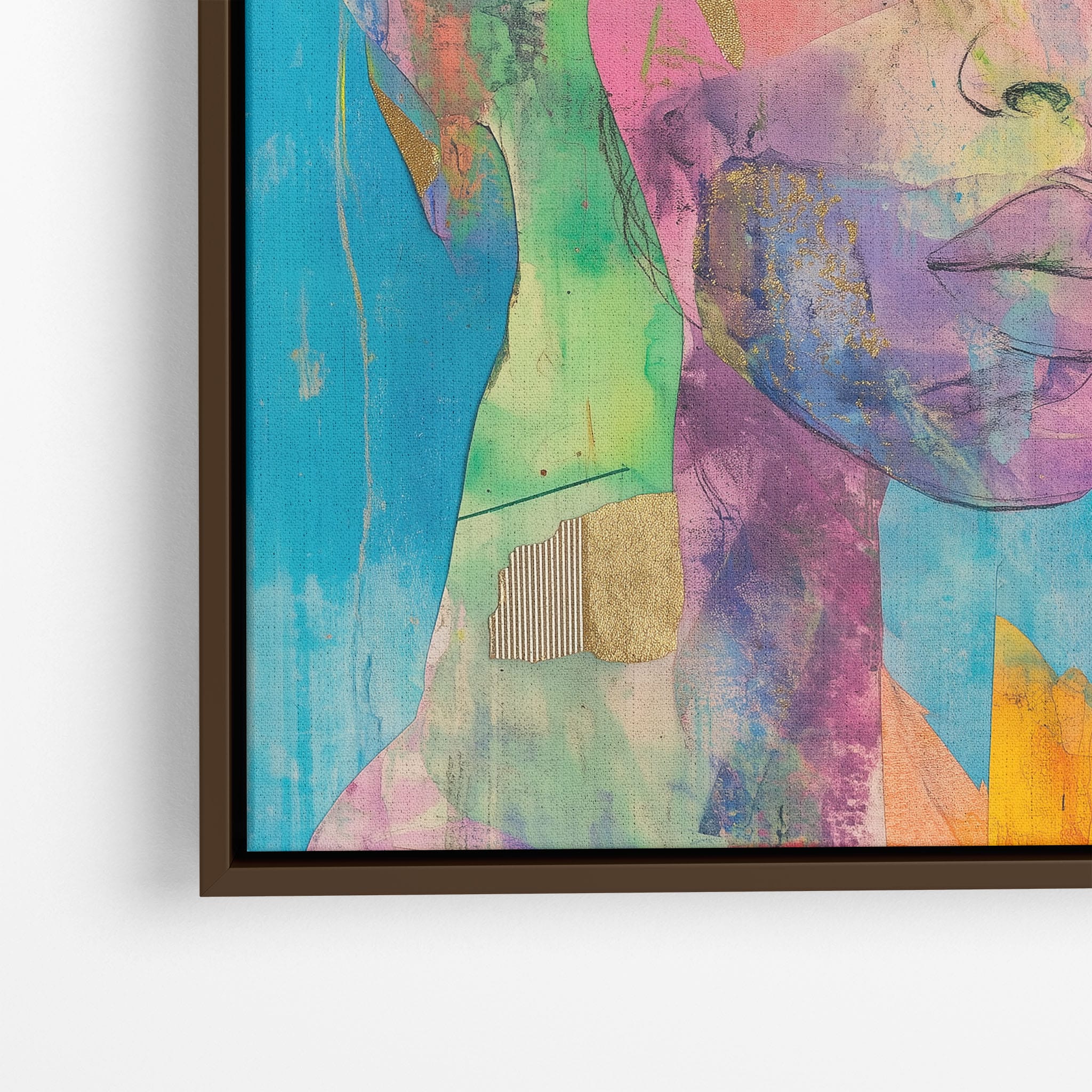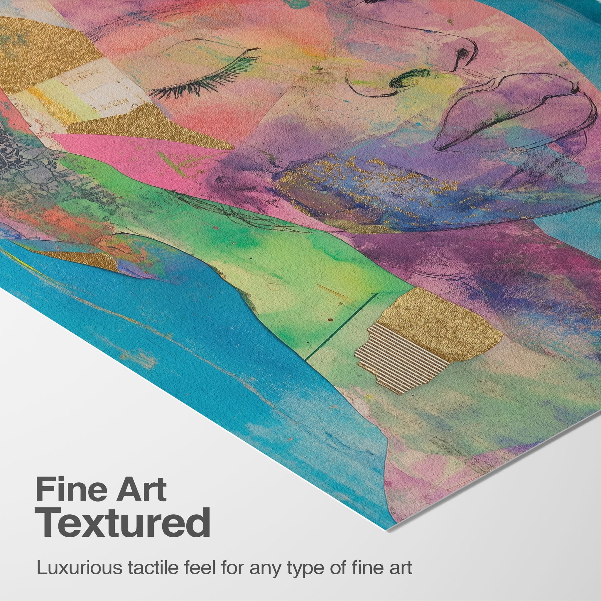 This striking artwork captures an ethereal portrait overlaid with vibrant patches and abstract textures, creating a visually intriguing mix of colors and forms. The mixed media technique adds depth and uniqueness, employing elements that flirt with surrealism and abstraction. Bold pinks mingle with serene blues, underlined by touches of gold — a palette that evokes emotion and thought. This piece is perfect for those who value the avant-garde in their decor, promising to be a thought-provoking centerpiece in any modern art lover’s collection. Bring this mesmerizing blend of color and form into your space today!