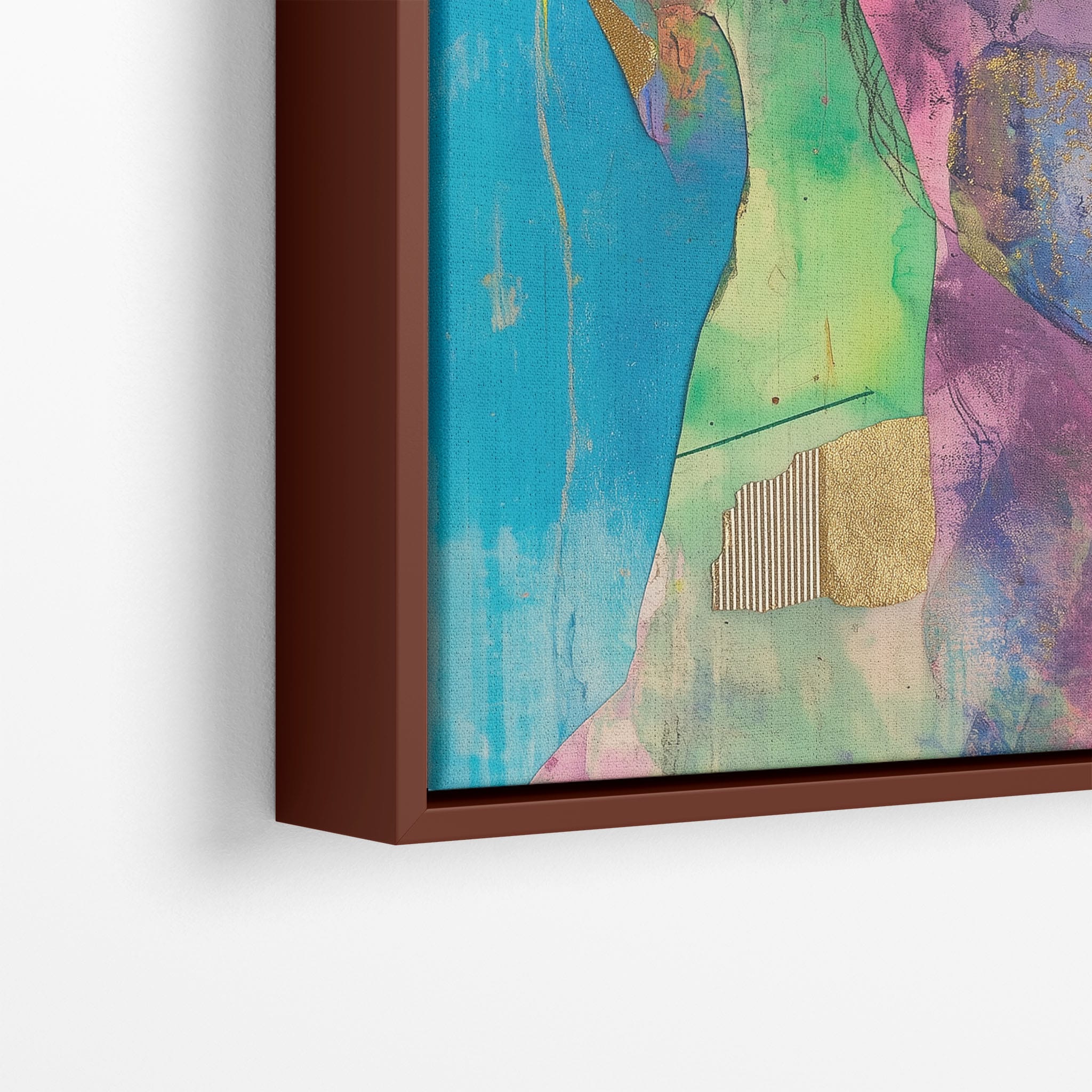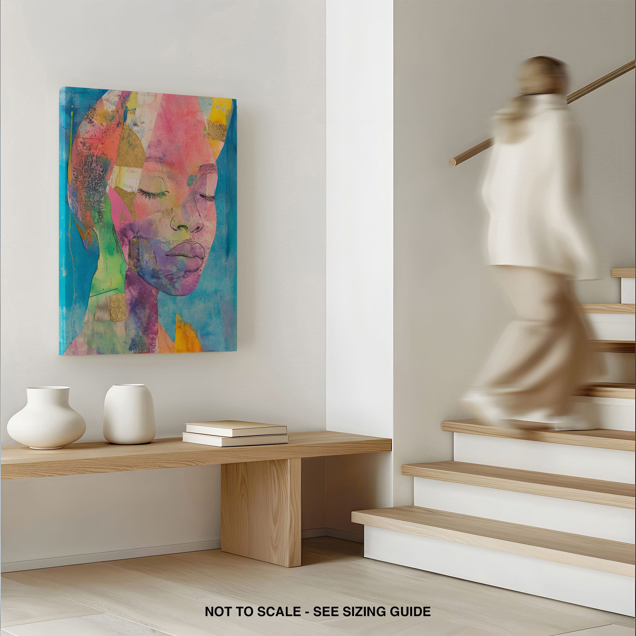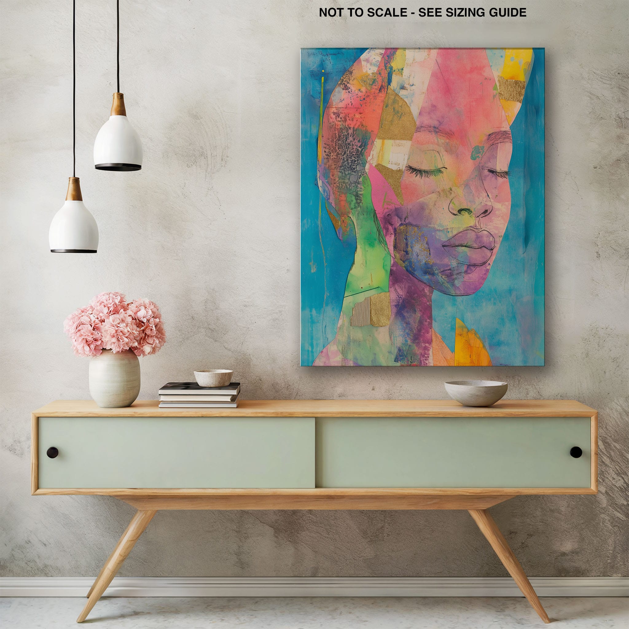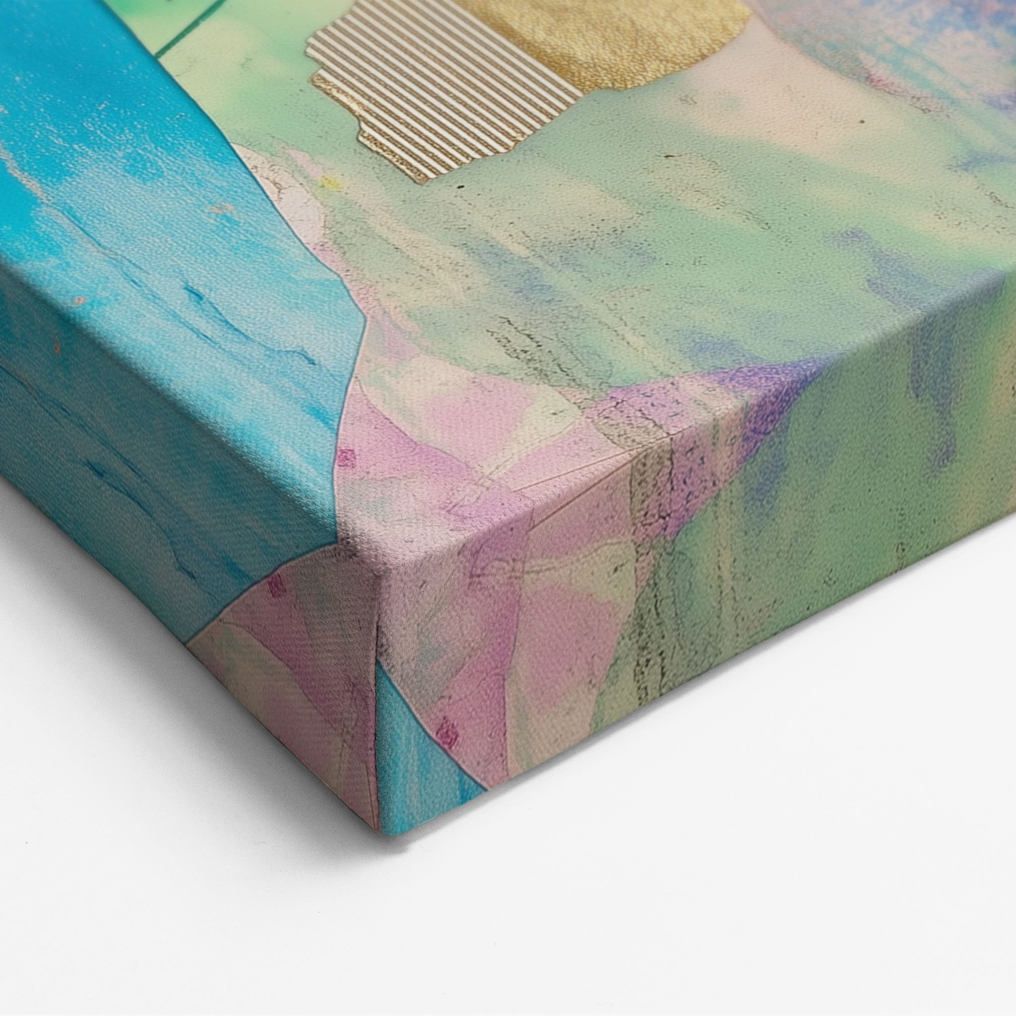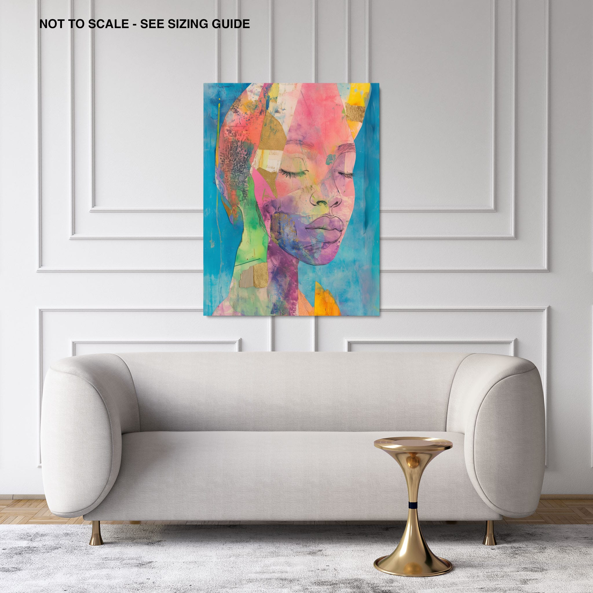 This striking artwork captures an ethereal portrait overlaid with vibrant patches and abstract textures, creating a visually intriguing mix of colors and forms. The mixed media technique adds depth and uniqueness, employing elements that flirt with surrealism and abstraction. Bold pinks mingle with serene blues, underlined by touches of gold — a palette that evokes emotion and thought. This piece is perfect for those who value the avant-garde in their decor, promising to be a thought-provoking centerpiece in any modern art lover’s collection. Bring this mesmerizing blend of color and form into your space today!