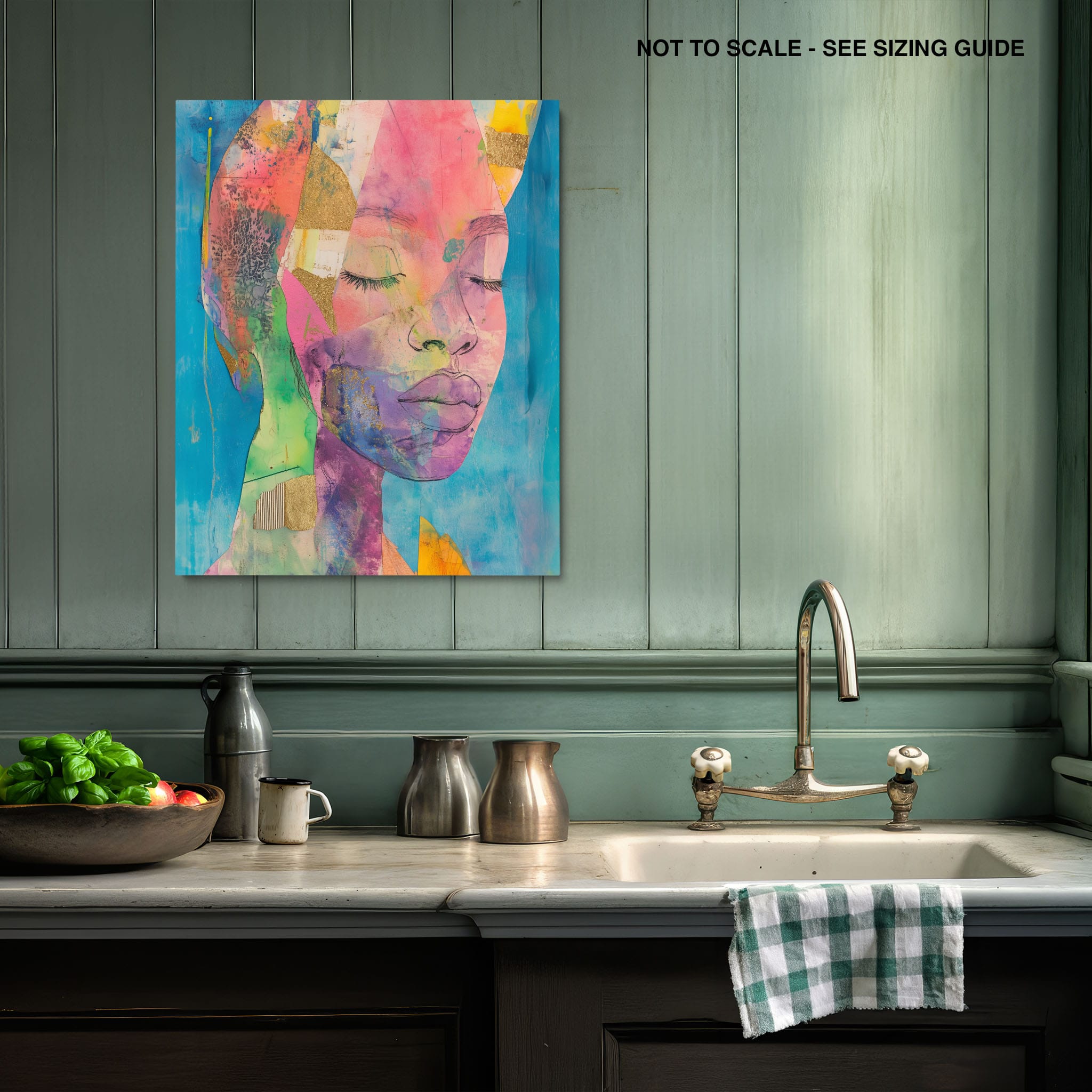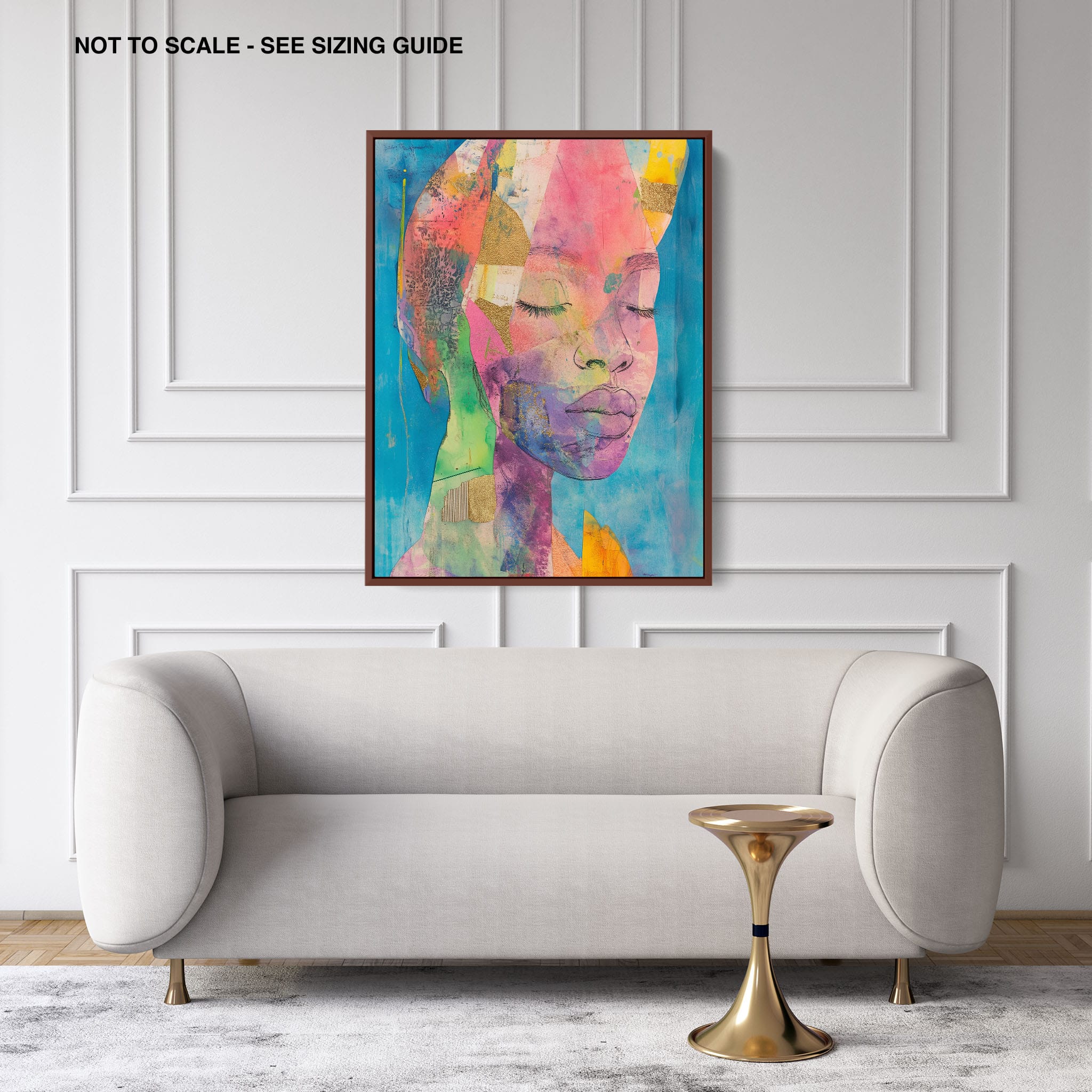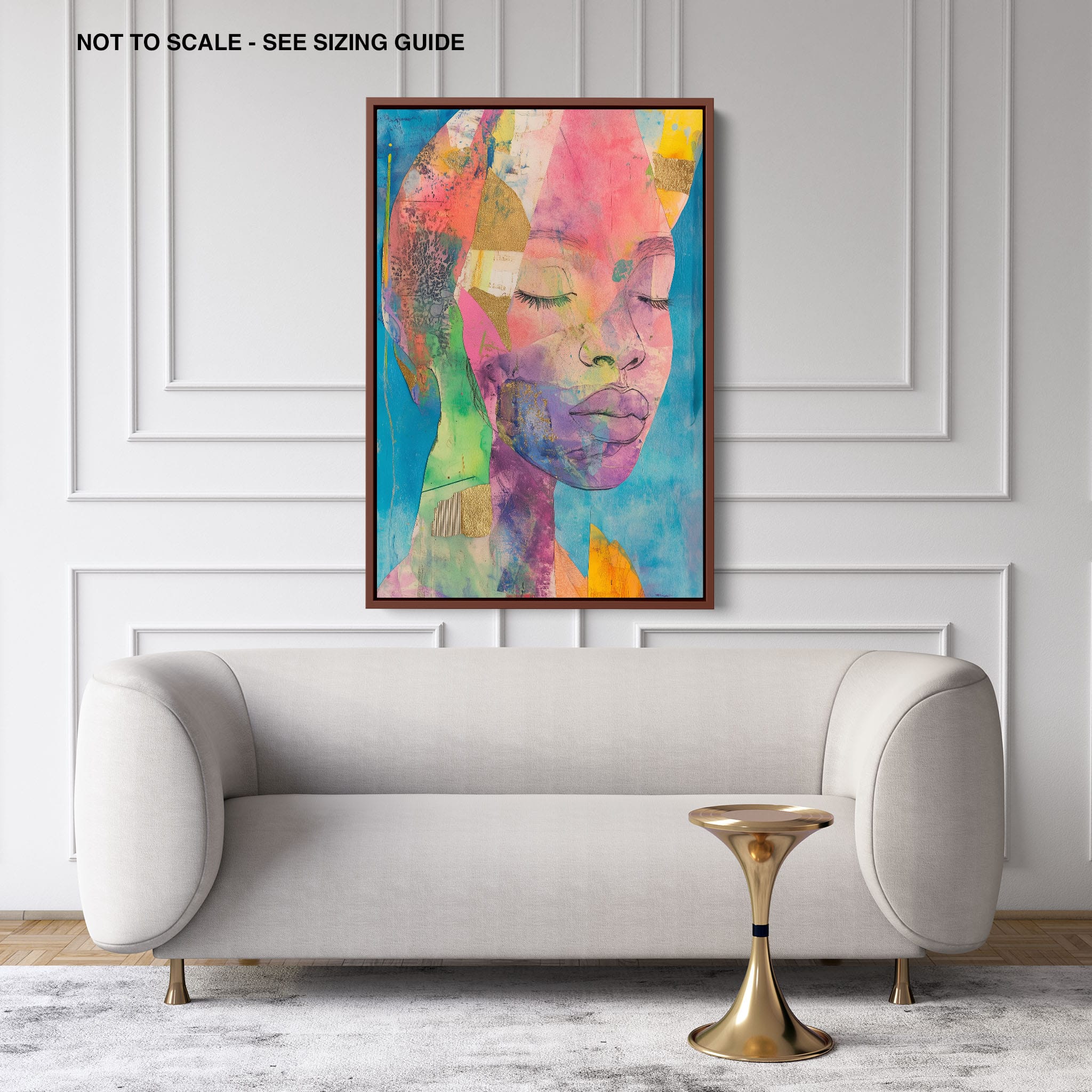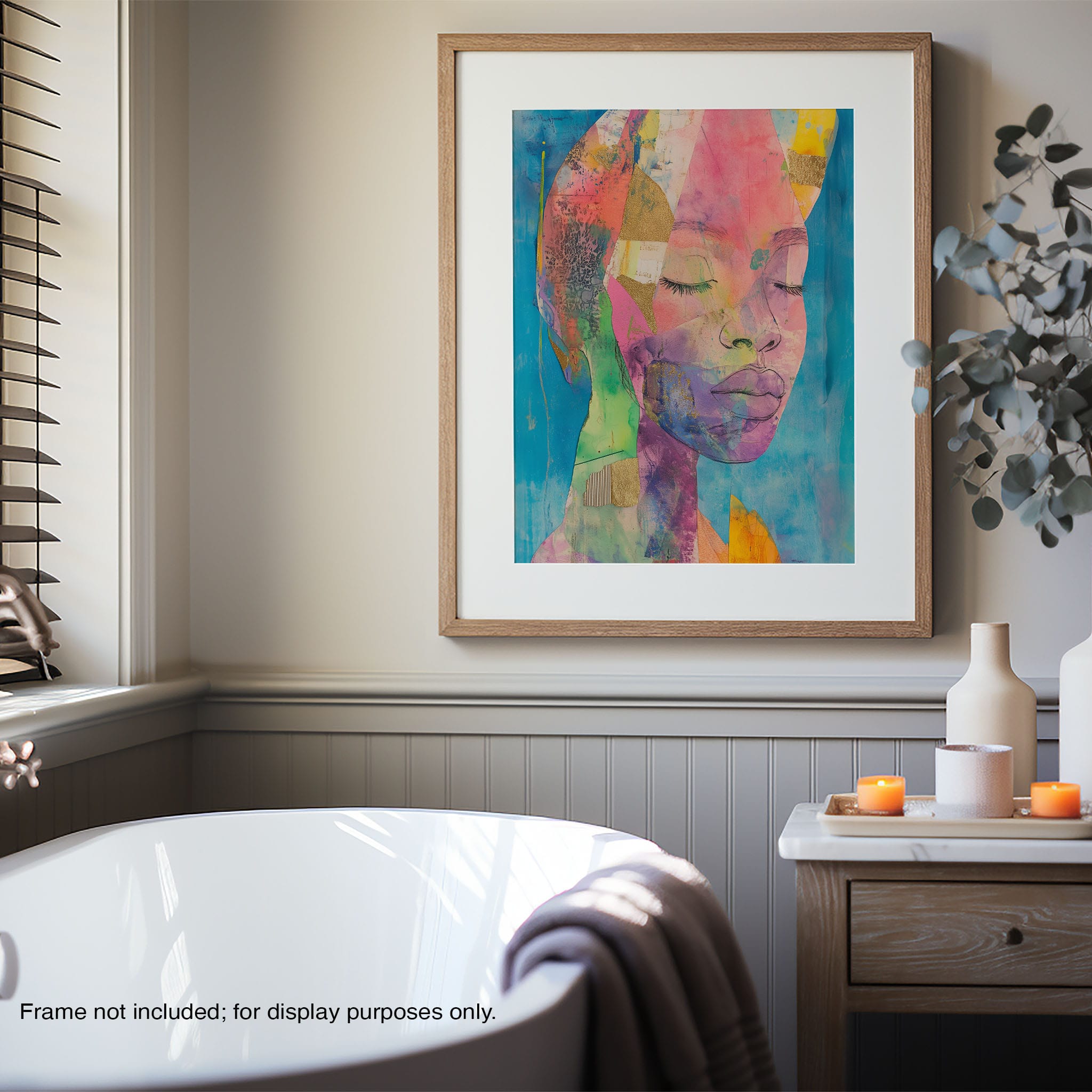 This striking artwork captures an ethereal portrait overlaid with vibrant patches and abstract textures, creating a visually intriguing mix of colors and forms. The mixed media technique adds depth and uniqueness, employing elements that flirt with surrealism and abstraction. Bold pinks mingle with serene blues, underlined by touches of gold — a palette that evokes emotion and thought. This piece is perfect for those who value the avant-garde in their decor, promising to be a thought-provoking centerpiece in any modern art lover’s collection. Bring this mesmerizing blend of color and form into your space today!