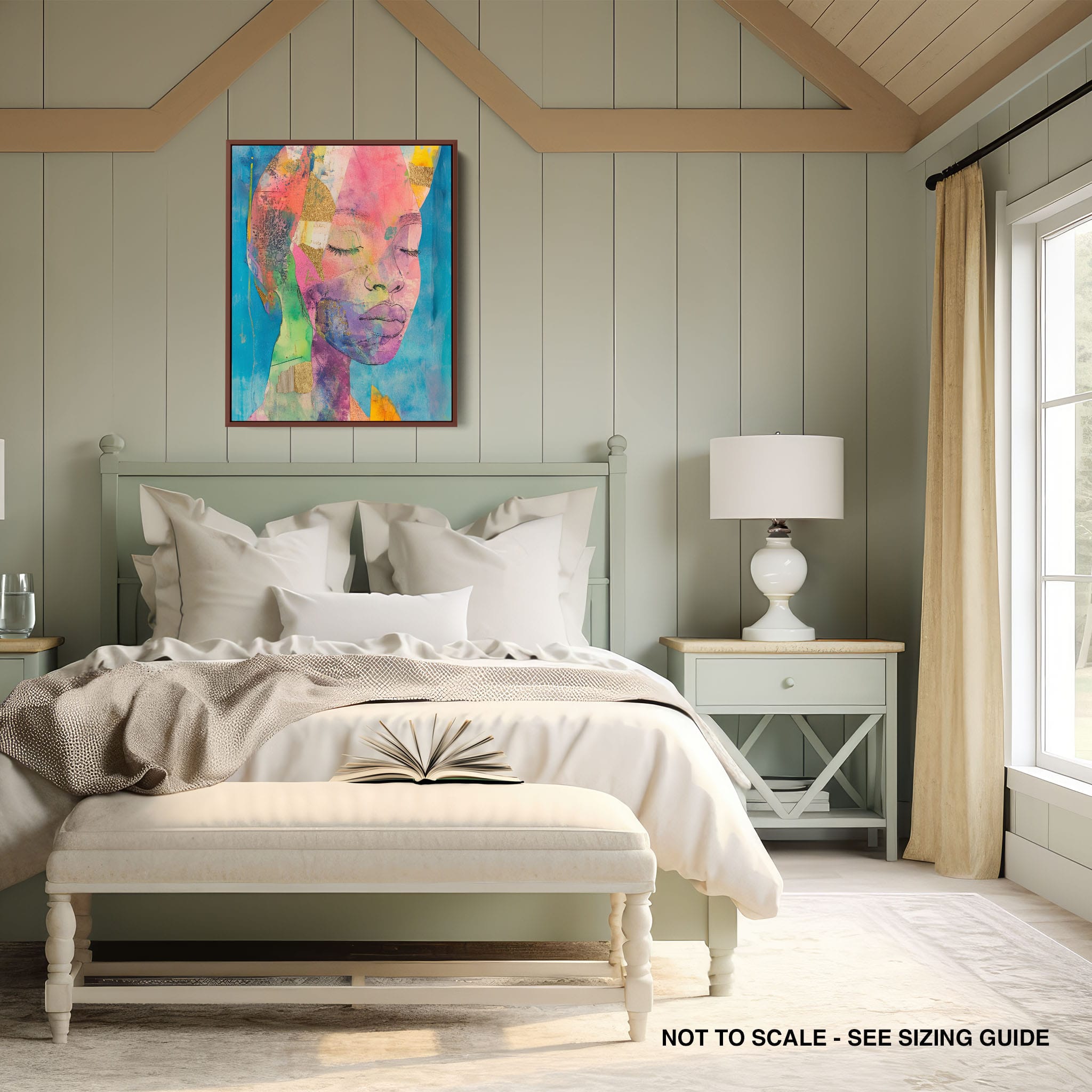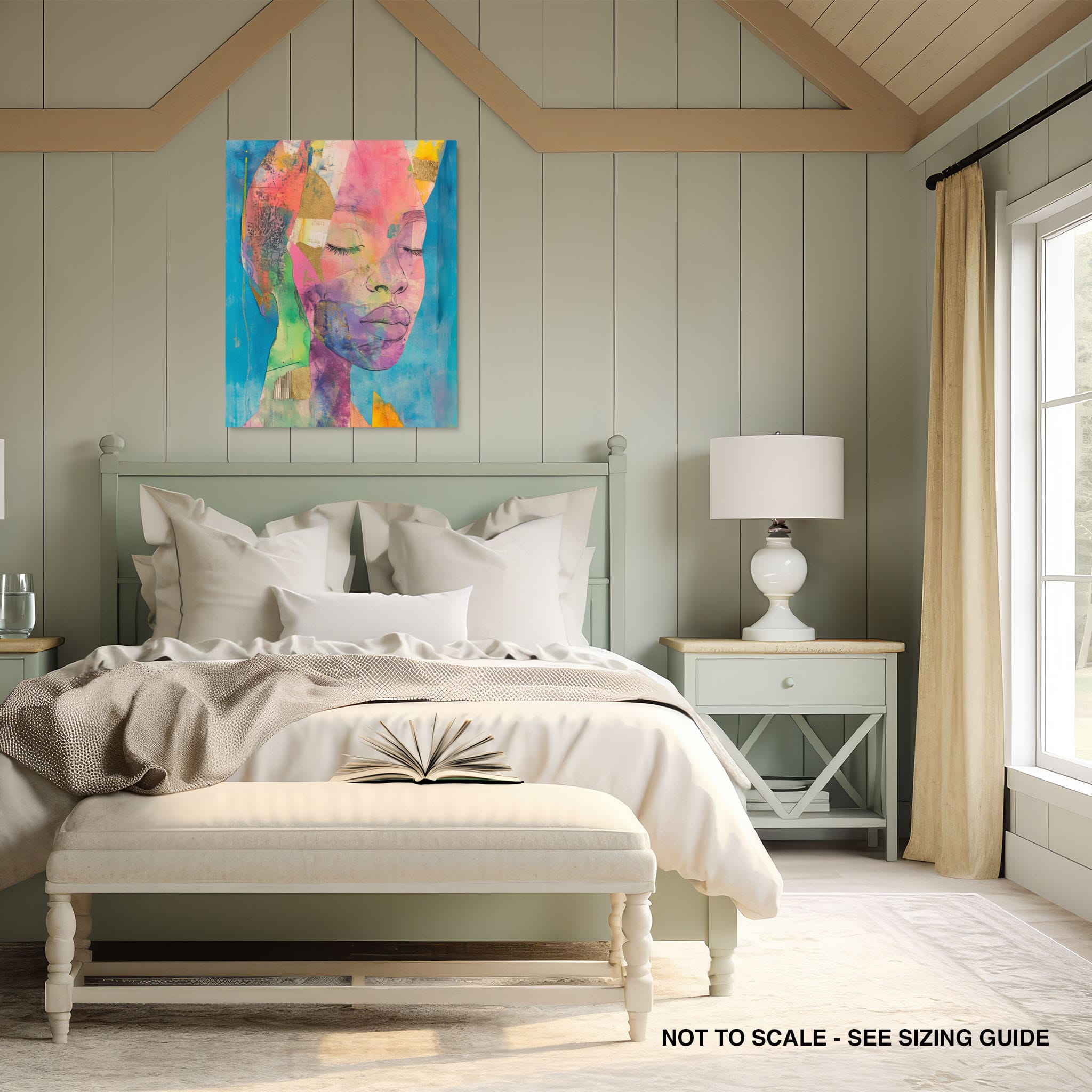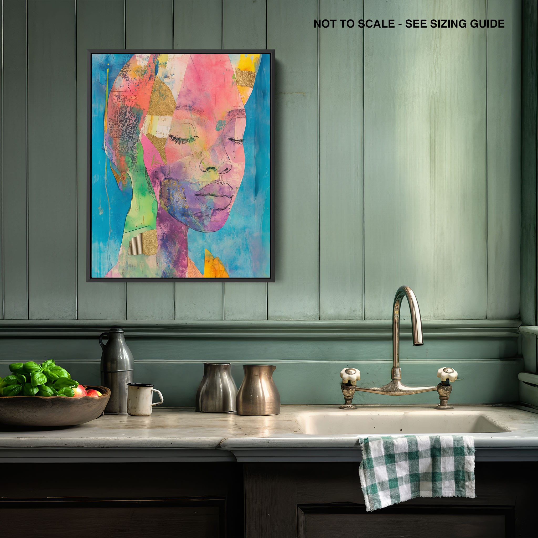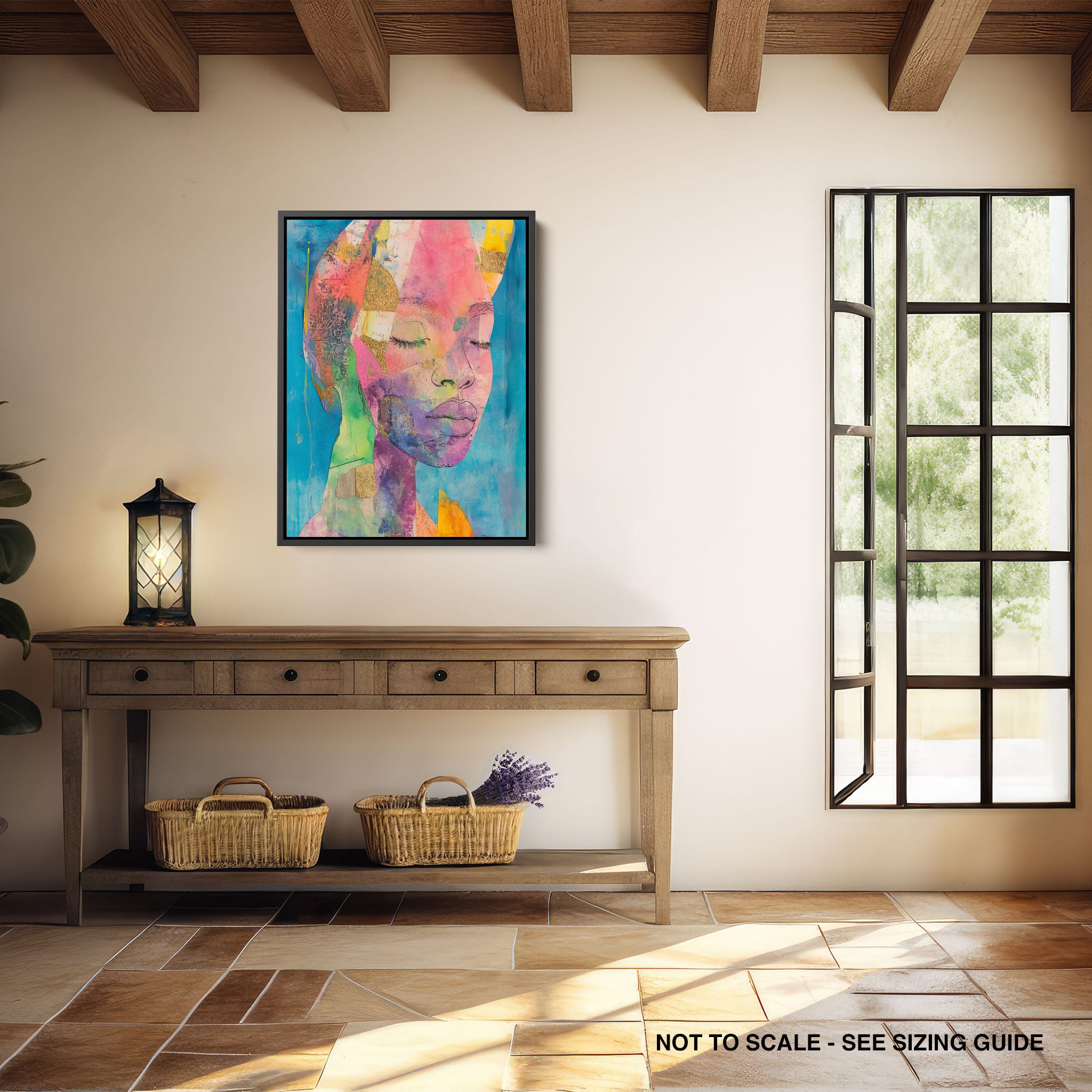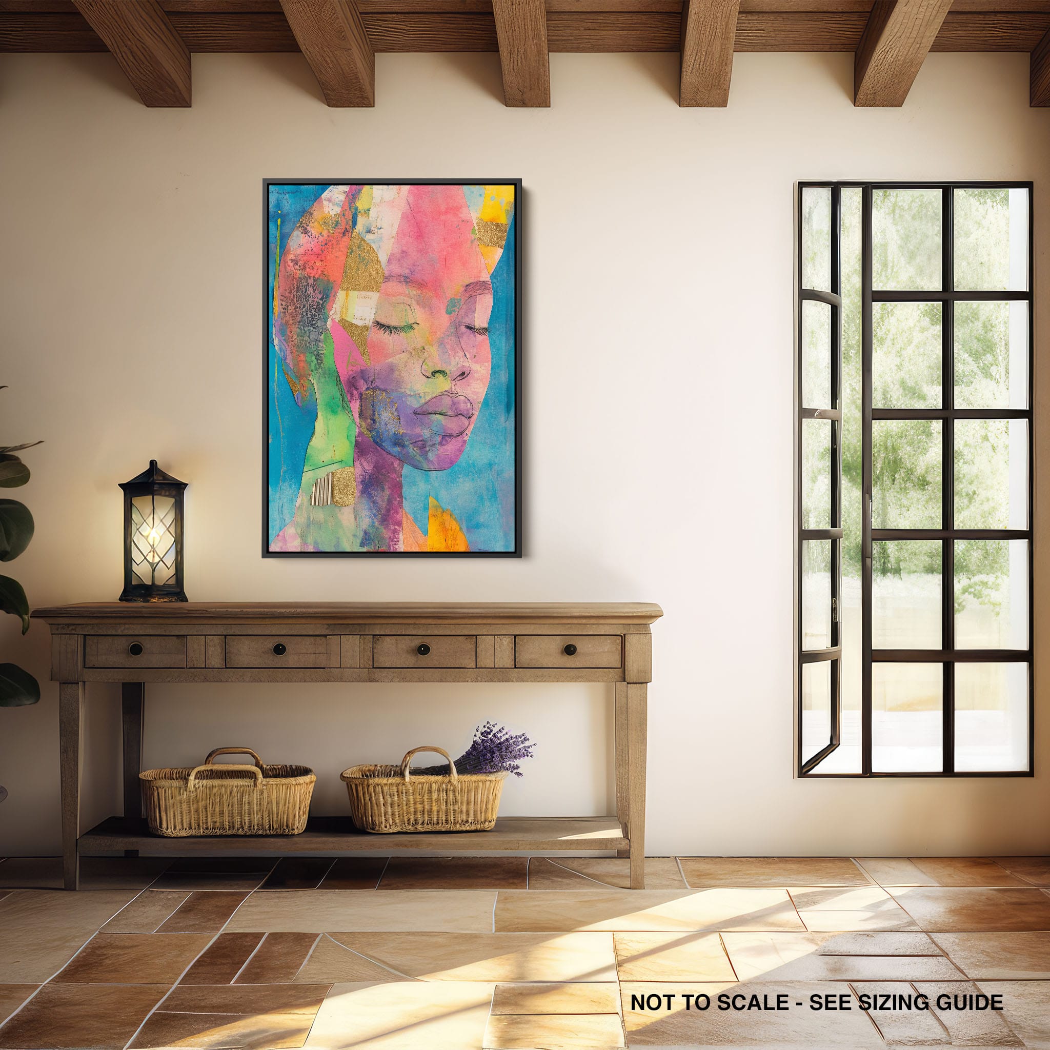 This striking artwork captures an ethereal portrait overlaid with vibrant patches and abstract textures, creating a visually intriguing mix of colors and forms. The mixed media technique adds depth and uniqueness, employing elements that flirt with surrealism and abstraction. Bold pinks mingle with serene blues, underlined by touches of gold — a palette that evokes emotion and thought. This piece is perfect for those who value the avant-garde in their decor, promising to be a thought-provoking centerpiece in any modern art lover’s collection. Bring this mesmerizing blend of color and form into your space today!