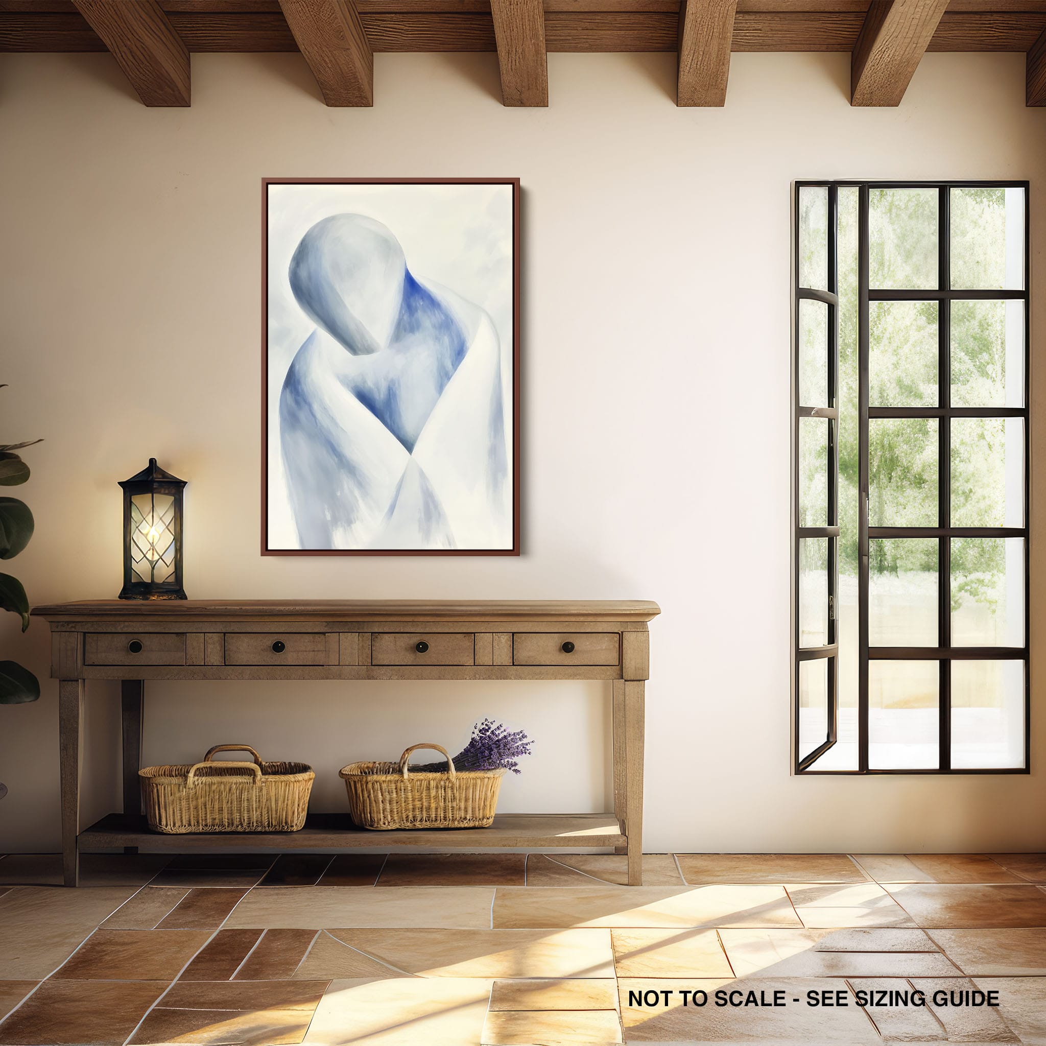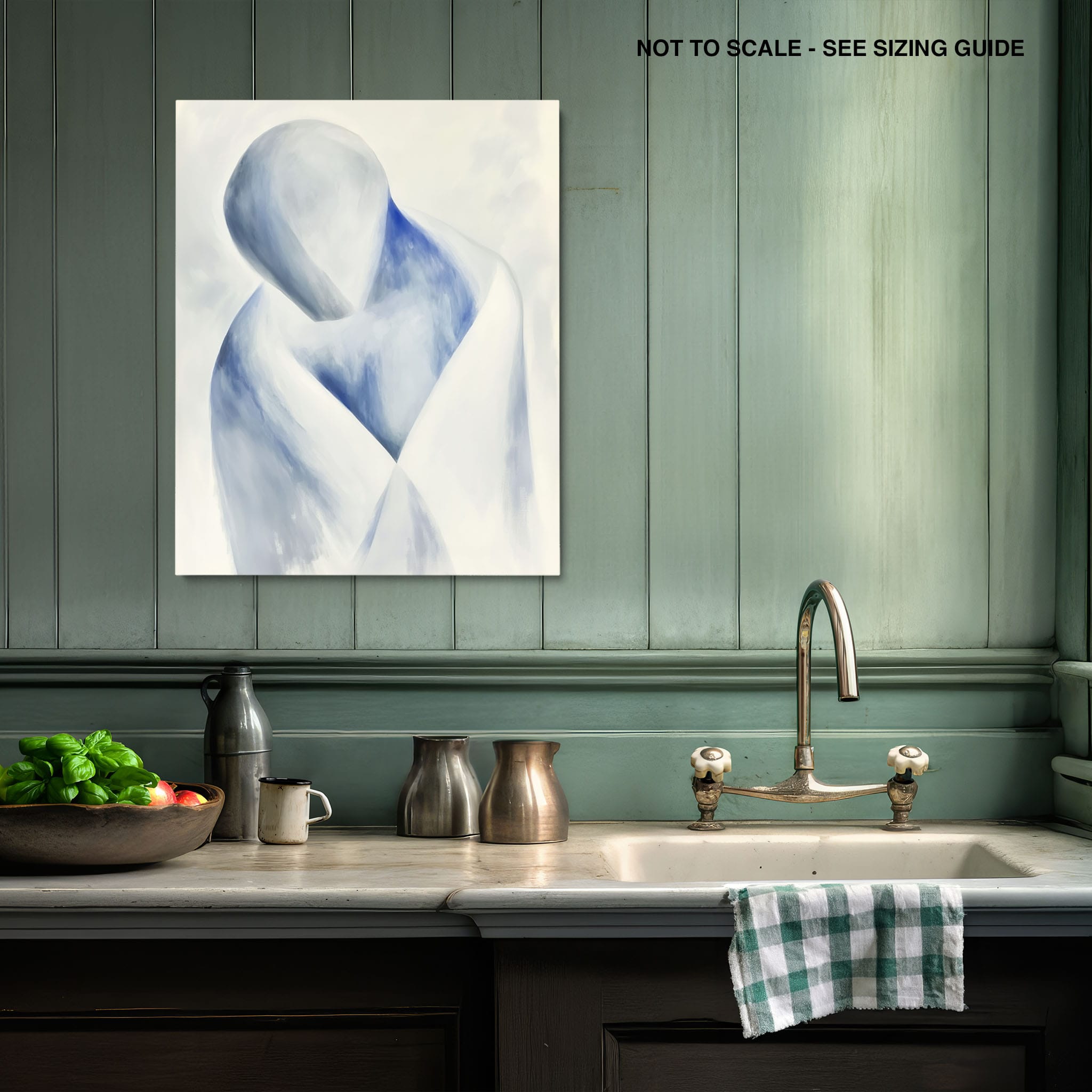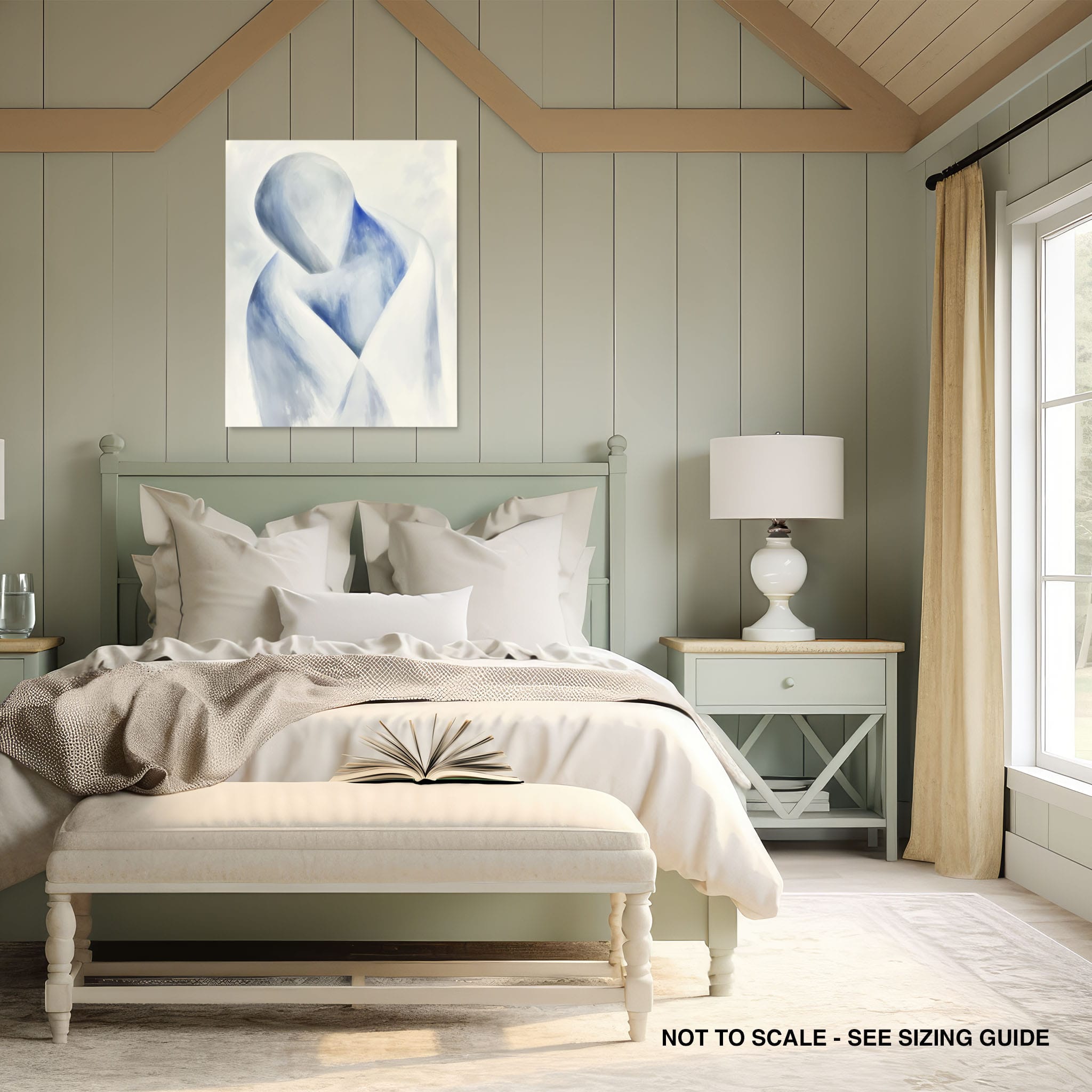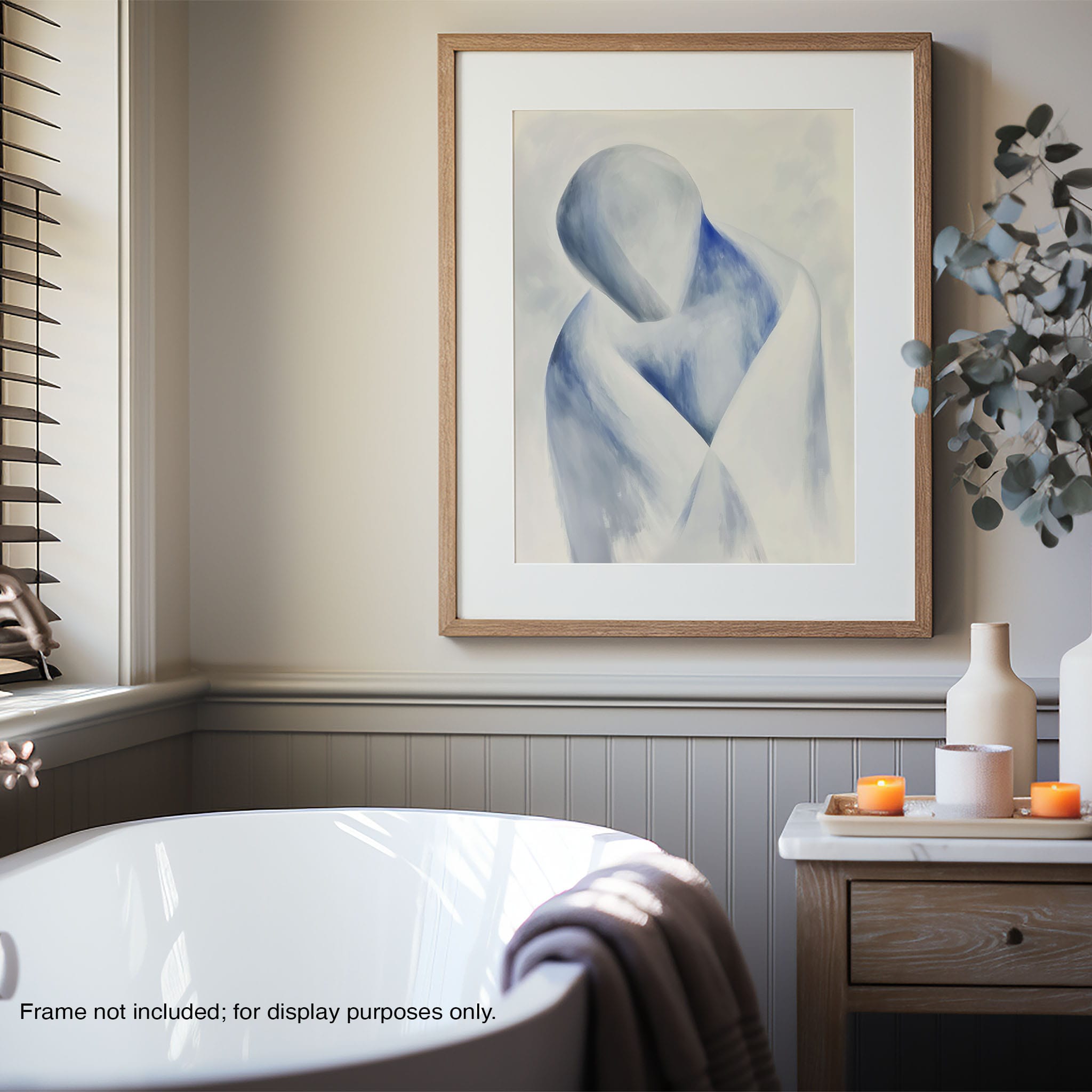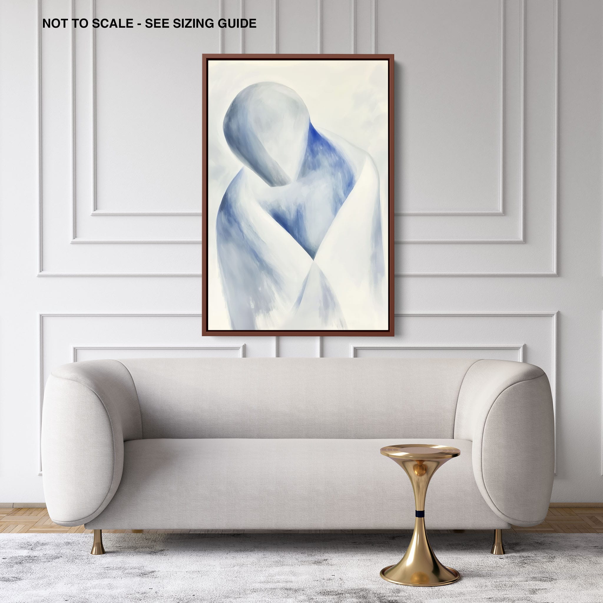 This striking painting features a soft, abstract depiction of a human figure enveloped in hues of calming blue and neutral whites, suggesting a serene introspective moment. The artist skillfully employs a minimalist approach, capturing emotion and presence through uncomplicated strokes and a focused color palette. Perfect for modern home decor, this artwork invites viewers into a tranquil state of mind, enhancing any living space with its peaceful abstraction and contemporary charm. Ideal for art lovers seeking simplicity with a touch of depth in their art collection.