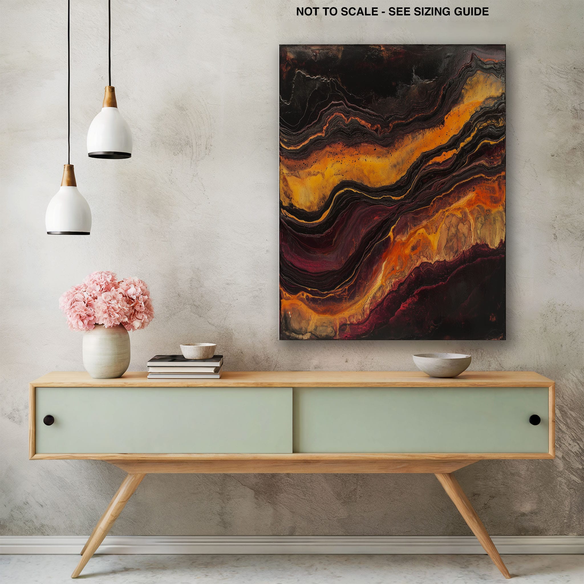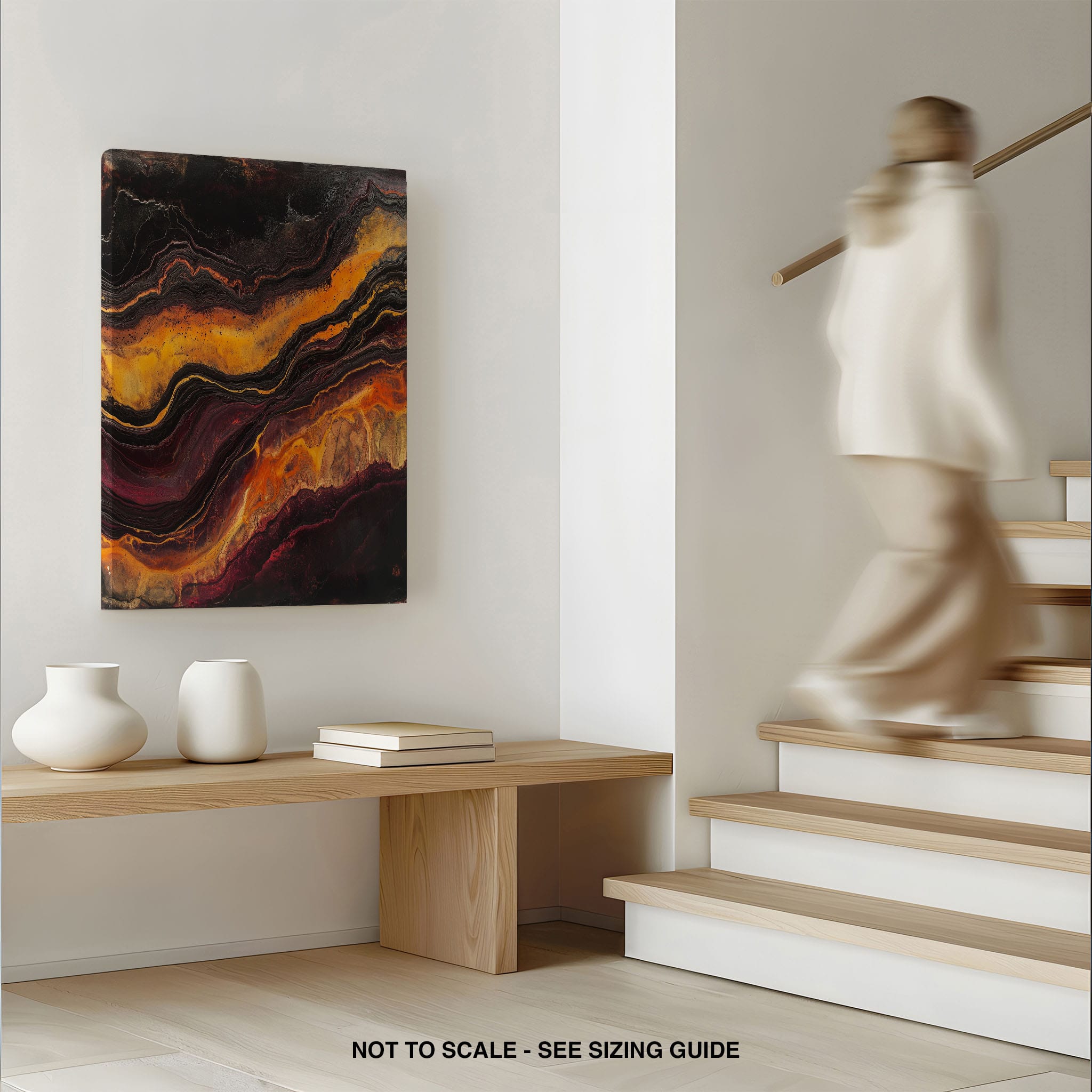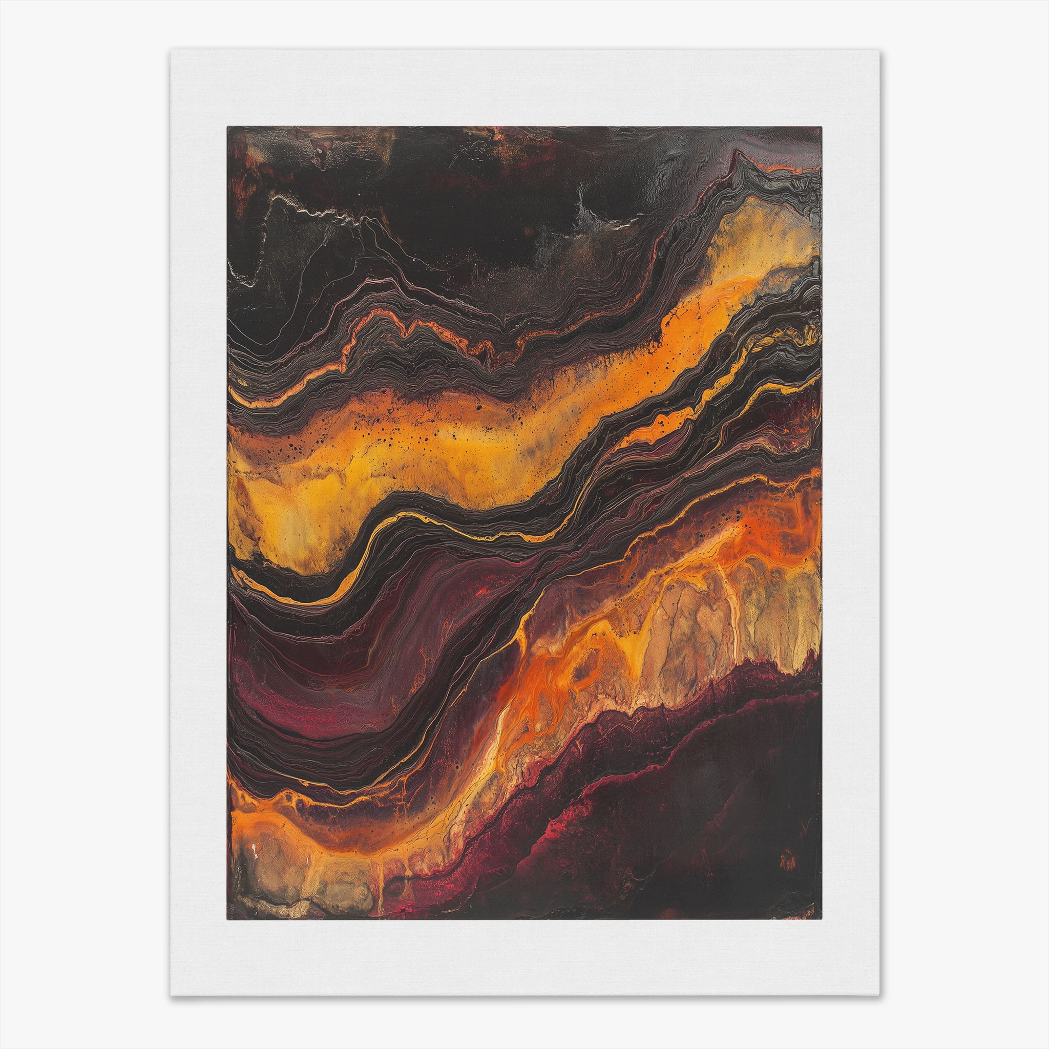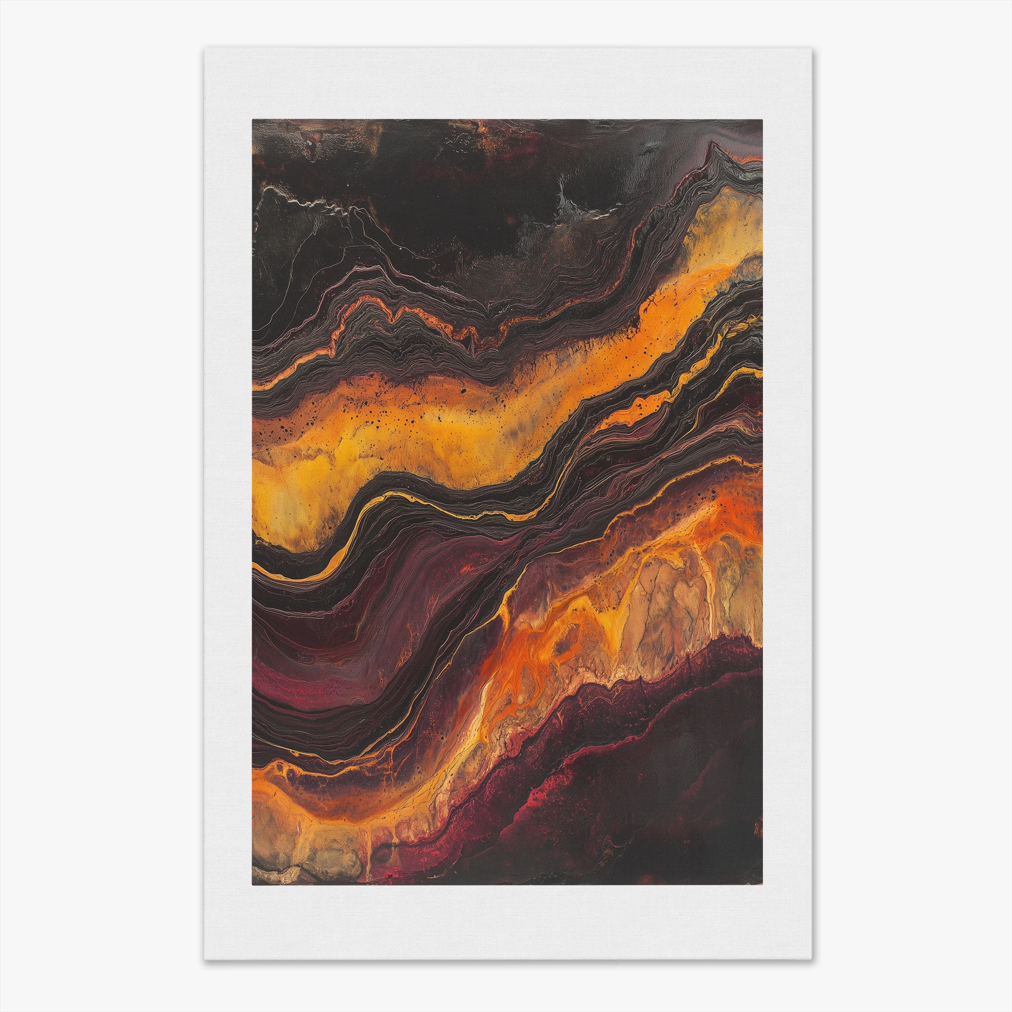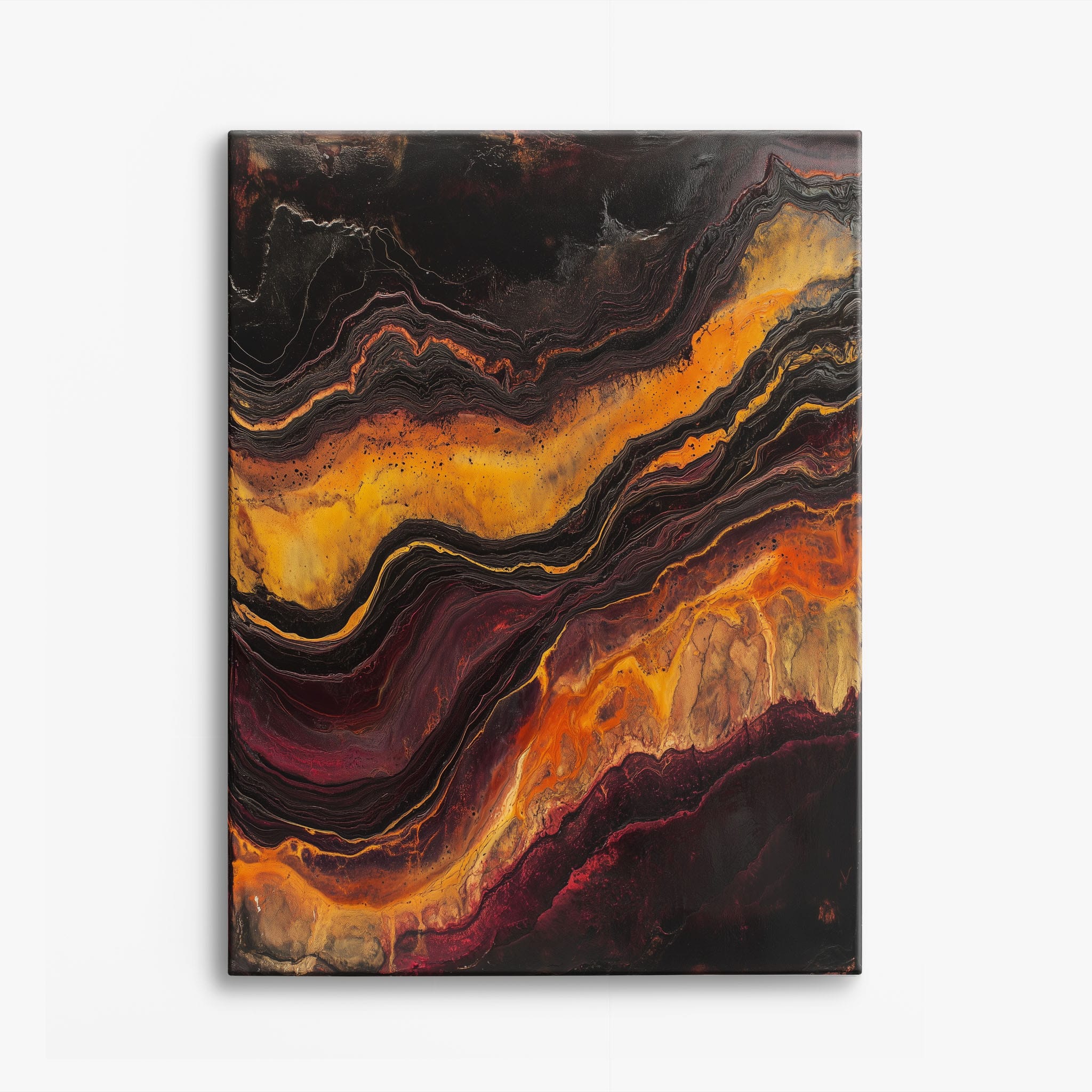 This painting captures the mysterious allure of an abstract volcanic landscape, wherein swirls of black, red, and fiery orange meld together to create a dynamic and mesmerizing view. The fluidity of the colors and the depth of the textures evoke the intense energy and beauty of natural geological formations. Perfect for art lovers looking for a bold statement piece, this artwork brings a touch of surreal heat to any space, making it an ideal centerpiece that commands attention and conversation.