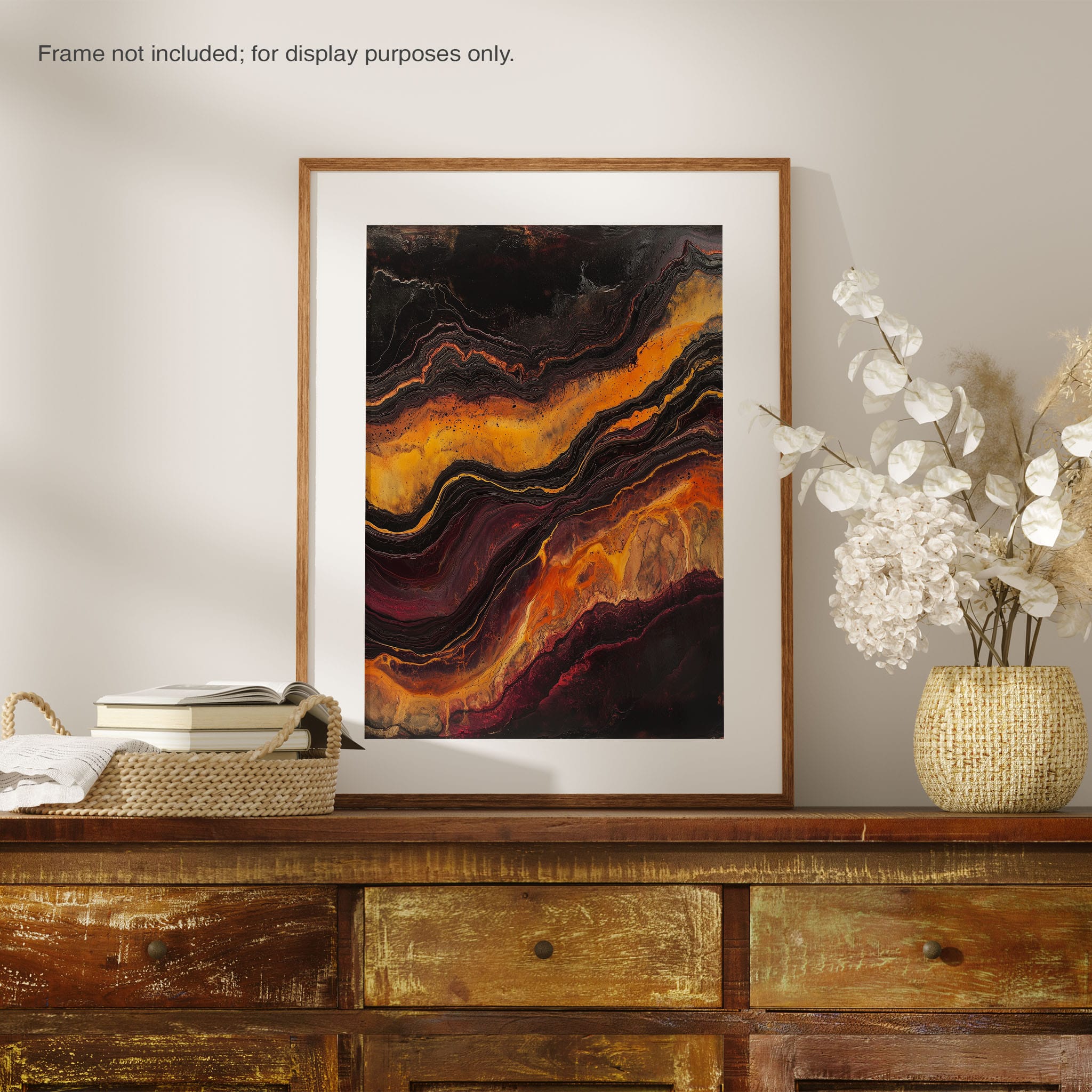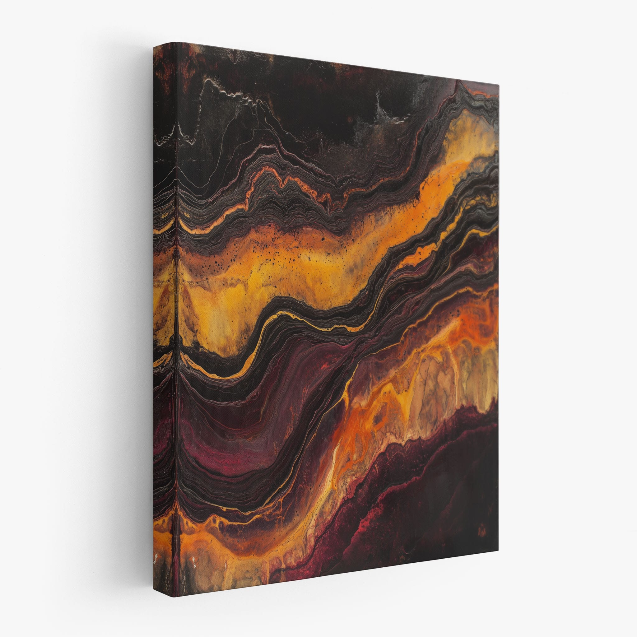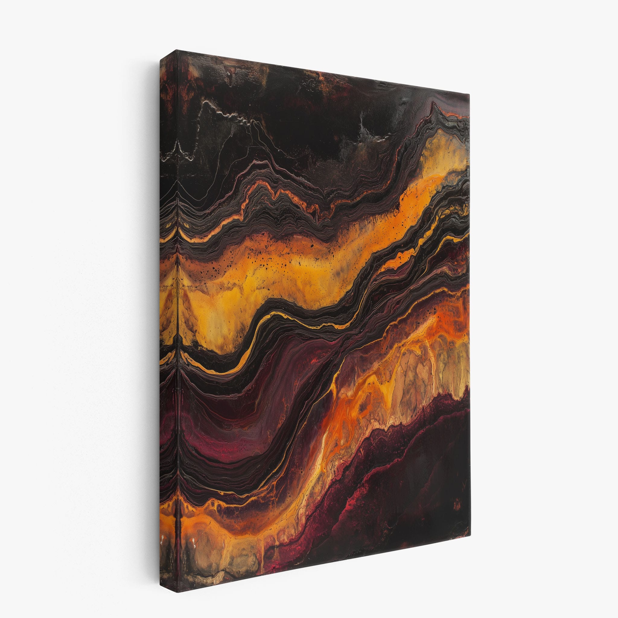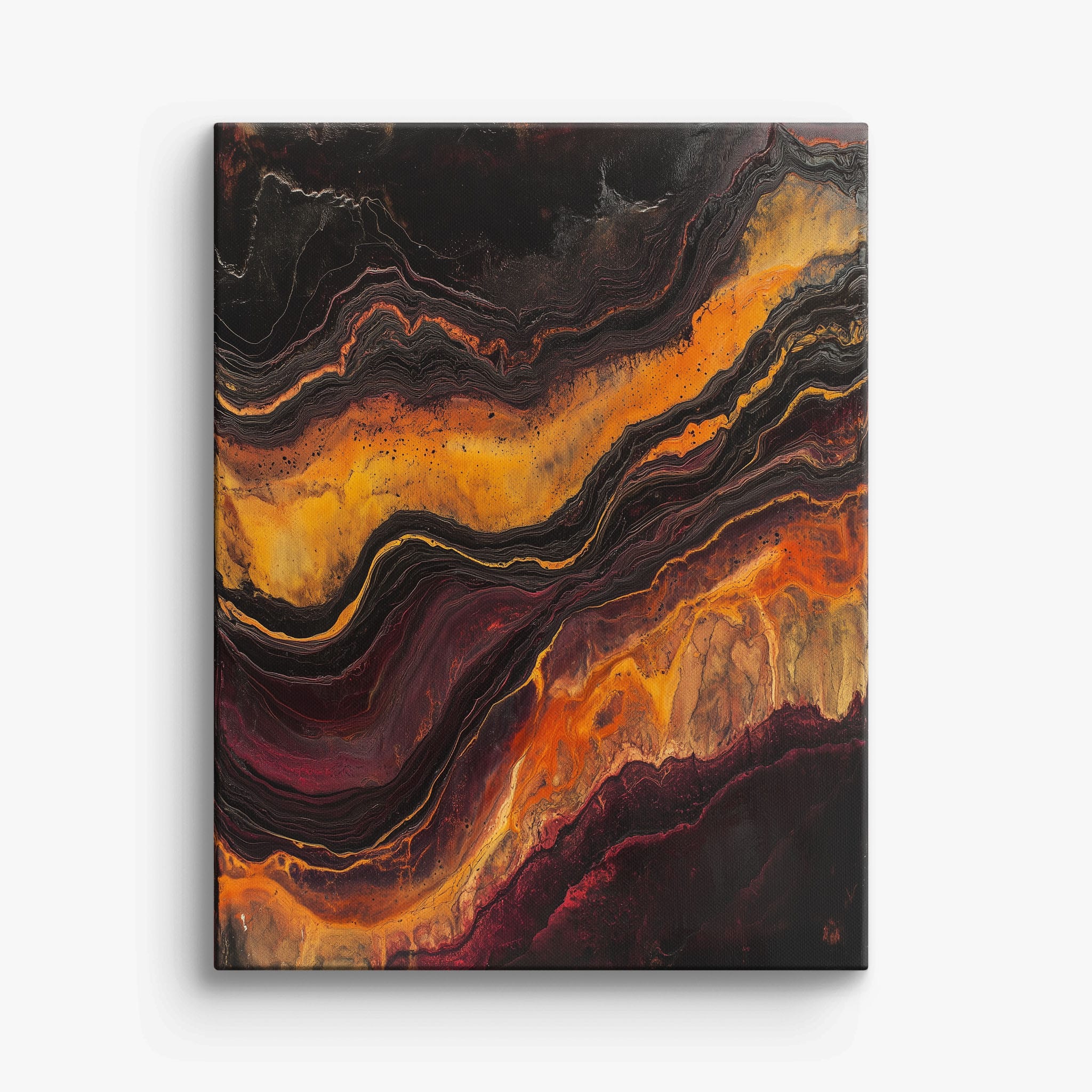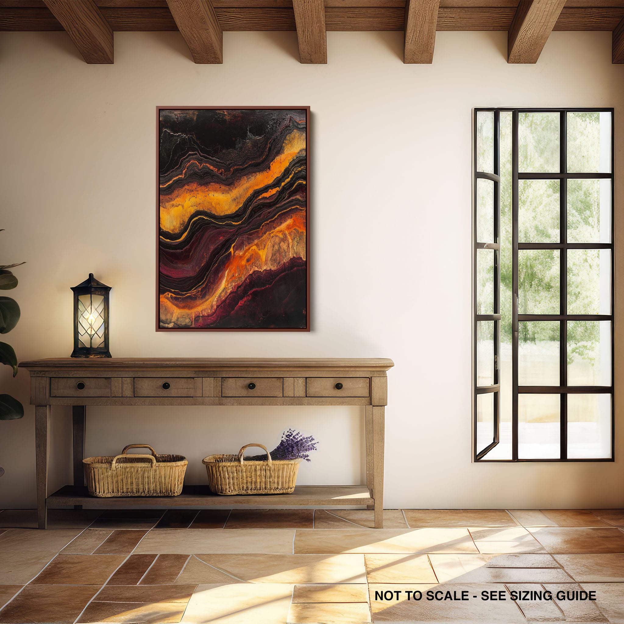 This painting captures the mysterious allure of an abstract volcanic landscape, wherein swirls of black, red, and fiery orange meld together to create a dynamic and mesmerizing view. The fluidity of the colors and the depth of the textures evoke the intense energy and beauty of natural geological formations. Perfect for art lovers looking for a bold statement piece, this artwork brings a touch of surreal heat to any space, making it an ideal centerpiece that commands attention and conversation.