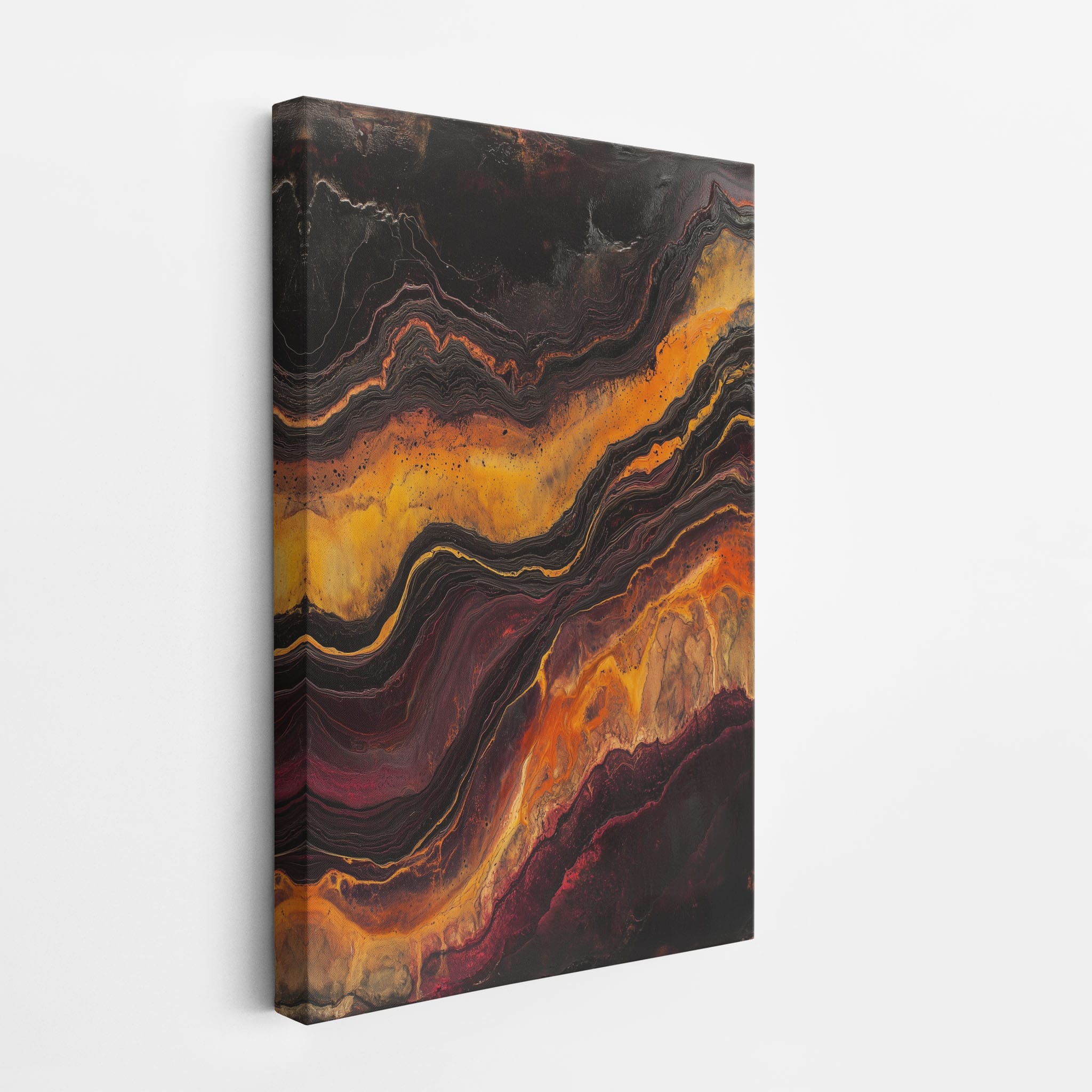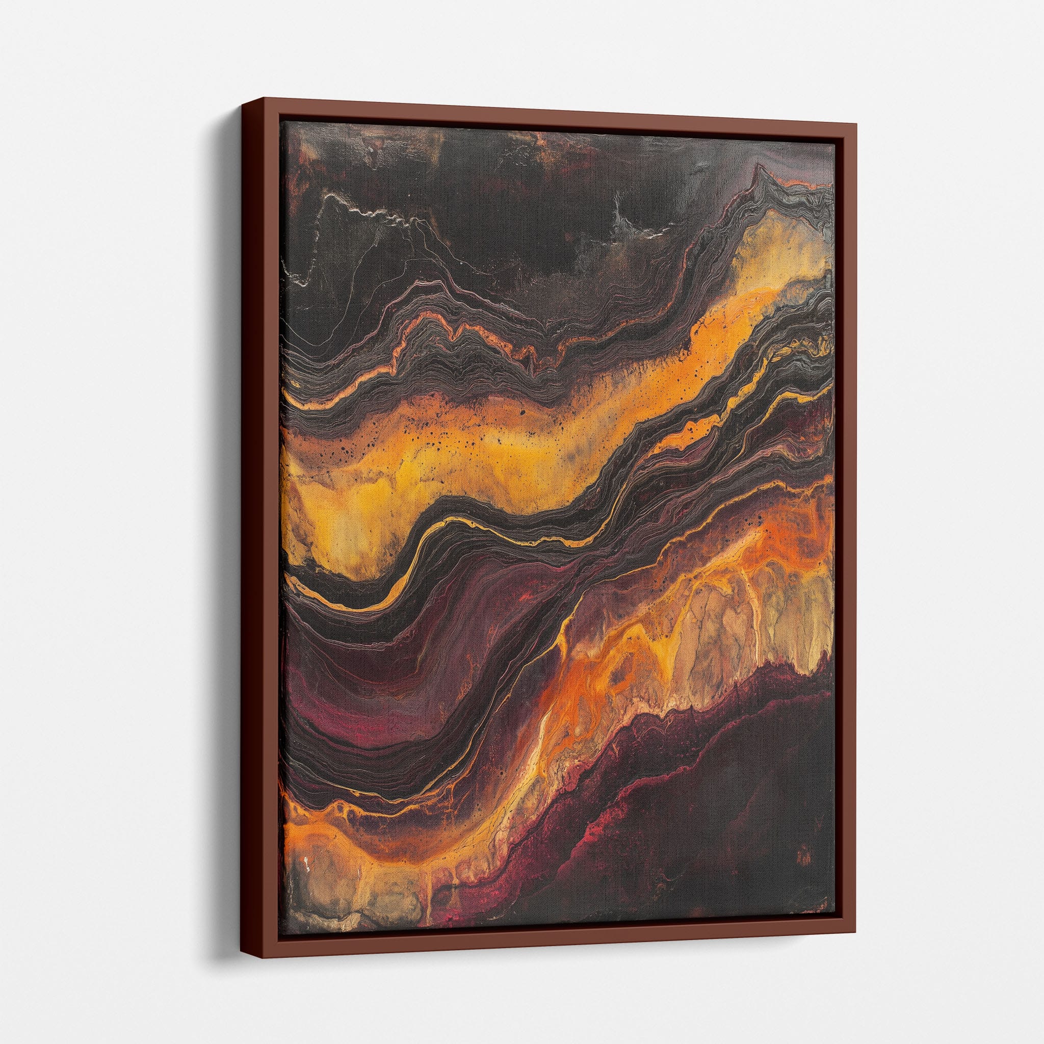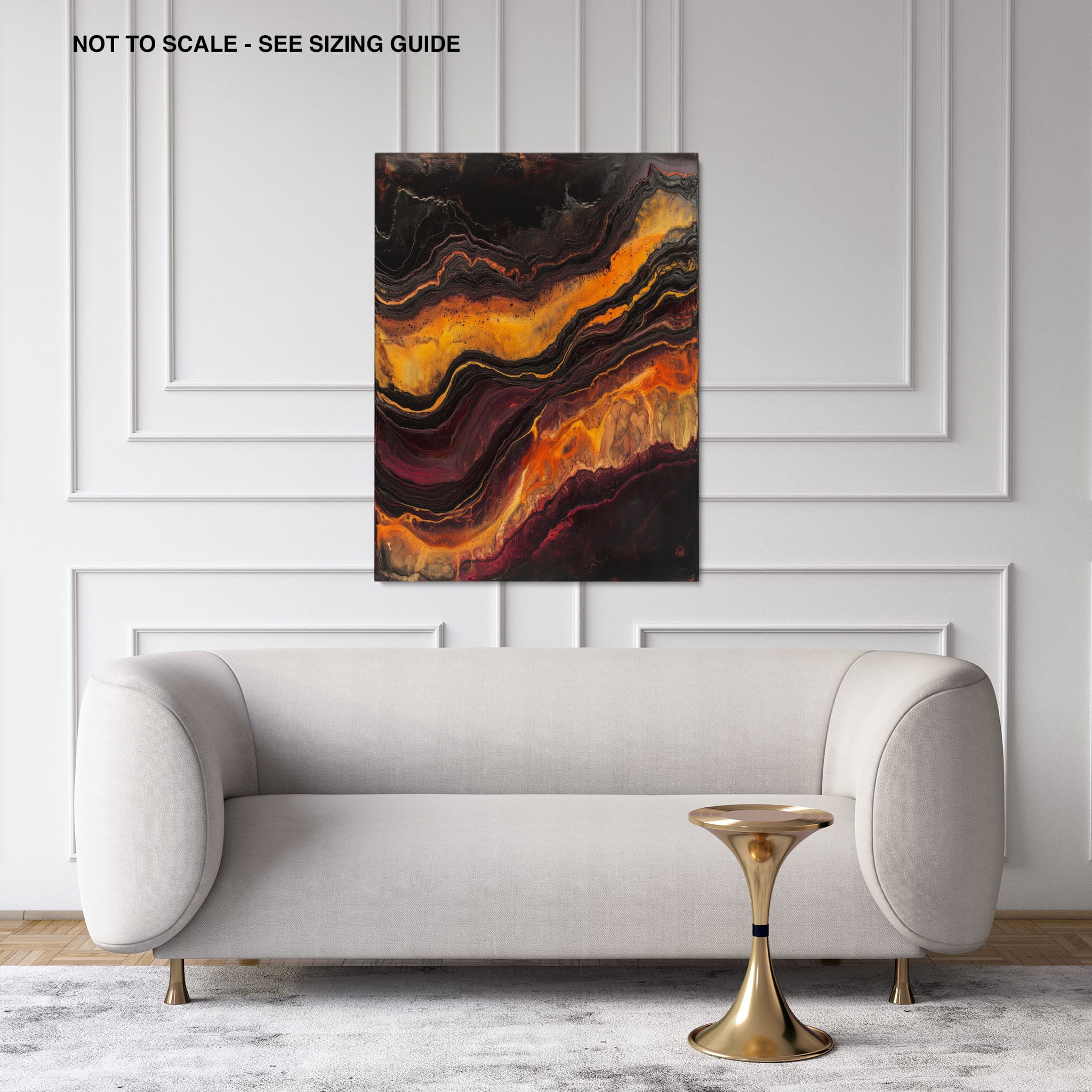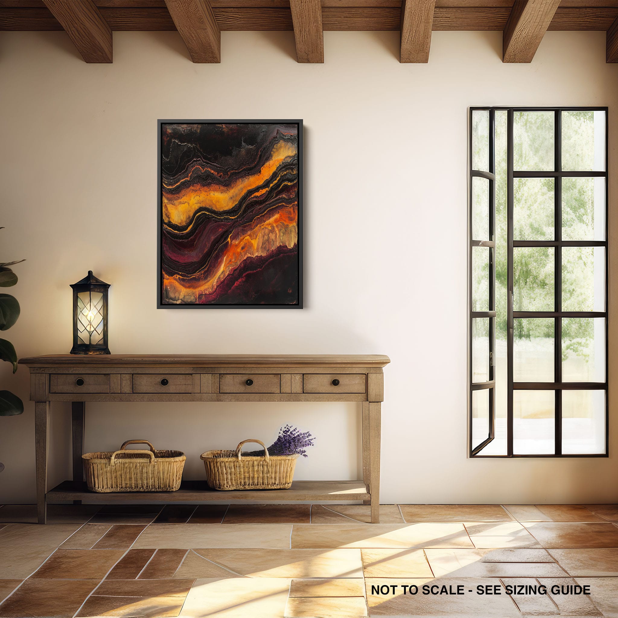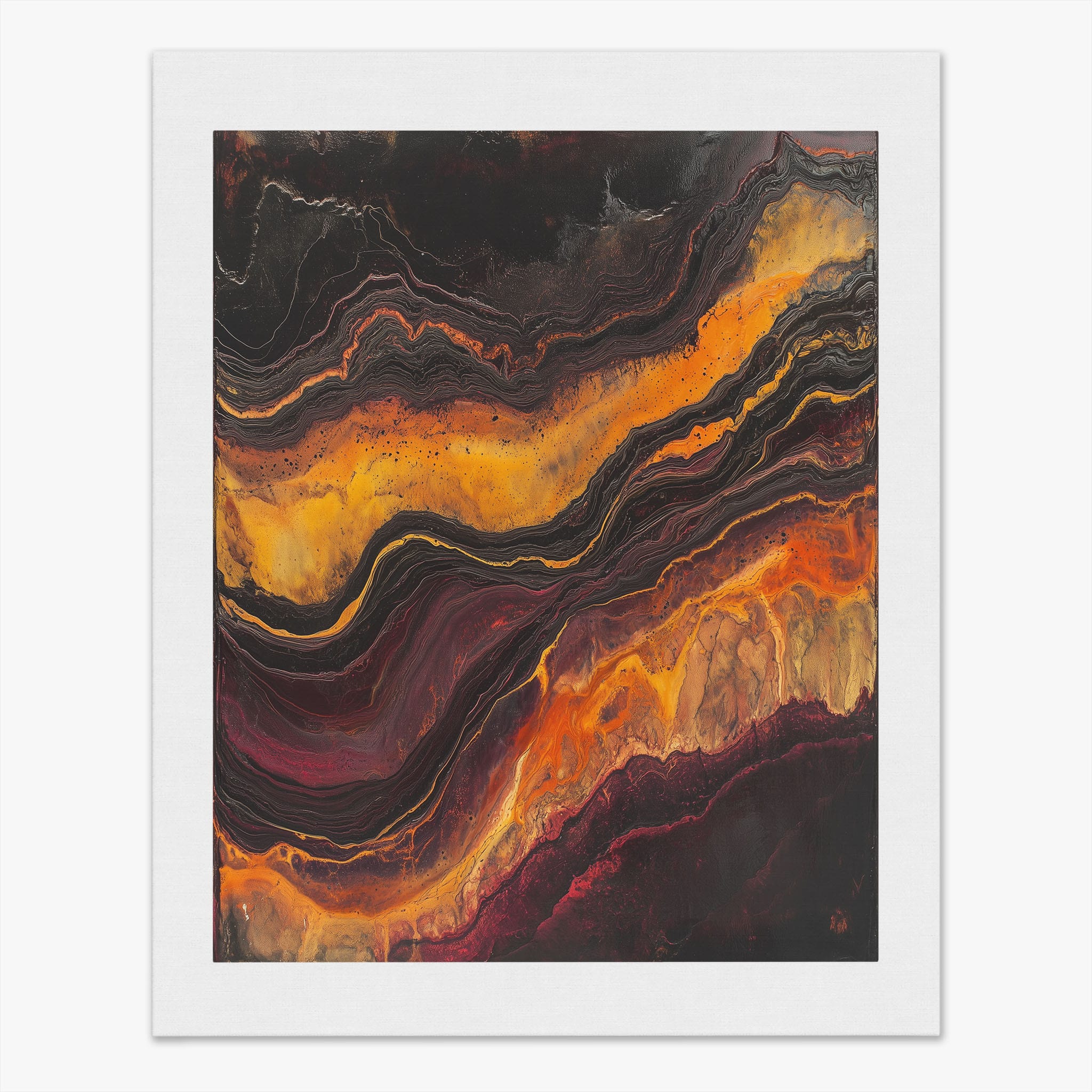This painting captures the mysterious allure of an abstract volcanic landscape, wherein swirls of black, red, and fiery orange meld together to create a dynamic and mesmerizing view. The fluidity of the colors and the depth of the textures evoke the intense energy and beauty of natural geological formations. Perfect for art lovers looking for a bold statement piece, this artwork brings a touch of surreal heat to any space, making it an ideal centerpiece that commands attention and conversation.