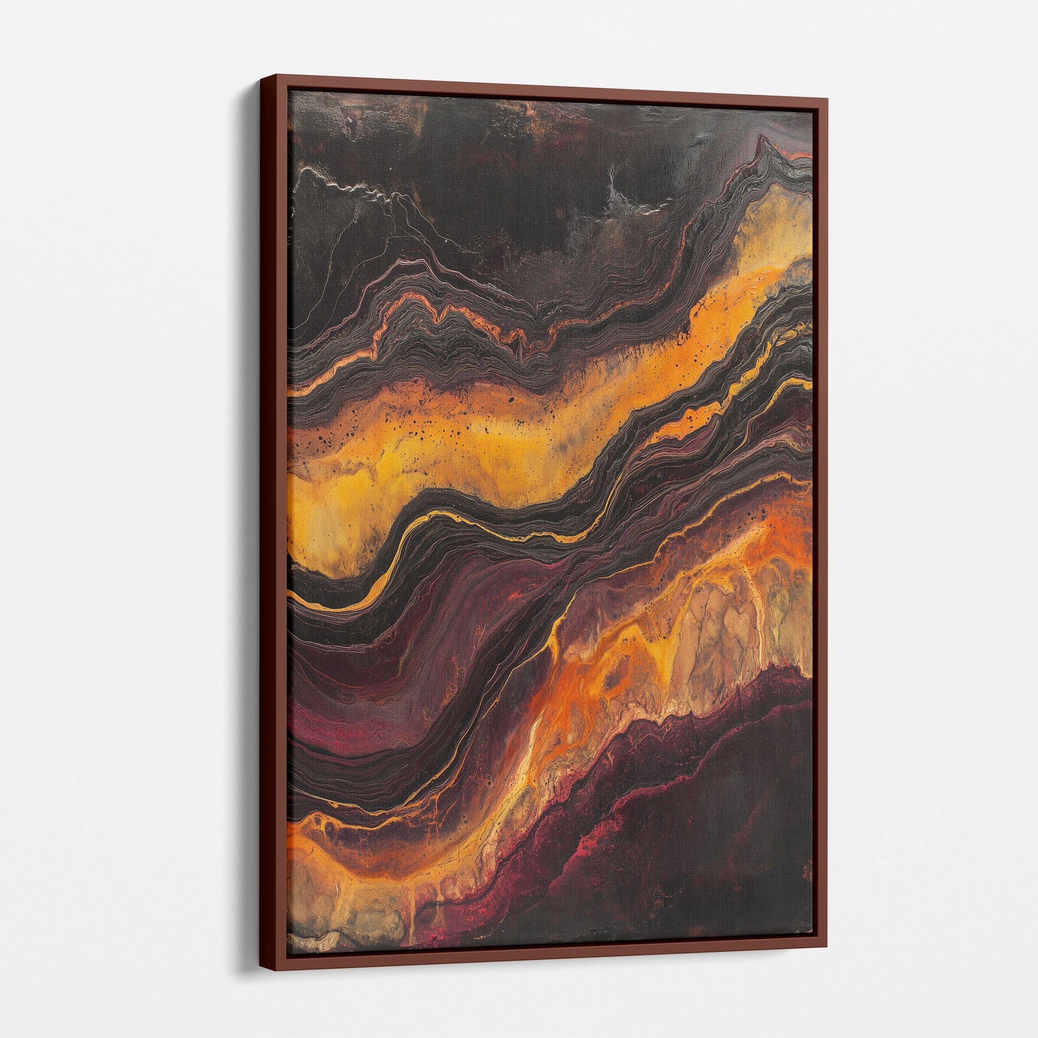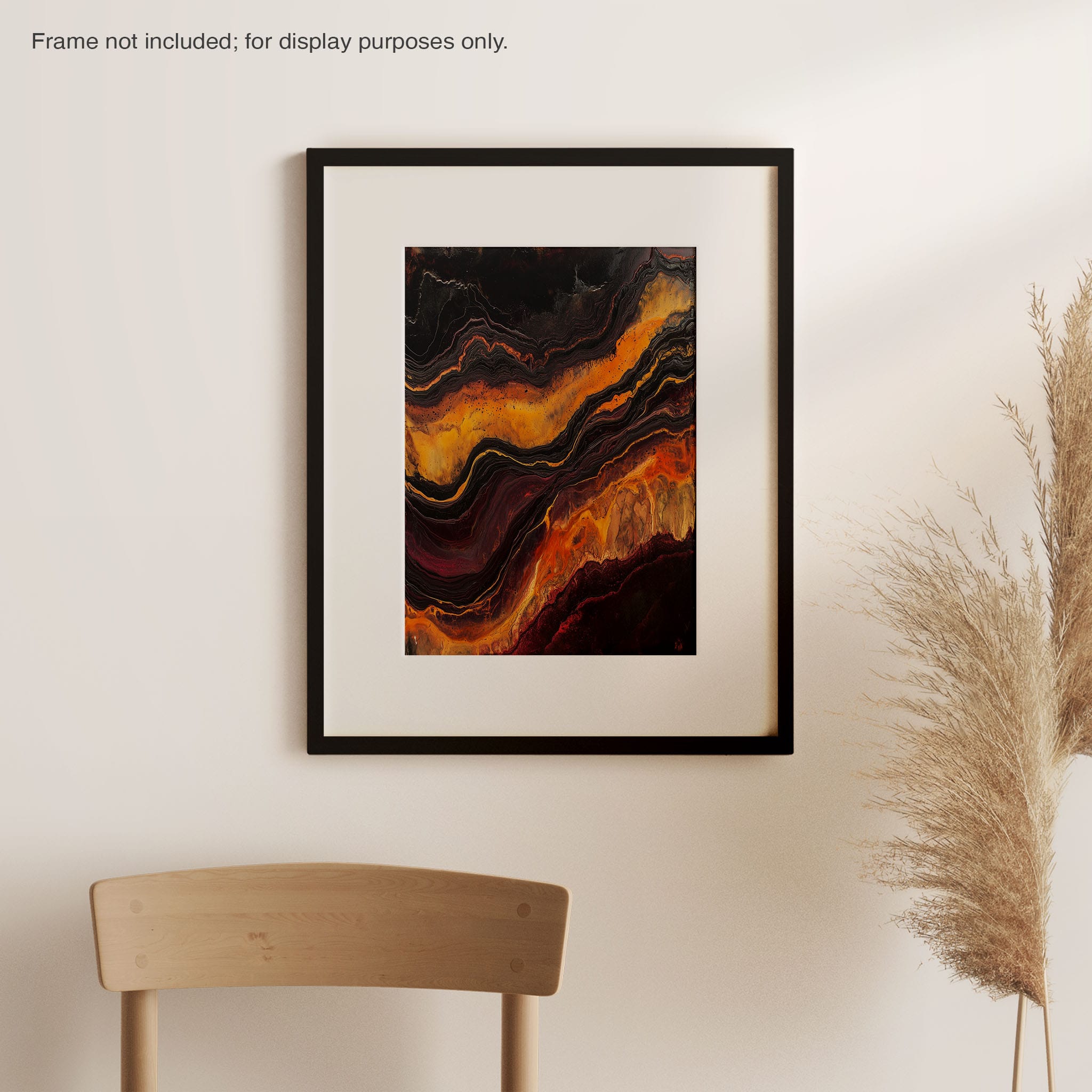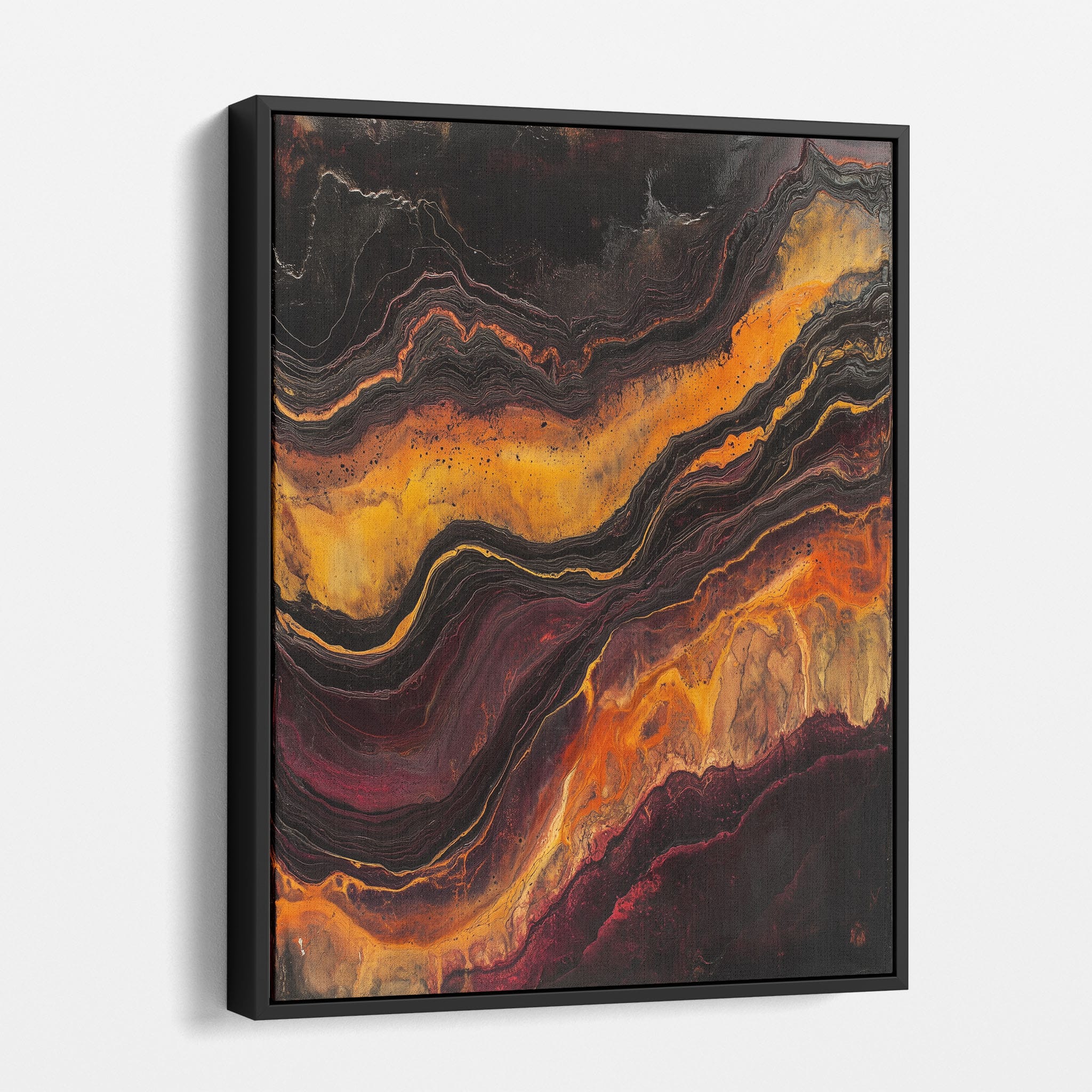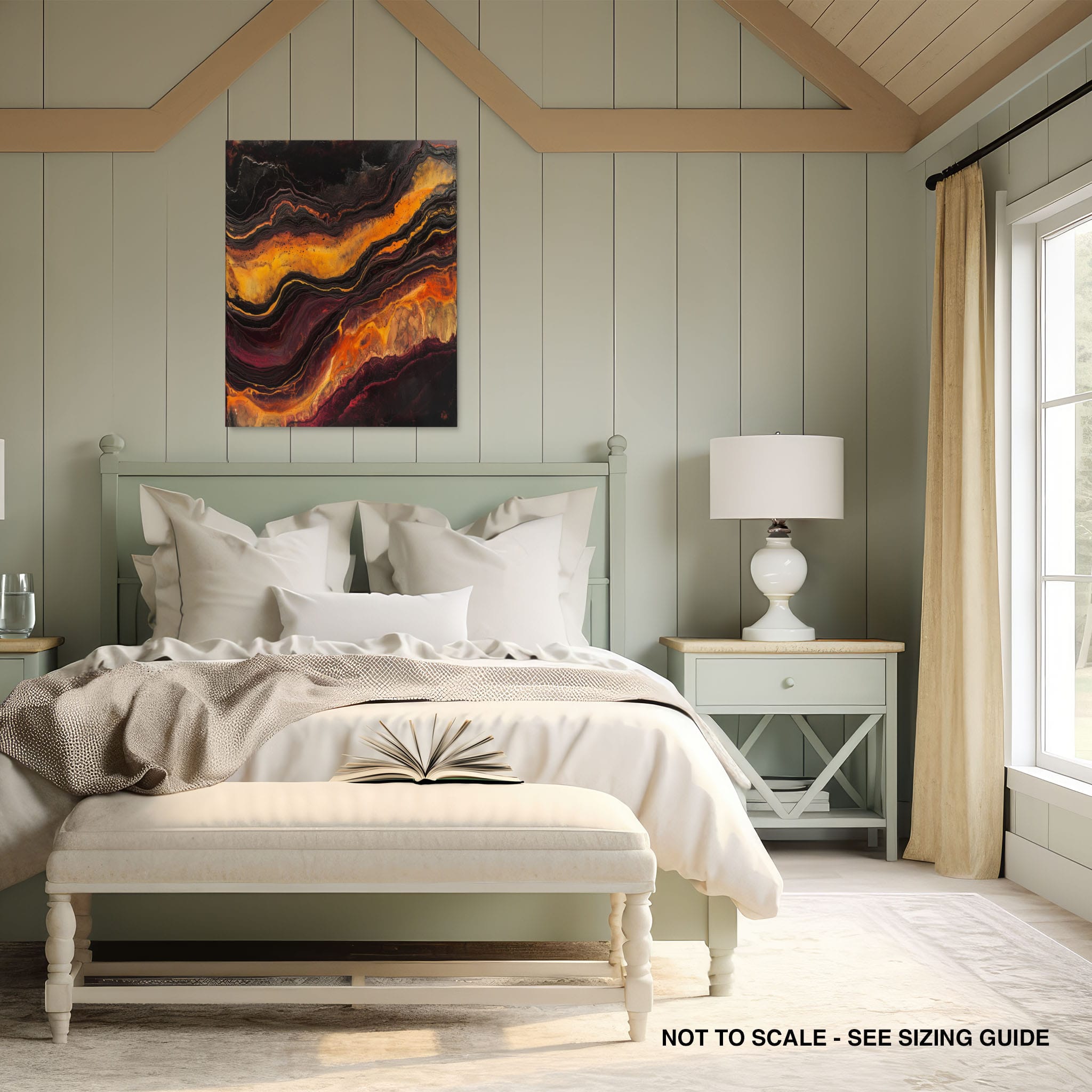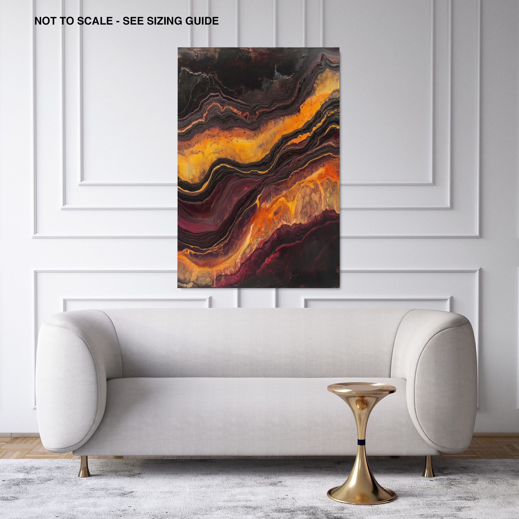 This painting captures the mysterious allure of an abstract volcanic landscape, wherein swirls of black, red, and fiery orange meld together to create a dynamic and mesmerizing view. The fluidity of the colors and the depth of the textures evoke the intense energy and beauty of natural geological formations. Perfect for art lovers looking for a bold statement piece, this artwork brings a touch of surreal heat to any space, making it an ideal centerpiece that commands attention and conversation.