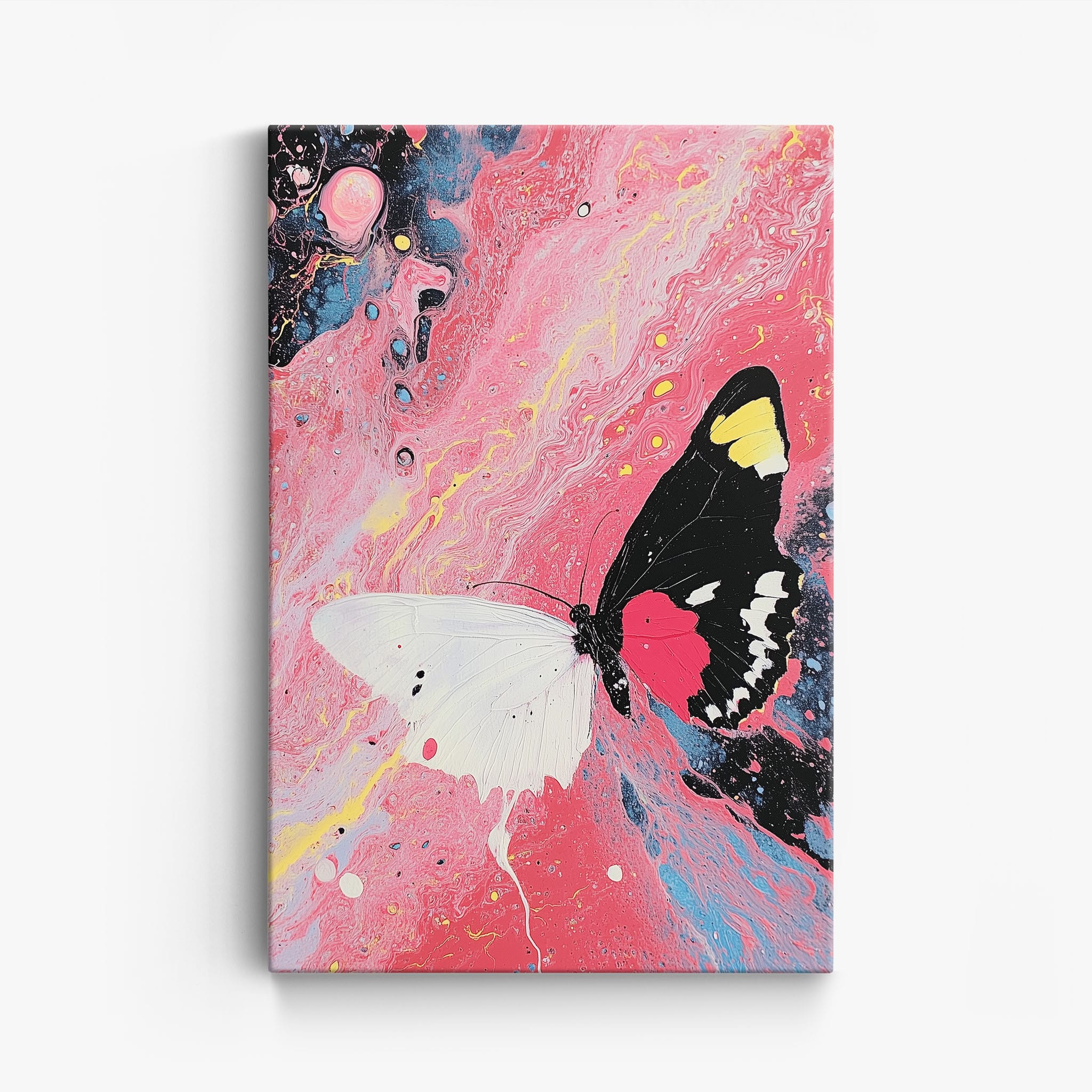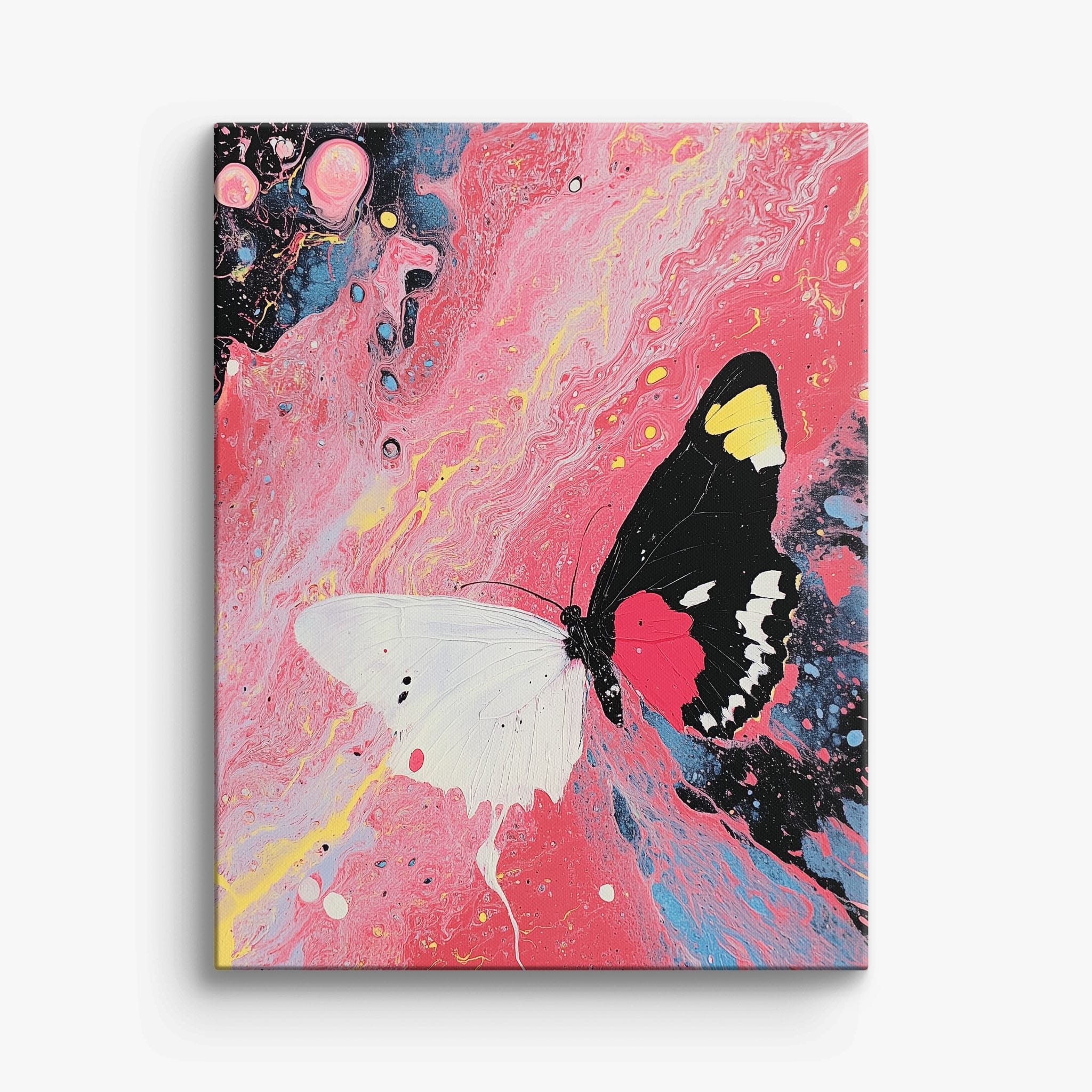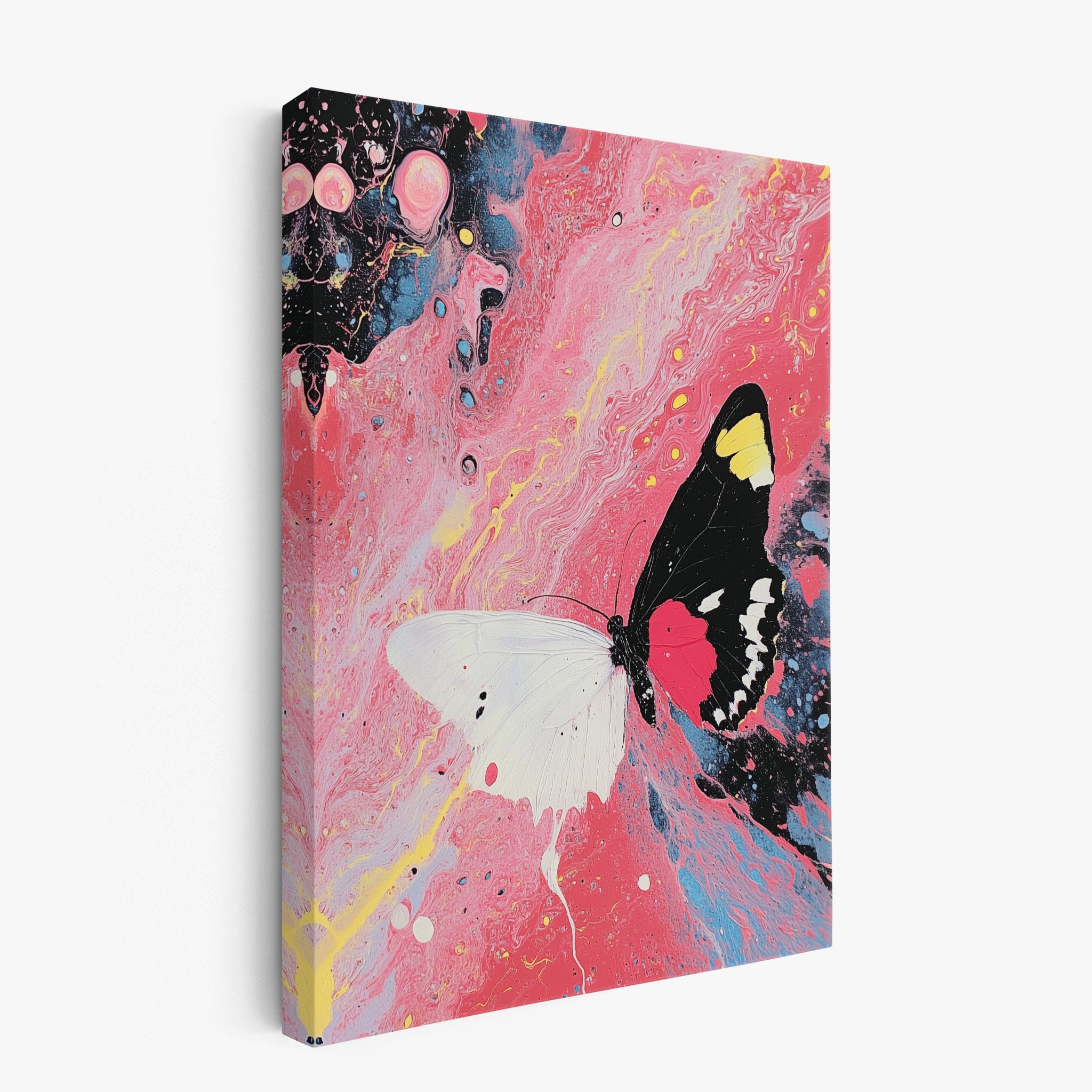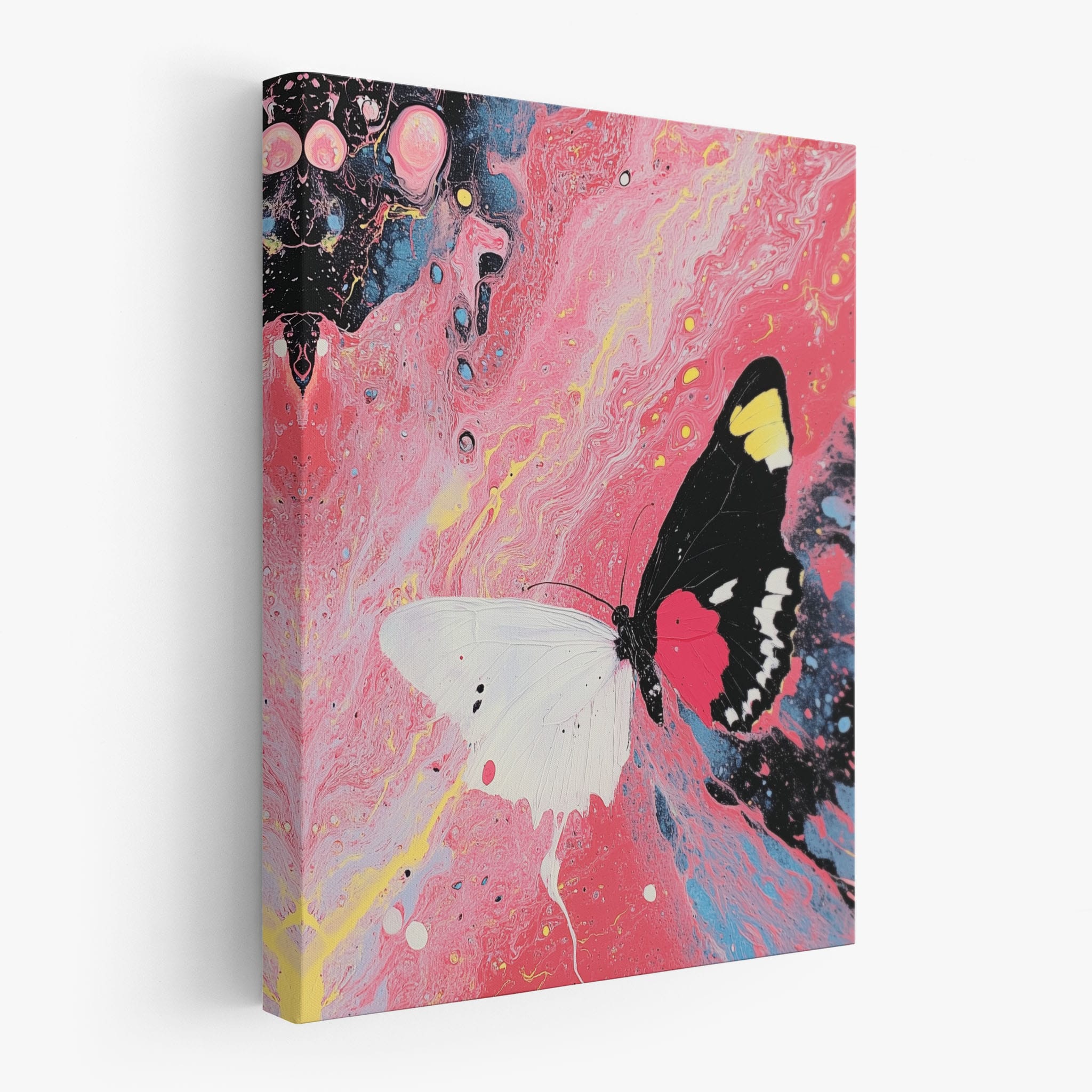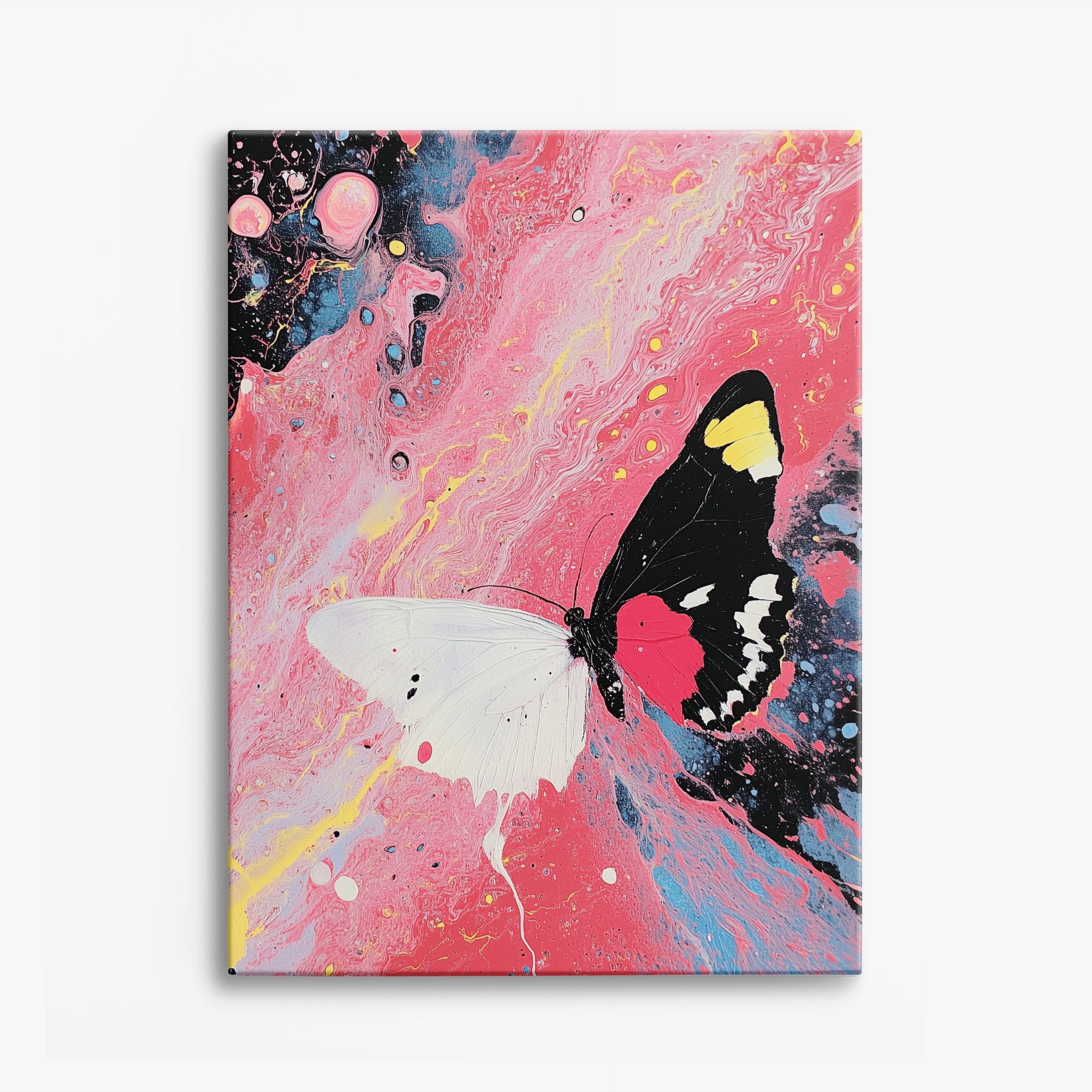 This artistic painting features a vibrantly depicted butterfly, its wings contrasting starkly against a swirling abstract background of deep blues, vivid pinks, and splashes of yellow. The use of bold, fluid strokes encapsulates an energetic mixture of motion, making the viewer feel as though they are witnessing the butterfly's gentle movements in real time. Perfect for art lovers looking to add a splash of color and a surrealistic touch to their space, this piece is sure to attract admiration and provoke conversation. Its abstract and surrealistic approach makes it ideal for modern decor settings that value unique and thought-provoking elements.